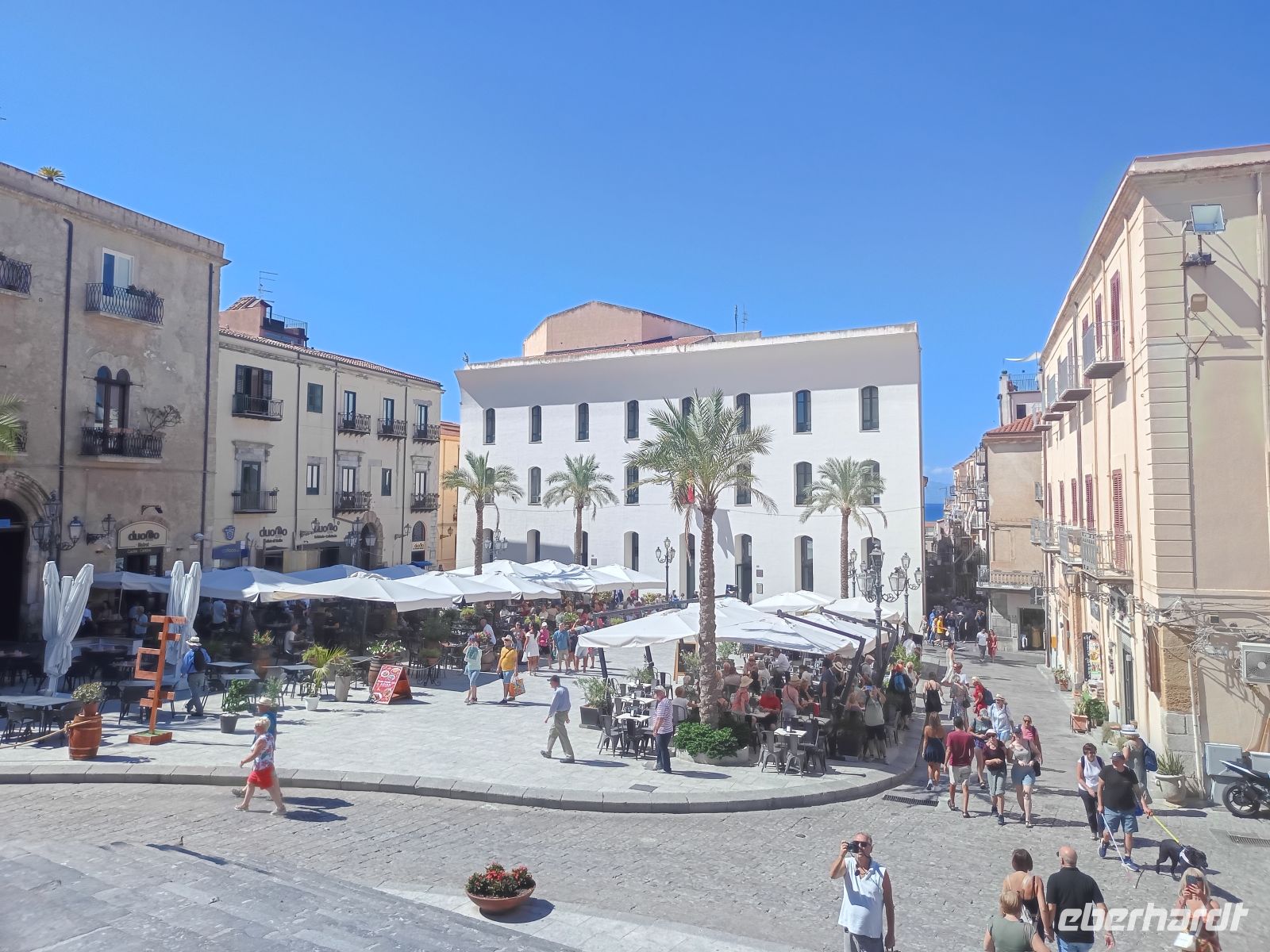 Auf unseren Wunsch fuhr uns der Fahrer zunächst zu einem Aussichtspunkt oberhalb der Stadt. Von hier aus bot sich ein überwältigender Panoramablick über das historische Zentrum, die mächtige „Rocca“, den majestätischen „Duomo“ und das tiefblaue Tyrrhenische Meer – ein perfekter Auftakt für unseren Tag.