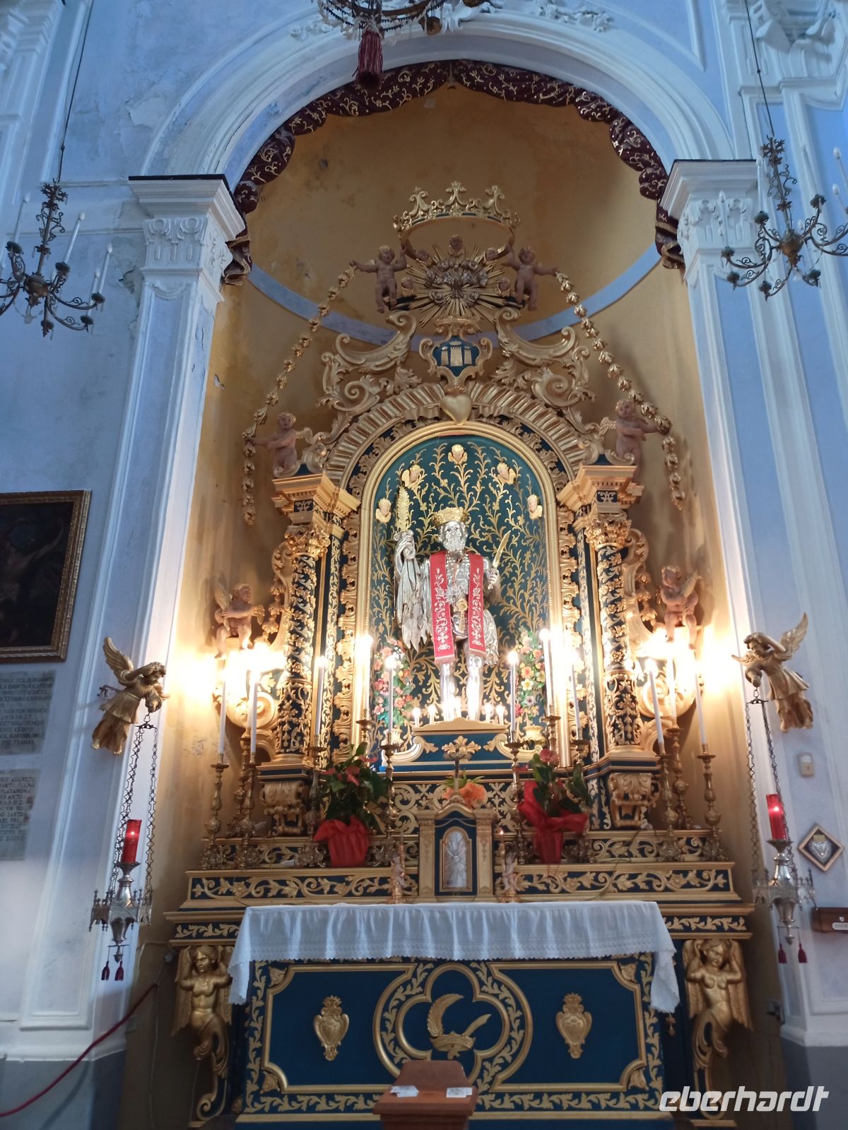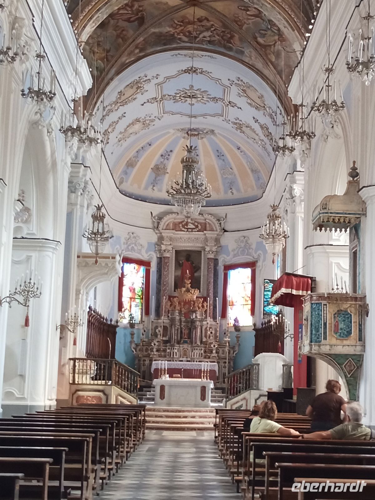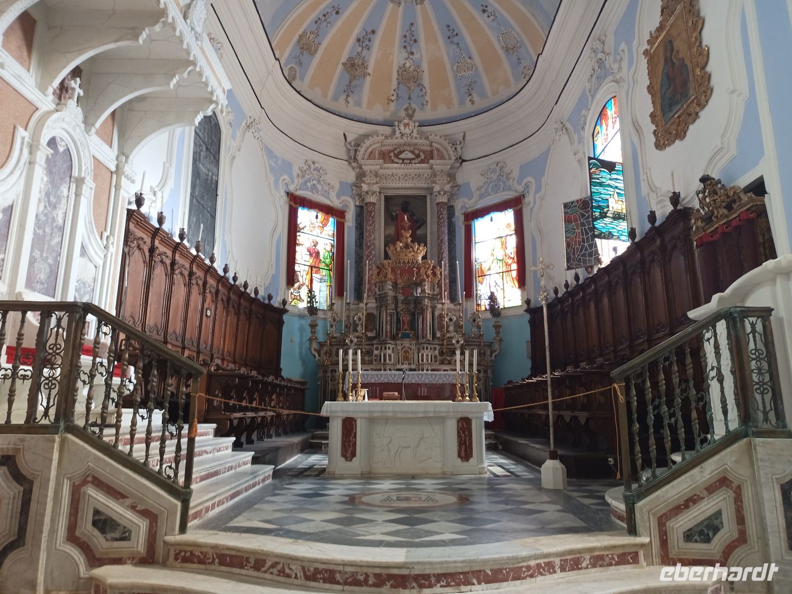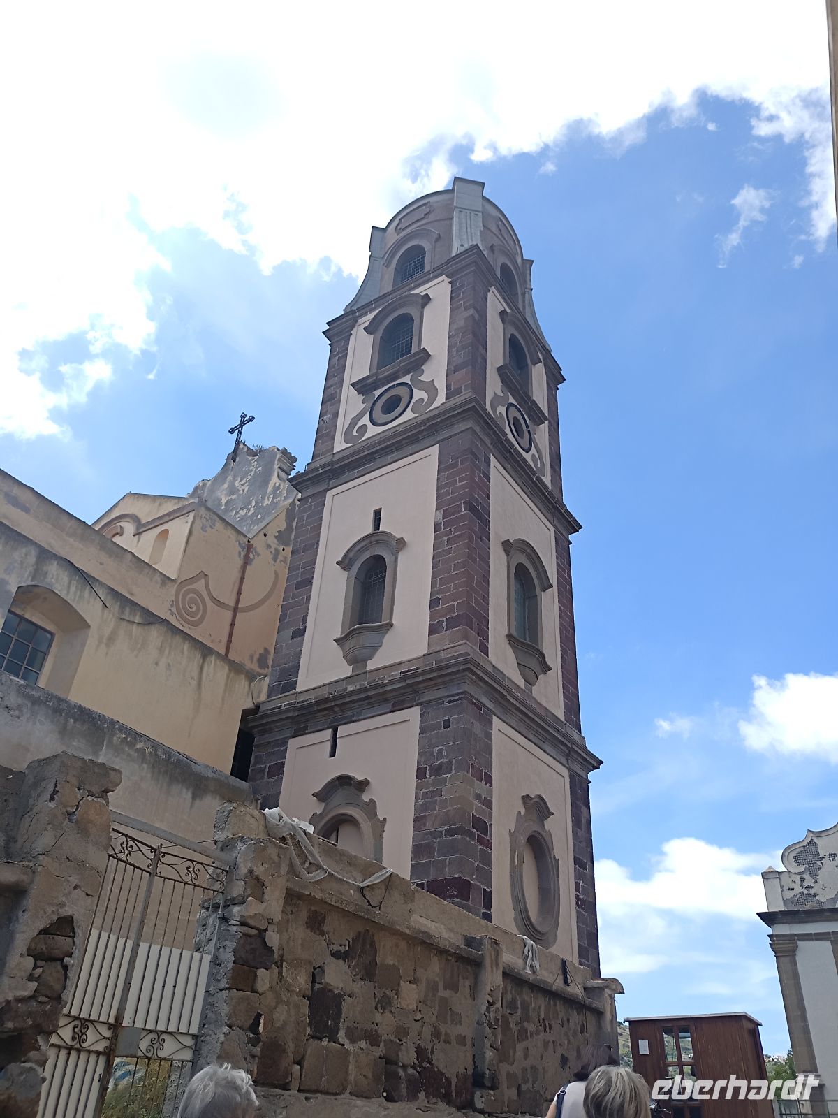 Ein Teil der Gruppe entschied sich, auf dem Burgberg zu bleiben und in einer Taverne einen kühlen Drink zu genießen. Mit den übrigen Gästen besuchten wir die Kathedrale San Bartolomeo, die dem Schutzpatron der Insel gewidmet ist. Der Apostel Bartholomäus gilt seit Jahrhunderten als Patron der Äolischen Inseln, und seine Statue findet sich auch an der Marina Corta. Das Innere der Kathedrale überraschte mit prachtvollen Altären und schöner Architektur.