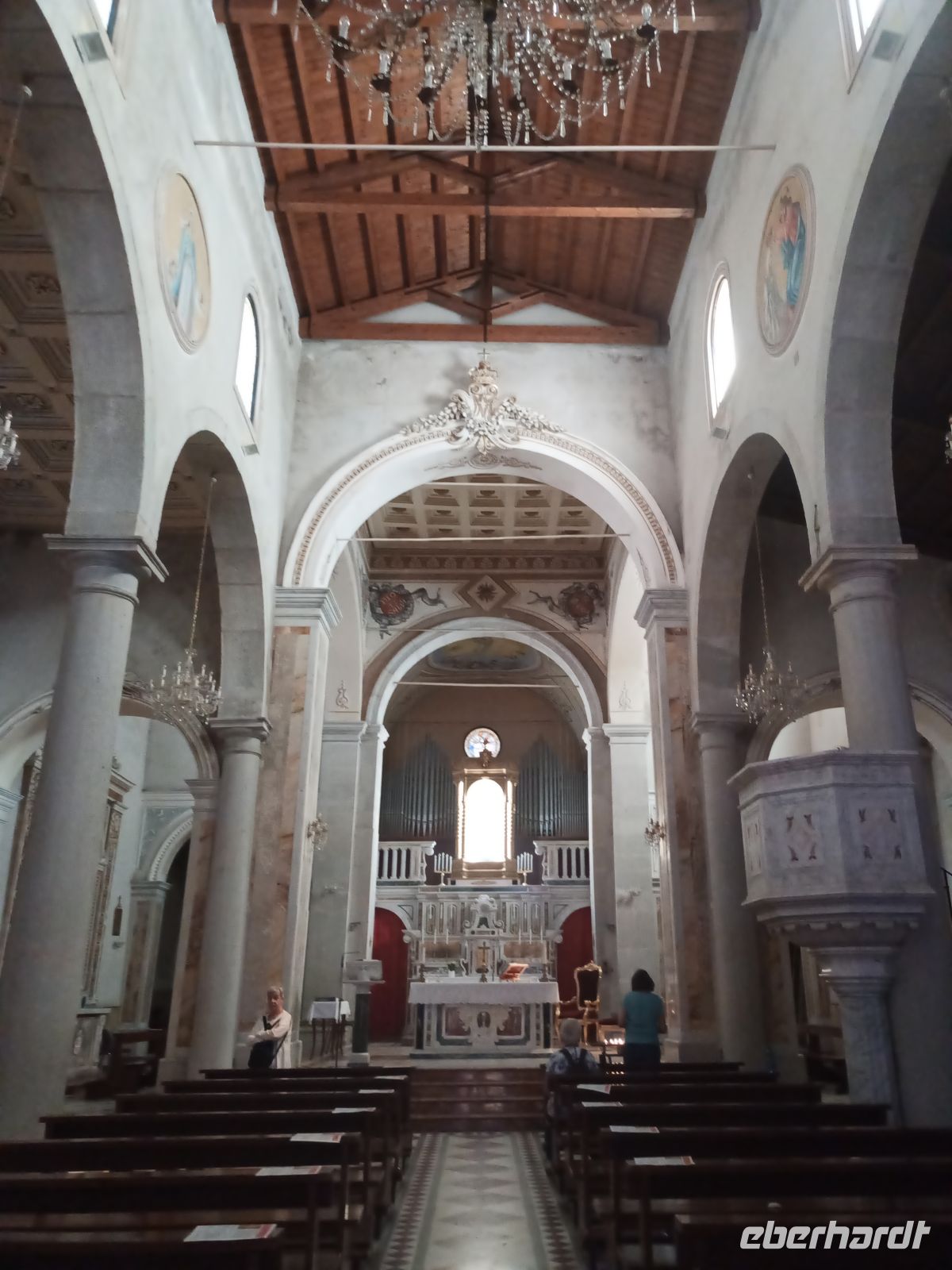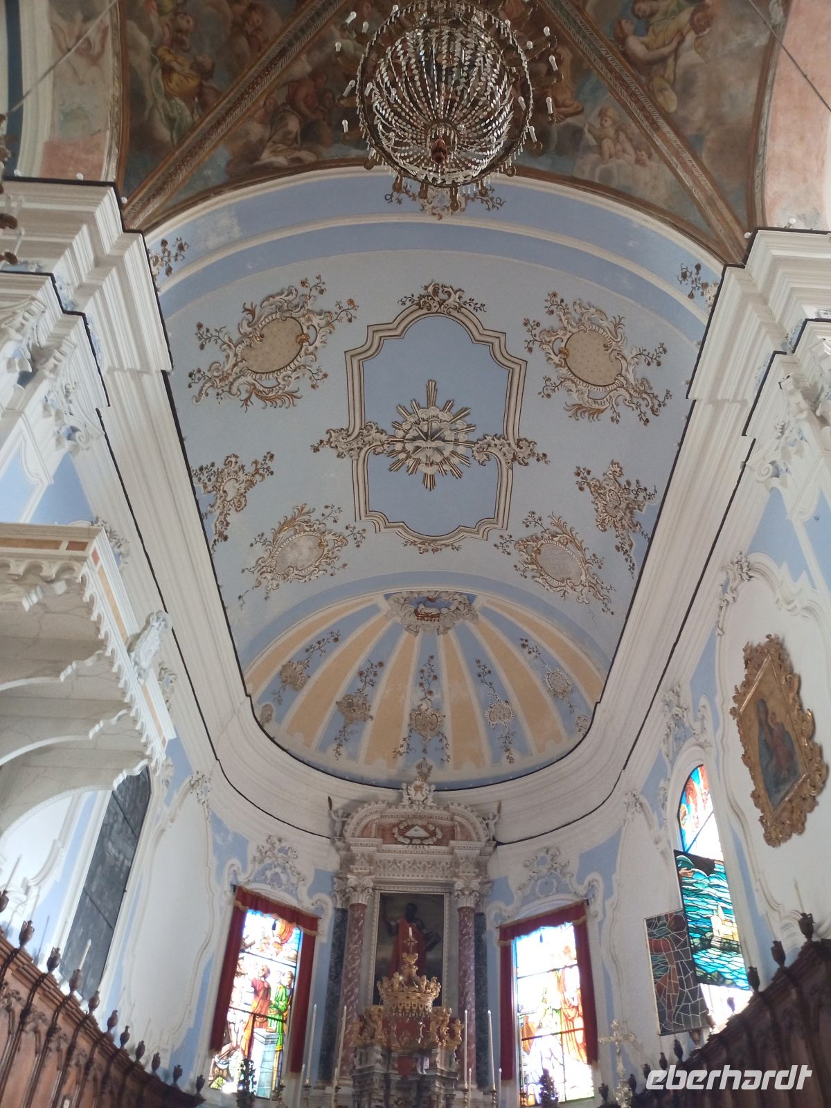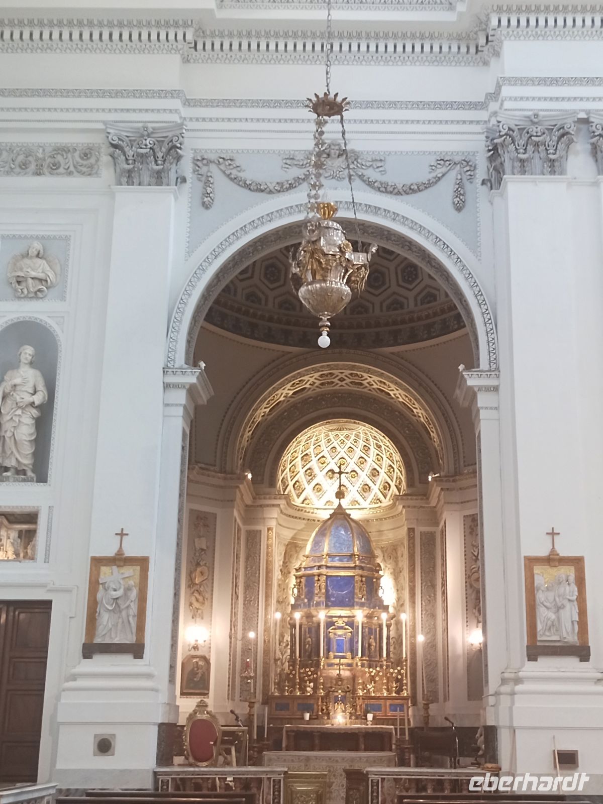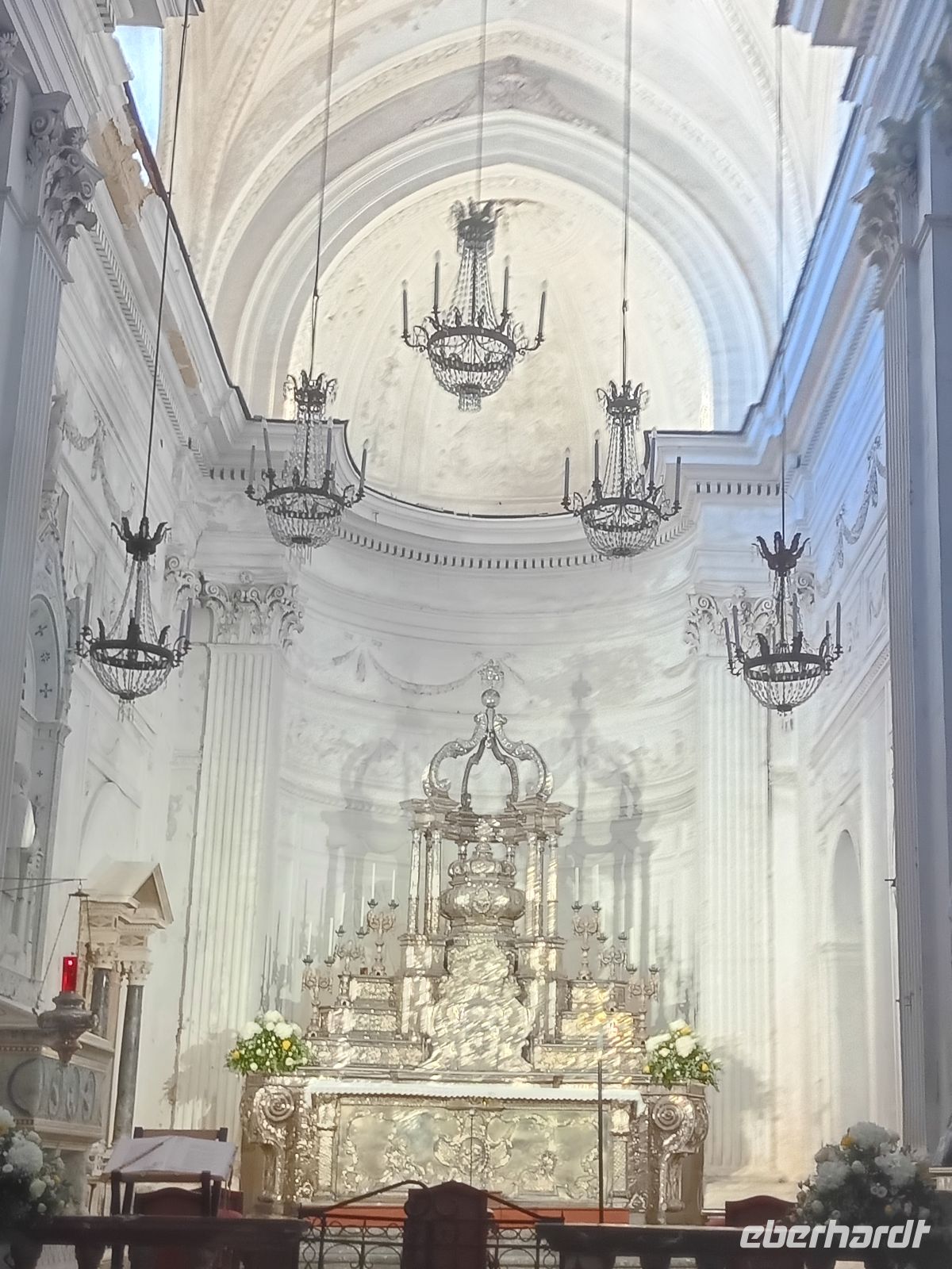 Ein Teil der Gruppe entschied sich, auf dem Burgberg zu bleiben und in einer Taverne einen kühlen Drink zu genießen. Mit den übrigen Gästen besuchten wir die Kathedrale San Bartolomeo, die dem Schutzpatron der Insel gewidmet ist. Der Apostel Bartholomäus gilt seit Jahrhunderten als Patron der Äolischen Inseln, und seine Statue findet sich auch an der Marina Corta. Das Innere der Kathedrale überraschte mit prachtvollen Altären und schöner Architektur.