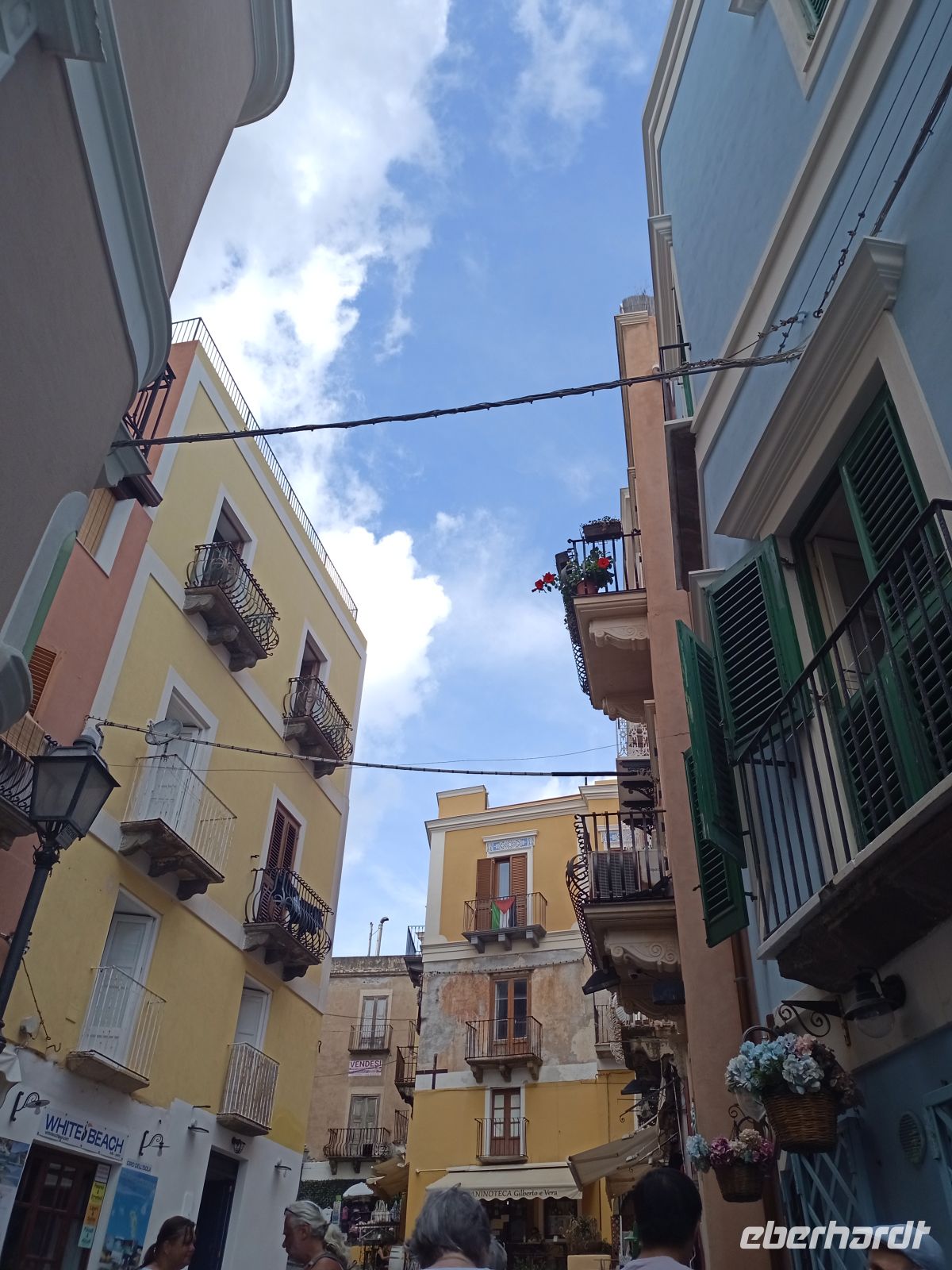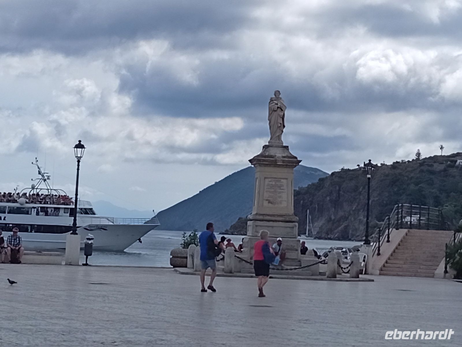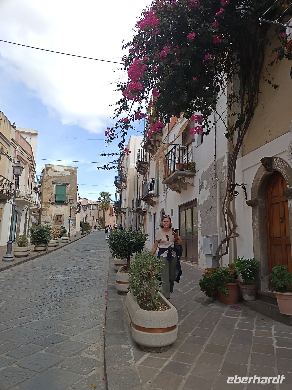 Wir kehrten wieder zurück unterhalb des Berges und trafen dort unsere Dame, die es etwas ruhiger angehen lassen wollte und lieber unten geblieben war. Gemeinsam spazierten wir anschließend durch die lebhaften Gassen von Lipari-Stadt, die voller kleiner Lädchen, Boutiquen, Schmuck- und Keramikgeschäfte sind. Hier genossen wir das mediterrane Flair der Insel. Von der Piazza Marina Corta bot sich noch einmal ein herrlicher Blick auf das Meer und den Burgfelsen.