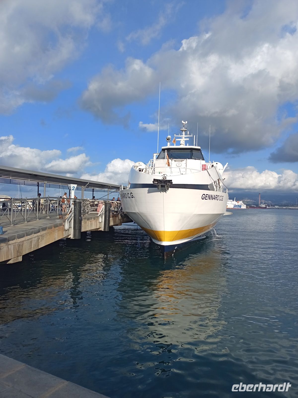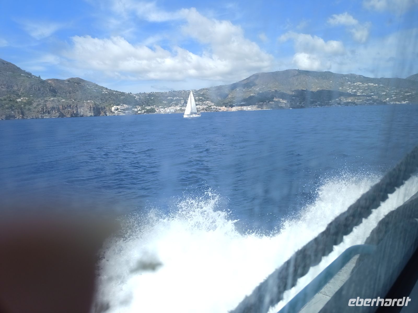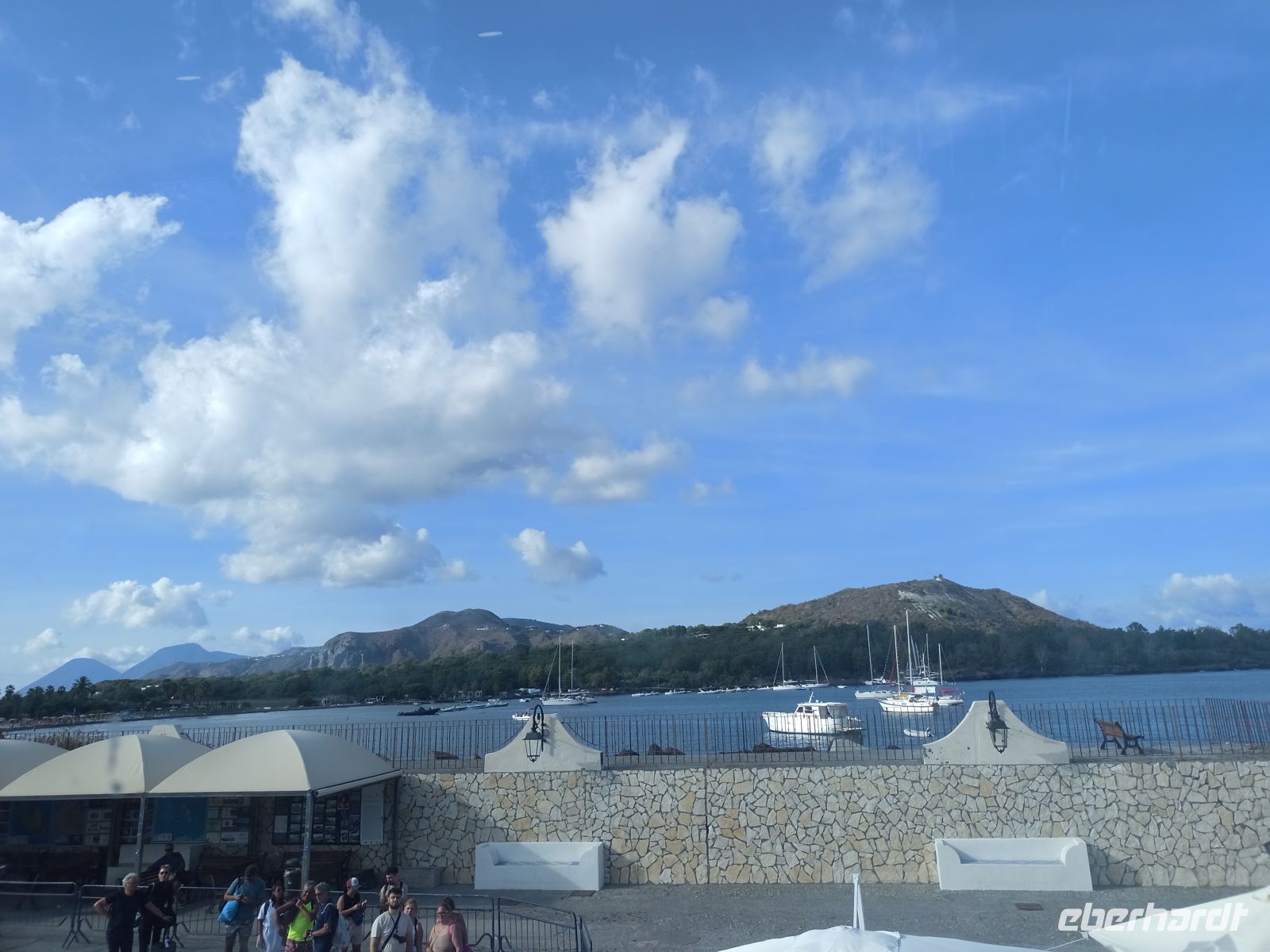 Am Nachmittag sammelte sich die Gruppe wieder am Hafen, um mit dem Schiff zurück nach Milazzo zu fahren. Zwei Damen hatten fälschlicherweise an der Marina Corta gewartet, konnten nach einem kurzen Telefonat aber noch rechtzeitig zum Schiff gelangen. Die Rückfahrt führte uns vorbei an der Insel Vulcano, allerdings ohne Aufenthalt.