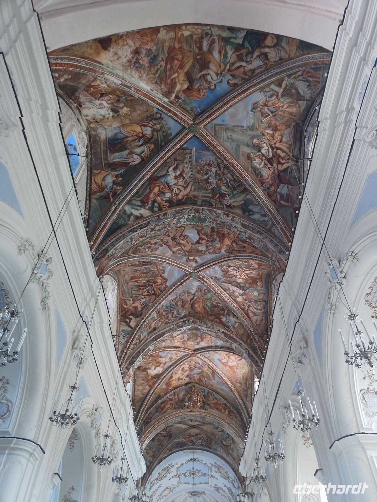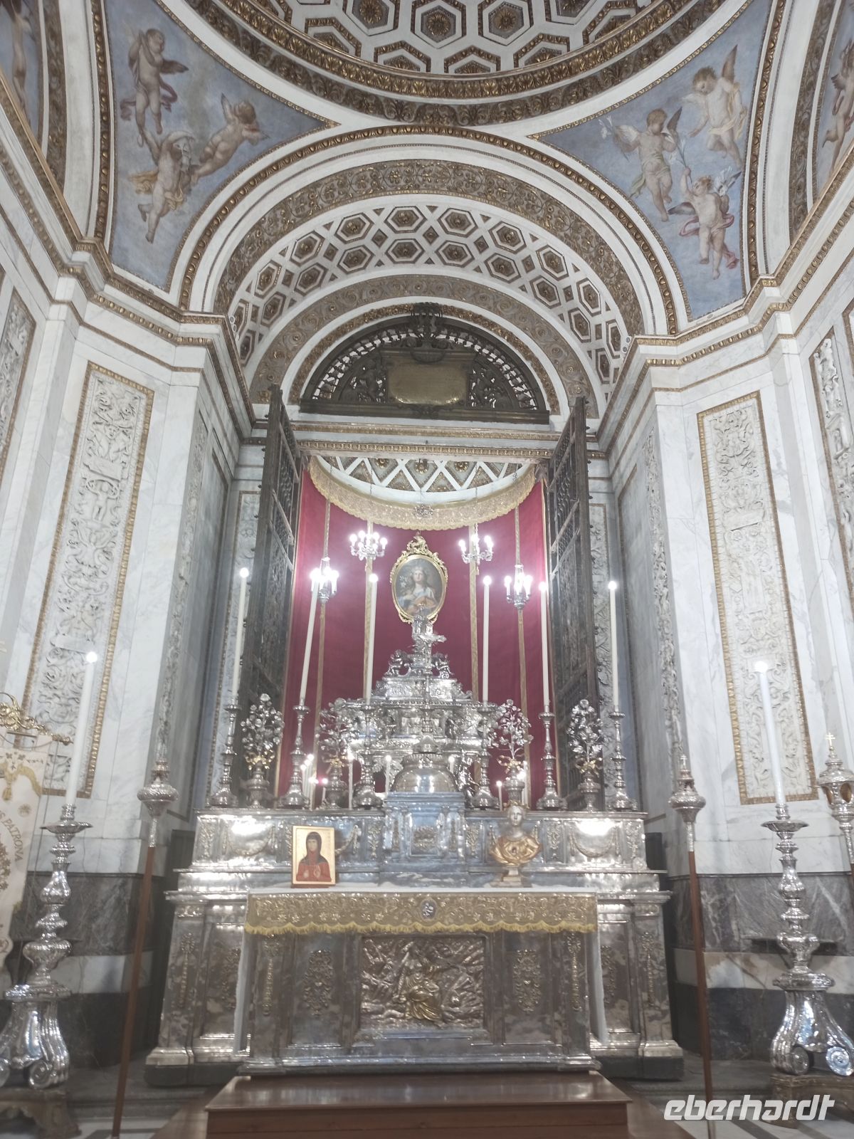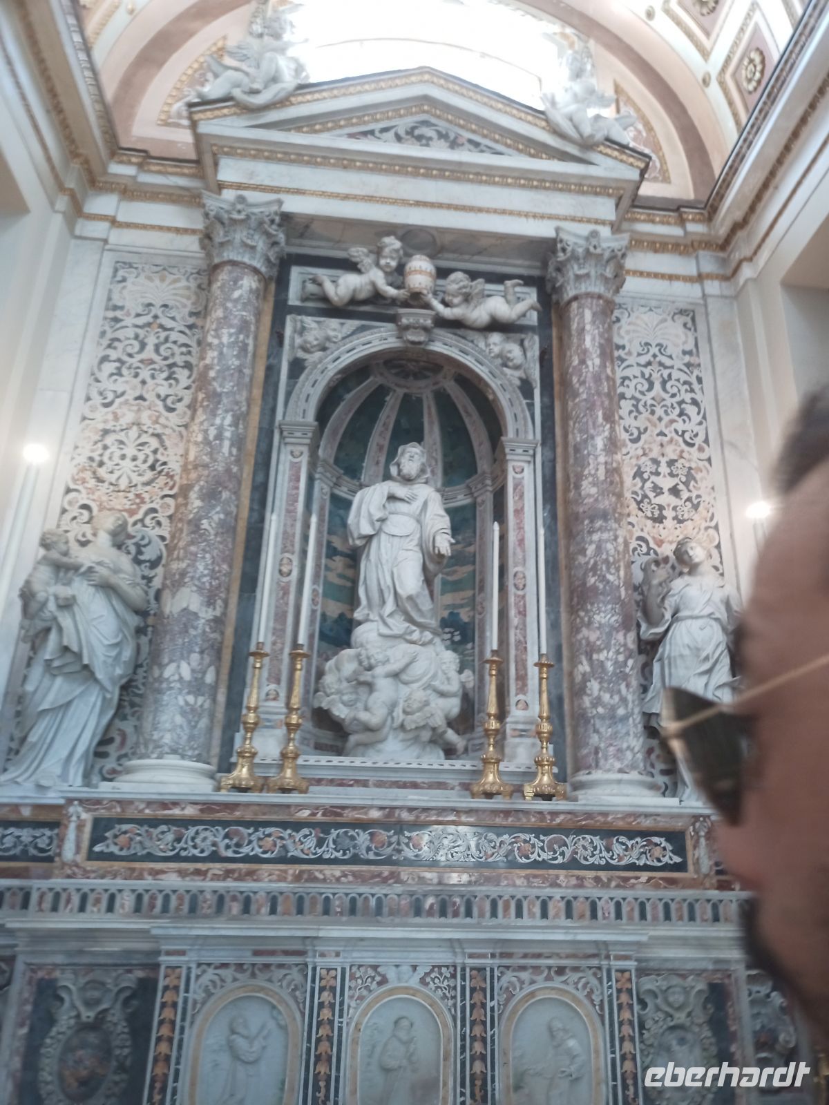 Im Inneren betrachteten wir zunächst das weite Kirchenschiff, bevor wir uns den einzelnen Altären und Kapellen widmeten, die mit prachtvollen Dekorationen und Heiligenbildern geschmückt sind. Besonders eindrucksvoll sind die Königsgräber, in denen unter anderem Friedrich II. und Mitglieder seiner Familie ruhen. Eine weitere Besonderheit ist die Meridiana-Uhr, eine astronomische Sonnenuhr, die im 17. Jahrhundert in den Boden eingelassen wurde. Durch ein kleines Loch in der Decke fällt zur Mittagszeit ein Sonnenstrahl genau auf die Messlinie und markiert so den Stand der Sonne – ein faszinierendes Zeugnis des Zusammenspiels von Wissenschaft, Glauben und Kunst.