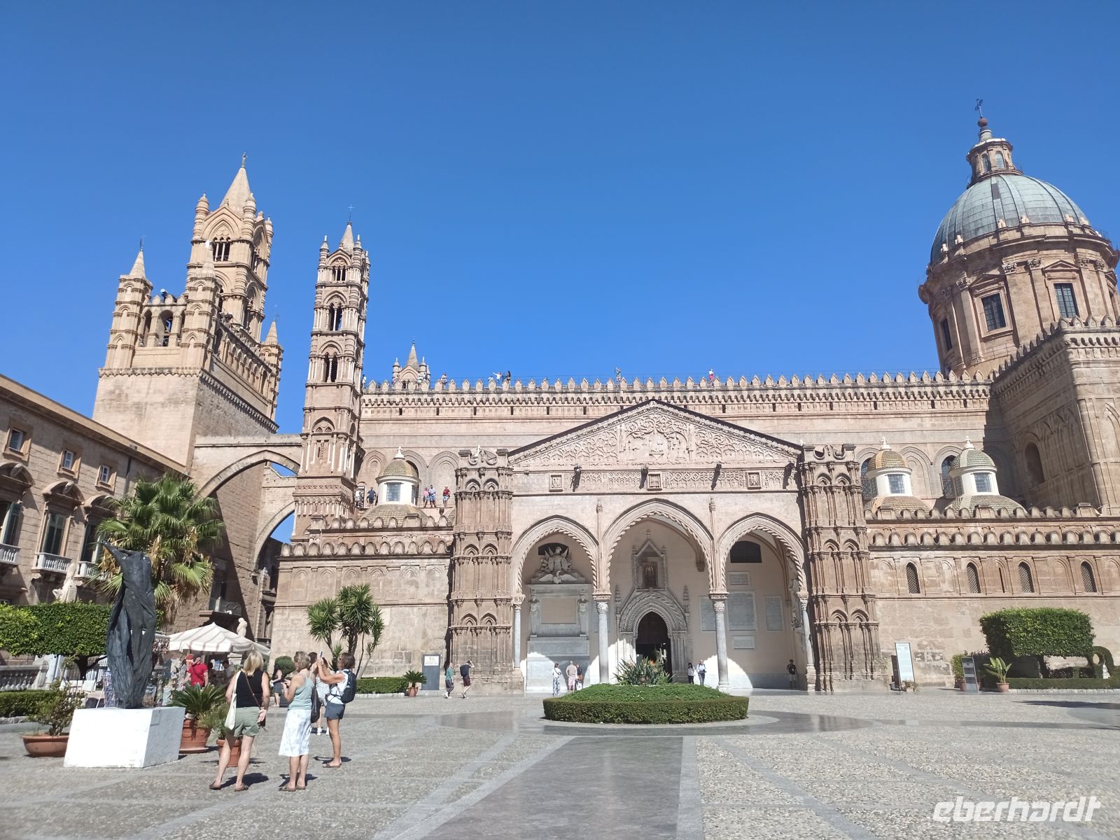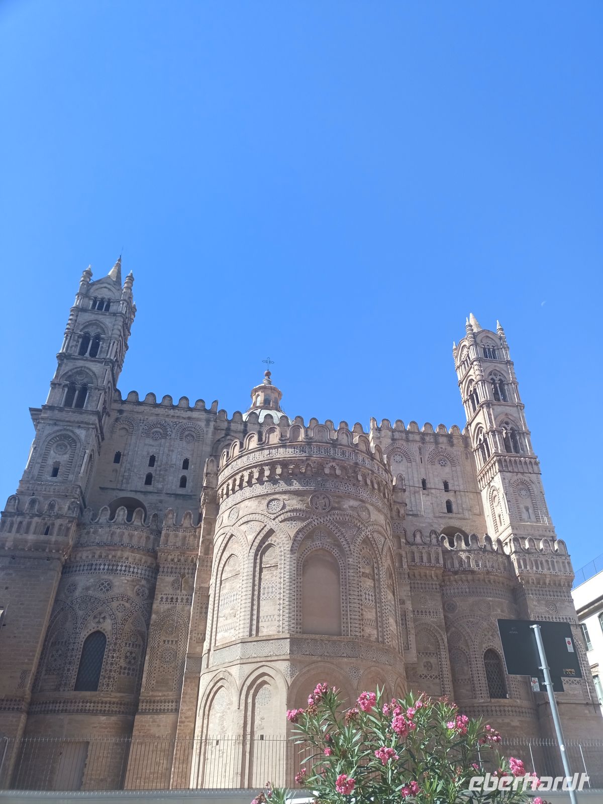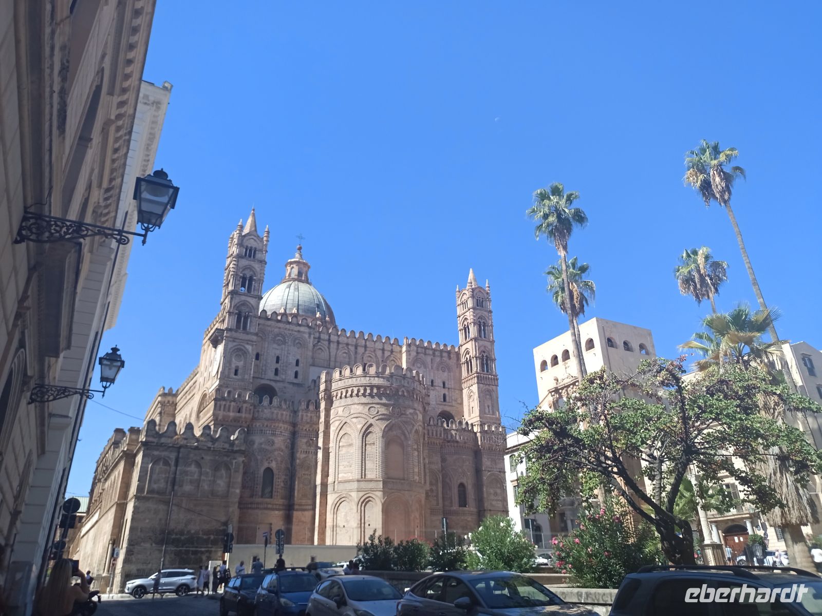 Schon nach wenigen Minuten standen wir vor der Kathedrale von Palermo, die zu den eindrucksvollsten Bauwerken Siziliens zählt. Sie wurde ursprünglich im Jahr 1185 unter Erzbischof Gualtiero Offamilio auf den Resten einer Moschee errichtet. Im Laufe der Jahrhunderte erfuhr das Bauwerk zahlreiche Erweiterungen und Veränderungen: normannische Elemente, gotische Einflüsse und barocke Details prägen das Bild. Die letzte große Bauphase im 18. Jahrhundert verlieh der Kathedrale mit der neoklassizistischen Fassade ihr heutiges Aussehen.