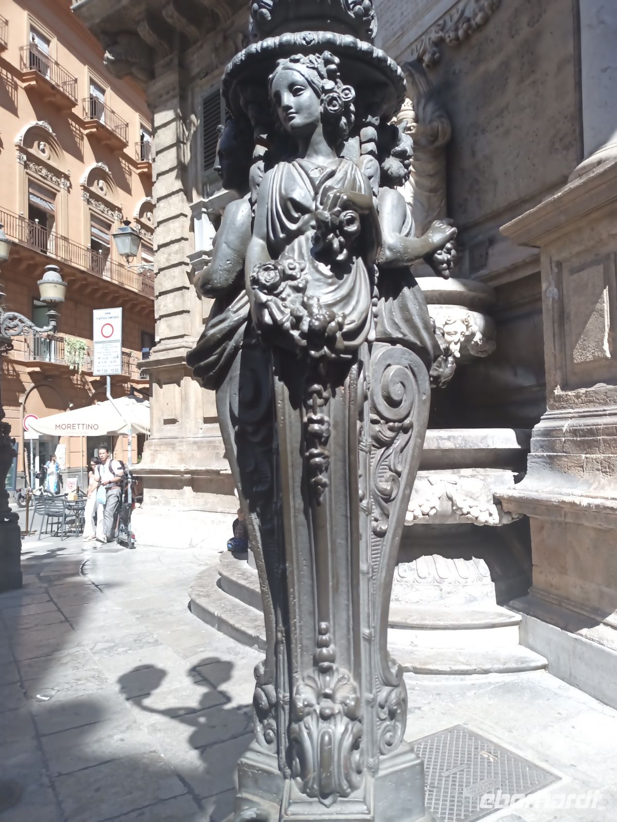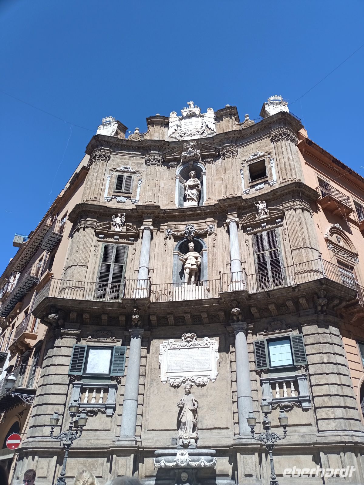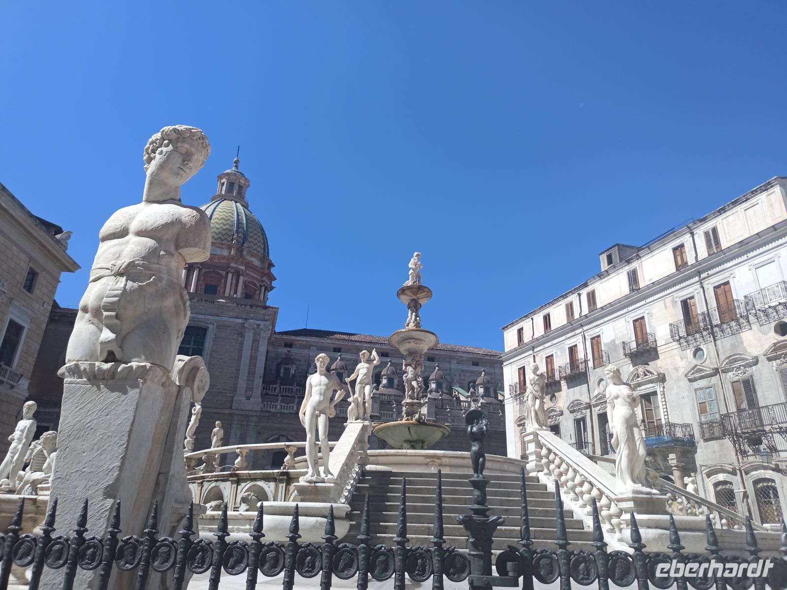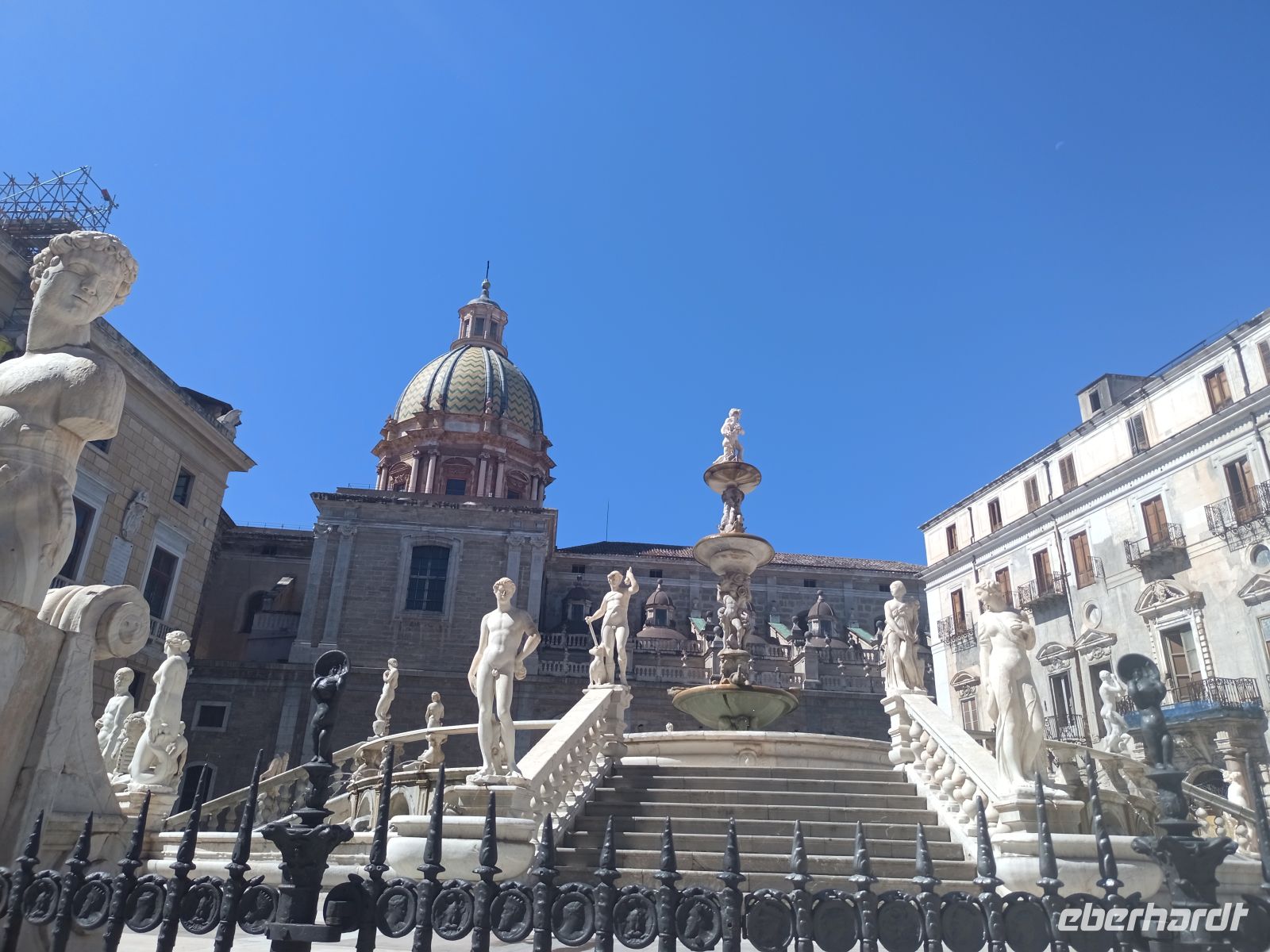 Von hier spazierten wir über den Corso Vittorio Emanuele bis zu den Quattro Canti, dem barocken Herz der Stadt. Die vier symmetrischen Palazzi, die den Platz säumen, symbolisieren die vier Jahreszeiten, die vier spanischen Könige und die vier Schutzheiligen Palermos. Gleich daneben liegt die Fontana Pretoria, ein Renaissance-Brunnen mit kunstvollen Marmorskulpturen, der früher auch „Brunnen der Schande“ genannt wurde.