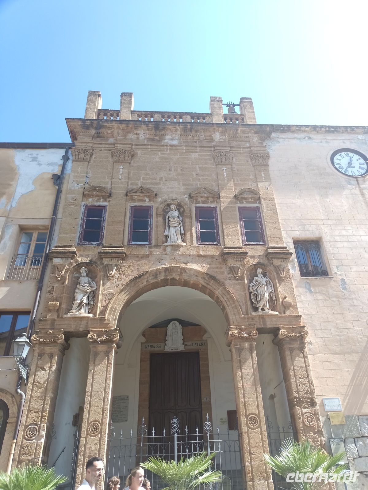 Vor dem Eingang begegnet man der Statue der Heiligen Rosalia, der Patronin Palermos, die die Stadt im 17. Jahrhundert vor der Pest bewahrte und bis heute von den Bewohnern hoch verehrt wird.