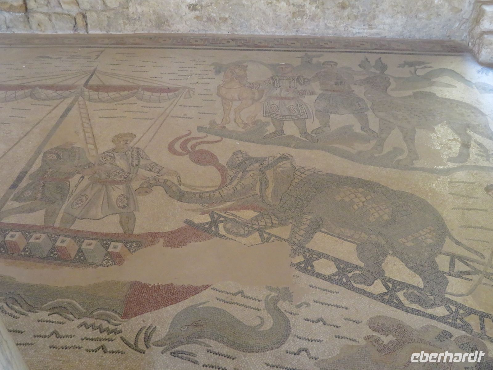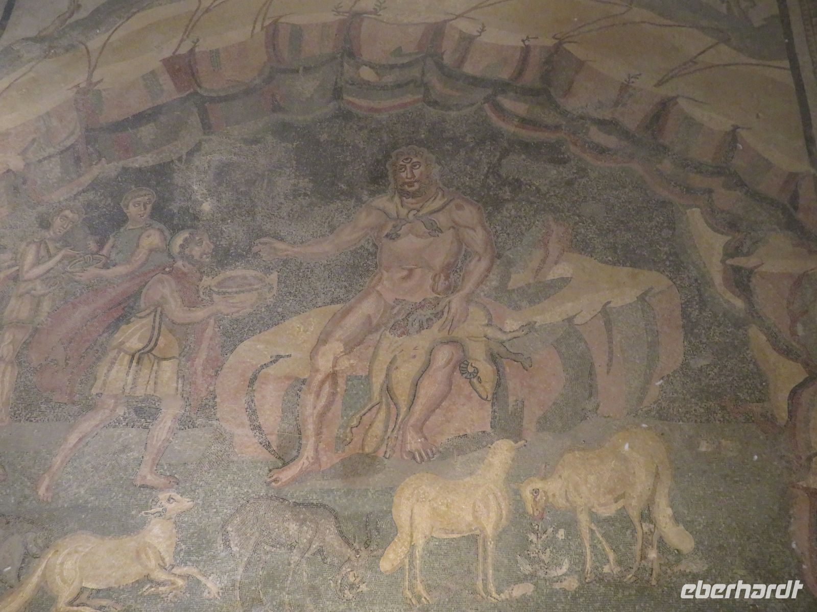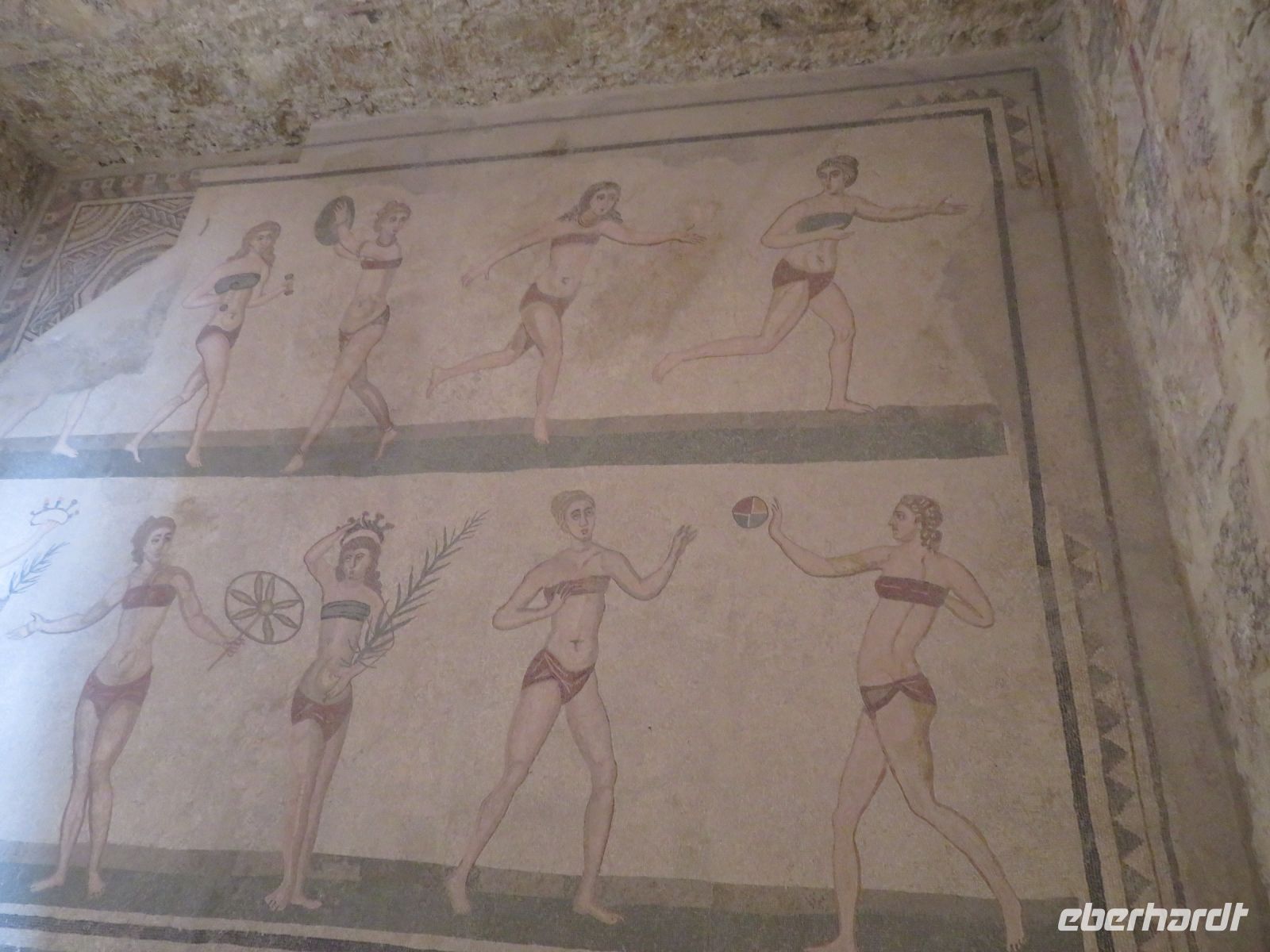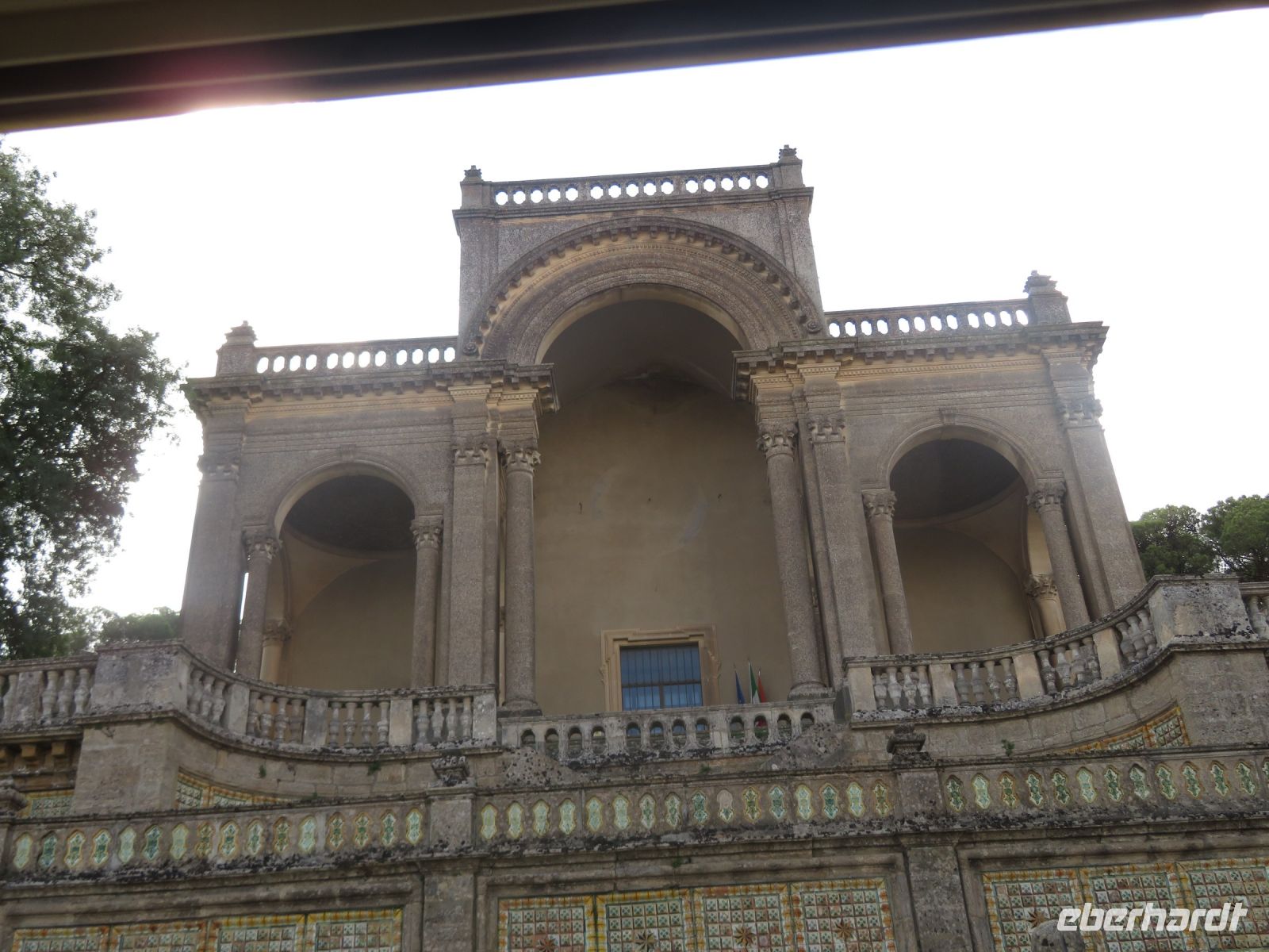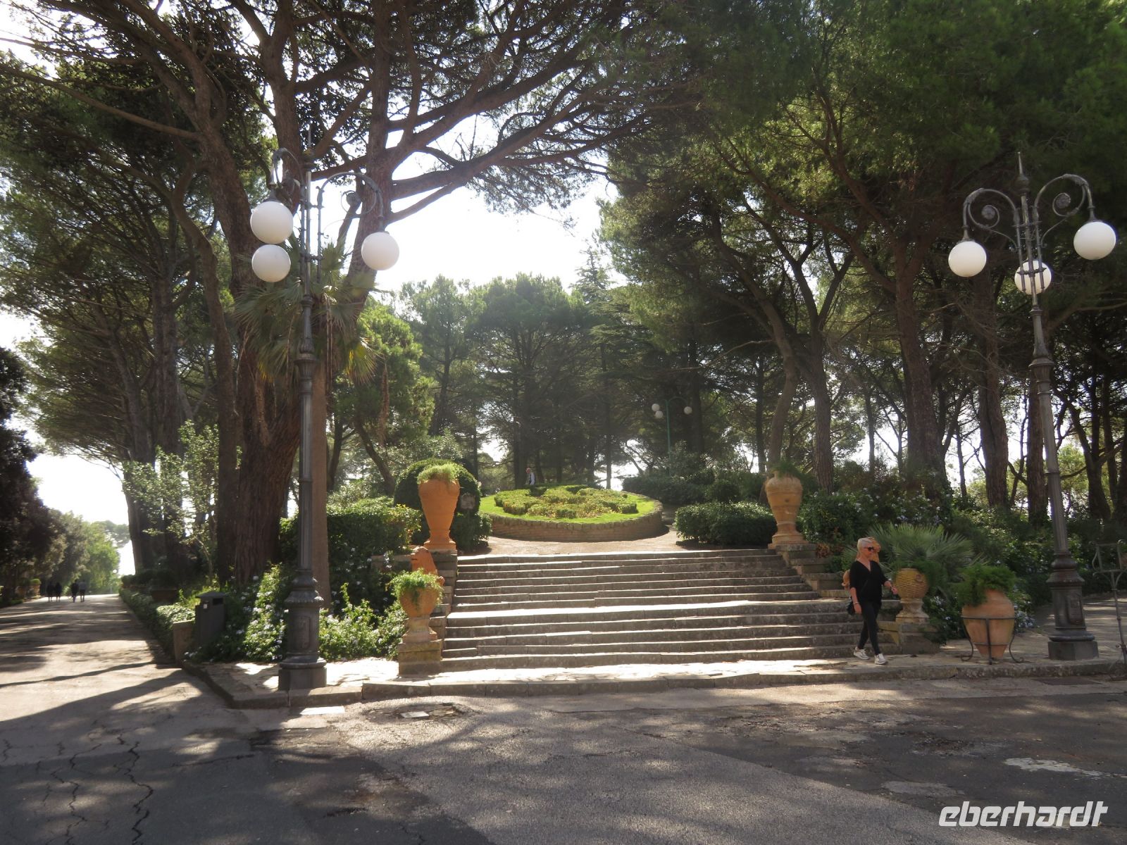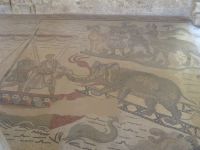 Nachdem wir uns beim Frühstück gestärkt hatten, fuhren wir heute ins Landesinnere. Auf den Straßen lag eine Ru0schicht; der Vulkan hatte diese über Nacht "verstreut". Unser erstes Ziel war Caltagirone ,die Stadt derKeramik.Straßen, Plätze und Brückengeländer sind mit Majoliken in den typischen Farben - Grün- Blau- Gelb- verziert. Natürlich auch das Geschirr in den Restaurants und Souvenirläden. Absolut beeindruckend fanden wir die Santa- Maria- del- Monte- Treppe, deren 142 Stufen wunderschön mit Majolikakacheln verziert sind. Um unseren Eindruck von dieser ungewöhnlichen Stadt zu vertiefen, nutzten wir die Gelegenheit einer zusätzlichen Rundfahrt durch die Altstadt mit einem kleinen Bähnle. Der Nachmittag gehörte ganz der Besichtigung von Piazza Armerina .Dort entdeckten,, wir neben vielen anderen wunderschönen Fußbodenmosaiken,