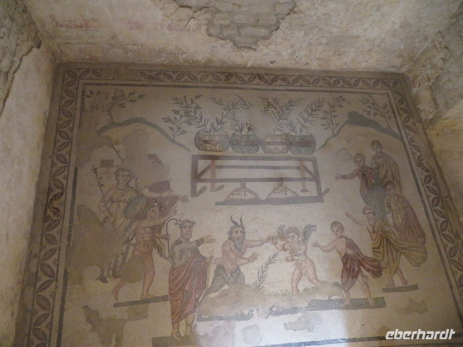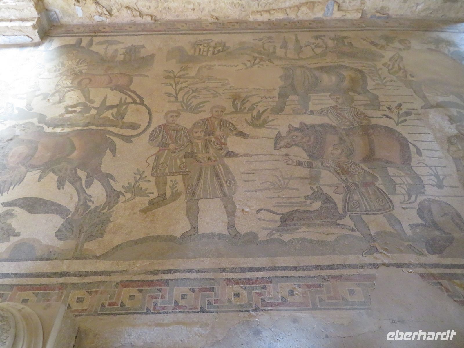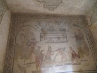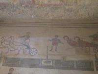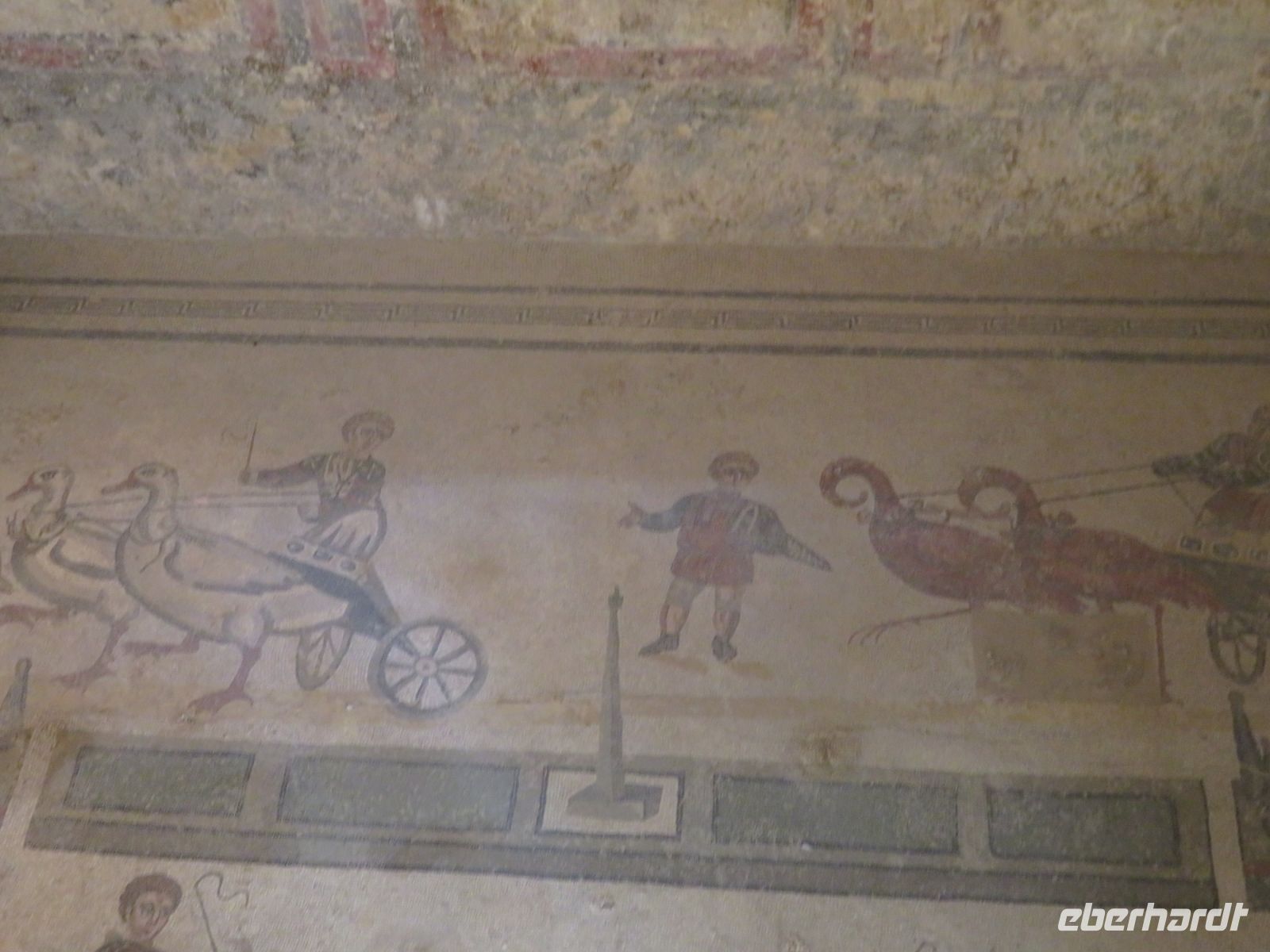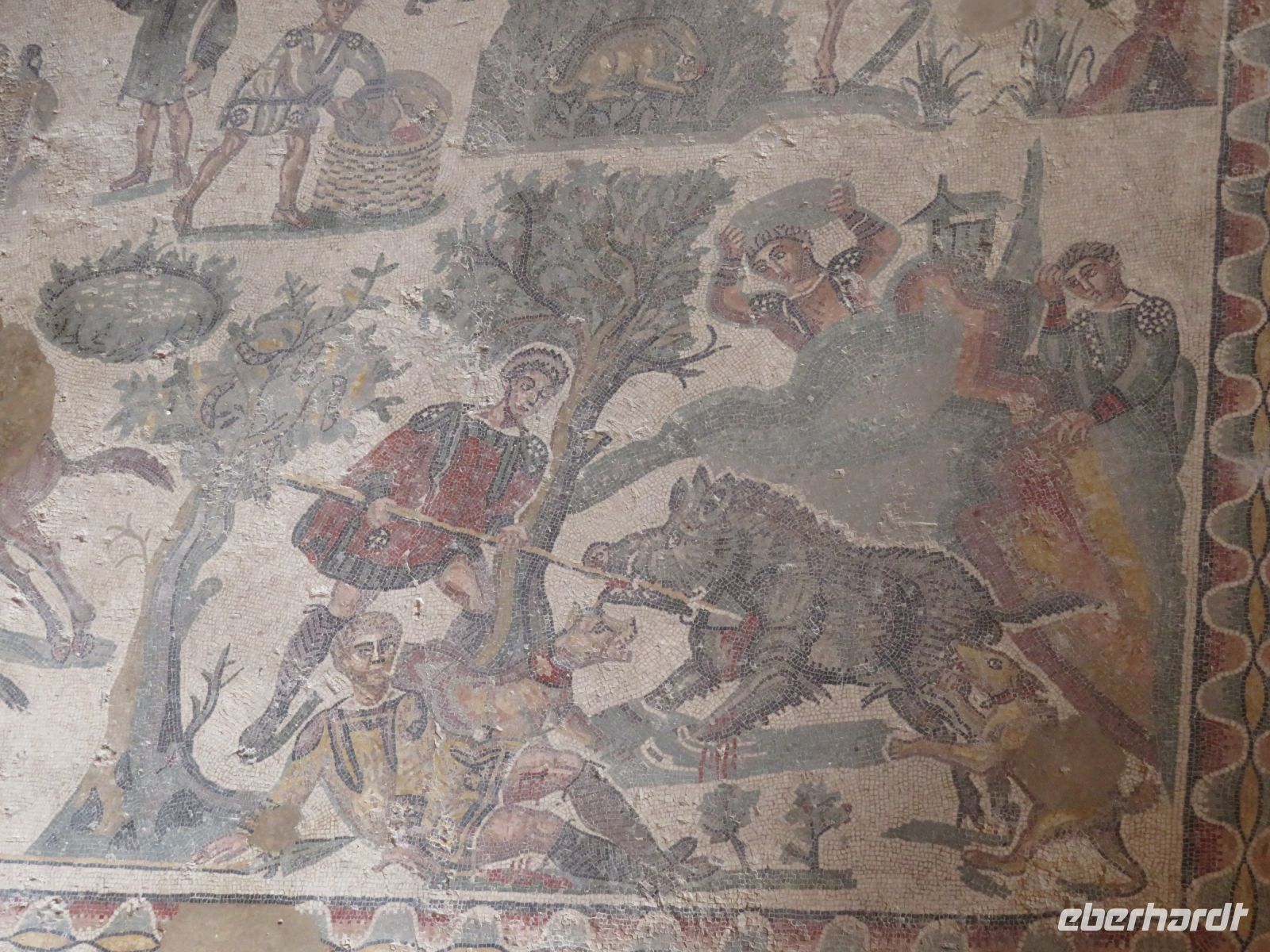 Nachdem wir uns beim Frühstück gestärkt hatten, fuhren wir heute ins Landesinnere. Auf den Straßen lag eine Ru0schicht; der Vulkan hatte diese über Nacht "verstreut". Unser erstes Ziel war Caltagirone ,die Stadt derKeramik.Straßen, Plätze und Brückengeländer sind mit Majoliken in den typischen Farben - Grün- Blau- Gelb- verziert. Natürlich auch das Geschirr in den Restaurants und Souvenirläden. Absolut beeindruckend fanden wir die Santa- Maria- del- Monte- Treppe, deren 142 Stufen wunderschön mit Majolikakacheln verziert sind. Um unseren Eindruck von dieser ungewöhnlichen Stadt zu vertiefen, nutzten wir die Gelegenheit einer zusätzlichen Rundfahrt durch die Altstadt mit einem kleinen Bähnle. Der Nachmittag gehörte ganz der Besichtigung von Piazza Armerina .Dort entdeckten,, wir neben vielen anderen wunderschönen Fußbodenmosaiken,