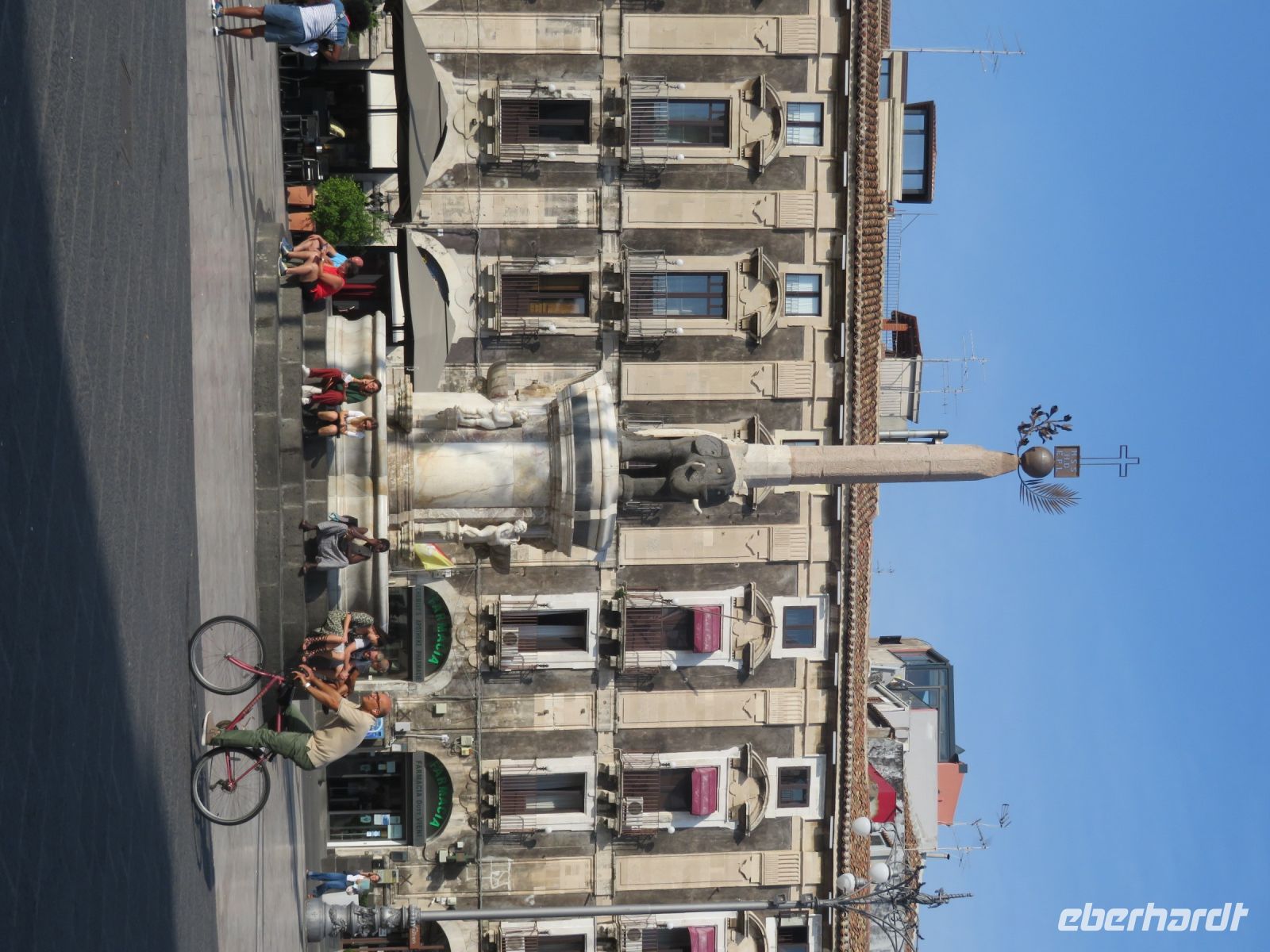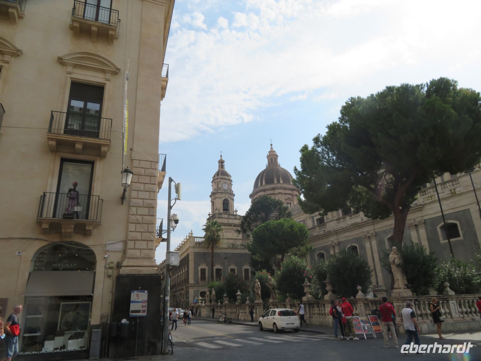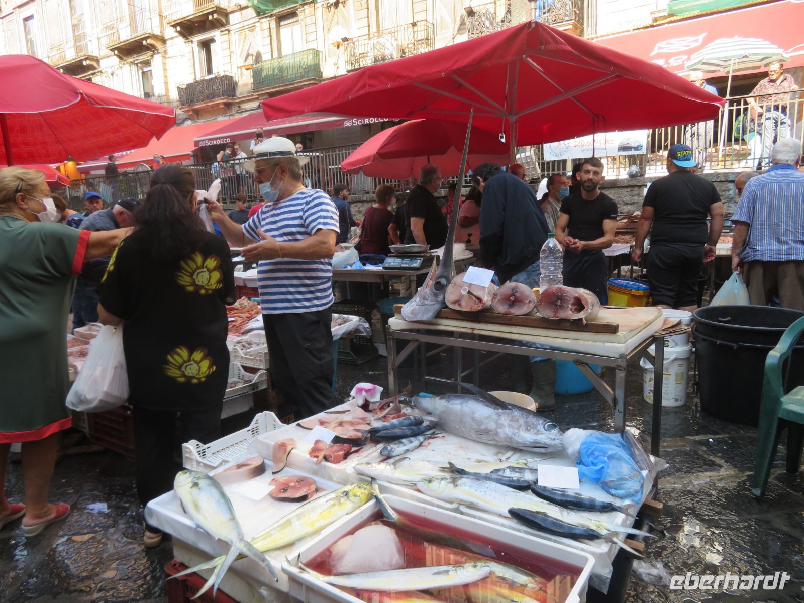 Am späten Vormittag machten wir uns auf den Weg nach Catania.Die zweitgrößte Stadt Siziliens wurde von Lavaströmen geprägt.So bedeckte dieser das untere Geschoß des Castello Ursino und sowohl Häuser als auch Straßen und die Kathedrale sind aus dem dunklen Lavagestein gebaut. Exotisch mutete uns der Fischmarkt mit seinen Thun- und Schwertfischen, Muscheln, Scampis, Seesternen und allerlei anderem Meeresgetier an.