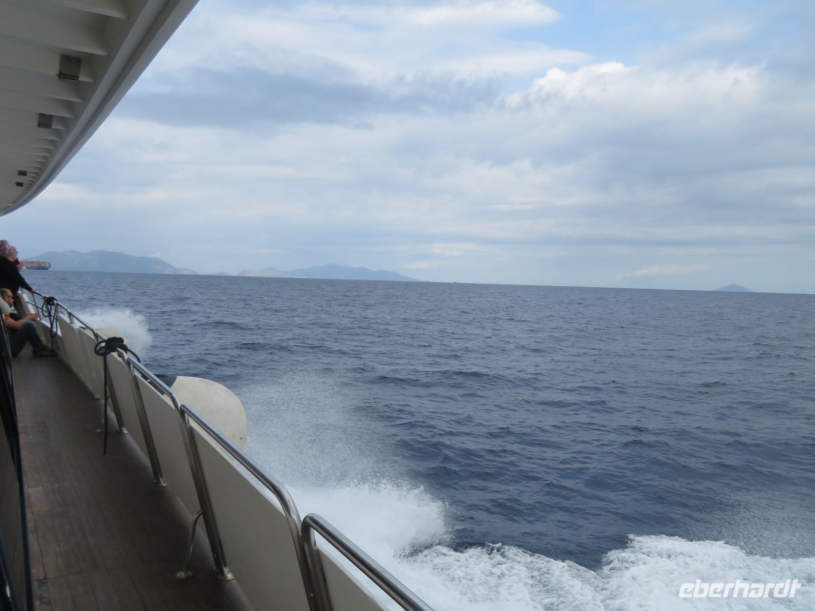 Nach einer Fahrt in den Norden gelangten wir in den Hafen von Milazzo.Dort nahmen wir das Schiff zu den Liparischen Inseln, die eigentlich nach dem Gott der Winde benannt sind. Äolus war uns wohlgesonnen. Bei ruhiger See konnten wir eine traumhafte Fahrt genießen; mit Blick auf die Inseln Salina, Filicudi und Alicudi schipperten wir an der Insel Vulkano vorbei. Sogar Stromboli konnten wir von weitem erkennen. An Vulcano vorbei erreichten wir die reizende Insel Lipari. Domenica spazierte mit uns durch die Gassen mit ihren schönen Geschäften auf den Hügel, wo wir die Aussicht über Lipari genossen.Nachmittags brachte das Schiff uns nach Vulcano, wo wir am schwarzen Strand noch viele Badelustige bewunderten. Wegen der erhöhten Gefahrenlage durften wir leider nicht auf den Berg steigen. Den typischen Schwefelgeruch erschnüffelten wir jedoch schon in der Nähe der Anlegestelle. Zurück in Milazzo brachte unser Bus uns zum Abendessen ins Hotel.Dort konnte man den Abend bei einem Drink und Pianomusik in der Bar ausklingen lassen.