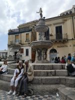 Mit einem kleinen Bus bewältigten wir Kurve nach der Kurve, bis wir hoch oben auf dem Hügel im Städtchen Taormina landeten. Weltbekannt und belagert durch die Touristen, trotzdem ein Ebenbild einer sizilianischen Seele. Die lebendige Straße hat uns mitgenommen und durch die Stadt getragen bis zum Theater: gebaut von den Griechen, genutzt von den Römern und diente der Kunst als Platz und Kulisse bis heute. Wenn man sich auf einen von den Plätzen niedersitzt, kommen vor dem inneren Auge die Bilder aus Vergangenheit: die Posaunen, die Schauspieler in Tunikas und vielleicht mit den Masken, rührende Tragödien….