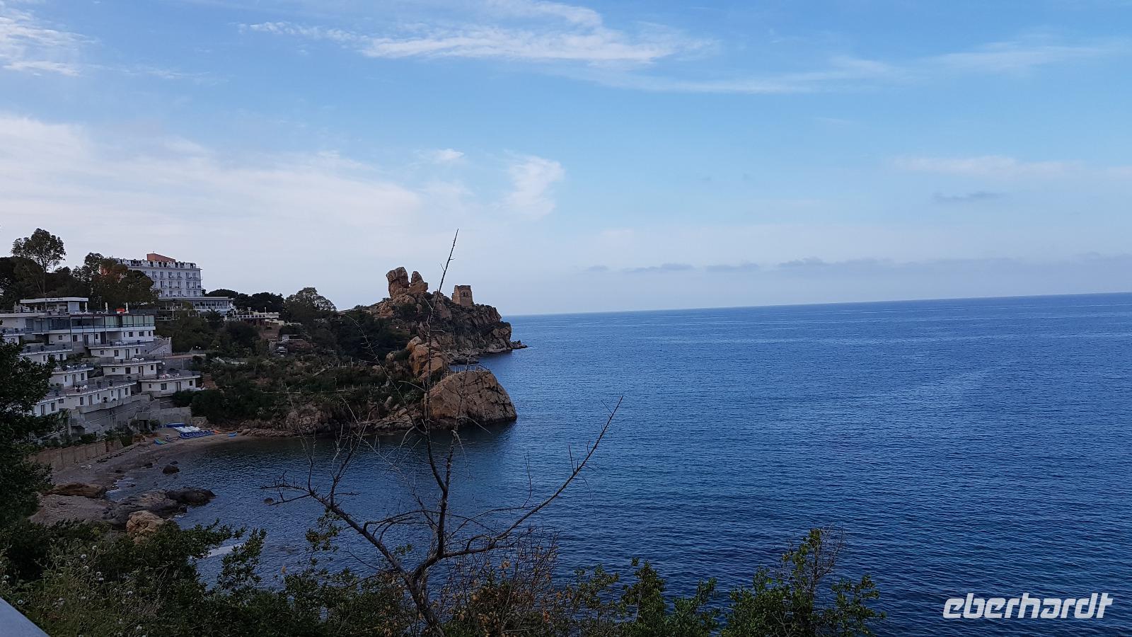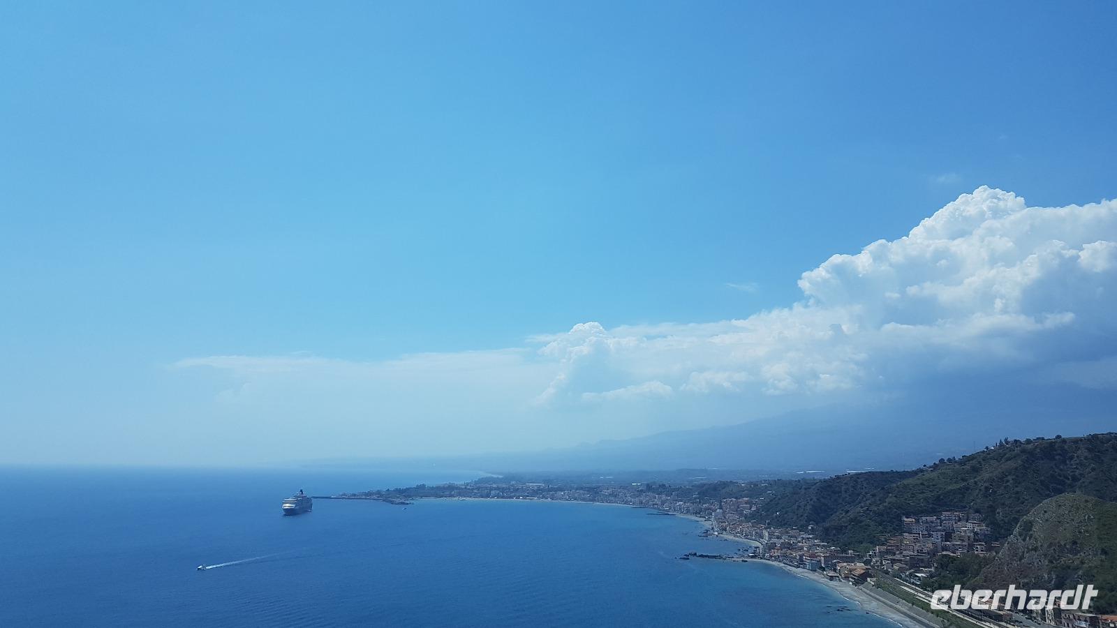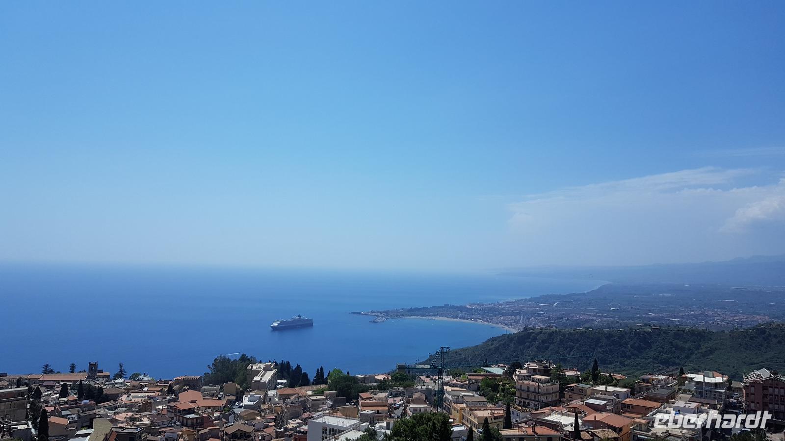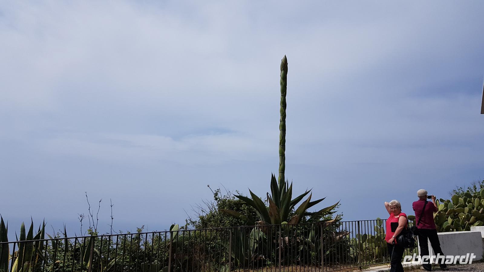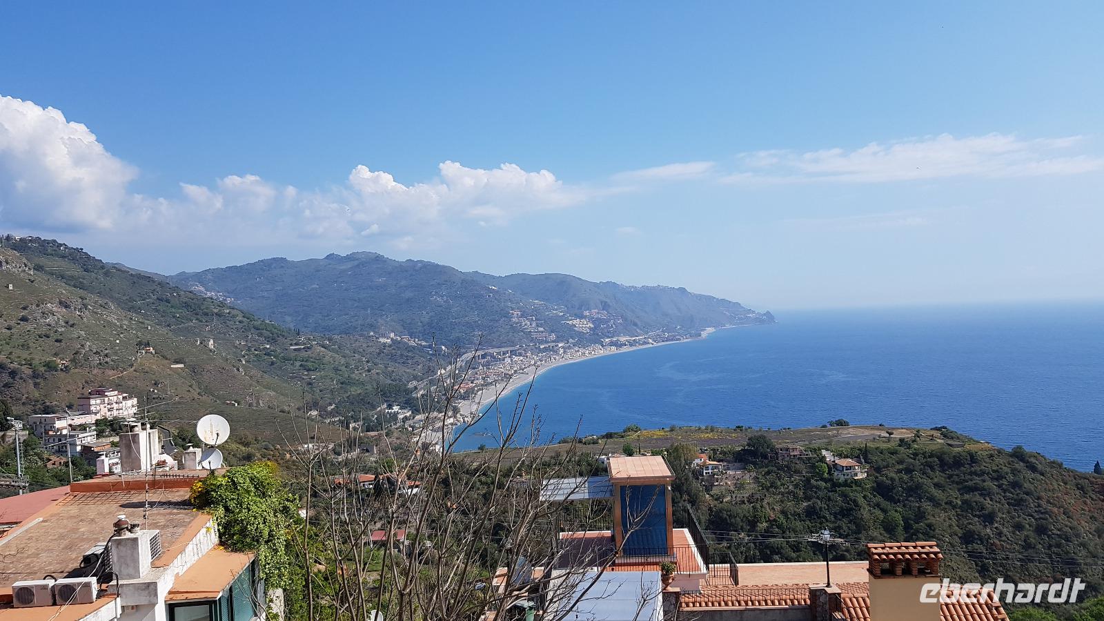 Strahlender Sonnenschein begrüßt uns heute Morgen. Gestern hatten sie am Strand alles aufgeräumt und plan gemacht- perfekt für alle die, die heute hier bleiben. Mit 13 wagemutigen starte ich um 9 Uhr unseren Ausflug nach Castelmola. Bis zum Bus-Terminal ist es ein hübscher Morgenspaziergang, hier rüsten wir uns mit Fahrplänen nach Taormina und weiter nach Castelmola aus. Endlich kommt auch unser Bus- er fährt tatsächlich die Küstenstraße entlang (was die Reisebusse nicht dürfen) und so genießen wir ein einzigartiges Panorama hinauf nach Taormina. In der Bucht liegt ein Kreuzfahrtschiff vor Anker, man kann sehen, wie die Gäste mit den Tenderbooten an Land gebracht werden. Wir haben einen tollen Blick auf die Isola Bella und bewundern den Busfahrer, wie er die Serpentinen hier hinauf trotz Gegenverkehr meistert. In Taormina hieß es dann warten. Es ist Wochenende und der Verkehr ziemlich dicht nach Castelmola hinauf, so wurde uns gesagt. Wir nutzten die Zeit für einen kurzen Spaziergang auf eine Aussichtsplattform eines Hotels- was für ein Blick ! Dann endlich: ein Bus zeigte Castelmola an und wir konnten einsteigen. Und wieder diese Serpentinen! Immerhin fuhren wir bis auf 550 Meter hinauf. In Castelmola angekommen genossen wir erst einmal den Blick von hier oben, da war das griechisch-römische Theater, das wir schon bei unserem Besuch in Taormina kennengelernt hatten, dort die alte Burganlage, die hoch über allem thront.Wir steigen die Stufen hinauf und gehen am Castell vorbei, tauchen ein in die kleinen Gassen des Städtchens. Eine Besonderheit wollte ich den Gästen nicht vorenthalten: das Cafe Turrisi. Hier dreht sich alles um die Männlichkeit- der Phallus ist in allen Formen, Größen und Darstellungen überall präsent. Selbst die Lampen, Armlehnen, Geländer, Bodenfliesen- alles huldigt der Männlichkeit. Sichtlich erheitert setzen wir unseren Spaziergang fort, erstehen noch eine Karte oder ein Souvenir und schon heißt es Abschied nehmen. Dieses Mal ist der Bus überpünktlich. Er bringt uns sicher zurück nach Taormina. Einige Gäste bleiben noch hier, mit den anderen fahre ich zurück nach Giardini Naxos. Natürlich habe ich mal wieder nicht richtig hingehört, was der Fahrer an der Haltestelle sagte, ich verstand, dass wir hier aussteigen sollten, der nächste Bus würde zu unserem Terminal nach Recanati fahren. Also alle aussteigen. Gut, dass Frau Schneider nochmal nachgefragt hatte, er meinte natürlich, die nächste Haltestelle sei unser Teminal. Also alle wieder einsteigen- so einfach wird aus einem Linienbus ein Hop on-Hop off. Wohlbehalten kommen wir also wieder an und unsere Wege zerstreuen sich, einige möchten eine Kleinigkeit essen, andere laufen zurück zum Hotel und wollen es den anderen gleichtun- das wunderbare Wetter am Strand genießen. Ein perfekter Urlaubstag wird dann wieder mit einem tollen Buffett zum Abendessen gekrönt. Wir verabschieden und von Familie Schneider, die noch ein paar Urlaubstage dranhängt und dann heißt es früh schlafen gehen, für morgen 6.00 Uhr ist schon Frühstück angesagt.