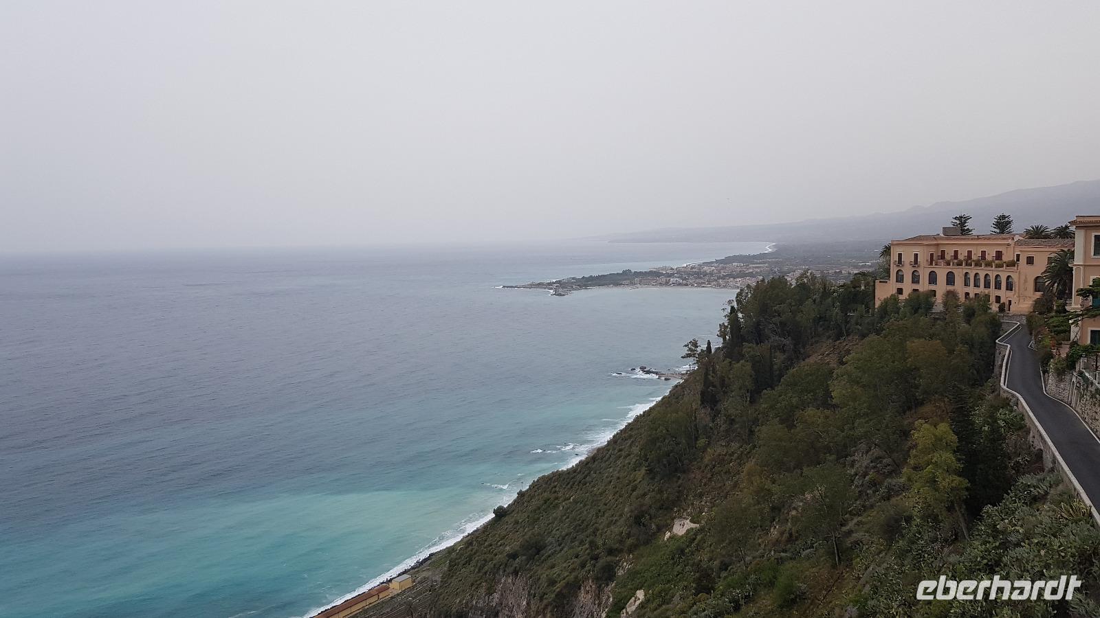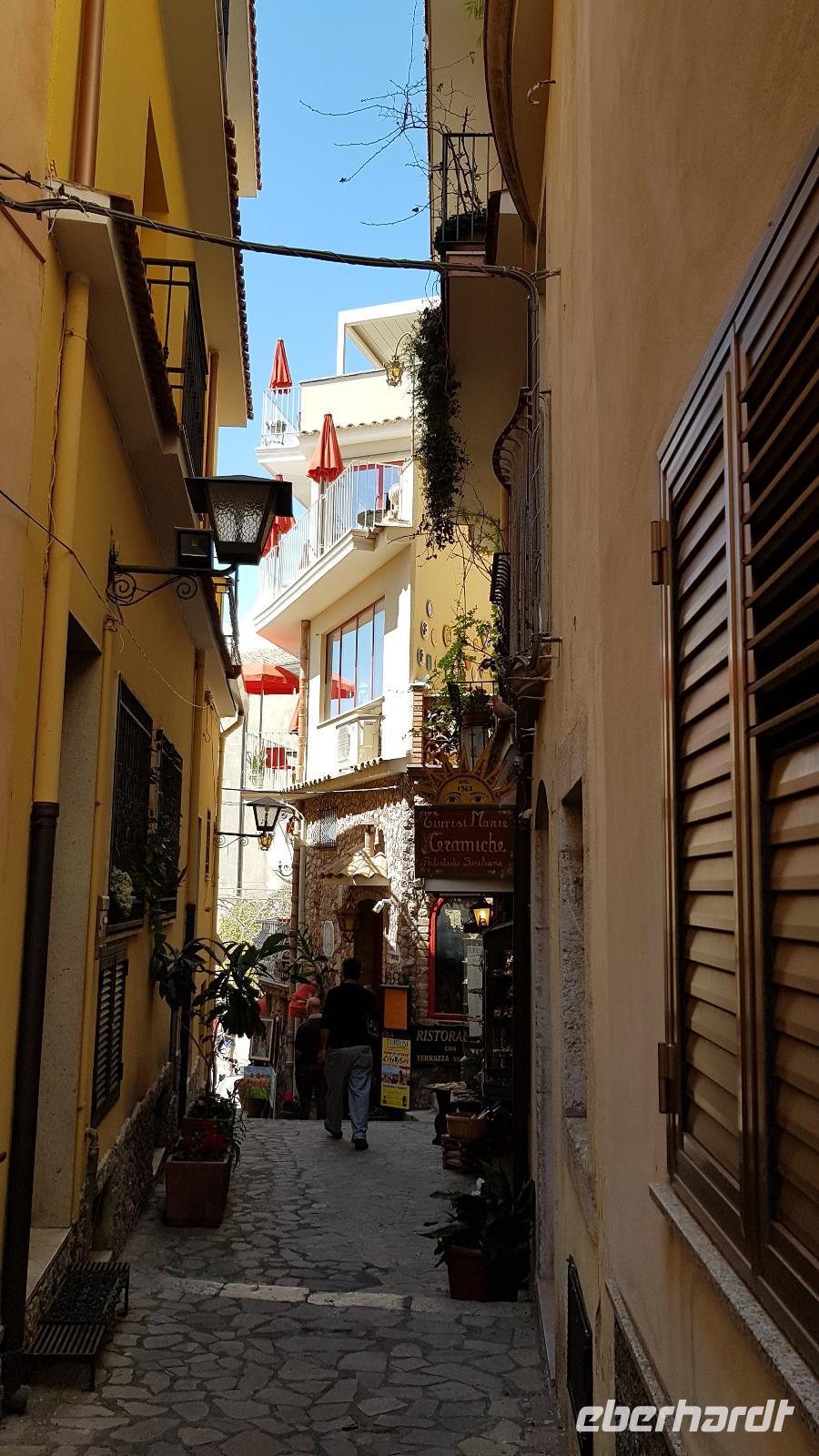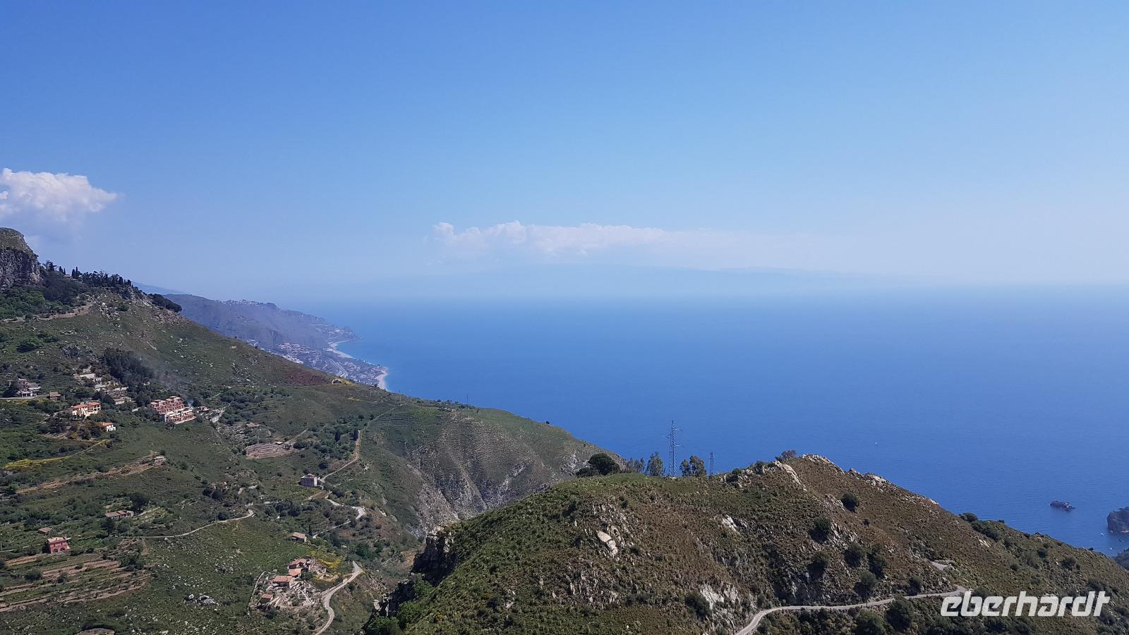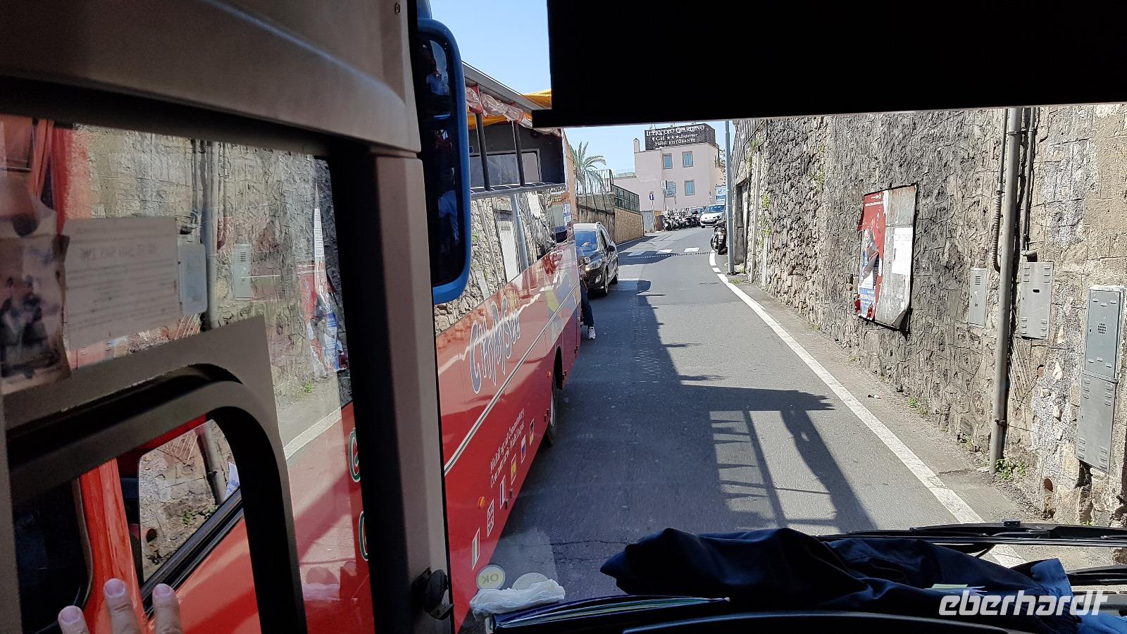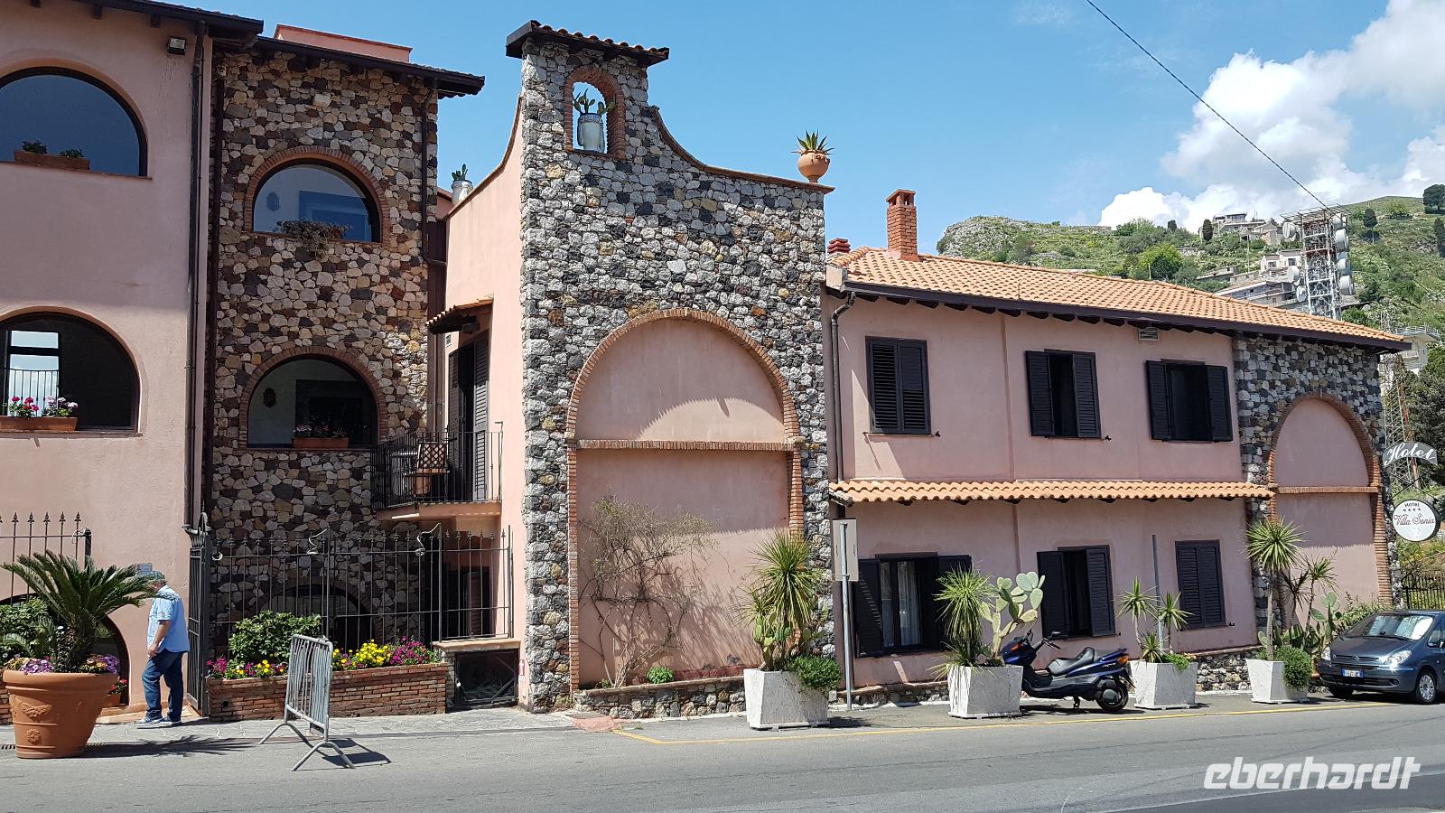 Strahlender Sonnenschein begrüßt uns heute Morgen. Gestern hatten sie am Strand alles aufgeräumt und plan gemacht- perfekt für alle die, die heute hier bleiben. Mit 13 wagemutigen starte ich um 9 Uhr unseren Ausflug nach Castelmola. Bis zum Bus-Terminal ist es ein hübscher Morgenspaziergang, hier rüsten wir uns mit Fahrplänen nach Taormina und weiter nach Castelmola aus. Endlich kommt auch unser Bus- er fährt tatsächlich die Küstenstraße entlang (was die Reisebusse nicht dürfen) und so genießen wir ein einzigartiges Panorama hinauf nach Taormina. In der Bucht liegt ein Kreuzfahrtschiff vor Anker, man kann sehen, wie die Gäste mit den Tenderbooten an Land gebracht werden. Wir haben einen tollen Blick auf die Isola Bella und bewundern den Busfahrer, wie er die Serpentinen hier hinauf trotz Gegenverkehr meistert. In Taormina hieß es dann warten. Es ist Wochenende und der Verkehr ziemlich dicht nach Castelmola hinauf, so wurde uns gesagt. Wir nutzten die Zeit für einen kurzen Spaziergang auf eine Aussichtsplattform eines Hotels- was für ein Blick ! Dann endlich: ein Bus zeigte Castelmola an und wir konnten einsteigen. Und wieder diese Serpentinen! Immerhin fuhren wir bis auf 550 Meter hinauf. In Castelmola angekommen genossen wir erst einmal den Blick von hier oben, da war das griechisch-römische Theater, das wir schon bei unserem Besuch in Taormina kennengelernt hatten, dort die alte Burganlage, die hoch über allem thront.Wir steigen die Stufen hinauf und gehen am Castell vorbei, tauchen ein in die kleinen Gassen des Städtchens. Eine Besonderheit wollte ich den Gästen nicht vorenthalten: das Cafe Turrisi. Hier dreht sich alles um die Männlichkeit- der Phallus ist in allen Formen, Größen und Darstellungen überall präsent. Selbst die Lampen, Armlehnen, Geländer, Bodenfliesen- alles huldigt der Männlichkeit. Sichtlich erheitert setzen wir unseren Spaziergang fort, erstehen noch eine Karte oder ein Souvenir und schon heißt es Abschied nehmen. Dieses Mal ist der Bus überpünktlich. Er bringt uns sicher zurück nach Taormina. Einige Gäste bleiben noch hier, mit den anderen fahre ich zurück nach Giardini Naxos. Natürlich habe ich mal wieder nicht richtig hingehört, was der Fahrer an der Haltestelle sagte, ich verstand, dass wir hier aussteigen sollten, der nächste Bus würde zu unserem Terminal nach Recanati fahren. Also alle aussteigen. Gut, dass Frau Schneider nochmal nachgefragt hatte, er meinte natürlich, die nächste Haltestelle sei unser Teminal. Also alle wieder einsteigen- so einfach wird aus einem Linienbus ein Hop on-Hop off. Wohlbehalten kommen wir also wieder an und unsere Wege zerstreuen sich, einige möchten eine Kleinigkeit essen, andere laufen zurück zum Hotel und wollen es den anderen gleichtun- das wunderbare Wetter am Strand genießen. Ein perfekter Urlaubstag wird dann wieder mit einem tollen Buffett zum Abendessen gekrönt. Wir verabschieden und von Familie Schneider, die noch ein paar Urlaubstage dranhängt und dann heißt es früh schlafen gehen, für morgen 6.00 Uhr ist schon Frühstück angesagt.