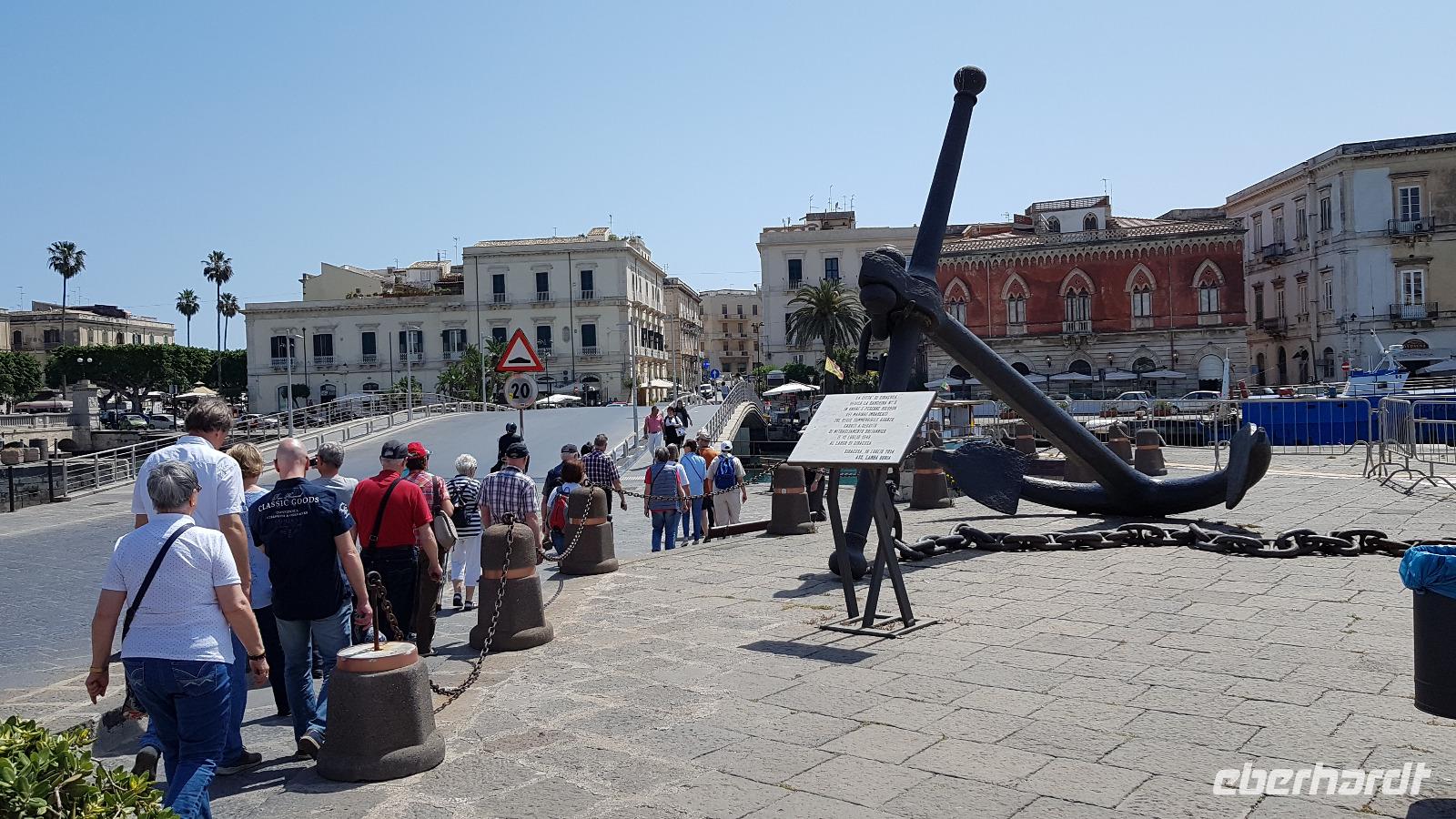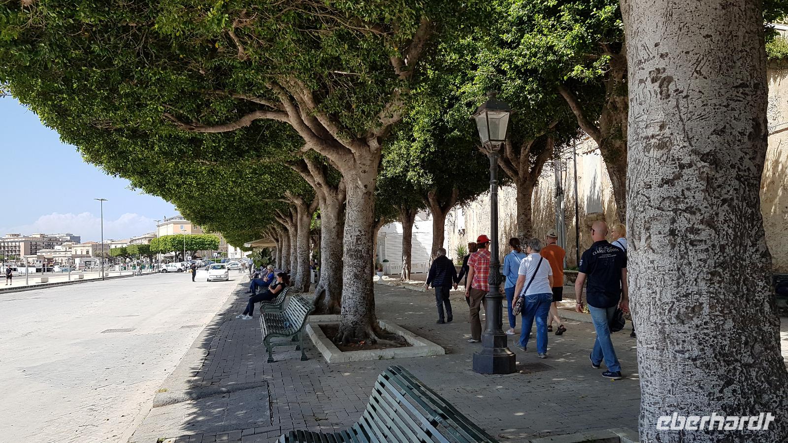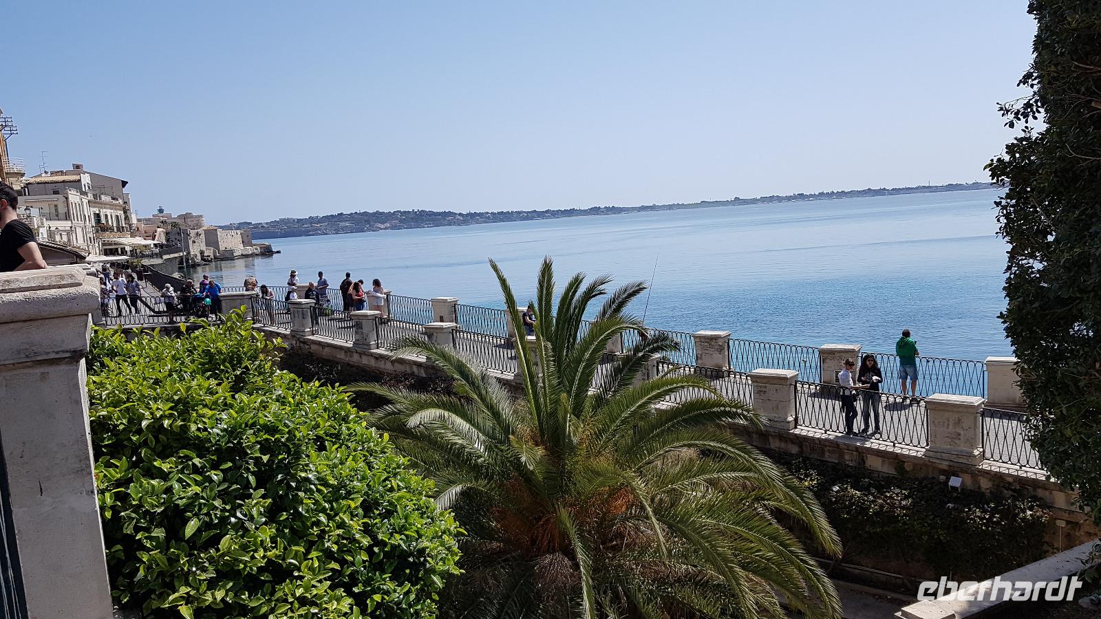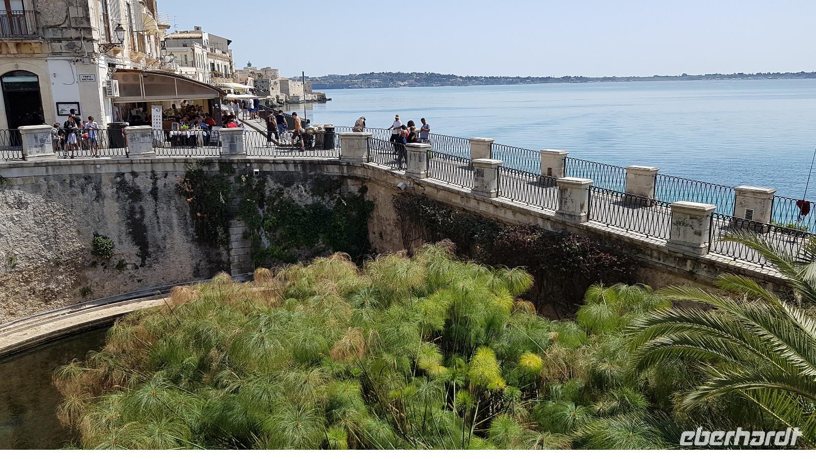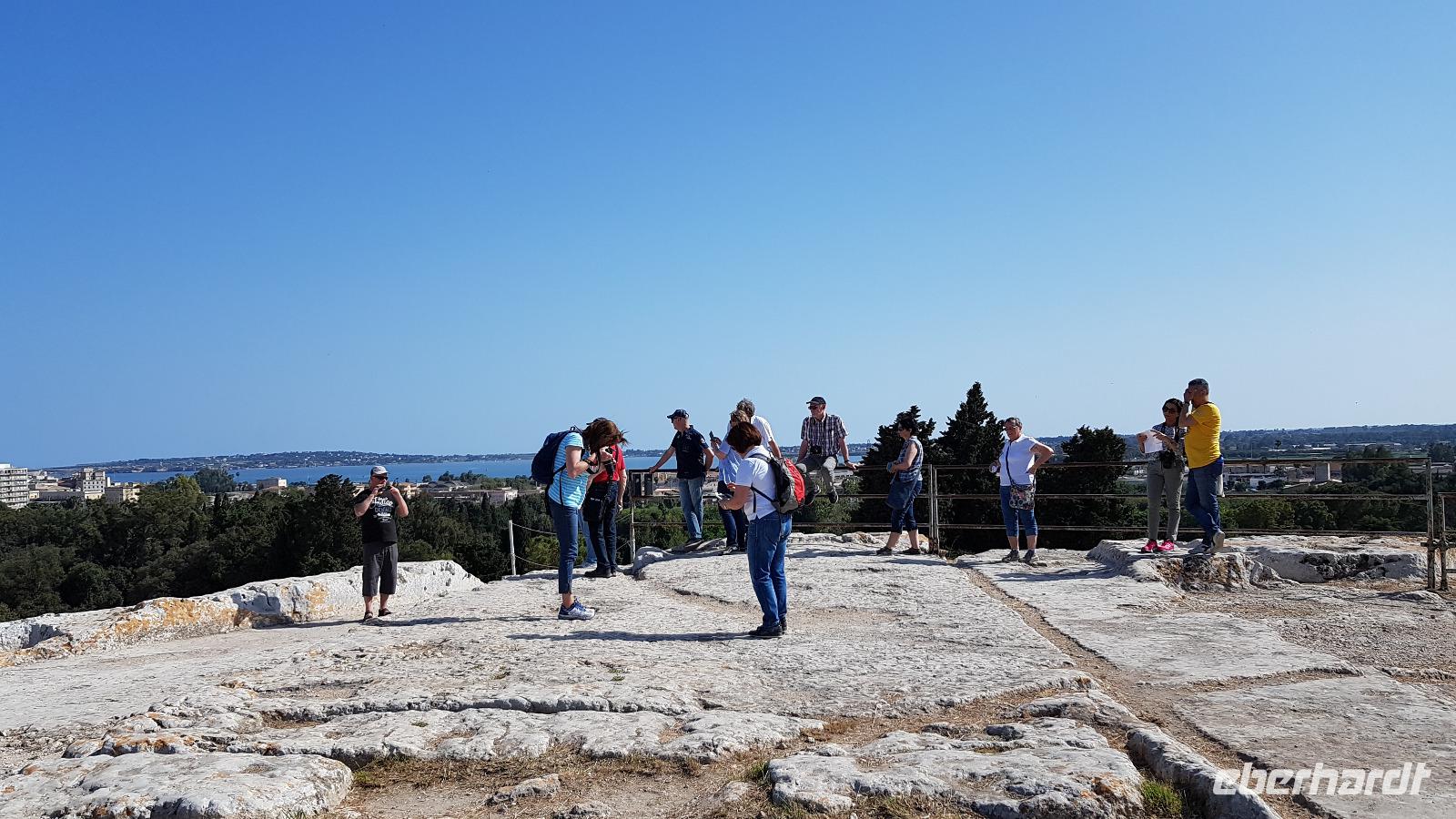 Heute stehen Catania und Syrakus auf dem Programm - Geschichte und Gegenwart pur. Es sind etliche Kilometer zu fahren und so starten wir wieder 8 Uhr. In Catania, der schwarz-weißen Stadt, (für Vulkangestein und feinen weißen Sandstein) fahren wir die Via Etnea in die Stadt, auf der ältesten Achse zwischen Hafen und Berg (Ätna). Vorbei am botanischen Garten der Benediktiner, einem der ältesten in Europa, vorbei am Bellini Pavillon erreichen wir bald das Zentrum. Hier um den Domplatz herum hatte sich der Großadel niedergelassen. Nach dem verheerenden Vulkanausbruch 1693, bei dem mehr als 100.000 Menschen ihr Leben verloren und die Stadt fast völlig zerstört wurde wurde die Stadt im Barockstil neu aufgebaut. Man musste zeigen, was man hatte- auch wenn es nur geborgt war. Doreen erzählte uns, dass „Barock" damals eine ziemlich abwertende Bezeichnung war für etwas, was nicht ordentlich gegliedert und gebaut war wie z.B. beim Klassizismus. Der neue Baustil mit Rundungen und Hervorhebungen und verspielten Details war den damaligen Architekten suspekt und eben „barock". Wir passieren den Amenano- Brunnen der über dem gleichnamigen Fluss am Domplatz liegt und gelangen zum berühmten Fischmarkt. Das hatte so keiner von uns erwartet. Hier gab es alles: vom sogenannten neugeborenen Fisch, der als Beifang in den Netzen landet und außerordentlich eiweißreich ist über Gürtelfische, natürlich Thunfische, Schwertfische, Muscheln, Austern, alle Arten von Brassen, Sardinen...was für ein Erlebnis! Aber das war längst nicht alles. Jeden Tag außer Sonntag gibt es diesen Markt. An den Fischmarkt reihen sich nahtlos Gemüse und Obstmärkte, Käse und Fleisch wird feilgeboten, frische Artischocken ebenso wir Saubohnen und Meter-Zucchini, Ochsenherz-Tomaten und frische oder getrocknete Kräuter. Wir müssen uns erst einmal sammeln ob der vielen Eindrücke und spazieren zum Castell Ursino. Ein typischer Bau von Friedrich II., er ließ auf einem quadratischen Grundriss die Ecken mit runden oder halbrunden Türmen verstärken. Dies sollte uns auch in Syrakus wieder begegnen. Die große Besonderheit des Castells aber ist, dass es einst im Meer errichtet wurde. Beim Vulkanausbruch 1693 floss die Lava tatsächlich um das Castell herum, die Mauern hielten stand und plötzlich stand das Castell in der Stadt. Die Lava hatte für eine völlig neue Küstenlinie gesorgt. Wir haben ein wenig freie Zeit und treffen uns am Elefantenbrunnen wieder. Von hier aus gehen wir zurück zum Bus, unterwegs kann ich Mispeln kaufen und reiche sie den Gästen zum Probieren. Der süß-saure Geschmack ist neu für unsere Gaumen, trotzdem sehr lecker. Mit einem kurzen Zwischenstopp fahren wir weiter nach Syrakus. Antonio bringt uns ins Zentrum, hier laufen wir über den Kanale zur Altstadt und am Apollo- Tempel legen wir erst einmal eine Mittagspause ein. Doreen zeigt uns dann die Stadt mit den Gassen, dem Dom und weiter zur Arethusa Quelle. Es sind mehr als 26°C und wir beschließen, unten unter den Bäumen weiter am Hafen entlang zu spazieren. Kurz sind wir versucht, hier im kühlen Schatten zu bleiben- aber es fehlt noch ein Punkt: die archäologische Zone. Antonio fährt uns hin und wir starten beim großen Opferaltar am Eingang. Mehrere hundert Stiere sind hier auf einmal geopfert worden- ein großes Fest für die Menschen hier, die sich sonst nie Fleisch leisten konnten- denn das Fleisch wurde gebraten und gegessen. Wir steigen hinauf und blicken auf das Theater hinunter. Bauarbeiter sind damit beschäftigt, die in Stein gehauenen und verwitterten Sitzreihen mit einer Holzkonstruktion wieder in annehmbare Sitzreihen zu verwandeln. Bald startet hier die Saison und Aufführungen von Klassik bis Konzert lösen sich ab. Wohltuend streicht eine kühle Brise vom Meer zu uns hinauf und nachdem wir die Quelle und die Grabstätten besichtigt haben steigen wir wieder hinab. Im Steinbruch dann gelangen wir zum Ohr des Dyonisio, 65 Meter erstreckt sich die Höhle hinein in den Stein und bietet eine unfassbare Akkustik. Doch niemand ist mutig genug, dies auszuprobieren. Bis auf Norbert - er stimmt das Steigerlied an, alle singen mit und es hallt weit hörbar in das sizilianische Land. So endet auch dieser Tag voller Eindrücke und Impressionen, am Ende müssen wir uns von Antonio und Doreen verabschieden. Der Tag morgen ist individuell und wer mag lässt sich auf das Abenteuer öffentliche Verkehrsmittel ein, fährt mit nach Castelmola. Dort erwartet uns noch eine besondere Überraschung.