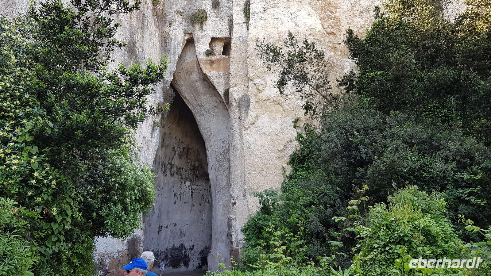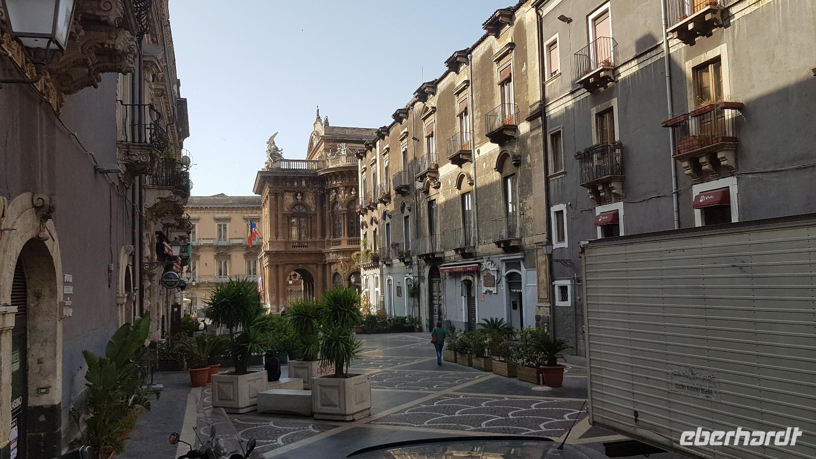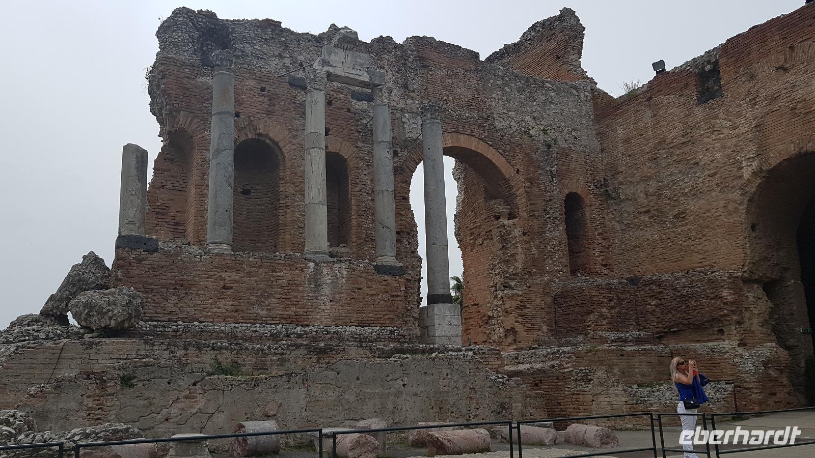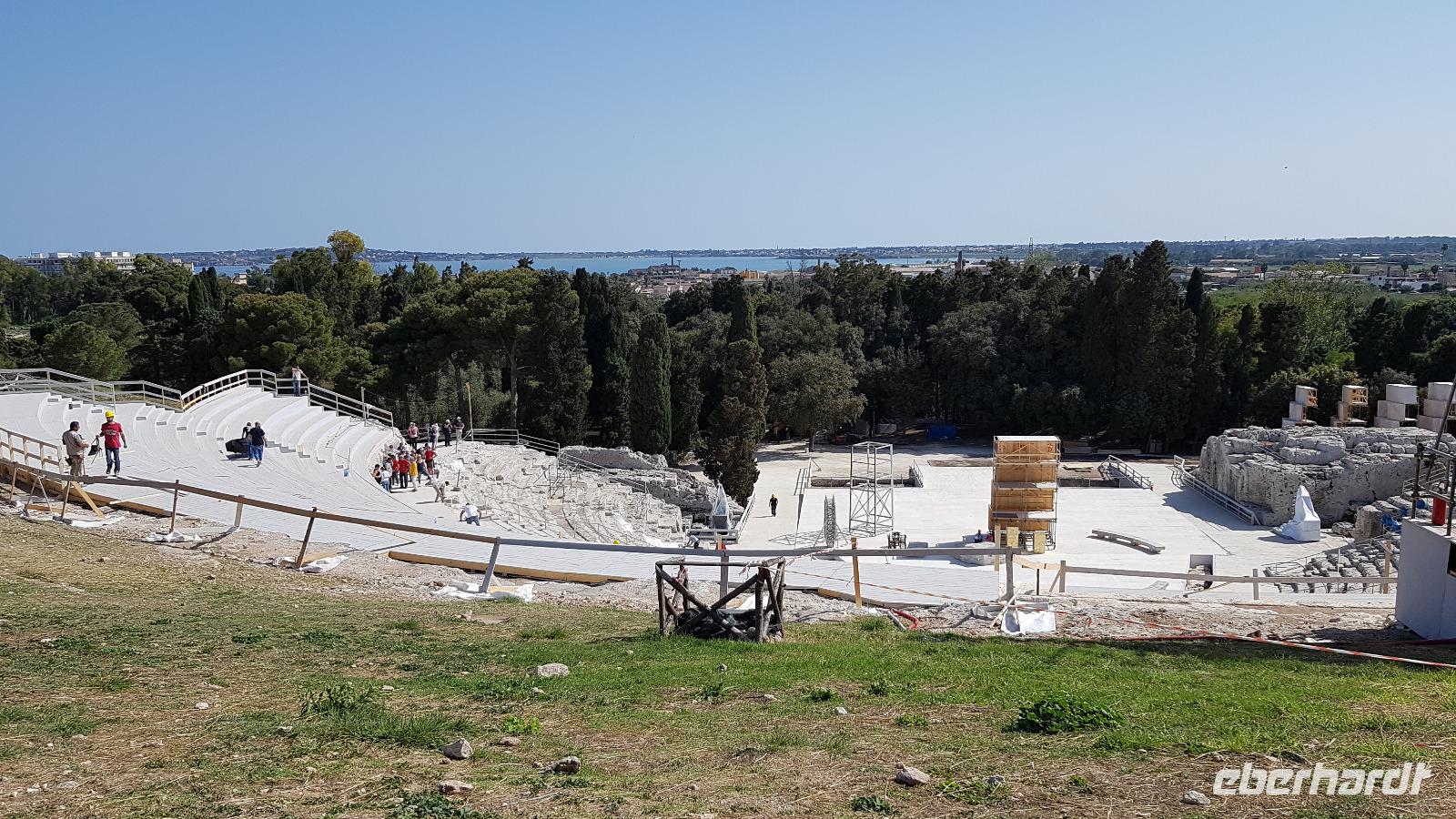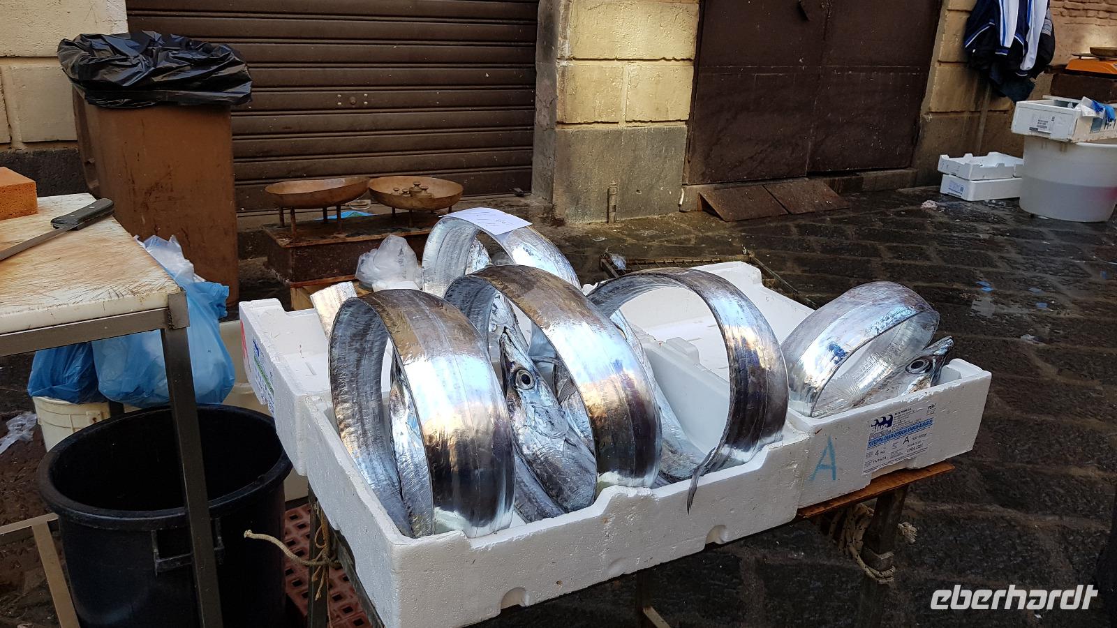 Heute stehen Catania und Syrakus auf dem Programm - Geschichte und Gegenwart pur. Es sind etliche Kilometer zu fahren und so starten wir wieder 8 Uhr. In Catania, der schwarz-weißen Stadt, (für Vulkangestein und feinen weißen Sandstein) fahren wir die Via Etnea in die Stadt, auf der ältesten Achse zwischen Hafen und Berg (Ätna). Vorbei am botanischen Garten der Benediktiner, einem der ältesten in Europa, vorbei am Bellini Pavillon erreichen wir bald das Zentrum. Hier um den Domplatz herum hatte sich der Großadel niedergelassen. Nach dem verheerenden Vulkanausbruch 1693, bei dem mehr als 100.000 Menschen ihr Leben verloren und die Stadt fast völlig zerstört wurde wurde die Stadt im Barockstil neu aufgebaut. Man musste zeigen, was man hatte- auch wenn es nur geborgt war. Doreen erzählte uns, dass „Barock" damals eine ziemlich abwertende Bezeichnung war für etwas, was nicht ordentlich gegliedert und gebaut war wie z.B. beim Klassizismus. Der neue Baustil mit Rundungen und Hervorhebungen und verspielten Details war den damaligen Architekten suspekt und eben „barock". Wir passieren den Amenano- Brunnen der über dem gleichnamigen Fluss am Domplatz liegt und gelangen zum berühmten Fischmarkt. Das hatte so keiner von uns erwartet. Hier gab es alles: vom sogenannten neugeborenen Fisch, der als Beifang in den Netzen landet und außerordentlich eiweißreich ist über Gürtelfische, natürlich Thunfische, Schwertfische, Muscheln, Austern, alle Arten von Brassen, Sardinen...was für ein Erlebnis! Aber das war längst nicht alles. Jeden Tag außer Sonntag gibt es diesen Markt. An den Fischmarkt reihen sich nahtlos Gemüse und Obstmärkte, Käse und Fleisch wird feilgeboten, frische Artischocken ebenso wir Saubohnen und Meter-Zucchini, Ochsenherz-Tomaten und frische oder getrocknete Kräuter. Wir müssen uns erst einmal sammeln ob der vielen Eindrücke und spazieren zum Castell Ursino. Ein typischer Bau von Friedrich II., er ließ auf einem quadratischen Grundriss die Ecken mit runden oder halbrunden Türmen verstärken. Dies sollte uns auch in Syrakus wieder begegnen. Die große Besonderheit des Castells aber ist, dass es einst im Meer errichtet wurde. Beim Vulkanausbruch 1693 floss die Lava tatsächlich um das Castell herum, die Mauern hielten stand und plötzlich stand das Castell in der Stadt. Die Lava hatte für eine völlig neue Küstenlinie gesorgt. Wir haben ein wenig freie Zeit und treffen uns am Elefantenbrunnen wieder. Von hier aus gehen wir zurück zum Bus, unterwegs kann ich Mispeln kaufen und reiche sie den Gästen zum Probieren. Der süß-saure Geschmack ist neu für unsere Gaumen, trotzdem sehr lecker. Mit einem kurzen Zwischenstopp fahren wir weiter nach Syrakus. Antonio bringt uns ins Zentrum, hier laufen wir über den Kanale zur Altstadt und am Apollo- Tempel legen wir erst einmal eine Mittagspause ein. Doreen zeigt uns dann die Stadt mit den Gassen, dem Dom und weiter zur Arethusa Quelle. Es sind mehr als 26°C und wir beschließen, unten unter den Bäumen weiter am Hafen entlang zu spazieren. Kurz sind wir versucht, hier im kühlen Schatten zu bleiben- aber es fehlt noch ein Punkt: die archäologische Zone. Antonio fährt uns hin und wir starten beim großen Opferaltar am Eingang. Mehrere hundert Stiere sind hier auf einmal geopfert worden- ein großes Fest für die Menschen hier, die sich sonst nie Fleisch leisten konnten- denn das Fleisch wurde gebraten und gegessen. Wir steigen hinauf und blicken auf das Theater hinunter. Bauarbeiter sind damit beschäftigt, die in Stein gehauenen und verwitterten Sitzreihen mit einer Holzkonstruktion wieder in annehmbare Sitzreihen zu verwandeln. Bald startet hier die Saison und Aufführungen von Klassik bis Konzert lösen sich ab. Wohltuend streicht eine kühle Brise vom Meer zu uns hinauf und nachdem wir die Quelle und die Grabstätten besichtigt haben steigen wir wieder hinab. Im Steinbruch dann gelangen wir zum Ohr des Dyonisio, 65 Meter erstreckt sich die Höhle hinein in den Stein und bietet eine unfassbare Akkustik. Doch niemand ist mutig genug, dies auszuprobieren. Bis auf Norbert - er stimmt das Steigerlied an, alle singen mit und es hallt weit hörbar in das sizilianische Land. So endet auch dieser Tag voller Eindrücke und Impressionen, am Ende müssen wir uns von Antonio und Doreen verabschieden. Der Tag morgen ist individuell und wer mag lässt sich auf das Abenteuer öffentliche Verkehrsmittel ein, fährt mit nach Castelmola. Dort erwartet uns noch eine besondere Überraschung.