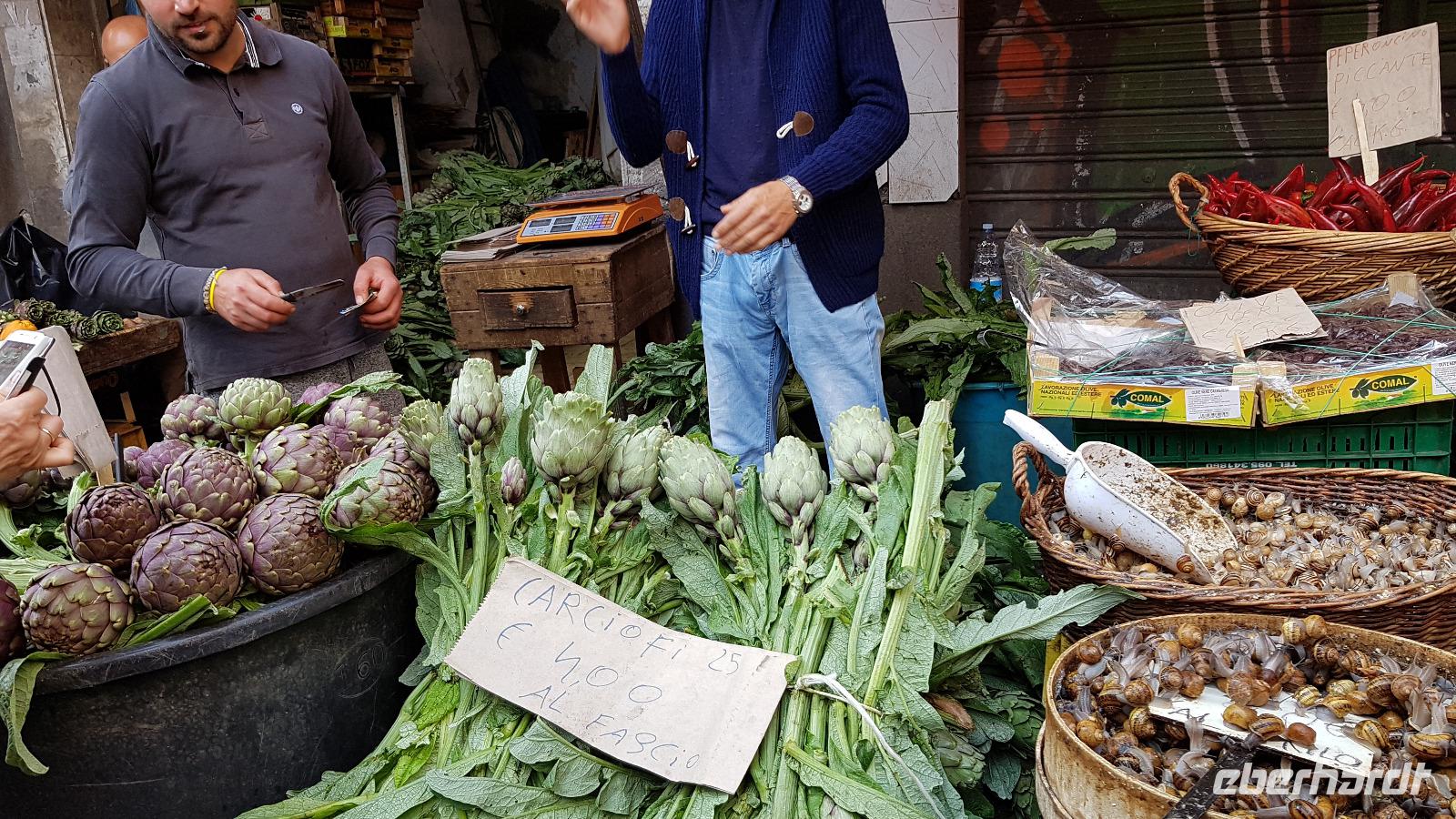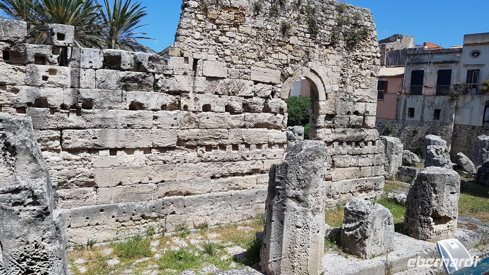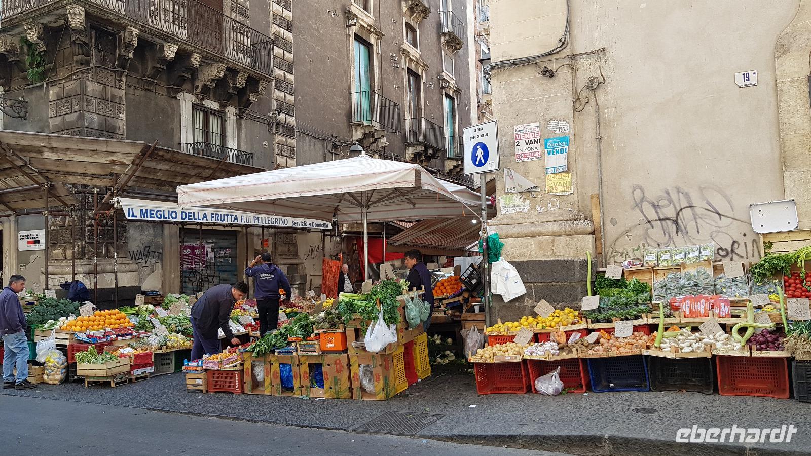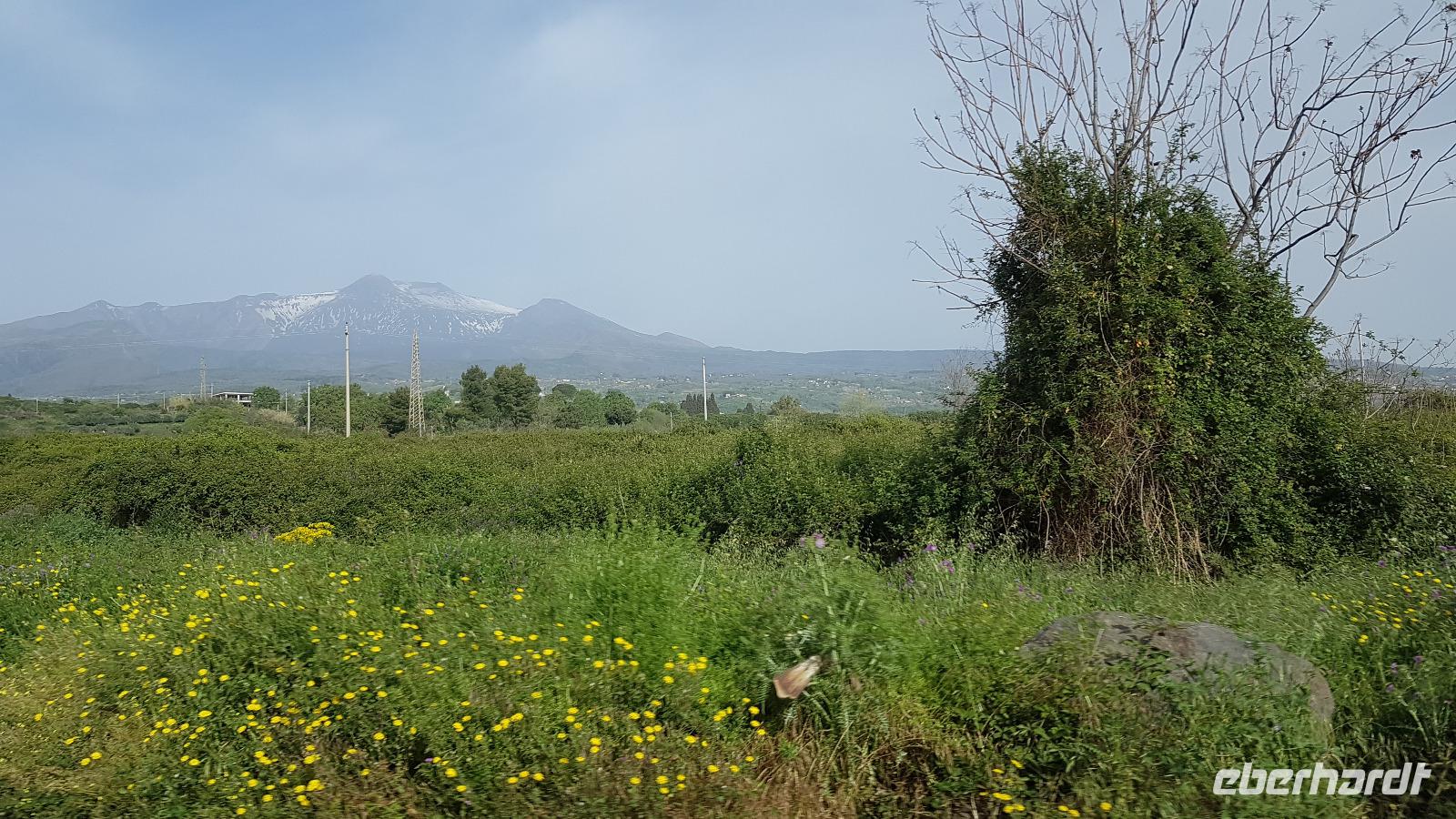 Heute stehen Catania und Syrakus auf dem Programm - Geschichte und Gegenwart pur. Es sind etliche Kilometer zu fahren und so starten wir wieder 8 Uhr. In Catania, der schwarz-weißen Stadt, (für Vulkangestein und feinen weißen Sandstein) fahren wir die Via Etnea in die Stadt, auf der ältesten Achse zwischen Hafen und Berg (Ätna). Vorbei am botanischen Garten der Benediktiner, einem der ältesten in Europa, vorbei am Bellini Pavillon erreichen wir bald das Zentrum. Hier um den Domplatz herum hatte sich der Großadel niedergelassen. Nach dem verheerenden Vulkanausbruch 1693, bei dem mehr als 100.000 Menschen ihr Leben verloren und die Stadt fast völlig zerstört wurde wurde die Stadt im Barockstil neu aufgebaut. Man musste zeigen, was man hatte- auch wenn es nur geborgt war. Doreen erzählte uns, dass „Barock" damals eine ziemlich abwertende Bezeichnung war für etwas, was nicht ordentlich gegliedert und gebaut war wie z.B. beim Klassizismus. Der neue Baustil mit Rundungen und Hervorhebungen und verspielten Details war den damaligen Architekten suspekt und eben „barock". Wir passieren den Amenano- Brunnen der über dem gleichnamigen Fluss am Domplatz liegt und gelangen zum berühmten Fischmarkt. Das hatte so keiner von uns erwartet. Hier gab es alles: vom sogenannten neugeborenen Fisch, der als Beifang in den Netzen landet und außerordentlich eiweißreich ist über Gürtelfische, natürlich Thunfische, Schwertfische, Muscheln, Austern, alle Arten von Brassen, Sardinen...was für ein Erlebnis! Aber das war längst nicht alles. Jeden Tag außer Sonntag gibt es diesen Markt. An den Fischmarkt reihen sich nahtlos Gemüse und Obstmärkte, Käse und Fleisch wird feilgeboten, frische Artischocken ebenso wir Saubohnen und Meter-Zucchini, Ochsenherz-Tomaten und frische oder getrocknete Kräuter. Wir müssen uns erst einmal sammeln ob der vielen Eindrücke und spazieren zum Castell Ursino. Ein typischer Bau von Friedrich II., er ließ auf einem quadratischen Grundriss die Ecken mit runden oder halbrunden Türmen verstärken. Dies sollte uns auch in Syrakus wieder begegnen. Die große Besonderheit des Castells aber ist, dass es einst im Meer errichtet wurde. Beim Vulkanausbruch 1693 floss die Lava tatsächlich um das Castell herum, die Mauern hielten stand und plötzlich stand das Castell in der Stadt. Die Lava hatte für eine völlig neue Küstenlinie gesorgt. Wir haben ein wenig freie Zeit und treffen uns am Elefantenbrunnen wieder. Von hier aus gehen wir zurück zum Bus, unterwegs kann ich Mispeln kaufen und reiche sie den Gästen zum Probieren. Der süß-saure Geschmack ist neu für unsere Gaumen, trotzdem sehr lecker. Mit einem kurzen Zwischenstopp fahren wir weiter nach Syrakus. Antonio bringt uns ins Zentrum, hier laufen wir über den Kanale zur Altstadt und am Apollo- Tempel legen wir erst einmal eine Mittagspause ein. Doreen zeigt uns dann die Stadt mit den Gassen, dem Dom und weiter zur Arethusa Quelle. Es sind mehr als 26°C und wir beschließen, unten unter den Bäumen weiter am Hafen entlang zu spazieren. Kurz sind wir versucht, hier im kühlen Schatten zu bleiben- aber es fehlt noch ein Punkt: die archäologische Zone. Antonio fährt uns hin und wir starten beim großen Opferaltar am Eingang. Mehrere hundert Stiere sind hier auf einmal geopfert worden- ein großes Fest für die Menschen hier, die sich sonst nie Fleisch leisten konnten- denn das Fleisch wurde gebraten und gegessen. Wir steigen hinauf und blicken auf das Theater hinunter. Bauarbeiter sind damit beschäftigt, die in Stein gehauenen und verwitterten Sitzreihen mit einer Holzkonstruktion wieder in annehmbare Sitzreihen zu verwandeln. Bald startet hier die Saison und Aufführungen von Klassik bis Konzert lösen sich ab. Wohltuend streicht eine kühle Brise vom Meer zu uns hinauf und nachdem wir die Quelle und die Grabstätten besichtigt haben steigen wir wieder hinab. Im Steinbruch dann gelangen wir zum Ohr des Dyonisio, 65 Meter erstreckt sich die Höhle hinein in den Stein und bietet eine unfassbare Akkustik. Doch niemand ist mutig genug, dies auszuprobieren. Bis auf Norbert - er stimmt das Steigerlied an, alle singen mit und es hallt weit hörbar in das sizilianische Land. So endet auch dieser Tag voller Eindrücke und Impressionen, am Ende müssen wir uns von Antonio und Doreen verabschieden. Der Tag morgen ist individuell und wer mag lässt sich auf das Abenteuer öffentliche Verkehrsmittel ein, fährt mit nach Castelmola. Dort erwartet uns noch eine besondere Überraschung.