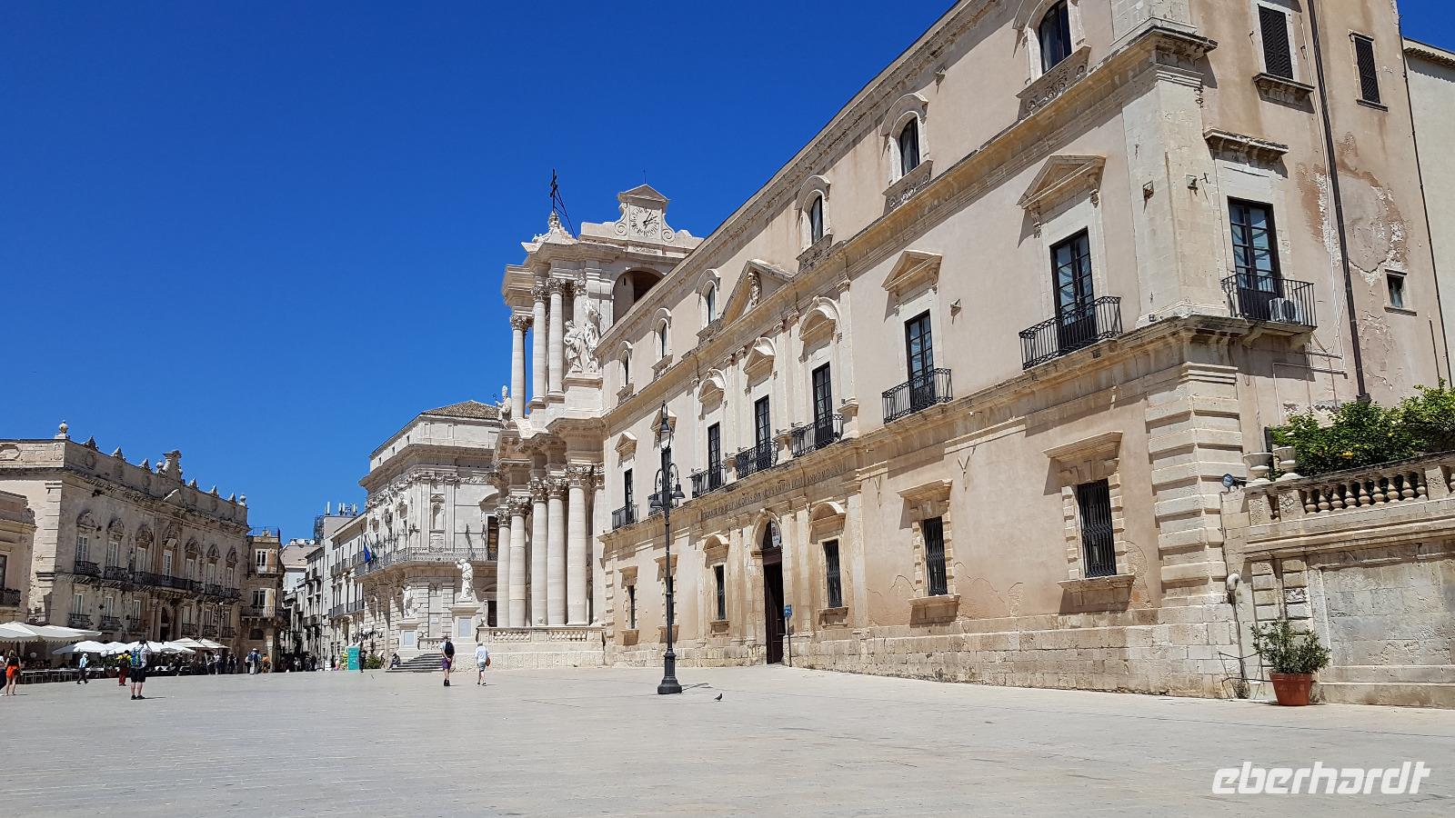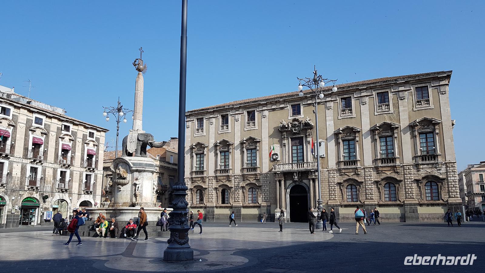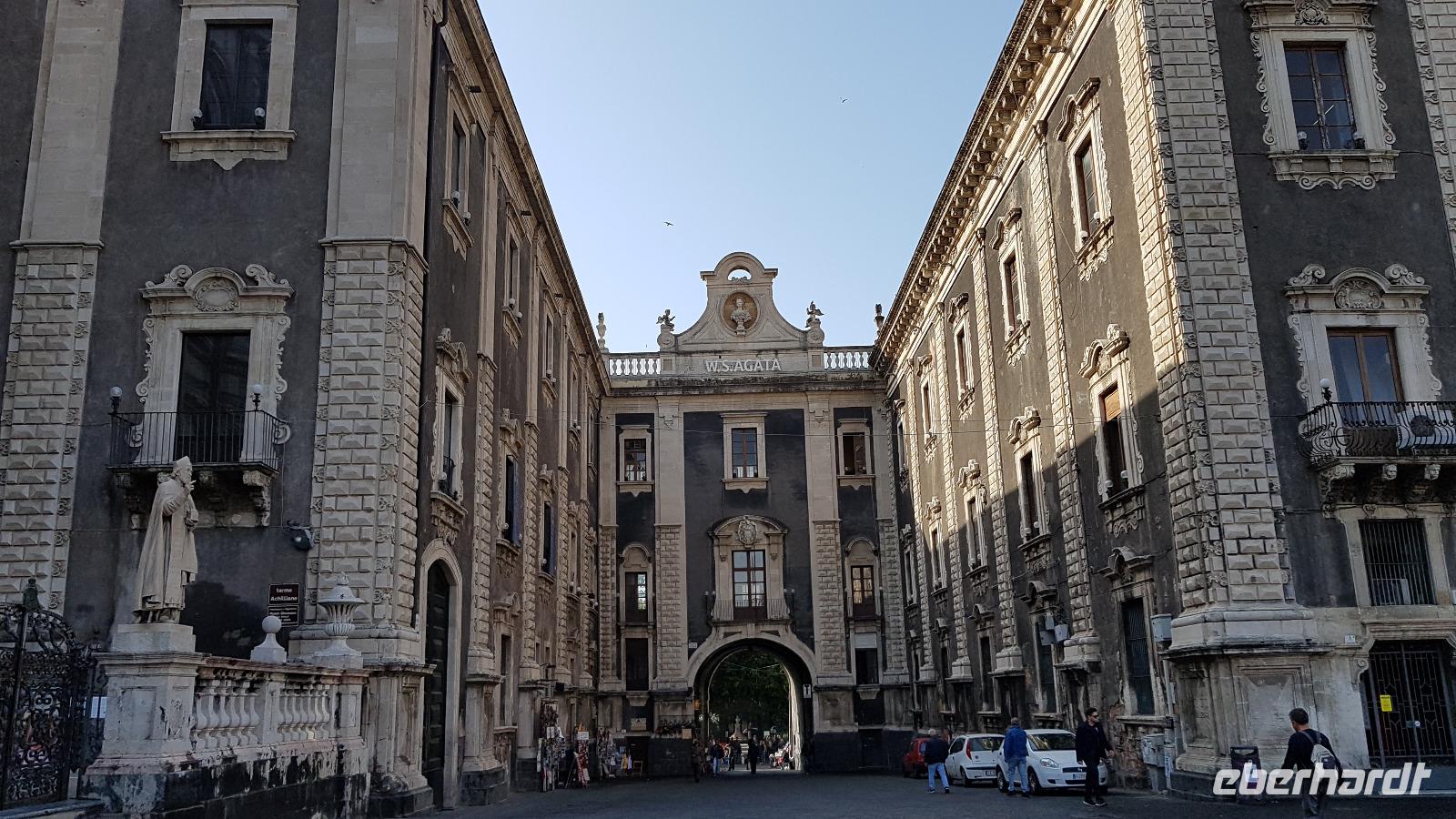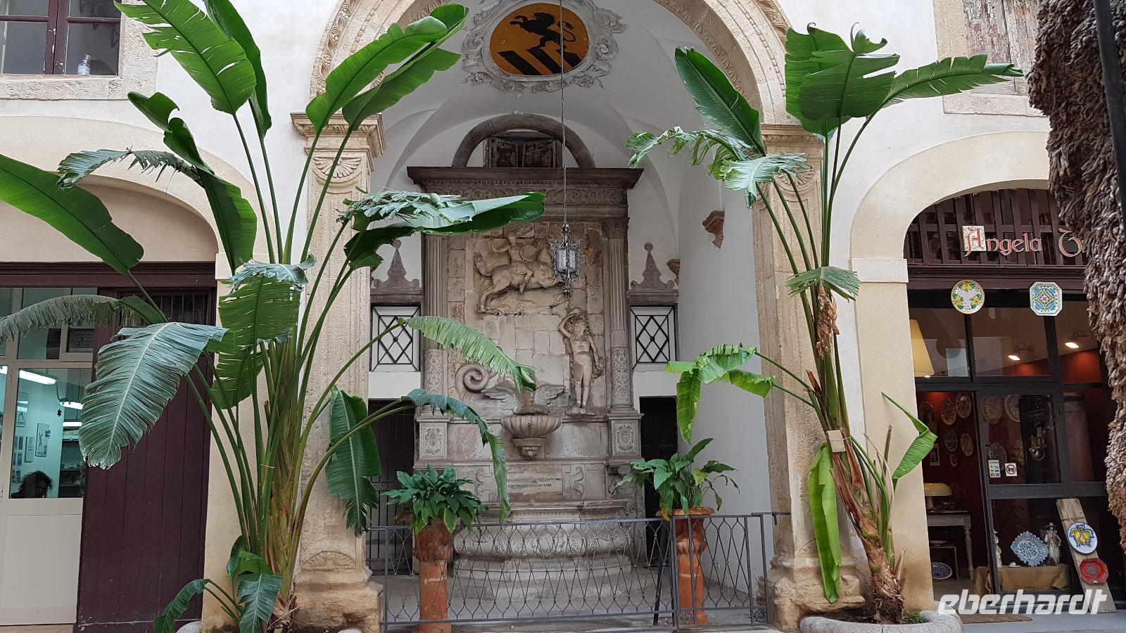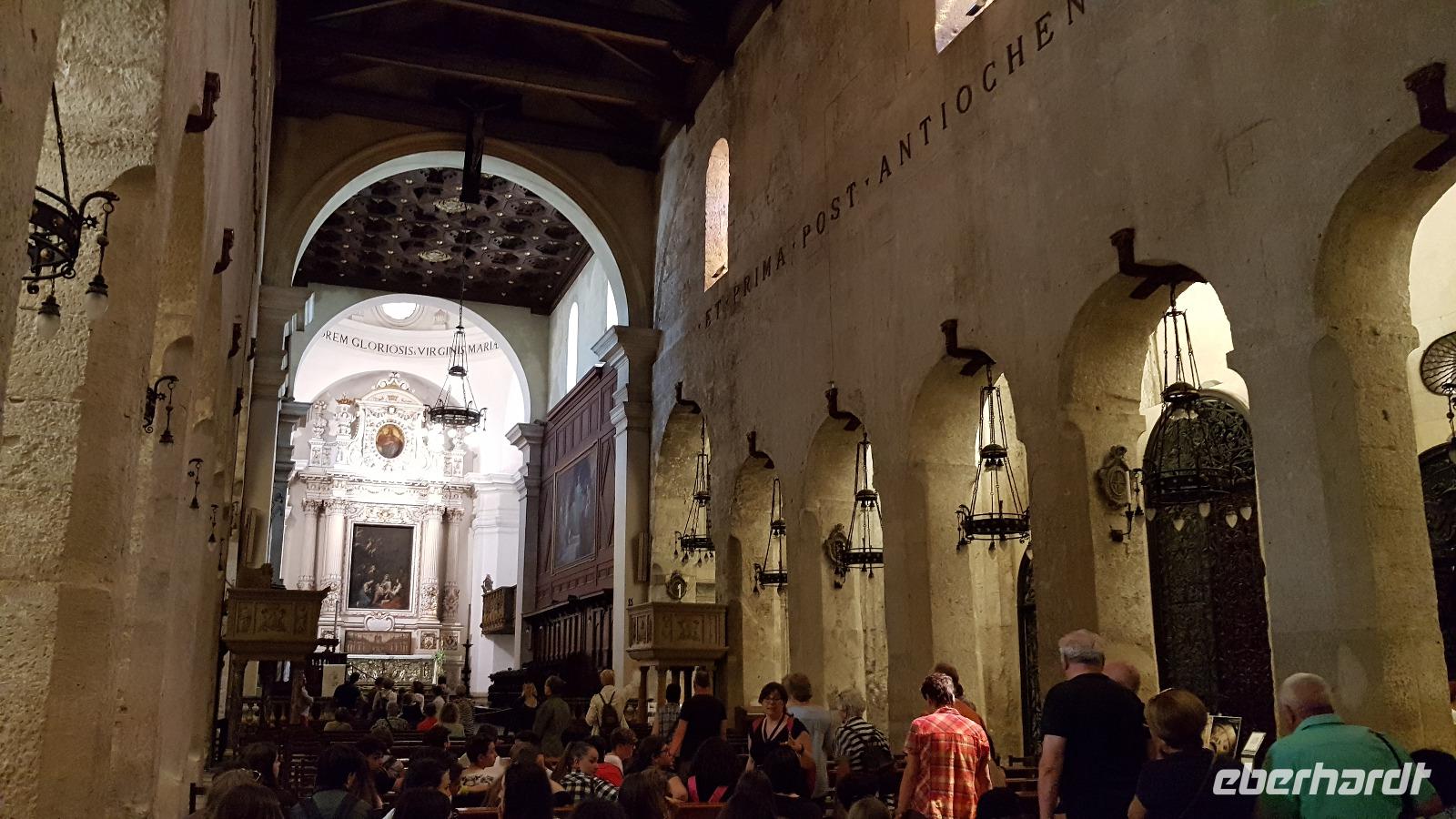 Heute stehen Catania und Syrakus auf dem Programm - Geschichte und Gegenwart pur. Es sind etliche Kilometer zu fahren und so starten wir wieder 8 Uhr. In Catania, der schwarz-weißen Stadt, (für Vulkangestein und feinen weißen Sandstein) fahren wir die Via Etnea in die Stadt, auf der ältesten Achse zwischen Hafen und Berg (Ätna). Vorbei am botanischen Garten der Benediktiner, einem der ältesten in Europa, vorbei am Bellini Pavillon erreichen wir bald das Zentrum. Hier um den Domplatz herum hatte sich der Großadel niedergelassen. Nach dem verheerenden Vulkanausbruch 1693, bei dem mehr als 100.000 Menschen ihr Leben verloren und die Stadt fast völlig zerstört wurde wurde die Stadt im Barockstil neu aufgebaut. Man musste zeigen, was man hatte- auch wenn es nur geborgt war. Doreen erzählte uns, dass „Barock" damals eine ziemlich abwertende Bezeichnung war für etwas, was nicht ordentlich gegliedert und gebaut war wie z.B. beim Klassizismus. Der neue Baustil mit Rundungen und Hervorhebungen und verspielten Details war den damaligen Architekten suspekt und eben „barock". Wir passieren den Amenano- Brunnen der über dem gleichnamigen Fluss am Domplatz liegt und gelangen zum berühmten Fischmarkt. Das hatte so keiner von uns erwartet. Hier gab es alles: vom sogenannten neugeborenen Fisch, der als Beifang in den Netzen landet und außerordentlich eiweißreich ist über Gürtelfische, natürlich Thunfische, Schwertfische, Muscheln, Austern, alle Arten von Brassen, Sardinen...was für ein Erlebnis! Aber das war längst nicht alles. Jeden Tag außer Sonntag gibt es diesen Markt. An den Fischmarkt reihen sich nahtlos Gemüse und Obstmärkte, Käse und Fleisch wird feilgeboten, frische Artischocken ebenso wir Saubohnen und Meter-Zucchini, Ochsenherz-Tomaten und frische oder getrocknete Kräuter. Wir müssen uns erst einmal sammeln ob der vielen Eindrücke und spazieren zum Castell Ursino. Ein typischer Bau von Friedrich II., er ließ auf einem quadratischen Grundriss die Ecken mit runden oder halbrunden Türmen verstärken. Dies sollte uns auch in Syrakus wieder begegnen. Die große Besonderheit des Castells aber ist, dass es einst im Meer errichtet wurde. Beim Vulkanausbruch 1693 floss die Lava tatsächlich um das Castell herum, die Mauern hielten stand und plötzlich stand das Castell in der Stadt. Die Lava hatte für eine völlig neue Küstenlinie gesorgt. Wir haben ein wenig freie Zeit und treffen uns am Elefantenbrunnen wieder. Von hier aus gehen wir zurück zum Bus, unterwegs kann ich Mispeln kaufen und reiche sie den Gästen zum Probieren. Der süß-saure Geschmack ist neu für unsere Gaumen, trotzdem sehr lecker. Mit einem kurzen Zwischenstopp fahren wir weiter nach Syrakus. Antonio bringt uns ins Zentrum, hier laufen wir über den Kanale zur Altstadt und am Apollo- Tempel legen wir erst einmal eine Mittagspause ein. Doreen zeigt uns dann die Stadt mit den Gassen, dem Dom und weiter zur Arethusa Quelle. Es sind mehr als 26°C und wir beschließen, unten unter den Bäumen weiter am Hafen entlang zu spazieren. Kurz sind wir versucht, hier im kühlen Schatten zu bleiben- aber es fehlt noch ein Punkt: die archäologische Zone. Antonio fährt uns hin und wir starten beim großen Opferaltar am Eingang. Mehrere hundert Stiere sind hier auf einmal geopfert worden- ein großes Fest für die Menschen hier, die sich sonst nie Fleisch leisten konnten- denn das Fleisch wurde gebraten und gegessen. Wir steigen hinauf und blicken auf das Theater hinunter. Bauarbeiter sind damit beschäftigt, die in Stein gehauenen und verwitterten Sitzreihen mit einer Holzkonstruktion wieder in annehmbare Sitzreihen zu verwandeln. Bald startet hier die Saison und Aufführungen von Klassik bis Konzert lösen sich ab. Wohltuend streicht eine kühle Brise vom Meer zu uns hinauf und nachdem wir die Quelle und die Grabstätten besichtigt haben steigen wir wieder hinab. Im Steinbruch dann gelangen wir zum Ohr des Dyonisio, 65 Meter erstreckt sich die Höhle hinein in den Stein und bietet eine unfassbare Akkustik. Doch niemand ist mutig genug, dies auszuprobieren. Bis auf Norbert - er stimmt das Steigerlied an, alle singen mit und es hallt weit hörbar in das sizilianische Land. So endet auch dieser Tag voller Eindrücke und Impressionen, am Ende müssen wir uns von Antonio und Doreen verabschieden. Der Tag morgen ist individuell und wer mag lässt sich auf das Abenteuer öffentliche Verkehrsmittel ein, fährt mit nach Castelmola. Dort erwartet uns noch eine besondere Überraschung.