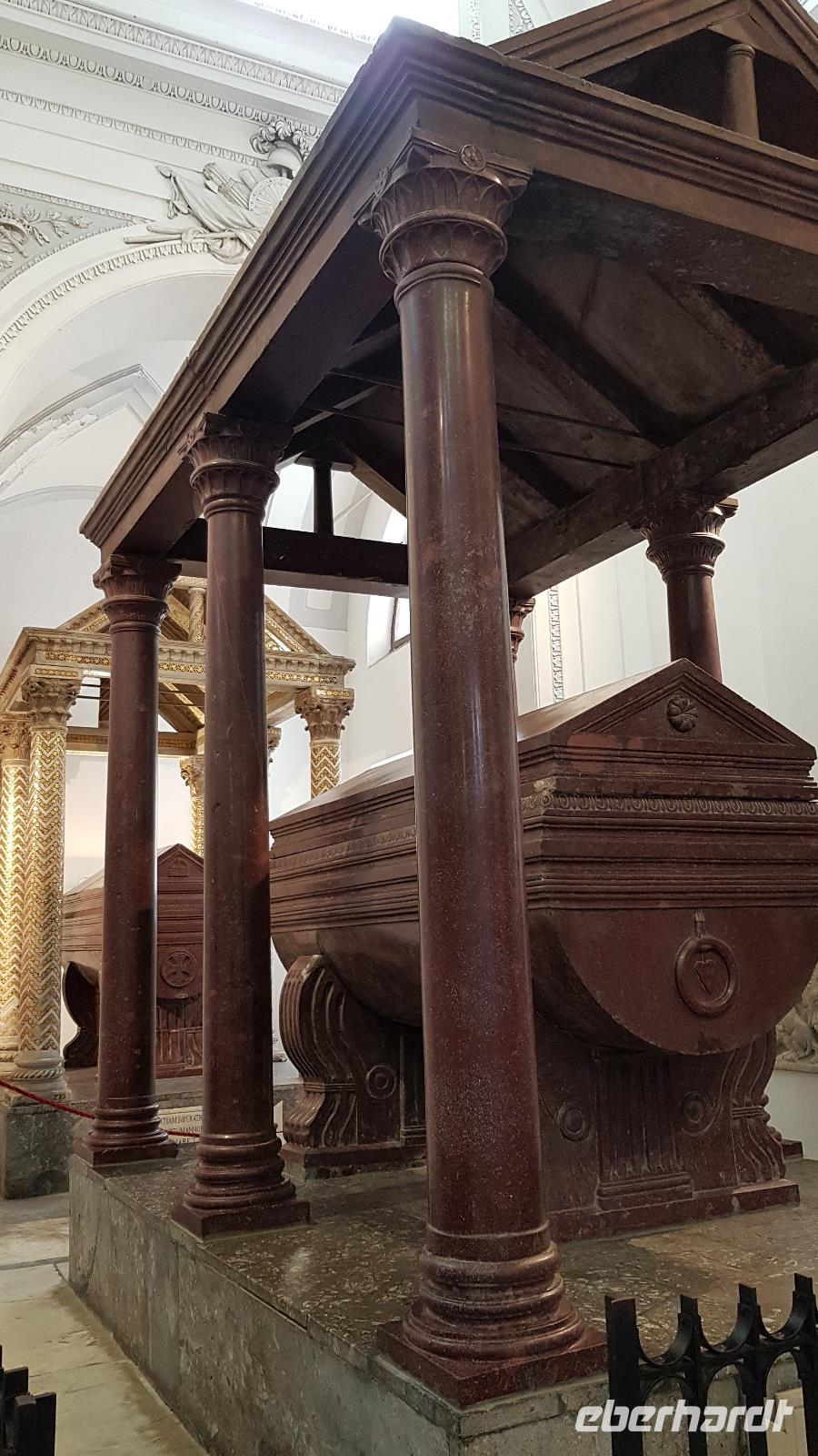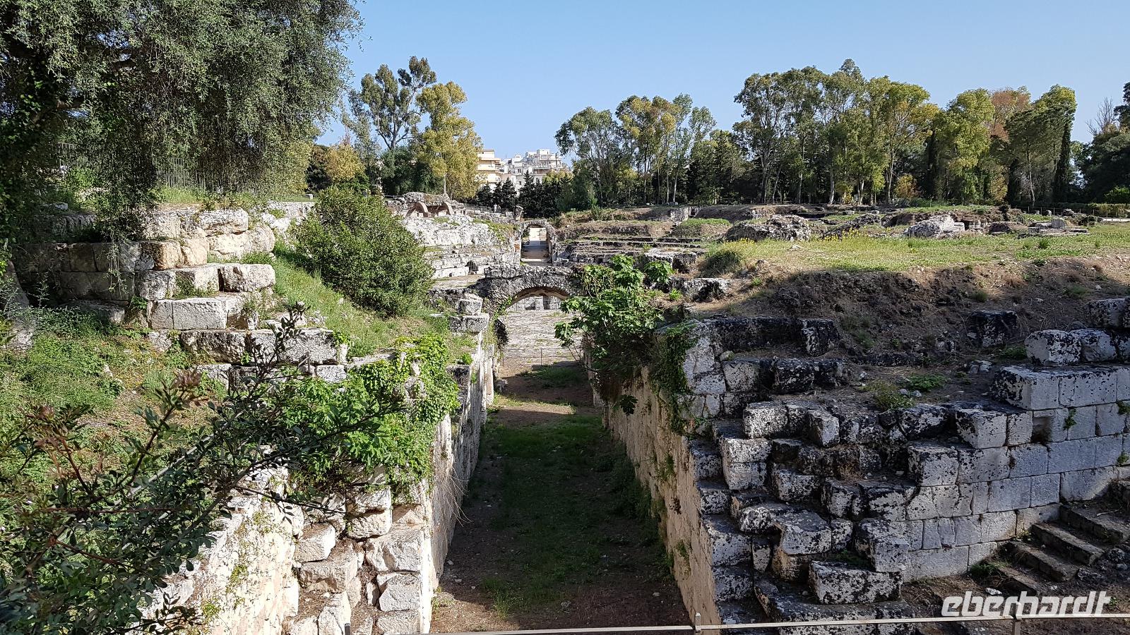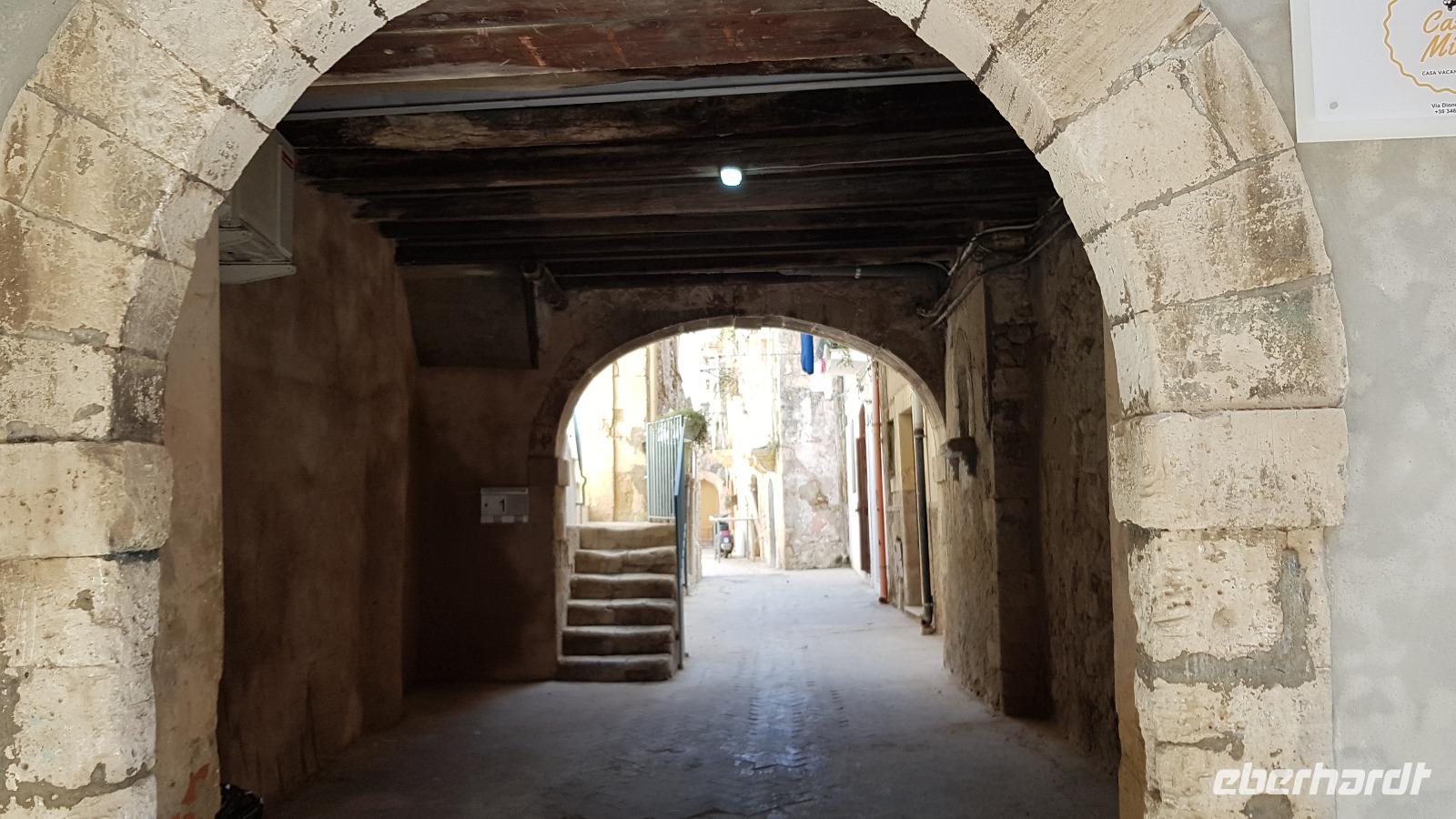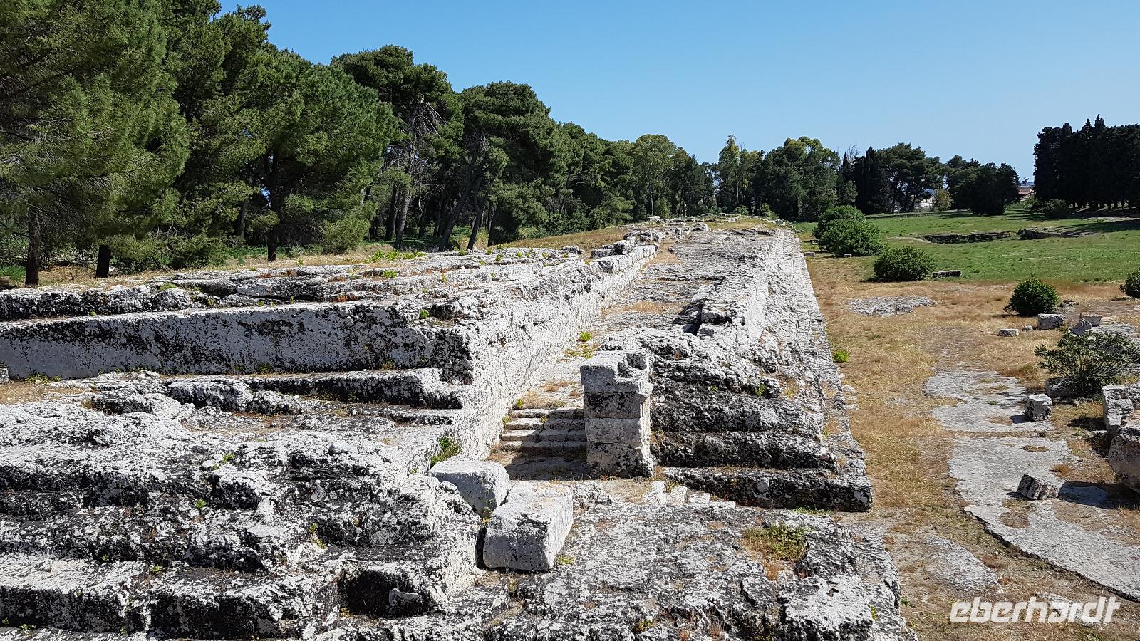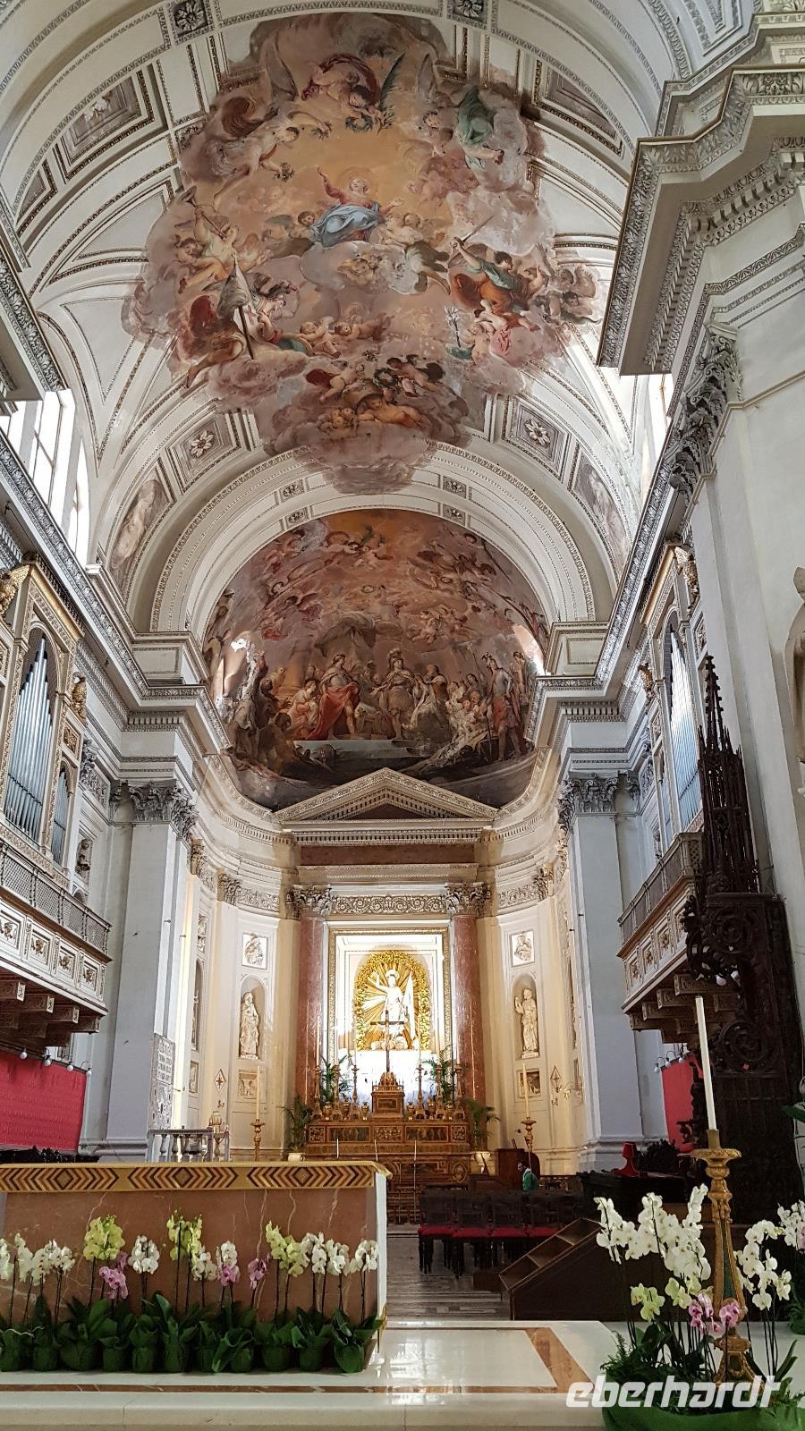 Heute stehen Catania und Syrakus auf dem Programm - Geschichte und Gegenwart pur. Es sind etliche Kilometer zu fahren und so starten wir wieder 8 Uhr. In Catania, der schwarz-weißen Stadt, (für Vulkangestein und feinen weißen Sandstein) fahren wir die Via Etnea in die Stadt, auf der ältesten Achse zwischen Hafen und Berg (Ätna). Vorbei am botanischen Garten der Benediktiner, einem der ältesten in Europa, vorbei am Bellini Pavillon erreichen wir bald das Zentrum. Hier um den Domplatz herum hatte sich der Großadel niedergelassen. Nach dem verheerenden Vulkanausbruch 1693, bei dem mehr als 100.000 Menschen ihr Leben verloren und die Stadt fast völlig zerstört wurde wurde die Stadt im Barockstil neu aufgebaut. Man musste zeigen, was man hatte- auch wenn es nur geborgt war. Doreen erzählte uns, dass „Barock" damals eine ziemlich abwertende Bezeichnung war für etwas, was nicht ordentlich gegliedert und gebaut war wie z.B. beim Klassizismus. Der neue Baustil mit Rundungen und Hervorhebungen und verspielten Details war den damaligen Architekten suspekt und eben „barock". Wir passieren den Amenano- Brunnen der über dem gleichnamigen Fluss am Domplatz liegt und gelangen zum berühmten Fischmarkt. Das hatte so keiner von uns erwartet. Hier gab es alles: vom sogenannten neugeborenen Fisch, der als Beifang in den Netzen landet und außerordentlich eiweißreich ist über Gürtelfische, natürlich Thunfische, Schwertfische, Muscheln, Austern, alle Arten von Brassen, Sardinen...was für ein Erlebnis! Aber das war längst nicht alles. Jeden Tag außer Sonntag gibt es diesen Markt. An den Fischmarkt reihen sich nahtlos Gemüse und Obstmärkte, Käse und Fleisch wird feilgeboten, frische Artischocken ebenso wir Saubohnen und Meter-Zucchini, Ochsenherz-Tomaten und frische oder getrocknete Kräuter. Wir müssen uns erst einmal sammeln ob der vielen Eindrücke und spazieren zum Castell Ursino. Ein typischer Bau von Friedrich II., er ließ auf einem quadratischen Grundriss die Ecken mit runden oder halbrunden Türmen verstärken. Dies sollte uns auch in Syrakus wieder begegnen. Die große Besonderheit des Castells aber ist, dass es einst im Meer errichtet wurde. Beim Vulkanausbruch 1693 floss die Lava tatsächlich um das Castell herum, die Mauern hielten stand und plötzlich stand das Castell in der Stadt. Die Lava hatte für eine völlig neue Küstenlinie gesorgt. Wir haben ein wenig freie Zeit und treffen uns am Elefantenbrunnen wieder. Von hier aus gehen wir zurück zum Bus, unterwegs kann ich Mispeln kaufen und reiche sie den Gästen zum Probieren. Der süß-saure Geschmack ist neu für unsere Gaumen, trotzdem sehr lecker. Mit einem kurzen Zwischenstopp fahren wir weiter nach Syrakus. Antonio bringt uns ins Zentrum, hier laufen wir über den Kanale zur Altstadt und am Apollo- Tempel legen wir erst einmal eine Mittagspause ein. Doreen zeigt uns dann die Stadt mit den Gassen, dem Dom und weiter zur Arethusa Quelle. Es sind mehr als 26°C und wir beschließen, unten unter den Bäumen weiter am Hafen entlang zu spazieren. Kurz sind wir versucht, hier im kühlen Schatten zu bleiben- aber es fehlt noch ein Punkt: die archäologische Zone. Antonio fährt uns hin und wir starten beim großen Opferaltar am Eingang. Mehrere hundert Stiere sind hier auf einmal geopfert worden- ein großes Fest für die Menschen hier, die sich sonst nie Fleisch leisten konnten- denn das Fleisch wurde gebraten und gegessen. Wir steigen hinauf und blicken auf das Theater hinunter. Bauarbeiter sind damit beschäftigt, die in Stein gehauenen und verwitterten Sitzreihen mit einer Holzkonstruktion wieder in annehmbare Sitzreihen zu verwandeln. Bald startet hier die Saison und Aufführungen von Klassik bis Konzert lösen sich ab. Wohltuend streicht eine kühle Brise vom Meer zu uns hinauf und nachdem wir die Quelle und die Grabstätten besichtigt haben steigen wir wieder hinab. Im Steinbruch dann gelangen wir zum Ohr des Dyonisio, 65 Meter erstreckt sich die Höhle hinein in den Stein und bietet eine unfassbare Akkustik. Doch niemand ist mutig genug, dies auszuprobieren. Bis auf Norbert - er stimmt das Steigerlied an, alle singen mit und es hallt weit hörbar in das sizilianische Land. So endet auch dieser Tag voller Eindrücke und Impressionen, am Ende müssen wir uns von Antonio und Doreen verabschieden. Der Tag morgen ist individuell und wer mag lässt sich auf das Abenteuer öffentliche Verkehrsmittel ein, fährt mit nach Castelmola. Dort erwartet uns noch eine besondere Überraschung.