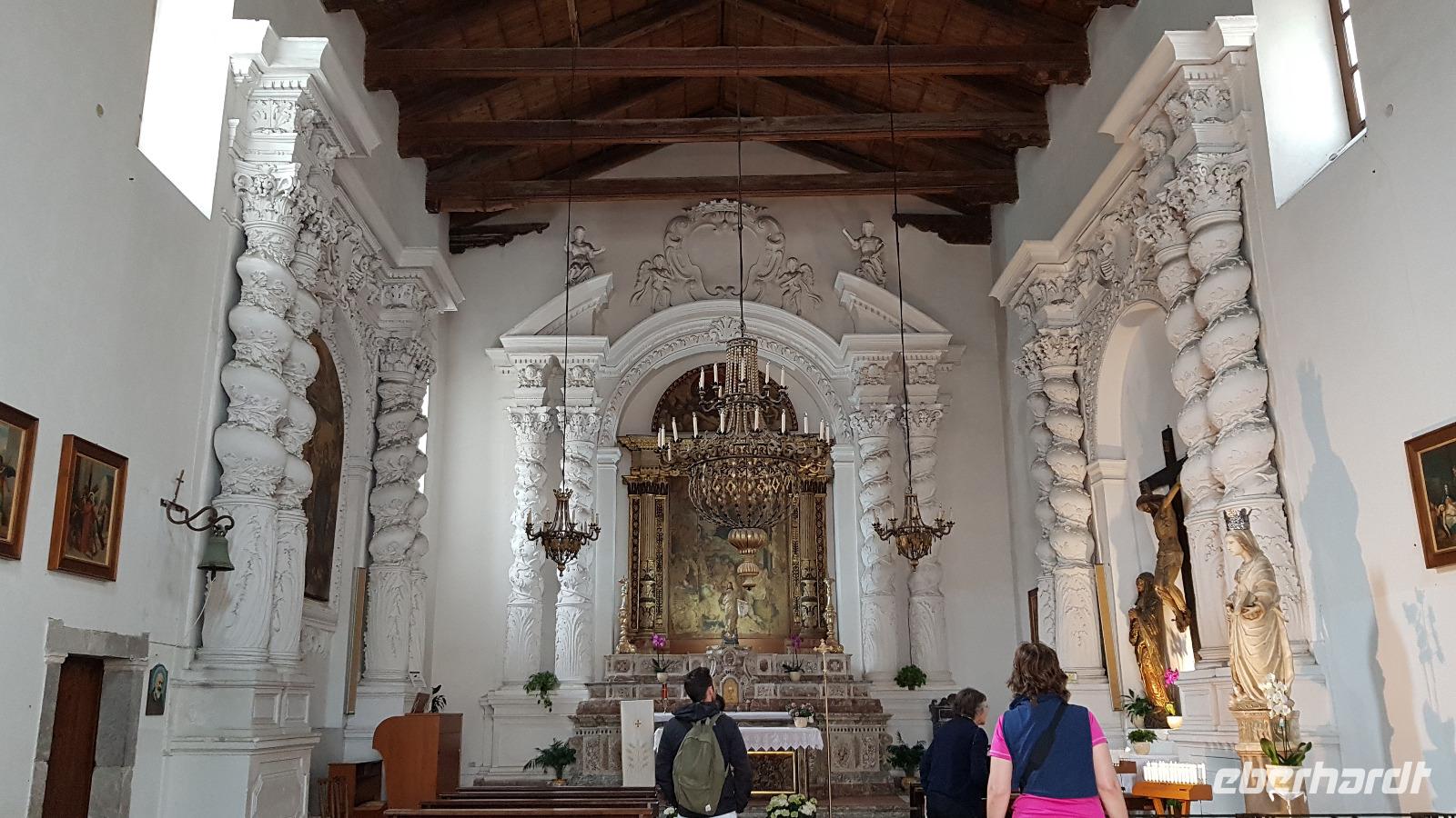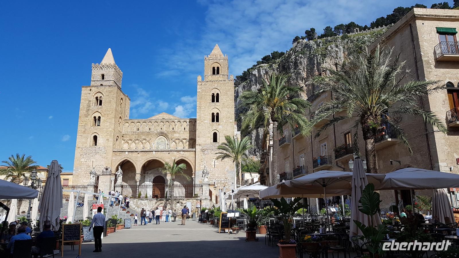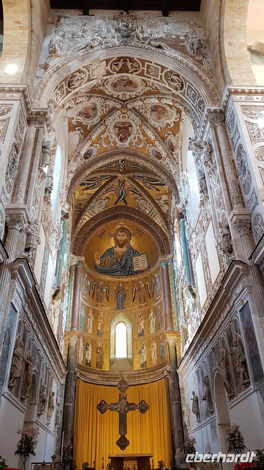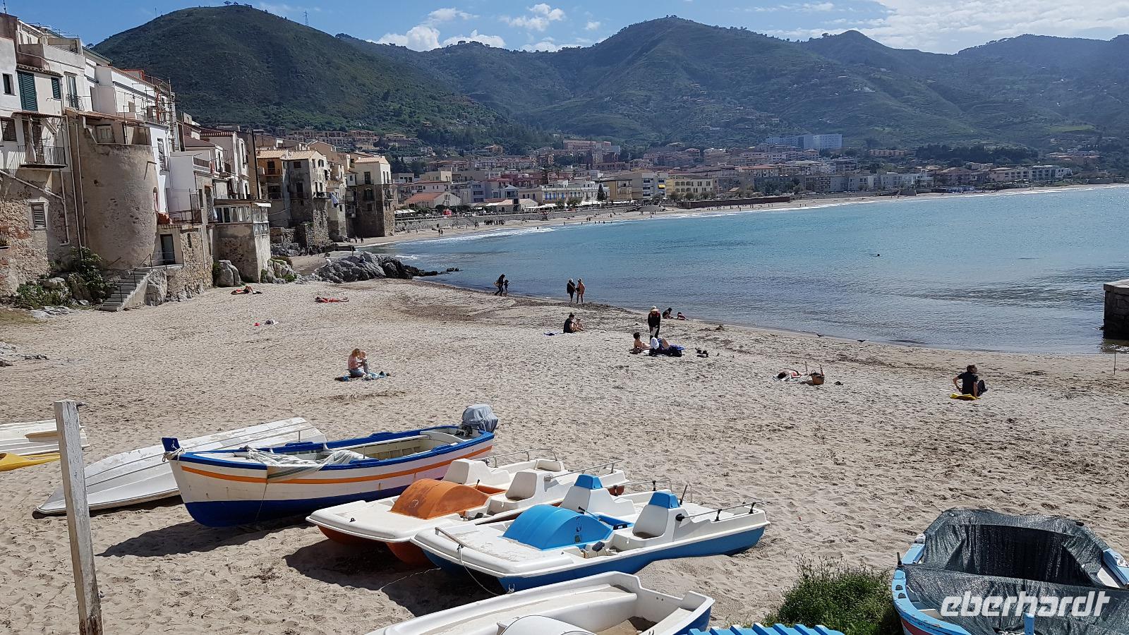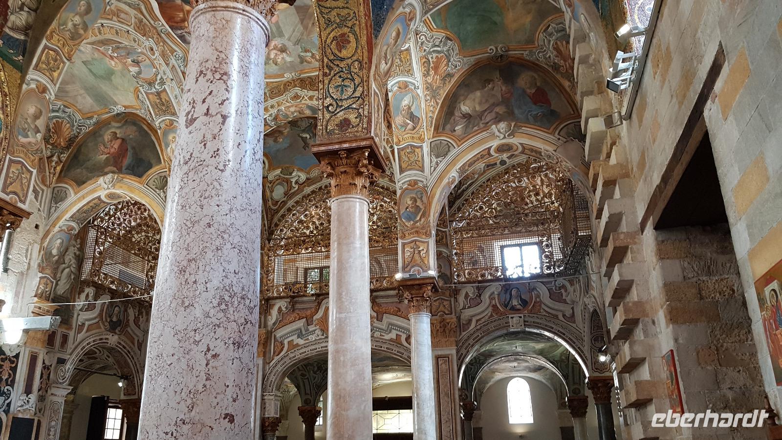 Heute heißt es wieder zeitig losfahren. Um 8 Uhr sind die Koffer verstaut und unser erstes Ziel heißt Palermo. Durch das Belice Tal geht es westwärts, wir passieren die Bucht von Mondello und Annemarie erzählt uns von der heiligen Rosalie, sie wird verehrt, weil durch sie letztendlich die schwarze Pest 1652 besiegt wurde. Dann erreichen wir Palermo, Annemarie wohnt hier und so können wir die obligatorischen Staus clever umfahren. Durch den Garibaldi Park und am Massimo Theater vorbei geht es zur Capella Palatina. Sie befindet sich im Palazzo Reale, dem königlichen Palast, in dem auch das sizilianische Parlament und die Regionalregierung ihren Sitz hat. Erfreulicherweise ist die Warteschlange am Check-Point kurz und so können wir in kürzester Zeit die Palastkapelle betreten. Was für eine Pracht! Die Decke mit Holzschnitzereien, mit Seide überzogen, die Mosaiken mit farbigen und vergoldeten Steinen, der Boden mit arabischen Mosaiken und und und. Szenen der Bibel, des alten Testamentes sind dargestellt, dazu eine kunstvolle Verknüpfung von lateinischen, griechischen und arabischen Elementen, ach wenn es doch heute auch so ein friedliches Miteinander geben könnte...Wir spazieren weiter durch Palermo zur Kathedrale, auch Normannendom genannt. Sie erfuhr mehrfach Um- und Anbauten und schließlich bekam sie im 18. Jahrhundert eine Kuppel und klassizistische Elemente. Annemarie zeigt uns den Meridian, immer 12:00 Uhr markiert die Sonne durch eine winzige Öffnung in der Decke den Punkt mit dem aktuellen Sternzeichen darauf. Dann ist Zeit für individuelle Erkundungen und wer möchte besucht die Staufergräber hier. Heinrich VI., Friedrich II und auch Königin Konstanze von Sizilien sind hier begraben. Wir treffen uns auf dem Platz vor der Kathedrale und spazieren durch die Stadt, an alten Palazzos vorbei wo die Zeit stehengeblieben zu sein scheint bis zum Rathaus und dem „Platz der Schande" mit dem Schambrunnen. Den Namen erhielt der Platz weil die Stadt kaum Geld für die Bürger hatte, sich aber diesen Brunnen leistete- welche Schande...Weiter ging es zum „Platz der 4 Ecken", dem Quattro Canti, hier kreuzen sich Corso Vittorio Emanuele und Via Maqueda, im 17. Jahrhundert entstand hier an jeder der 4 Ecken ein Palast in barocker Baukunst. Unser nächstes Ziel ist die Martorana-Kirche in unmittelbarer Nähe, auch hier begegnet uns wieder diese phantastische Mosaik-Kunst. Ein letzter gemeinsamer Spaziergang führt zum Teatro Massimo, der Oper Palermos. Ab hier kann jeder individuell die nächste Zeit verbringen und ein wenig ausruhen. Nach dem Mittag fahren wir nach Cefalu. Antonio fährt die Küstenstraße entlang, da dürfen Fotostopps natürlich nicht fehlen. Strahlender Sonnenschein, türkisblaues Wasser und eine phantastische Landschaft begleiten uns. In Cefalu angekommen halten wir am Faro - dem Leuchtturm und spazieren hinunter in die Stadt zum Strand. Von hier aus geht es die Gassen wieder hinauf, am alten Waschplatz der Stadt vorbei zur Kathedrale- und auch hier empfängt uns wieder diese wunderbare Mosaik-Kunst, die wir schon im Palermo bewundert haben. Die nächste Zeit nutzt jeder für sich, in der Stadt, am Strand oder im Eiscafe. Nach den vielen Eindrücken heute tut diese Auszeit der Seele gut. Am Leuchtturm treffen wir uns dann wieder und fahren weiter Richtung Milazzo. Kurz hinter der Stadt jedoch müssen wir schon wieder halten- ein so toller Ausblick! Und den versüßen wir uns mit Limoncello, den konnte ich in Cefalu erwerben- diese Spezialität Siziliens sollten wir unbedingt probieren- ab hier haben Fotostopps für unsere Gruppe eine ganz neue Bedeutung...Ziemlich spät erst erreichen wir unser Hotel in Milazzo, den Welcome-Drink des Hotels nehmen wir im Stehen mit während wir auf unsere Zimmerschlüssel warten und schon treffen wir uns zum Abendessen. Und sind positiv überrascht. Entgegen aller Befürchtungen sind Essen und Service große Klasse, die Zimmer und das Hotel sowieso und so klingt dieser Tag rundum positiv aus.