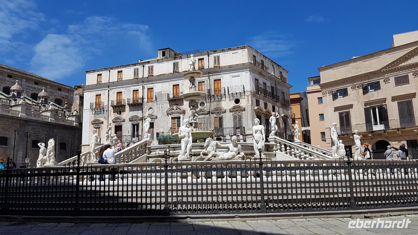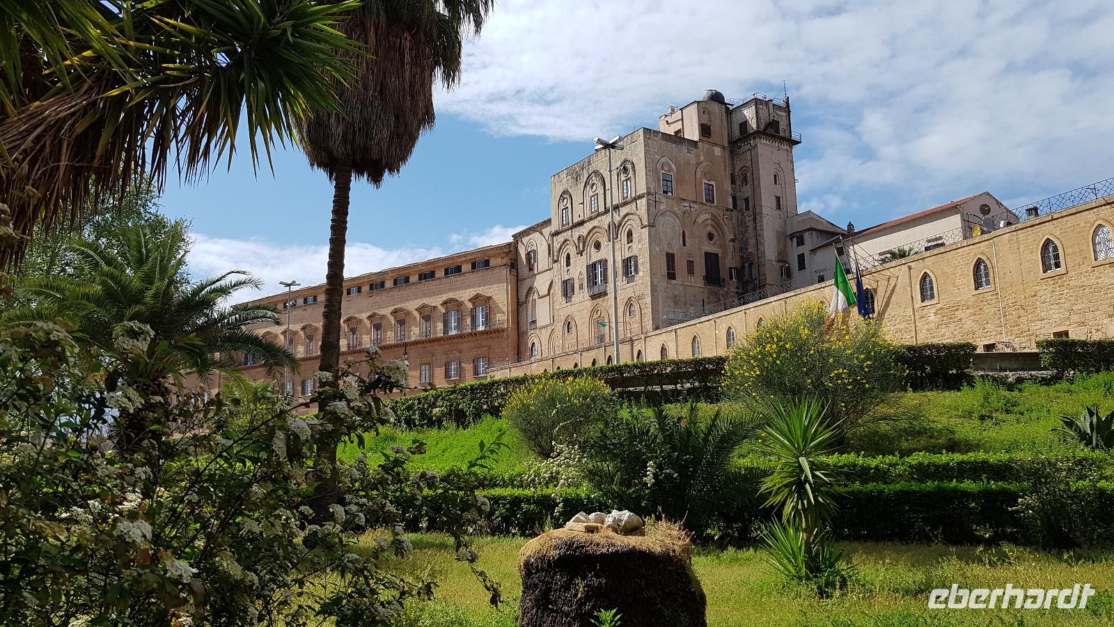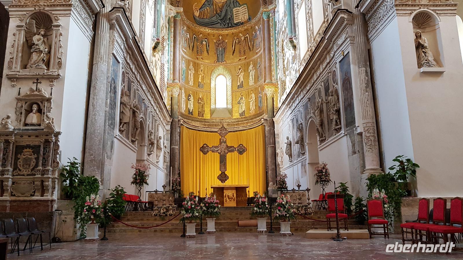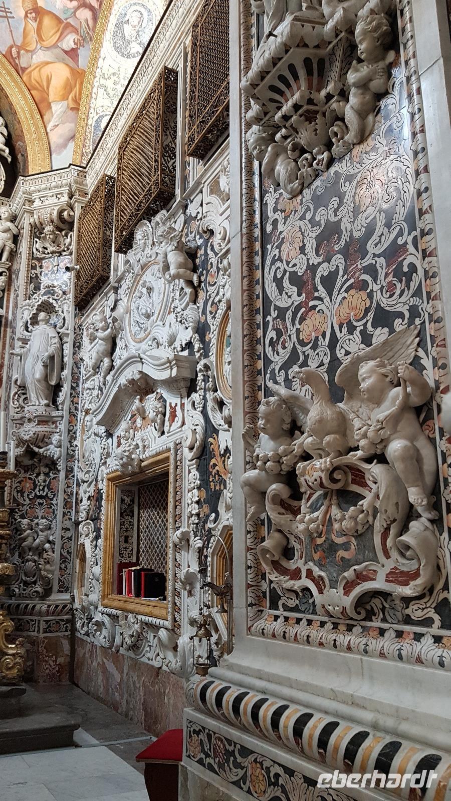 Heute heißt es wieder zeitig losfahren. Um 8 Uhr sind die Koffer verstaut und unser erstes Ziel heißt Palermo. Durch das Belice Tal geht es westwärts, wir passieren die Bucht von Mondello und Annemarie erzählt uns von der heiligen Rosalie, sie wird verehrt, weil durch sie letztendlich die schwarze Pest 1652 besiegt wurde. Dann erreichen wir Palermo, Annemarie wohnt hier und so können wir die obligatorischen Staus clever umfahren. Durch den Garibaldi Park und am Massimo Theater vorbei geht es zur Capella Palatina. Sie befindet sich im Palazzo Reale, dem königlichen Palast, in dem auch das sizilianische Parlament und die Regionalregierung ihren Sitz hat. Erfreulicherweise ist die Warteschlange am Check-Point kurz und so können wir in kürzester Zeit die Palastkapelle betreten. Was für eine Pracht! Die Decke mit Holzschnitzereien, mit Seide überzogen, die Mosaiken mit farbigen und vergoldeten Steinen, der Boden mit arabischen Mosaiken und und und. Szenen der Bibel, des alten Testamentes sind dargestellt, dazu eine kunstvolle Verknüpfung von lateinischen, griechischen und arabischen Elementen, ach wenn es doch heute auch so ein friedliches Miteinander geben könnte...Wir spazieren weiter durch Palermo zur Kathedrale, auch Normannendom genannt. Sie erfuhr mehrfach Um- und Anbauten und schließlich bekam sie im 18. Jahrhundert eine Kuppel und klassizistische Elemente. Annemarie zeigt uns den Meridian, immer 12:00 Uhr markiert die Sonne durch eine winzige Öffnung in der Decke den Punkt mit dem aktuellen Sternzeichen darauf. Dann ist Zeit für individuelle Erkundungen und wer möchte besucht die Staufergräber hier. Heinrich VI., Friedrich II und auch Königin Konstanze von Sizilien sind hier begraben. Wir treffen uns auf dem Platz vor der Kathedrale und spazieren durch die Stadt, an alten Palazzos vorbei wo die Zeit stehengeblieben zu sein scheint bis zum Rathaus und dem „Platz der Schande" mit dem Schambrunnen. Den Namen erhielt der Platz weil die Stadt kaum Geld für die Bürger hatte, sich aber diesen Brunnen leistete- welche Schande...Weiter ging es zum „Platz der 4 Ecken", dem Quattro Canti, hier kreuzen sich Corso Vittorio Emanuele und Via Maqueda, im 17. Jahrhundert entstand hier an jeder der 4 Ecken ein Palast in barocker Baukunst. Unser nächstes Ziel ist die Martorana-Kirche in unmittelbarer Nähe, auch hier begegnet uns wieder diese phantastische Mosaik-Kunst. Ein letzter gemeinsamer Spaziergang führt zum Teatro Massimo, der Oper Palermos. Ab hier kann jeder individuell die nächste Zeit verbringen und ein wenig ausruhen. Nach dem Mittag fahren wir nach Cefalu. Antonio fährt die Küstenstraße entlang, da dürfen Fotostopps natürlich nicht fehlen. Strahlender Sonnenschein, türkisblaues Wasser und eine phantastische Landschaft begleiten uns. In Cefalu angekommen halten wir am Faro - dem Leuchtturm und spazieren hinunter in die Stadt zum Strand. Von hier aus geht es die Gassen wieder hinauf, am alten Waschplatz der Stadt vorbei zur Kathedrale- und auch hier empfängt uns wieder diese wunderbare Mosaik-Kunst, die wir schon im Palermo bewundert haben. Die nächste Zeit nutzt jeder für sich, in der Stadt, am Strand oder im Eiscafe. Nach den vielen Eindrücken heute tut diese Auszeit der Seele gut. Am Leuchtturm treffen wir uns dann wieder und fahren weiter Richtung Milazzo. Kurz hinter der Stadt jedoch müssen wir schon wieder halten- ein so toller Ausblick! Und den versüßen wir uns mit Limoncello, den konnte ich in Cefalu erwerben- diese Spezialität Siziliens sollten wir unbedingt probieren- ab hier haben Fotostopps für unsere Gruppe eine ganz neue Bedeutung...Ziemlich spät erst erreichen wir unser Hotel in Milazzo, den Welcome-Drink des Hotels nehmen wir im Stehen mit während wir auf unsere Zimmerschlüssel warten und schon treffen wir uns zum Abendessen. Und sind positiv überrascht. Entgegen aller Befürchtungen sind Essen und Service große Klasse, die Zimmer und das Hotel sowieso und so klingt dieser Tag rundum positiv aus.