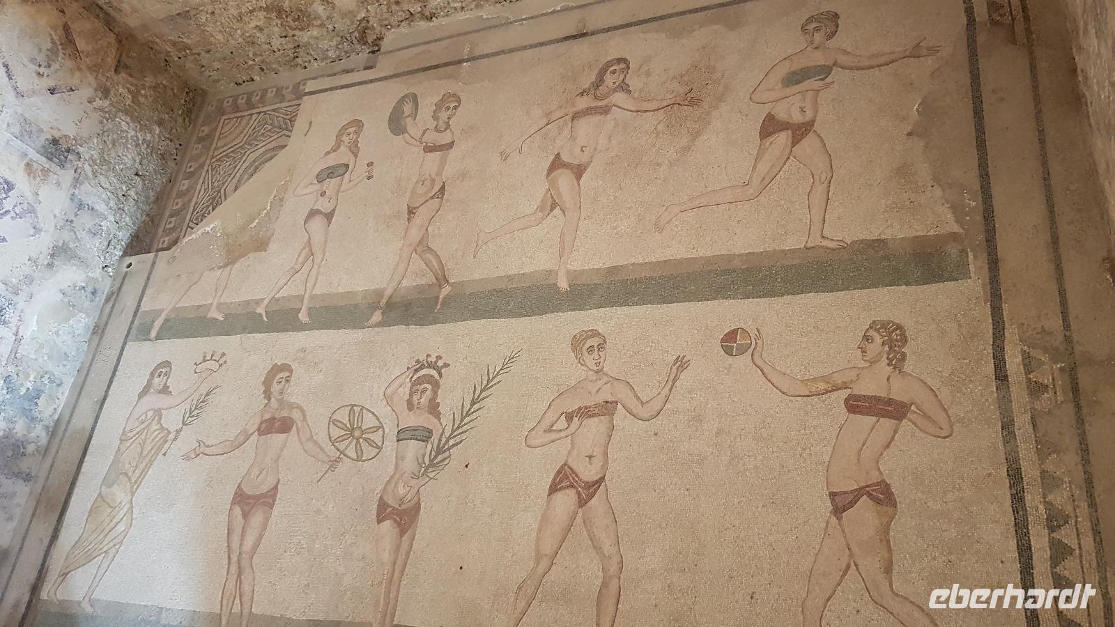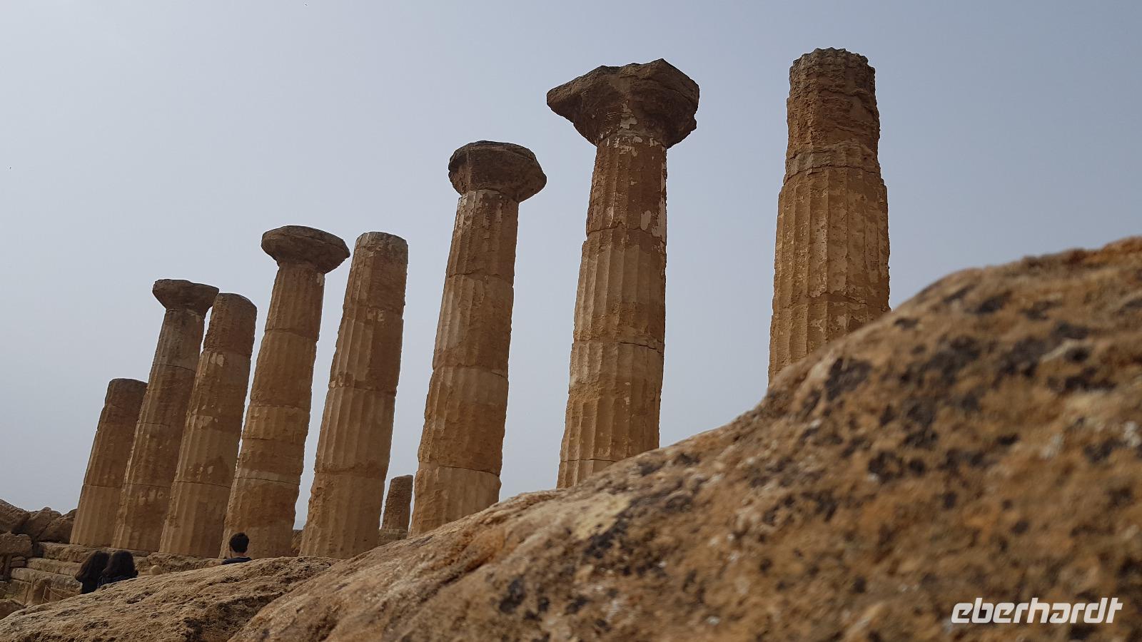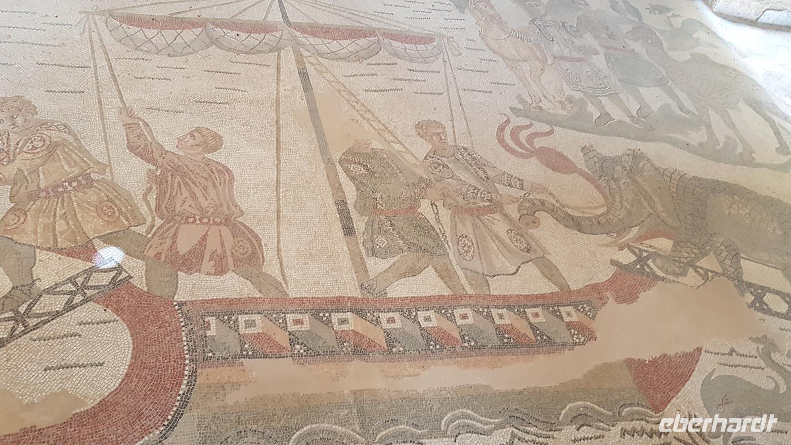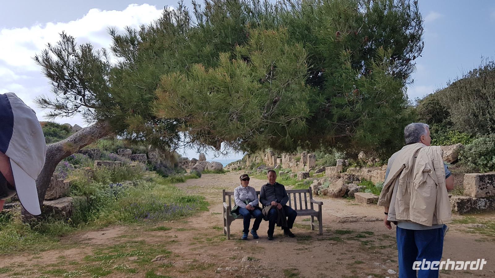 Heute heißt es wieder zeitig aufstehen, der Kofferservice nimmt die Koffer ab 7 Uhr vom Zimmer zum Bus mit und wir haben Zeit für ein Frühstück bevor es 8 Uhr losgeht. Mit einer kleinen Pause erreichen wir gegen 10 Uhr Piazza Armerina. Gut, dass wir keinen so großen Bus haben. So ist es möglich, durch die engen Gassen zu fahren und Annemarie weist uns z.B. auf Brunnen hin, an denen noch heute Trinkwasser geholt wird, wir können einen Blick auf den Dom aus der Normannenzeit werfen, dann sind wir auch schon an der Villa Romana. Zu dieser Stunde sind wir fast allein hier, gut so. Dadurch können wir die herrlichen Bodenmosaike in aller Ruhe ansehen. Sie wurden quasi konserviert, als die Gebäude durch einen Erdrutsch verschüttet wurden. Erst in den 50er Jahre begann man mit den Ausgrabungen- heute werden die Mosaike durch Überdachungen und Nachbauten der ursprünglichen Gebäude geschützt. Besonders angetan hat es uns natürlich die „große Jagd". Auf mehr als 70 Metern sind meisterhaft Szenen dargestellt, in denen wilde Tiere gefangen und verladen werden, wieder entladen und weiter transportiert werden. Ein Beleg dafür, welch großen Stellenwert der Handel mit wilden Tieren damals hatte. Aber auch alltägliche Szenen sind dargestellt, die berühmten „Bikini-Mädchen" treiben Sport und die Siegerin erhält den Lorbeerkranz, die Vorratsräume mit den Ornamenten, auch ein salomonischer Knoten ist dargestellt. Die Zimmer des Hausherrn, in denen Odysseus Polyphem mit Wein betrunken macht, der Sänger so schön singt, dass alle Tiere gebannt ihm zuhören und ihm letztlich das Leben retten. Oder die Zimmer der Kinder: wie sie spielerisch das Jagen, Reiten und Kämpfen lernten. So vieles gibt es zu entdecken, die Bäder, der herrliche Innenhof, in dem man das Wasserspiel quasi vor Augen hat...Doch unser Rundgang ist beendet und unsere Fahrt führt uns weiter nach Agrigent. Unterwegs erzählt uns Annemarie vom Sarsotal und dem Salsa-Fluss. Dieser ist leicht salzhaltig, da er unterirdische Salzquellen durchfließt. Nach einem kurzen Imbiss-Stopp erreichen wir das „Tal der Tempel". Schon von weitem sind die Tempel auf den Bergen sichtbar, auch vom Meer aus, und symbolisieren seit jeher Macht und Verteidigungsbereitschaft. Wir starten am Tempel der Hera und sind fasziniert von der Größe und Schönheit. Bei strahlendem Sonnenschein spazieren wir weiter, vorbei an Grabstätten der Byzantiner hinunter zum Concordia-Tempel. Dieser wurde einst zu einer christlichen Basilika umgebaut, die Säulen wurden zugemauert und sind daher heute besonders gut erhalten. Sie wurden erst im 18. Jahrhundert wieder freigelegt. Am Zeus- Tempel entdecken wir eine Besonderheit: Ursprünglich standen hier gigantische Steinfiguren, die das Dach zu tragen schienen, eine davon liegt heute vor dem Tempel, es ist zwar nur eine Kopie, weil das Original im Museum geschützt liegt, dieser sogenannte Telamon ist aber mehr als beeindruckend. Am späten Nachmittag treffen wir dann unseren Busfahrer am unteren Ausgang und fahren in unser neues Hotel: ein Agriturismo, das Casa di Latomie. Wir beziehen unsere Zimmer und können ein wenig ausruhen, dann gibt es ein wunderbares Abendessen. Schon die Vorspeisen verführen, das hauseigene Olivenöl kann verkostet werden, es gibt Oliven, Pizza-Stückchen, gefüllte Auberginen, natürlich das bekannte dunkle Brot der Region, dann Pasta und dann Salat, Fleischröllchen und Schweinswurst. Dazu ein leckerer Wein- was will man mehr...