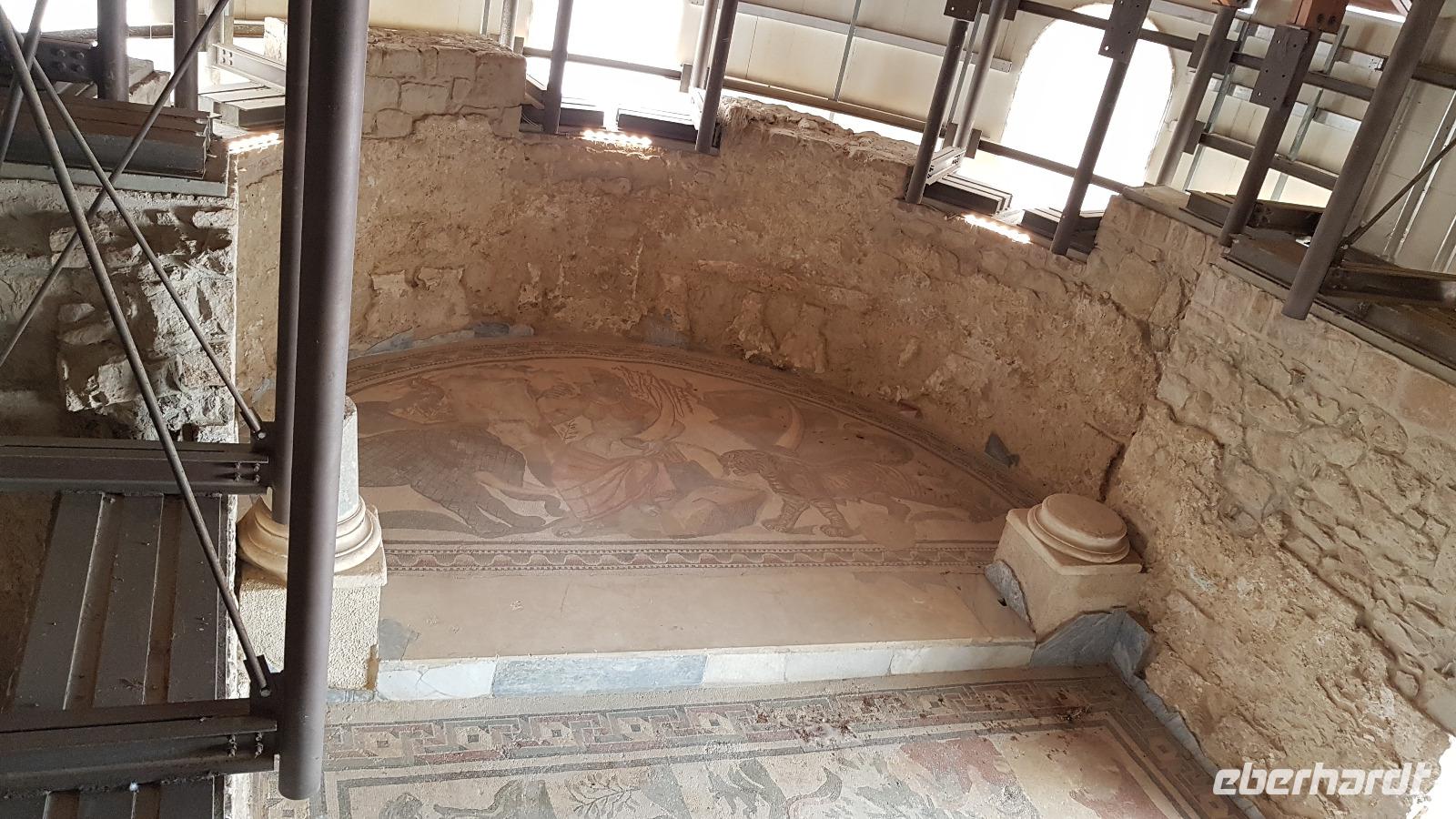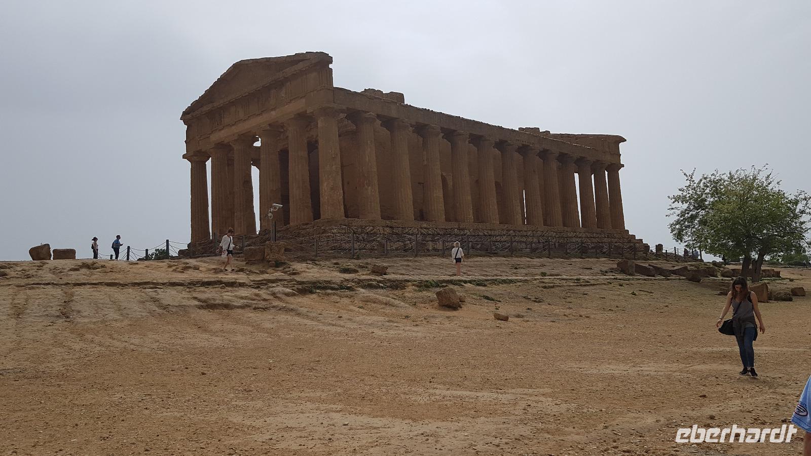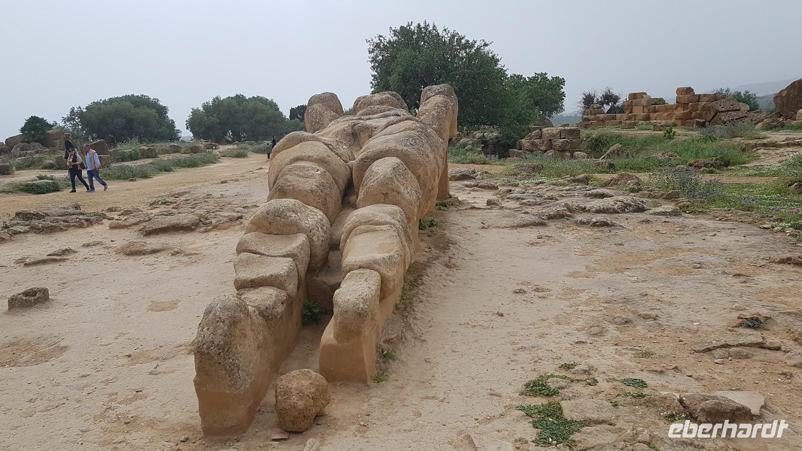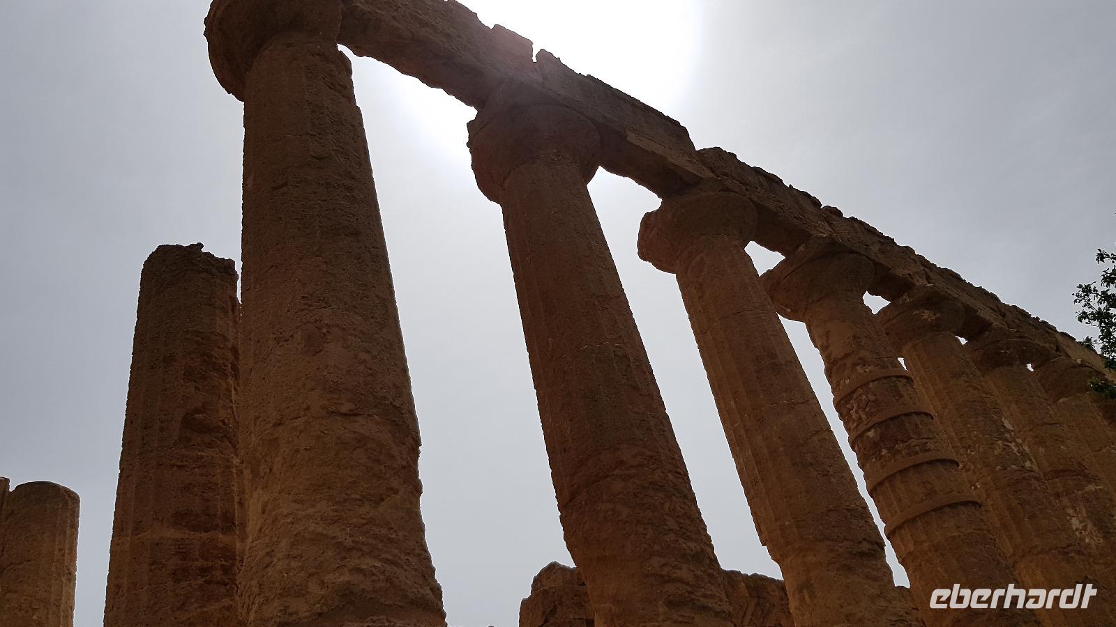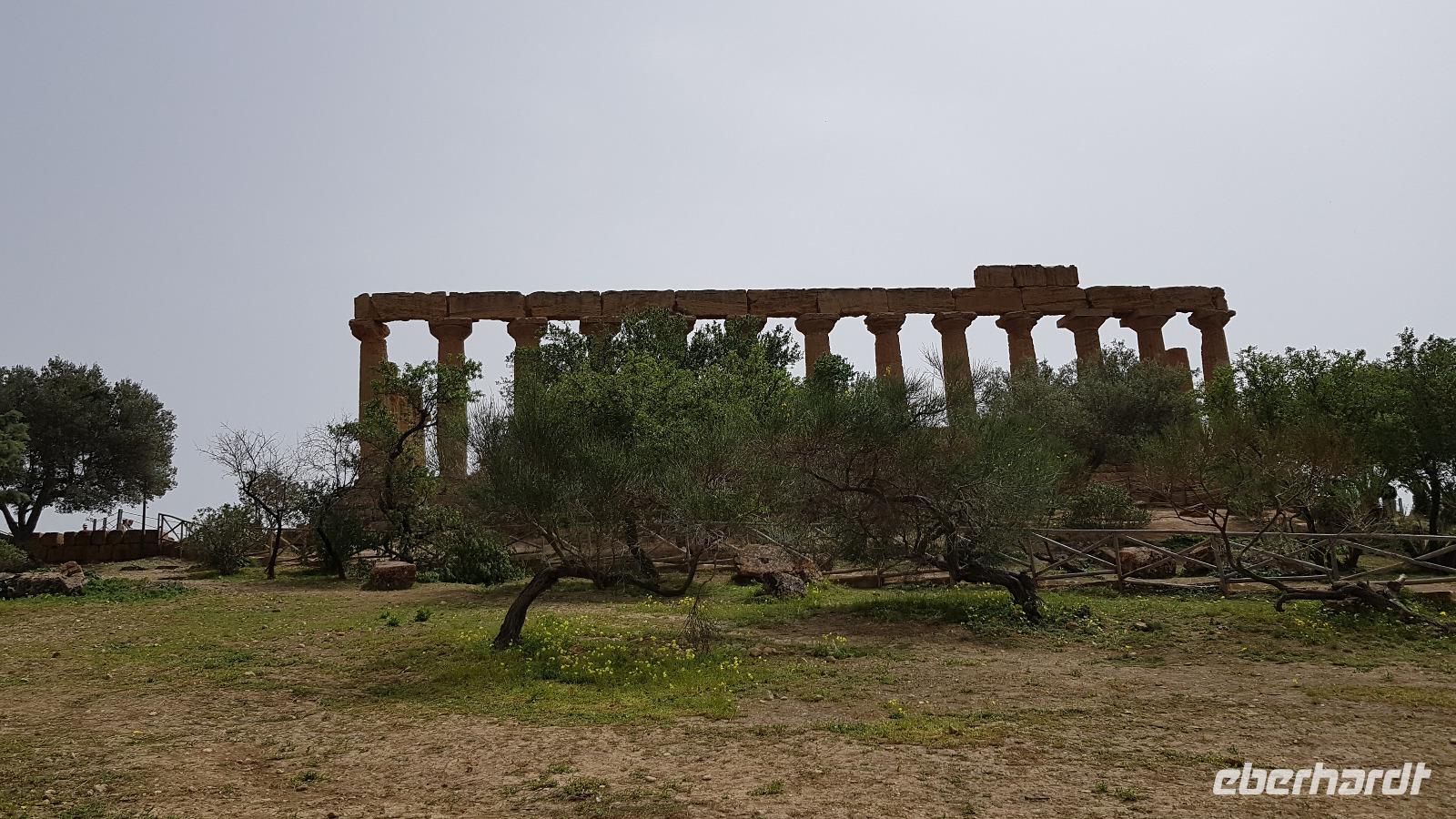Heute heißt es wieder zeitig aufstehen, der Kofferservice nimmt die Koffer ab 7 Uhr vom Zimmer zum Bus mit und wir haben Zeit für ein Frühstück bevor es 8 Uhr losgeht. Mit einer kleinen Pause erreichen wir gegen 10 Uhr Piazza Armerina. Gut, dass wir keinen so großen Bus haben. So ist es möglich, durch die engen Gassen zu fahren und Annemarie weist uns z.B. auf Brunnen hin, an denen noch heute Trinkwasser geholt wird, wir können einen Blick auf den Dom aus der Normannenzeit werfen, dann sind wir auch schon an der Villa Romana. Zu dieser Stunde sind wir fast allein hier, gut so. Dadurch können wir die herrlichen Bodenmosaike in aller Ruhe ansehen. Sie wurden quasi konserviert, als die Gebäude durch einen Erdrutsch verschüttet wurden. Erst in den 50er Jahre begann man mit den Ausgrabungen- heute werden die Mosaike durch Überdachungen und Nachbauten der ursprünglichen Gebäude geschützt. Besonders angetan hat es uns natürlich die „große Jagd". Auf mehr als 70 Metern sind meisterhaft Szenen dargestellt, in denen wilde Tiere gefangen und verladen werden, wieder entladen und weiter transportiert werden. Ein Beleg dafür, welch großen Stellenwert der Handel mit wilden Tieren damals hatte. Aber auch alltägliche Szenen sind dargestellt, die berühmten „Bikini-Mädchen" treiben Sport und die Siegerin erhält den Lorbeerkranz, die Vorratsräume mit den Ornamenten, auch ein salomonischer Knoten ist dargestellt. Die Zimmer des Hausherrn, in denen Odysseus Polyphem mit Wein betrunken macht, der Sänger so schön singt, dass alle Tiere gebannt ihm zuhören und ihm letztlich das Leben retten. Oder die Zimmer der Kinder: wie sie spielerisch das Jagen, Reiten und Kämpfen lernten. So vieles gibt es zu entdecken, die Bäder, der herrliche Innenhof, in dem man das Wasserspiel quasi vor Augen hat...Doch unser Rundgang ist beendet und unsere Fahrt führt uns weiter nach Agrigent. Unterwegs erzählt uns Annemarie vom Sarsotal und dem Salsa-Fluss. Dieser ist leicht salzhaltig, da er unterirdische Salzquellen durchfließt. Nach einem kurzen Imbiss-Stopp erreichen wir das „Tal der Tempel". Schon von weitem sind die Tempel auf den Bergen sichtbar, auch vom Meer aus, und symbolisieren seit jeher Macht und Verteidigungsbereitschaft. Wir starten am Tempel der Hera und sind fasziniert von der Größe und Schönheit. Bei strahlendem Sonnenschein spazieren wir weiter, vorbei an Grabstätten der Byzantiner hinunter zum Concordia-Tempel. Dieser wurde einst zu einer christlichen Basilika umgebaut, die Säulen wurden zugemauert und sind daher heute besonders gut erhalten. Sie wurden erst im 18. Jahrhundert wieder freigelegt. Am Zeus- Tempel entdecken wir eine Besonderheit: Ursprünglich standen hier gigantische Steinfiguren, die das Dach zu tragen schienen, eine davon liegt heute vor dem Tempel, es ist zwar nur eine Kopie, weil das Original im Museum geschützt liegt, dieser sogenannte Telamon ist aber mehr als beeindruckend. Am späten Nachmittag treffen wir dann unseren Busfahrer am unteren Ausgang und fahren in unser neues Hotel: ein Agriturismo, das Casa di Latomie. Wir beziehen unsere Zimmer und können ein wenig ausruhen, dann gibt es ein wunderbares Abendessen. Schon die Vorspeisen verführen, das hauseigene Olivenöl kann verkostet werden, es gibt Oliven, Pizza-Stückchen, gefüllte Auberginen, natürlich das bekannte dunkle Brot der Region, dann Pasta und dann Salat, Fleischröllchen und Schweinswurst. Dazu ein leckerer Wein- was will man mehr...