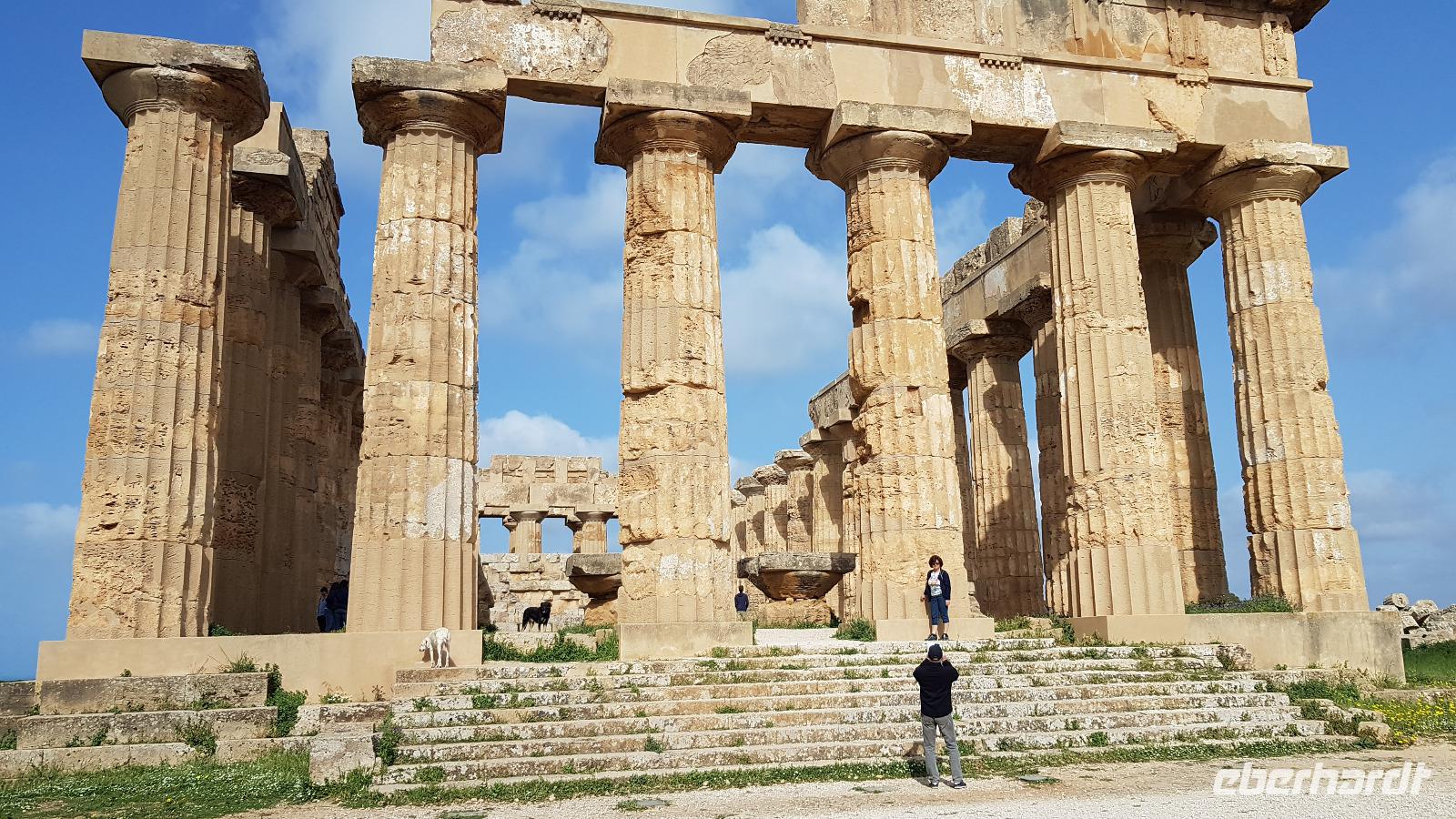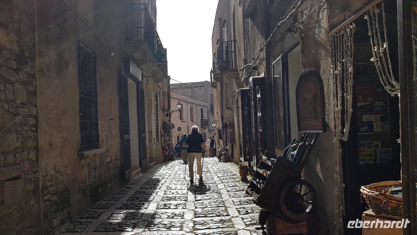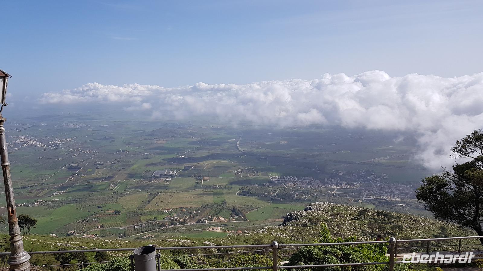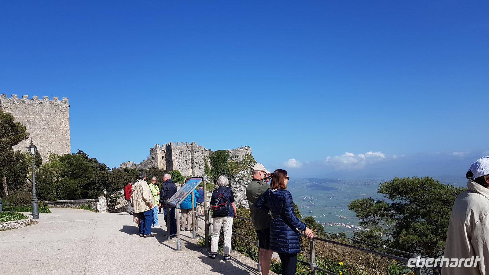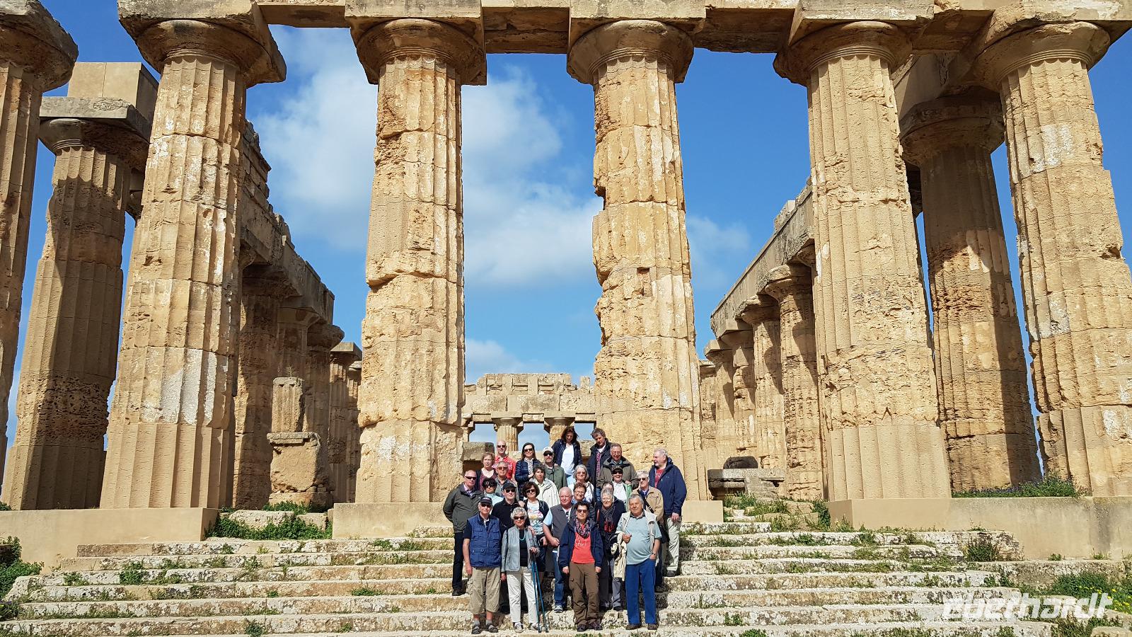 Heute holen wir unsere Sonntagsruhe nach- wir starten nämlich erst 9 Uhr. Nach einem leckeren Frühstück in unserem Agriturismo führt uns der Hausherr kurz durch das Anwesen. Er erzählt, dass es einst ein Steinbruch war und dass Olivenbäume durch die Steine hindurch wachsen, das mache den Geschmack der Oliven hier einzigartig. Ein Olivenbaum hier ist fast 1200 Jahre alt! Das Familienunternehmen liefert in mehr als 30 Länder der Erde, ihr Olivenöl ist mehrfach ausgezeichnet wurden. Das liegt auch daran, dass man die Oliven hier von Hand pflückt und nicht abschlägt, wie sonst üblich. Und dass von der Ernte bis zum Öl kaum mehr als 2 Stunden vergehen. Dann fahren wir los und sind bereits nach kurzer Zeit in Selinunte. Das Wetter verwöhnt uns und so spazieren wir bei strahlendem Sonnenschein durch den archäologischen Park. Da man nicht genau weiß, welcher Gottheit welcher Tempel geweiht war haben sie hier nur Buchstaben, wir starten also am Tempel E, diesen dürfen wir auch betreten und genießen den Ausblick auf das tiefblaue Meer. Tempel F und G sind erahnbar. Hier liegen die Überreste der gewaltigen Säulen und Kapitelle verstreut auf dem Boden. Wir spazieren hinüber zur Akropolis, nicht ohne immer wieder den einzigartigen Blick über die Tempelanlagen, heute umsäumt von bunten Blumenwiesen, hinunter zum Meer schweifen zu lassen. Auf der Akropolis laufen wir durch die „Altstadt", Überreste zahlreicher Wohnhäuser, zum Tempel C, der teilweise wiederaufgebaut wurde. Was für ein Erlebnis! Voller Eindrücke und von der Sonne verwöhnt fahren wir weiter Richtung Marsala. Es ist Mittagszeit und so erzählt Annemarie einiges über die Essgewohnheiten, auch dass im Sommer das „Nachtmahl" tatsächlich eines ist, da es zum Teil erst nach 22 Uhr eingenommen wird. Dann erzählt sie von Ihren Lieblingsgerichten, Ein Rezept konnte ich mir merken, es klang so lecker: Für 2 Personen Spaghetti kochen, von 2 Zitronen die Schale abreiben, den Saft dazugeben, Olivenöl Pfefferminzblättchen, Salz, Pfeffer und natürlich Knoblauch dazugeben, alles schaumig aufschlagen und die Spaghetti darin schwenken...Aber zurück zur Reise: Bald schon hatten wir Marsala erreicht, die Stadt mit dem größten Fischereihafen Siziliens. Unser Ziel waren aber die Salinen. Wir hielten für einen Fotostopp an der Isola die Mozia, schauten uns die Salzbecken an und wer wollte nahm ein kleines Salz-Souvenir mit. Dann fuhren wir zu Maria- genauer zu ihrem Baglio Fontanasalza in Trapani. Ein ehemaliger Gutshof, der heute Olivenöl aus eigenen Olivenhainen herstellt. Passend zum Ambiente wurden wir von einer Sängerin empfangen, die zu den Klängen ihrer Gitarre alte sizilianische Weisen sang. Und dann wurden wir wieder verwöhnt mit leckeren Vorspeisen und natürlich hausgemachter Pasta, Salat und Fleischröllchen folgten. Derart gestärkt brachen wir zu unserem nächsten Ziel auf: Erice. Hoch oben auf dem 751 Meter hohe Monte Erice liegt das Städtchen, das der Überlieferung nach von einem Sohn Aphrodites gegründet wurde. Die Normannen haben hier ein Kastell und die Stadttore gebaut, die Stadt blühte auf und es wurden Kirchen und Klöster gebaut. Zeitweise sollen es 43 Kirchen und 3 Klöster gewesen sein. Wir spazieren durch das Porta di Trapani und laufen die engen Gassen bis zum Kastell hinauf. Hier genießen wir einen einzigartigen Ausblick auf die Ebenen und erleben ein ganz besonderes Schauspiel: die Wolken stauen sich am Berg, fließen quasi durch die Stadt hindurch und stürzen auf der anderen Seite des Berges in die Tiefe. Wow! Auf dem Rückweg müssen wir natürlich bei Maria Grammatica halten. Sie bäckt immer noch das leckerste Mandelgebäck! Wir dürfen davon probieren und da kann kaum einer widerstehen, Maria selber sitzt an der Kasse und wir suchen aus den Leckereien unser Lieblingsgebäck für die Lieben daheim aus. Bevor wir weiterfahren werfen wir noch einen Blick auf den Dom mit seinem Campanile, seinem Glockenturm und es geht zurück zu unserem Agriturismo. Doch unterwegs haben Annemarie und ich noch eine kleine Überraschung. Wir halten an einem schönen Aussichtspunkt und bitten zum Fotostopp. Dort gibt es dann für alle eine Kostprobe vom berühmten Marsala. Den hatten wir heimlich bei Maria Grammatica erstanden und die Gruppe ist sichtlich erfreut, diesen nun probieren zu können. Wir stoßen auf einen gelungenen Tag an und dann geht es tatsächlich zurück. Ein leckeres Abendessen mit vielen Vorspeisen, Pasta und Sardinen beendet unseren Tag.
