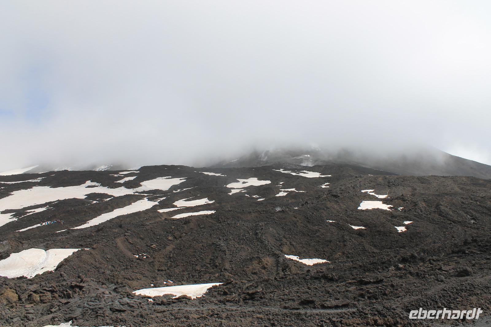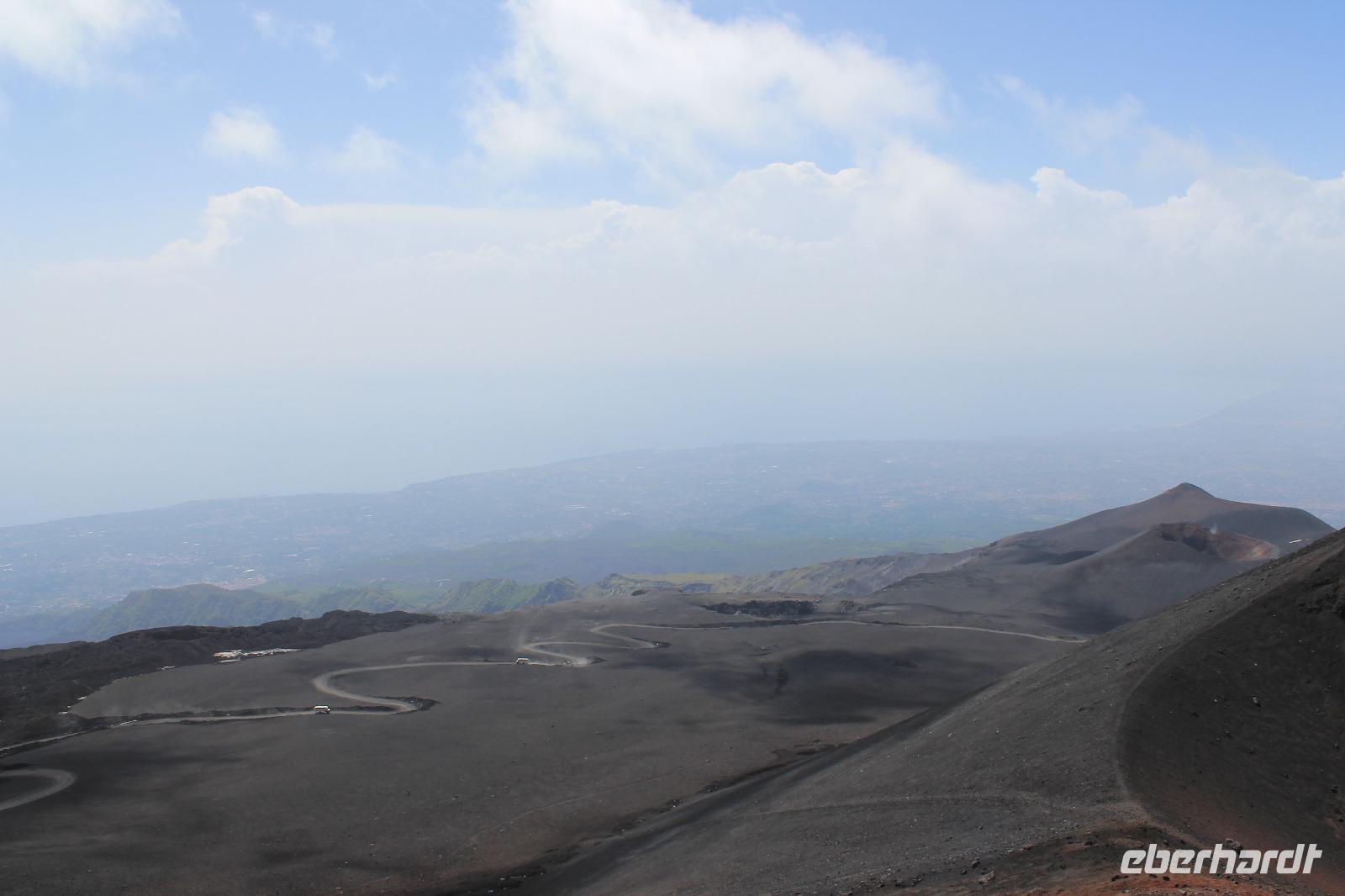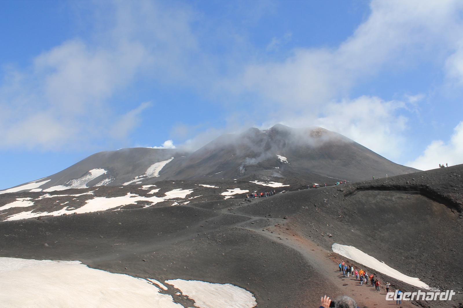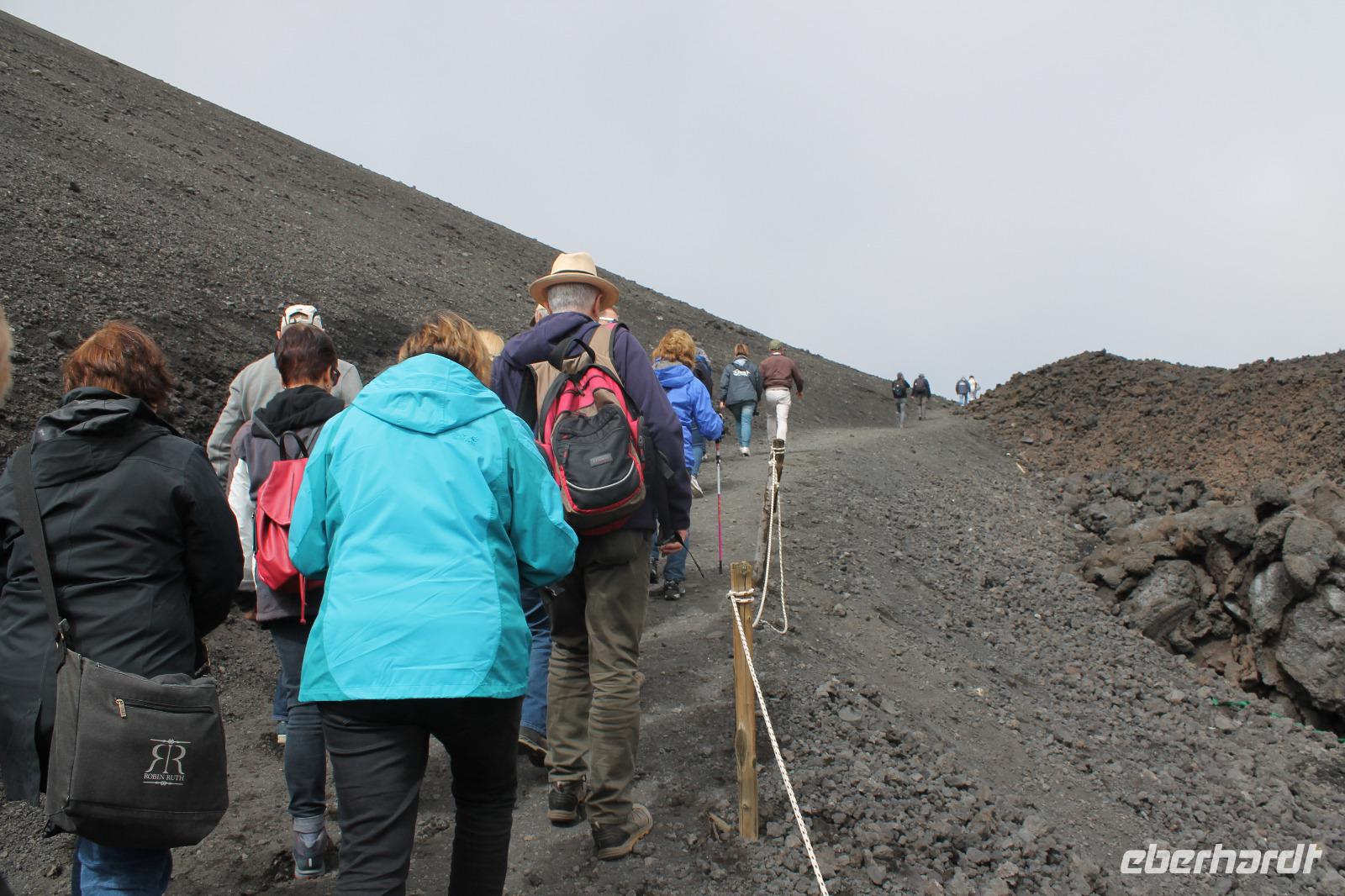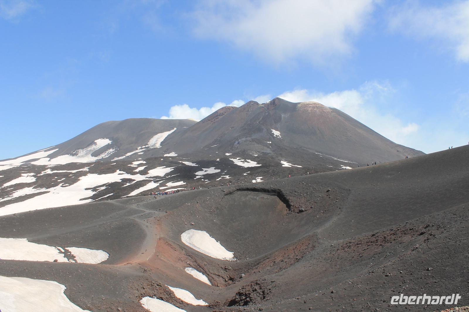 Als erstes Ausflugsziel stand heute der Ätna auf unserem Plan. Wir fuhren durch das Alcantara-Tal in das Gebiet des Ätnas. Der Alcantara-Fluss entspringt in den Nebrodi-Bergen und ist die natürliche Grenze des Ätna-Gebietes, welches 1200km² groß ist. Wir fuhren also die Serpentinenstraße des Schichtvulkans hinauf. Die Ostküste Siziliens besteht aus schwarzem Basalt und ebenso schwarzen Felsen. Der Ätna hat über 400 Nebenkrater - kein Wunder also, wenn die Einwohner in der Gegend einen kleinen Ausbruch mittlerweile gelassener sehen. Weiter ging es durch Kastanienwälder, die seit 1989 unter Naturschutz stehen und die von der Corpe Forestale geschützt und gepflegt werden. Schon waren wir angekommen bei der Bergstation auf 1900m Höhe angekommen. Alle Gäste unserer Gruppe wagten sich mit der Seilbahn rauf auf 2500m Höhe und dann noch weiter hinauf, bis zu den vier Hauptkratern mit den Geländewagen. Wir hatten ein riesen Glück, denn die Wolken, die vorerst den Krater verdeckten, verzogen sich. Es war windstill und warm - nahezu perfekt!