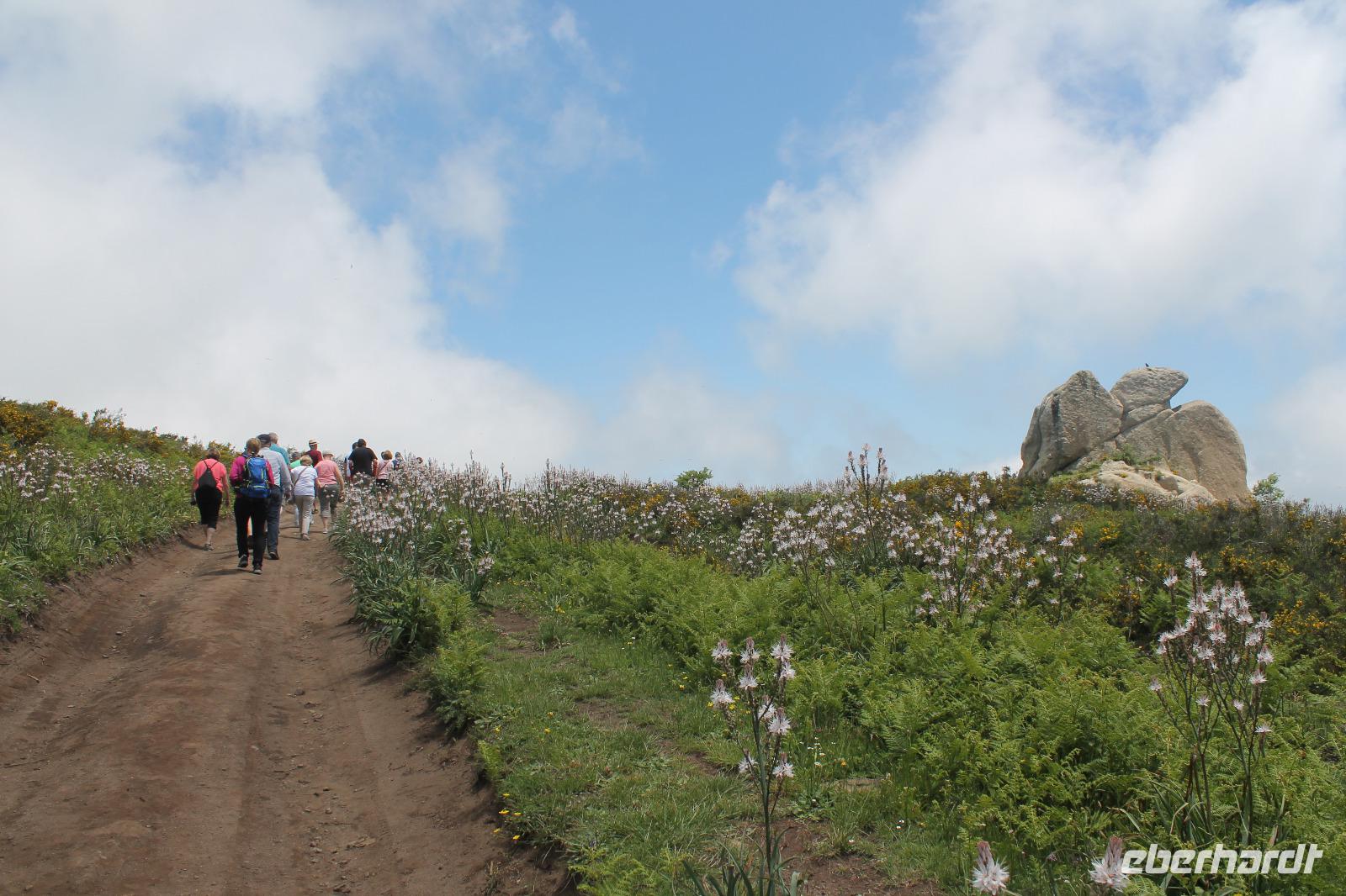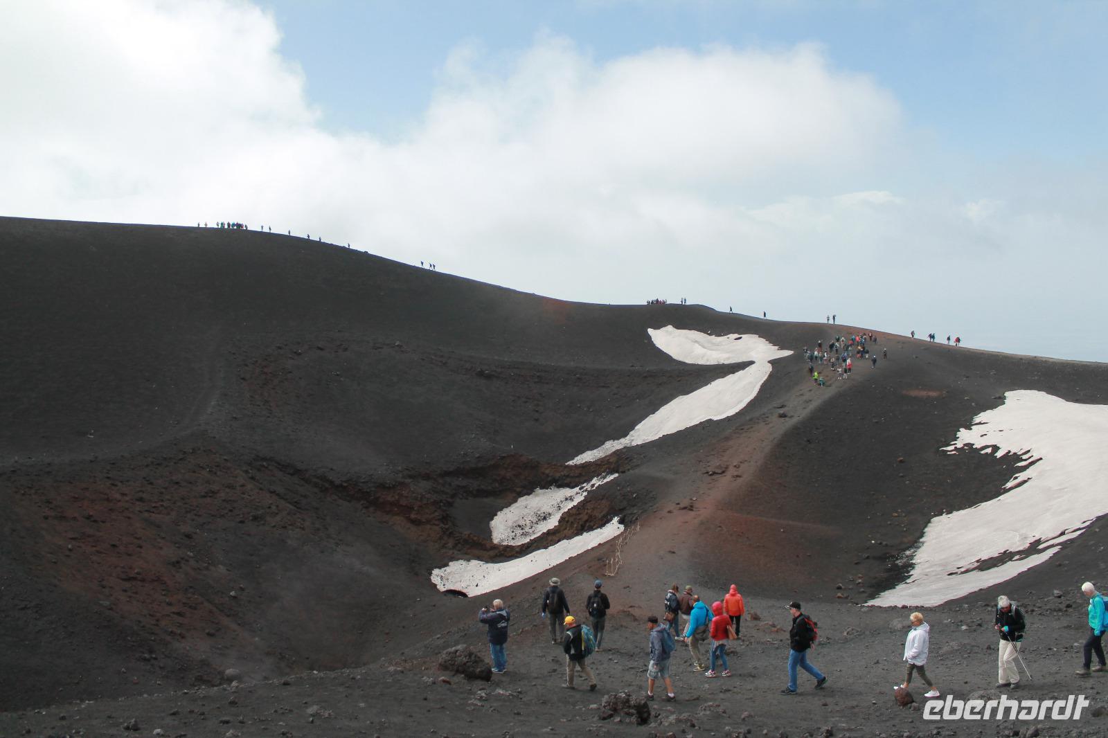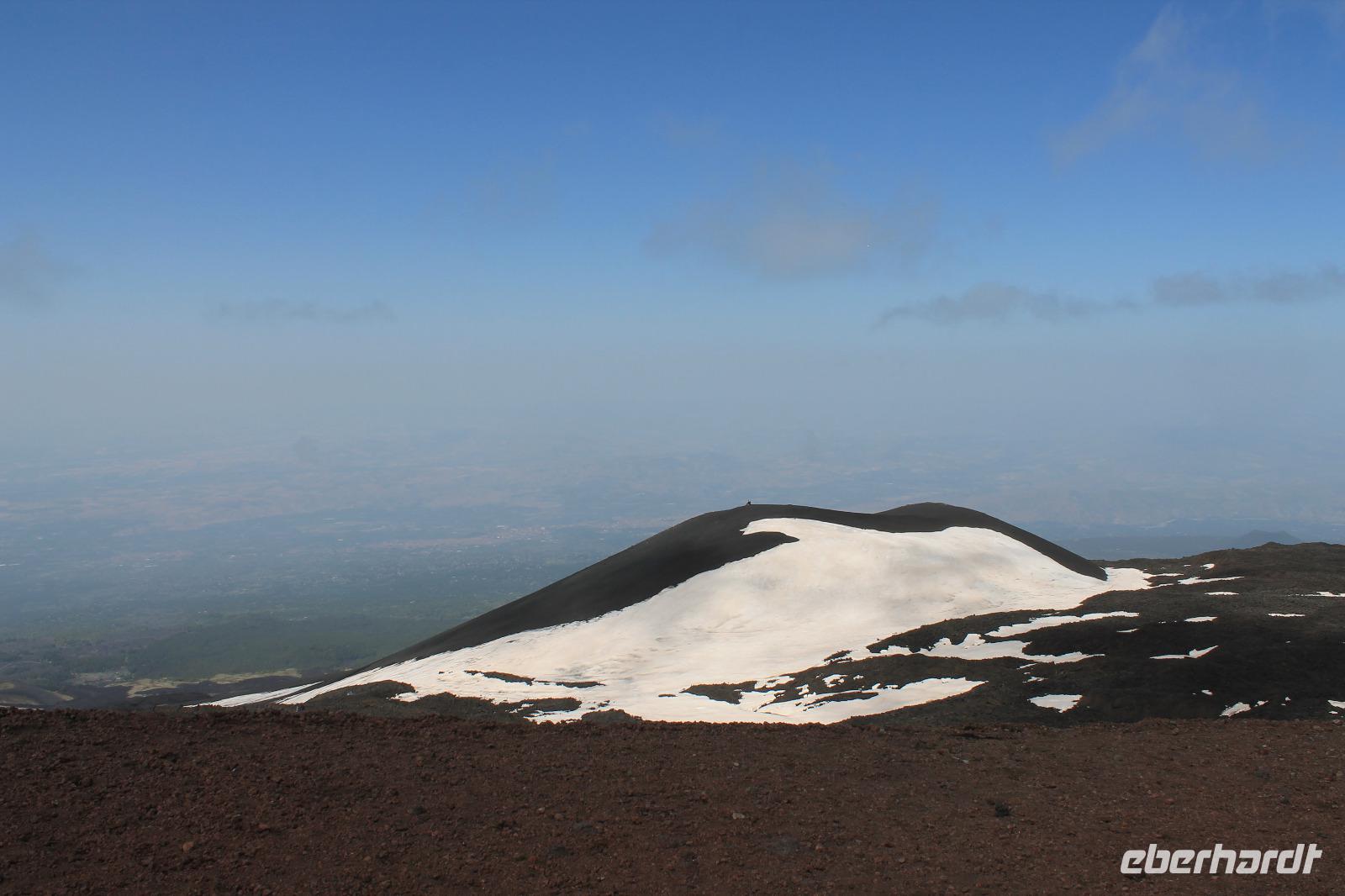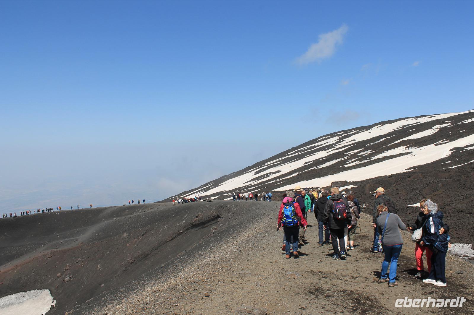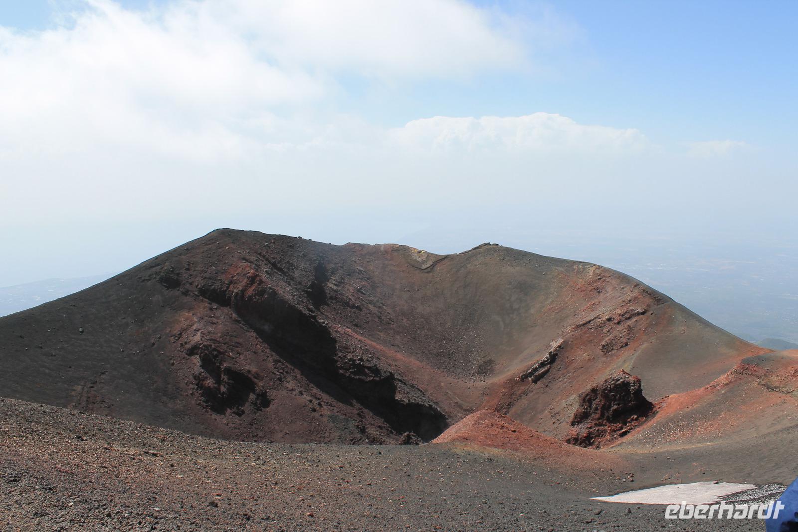 Als erstes Ausflugsziel stand heute der Ätna auf unserem Plan. Wir fuhren durch das Alcantara-Tal in das Gebiet des Ätnas. Der Alcantara-Fluss entspringt in den Nebrodi-Bergen und ist die natürliche Grenze des Ätna-Gebietes, welches 1200km² groß ist. Wir fuhren also die Serpentinenstraße des Schichtvulkans hinauf. Die Ostküste Siziliens besteht aus schwarzem Basalt und ebenso schwarzen Felsen. Der Ätna hat über 400 Nebenkrater - kein Wunder also, wenn die Einwohner in der Gegend einen kleinen Ausbruch mittlerweile gelassener sehen. Weiter ging es durch Kastanienwälder, die seit 1989 unter Naturschutz stehen und die von der Corpe Forestale geschützt und gepflegt werden. Schon waren wir angekommen bei der Bergstation auf 1900m Höhe angekommen. Alle Gäste unserer Gruppe wagten sich mit der Seilbahn rauf auf 2500m Höhe und dann noch weiter hinauf, bis zu den vier Hauptkratern mit den Geländewagen. Wir hatten ein riesen Glück, denn die Wolken, die vorerst den Krater verdeckten, verzogen sich. Es war windstill und warm - nahezu perfekt!