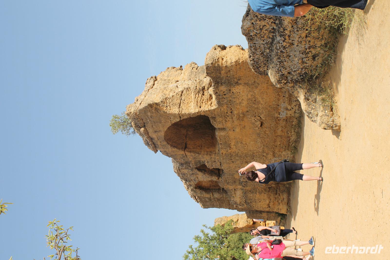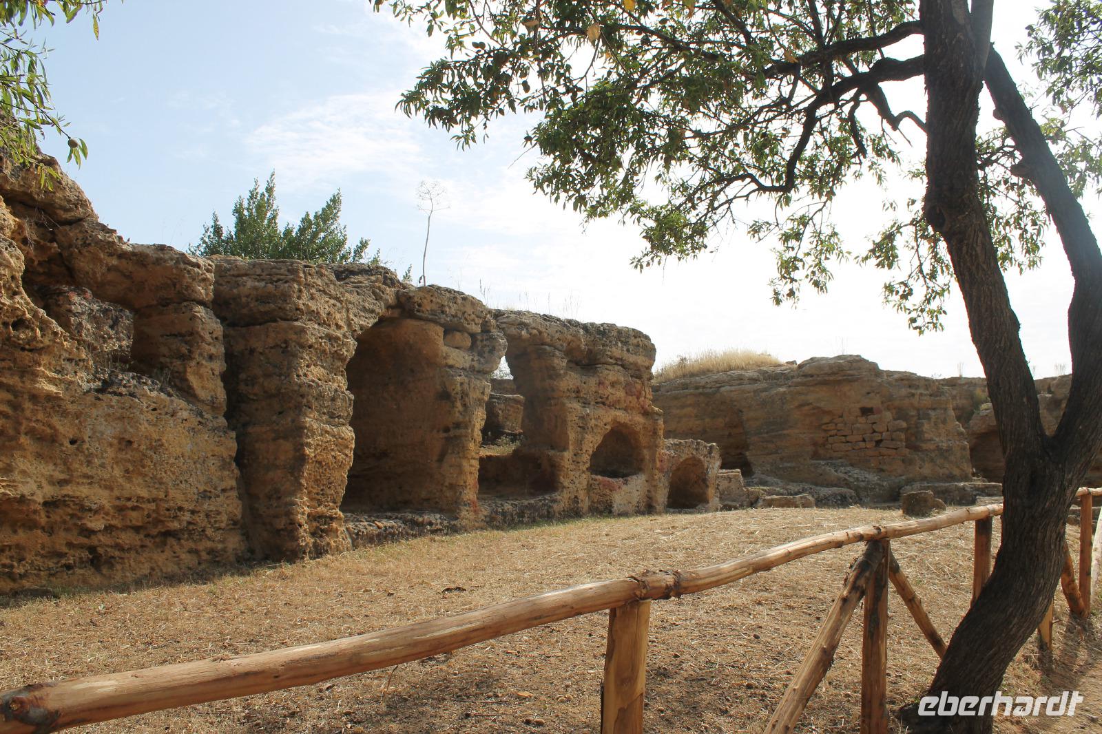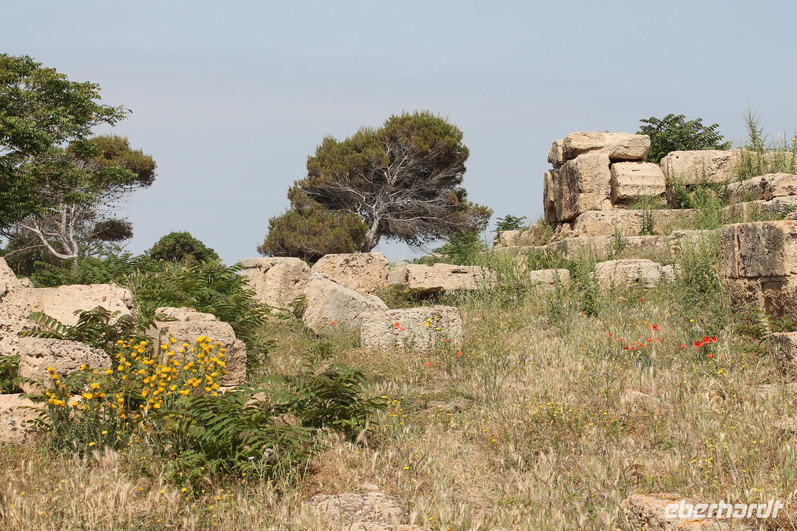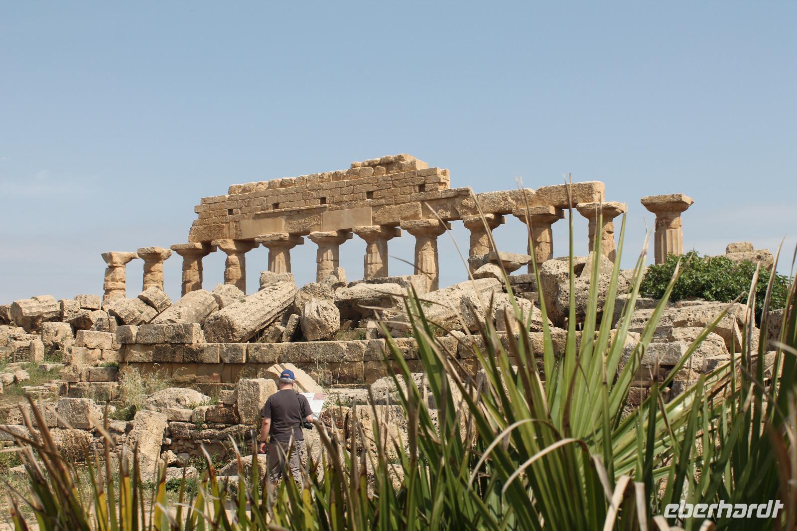 Gleich nach dem Frühstück führte uns der Chef unseres Landhauses durch seinen eigenen „Steinbruch", wo heute ein Pool und eine Wiese zum Sonnen vorhanden sind. Die Steine, die damals aus dem Steinbruch geholt worden sind, dienten dem Bau von Selinunte, welches 70 km entfernt liegt. Er besitzt 42 Hektar Land und 8000 Olivenbäume, deren Öl er auch verkauft. Circa die Hälfte seiner Bäume ist über 300 Jahre alt, sogar bis 1500 Jahre alt. Es ist Tradition, dass bei der Geburt eines Kindes ein Olivenbaum gepflanzt wird. Nach der kleinen Präsentation seines stolzen Besitzes, machten wir uns also auf den Weg nach Selinunte. Selinunte wurde 750 v.Chr. an einer 30 Meter hohen Küste gegründet. Damals lebten hier, in der Akropolis, etwa 25.000 Menschen - somit war Selinunte eine echte Großstadt. Ganz nah ist auch der Fluss Hypsas, der damals viel tiefer und breiter und somit auch befahrbar war. Dort, wo heute Sandstrand und ein kleines Rinnsal ist, war vor tausenden von Jahren ein wichtiger Hafen. Die ehemalige Stadt erhielt ihren Namen nicht etwa von einem großen Herrscher oder ähnlichem, sondern vom Petroselinum - der Petersilie, die hier überall wild wuchs. Wir gingen vorbei an Sarkophagen, in denen Grabbeigaben wie Münzen oder Vasen gefunden wurden. Diese Gaben legte man dem Toten bei, um ihm die Überfahrt in die Unterwelt zu ermöglichen. Die Cartager zerstörten nach ihrer Niederlage gegen die Griechen Selinunte.