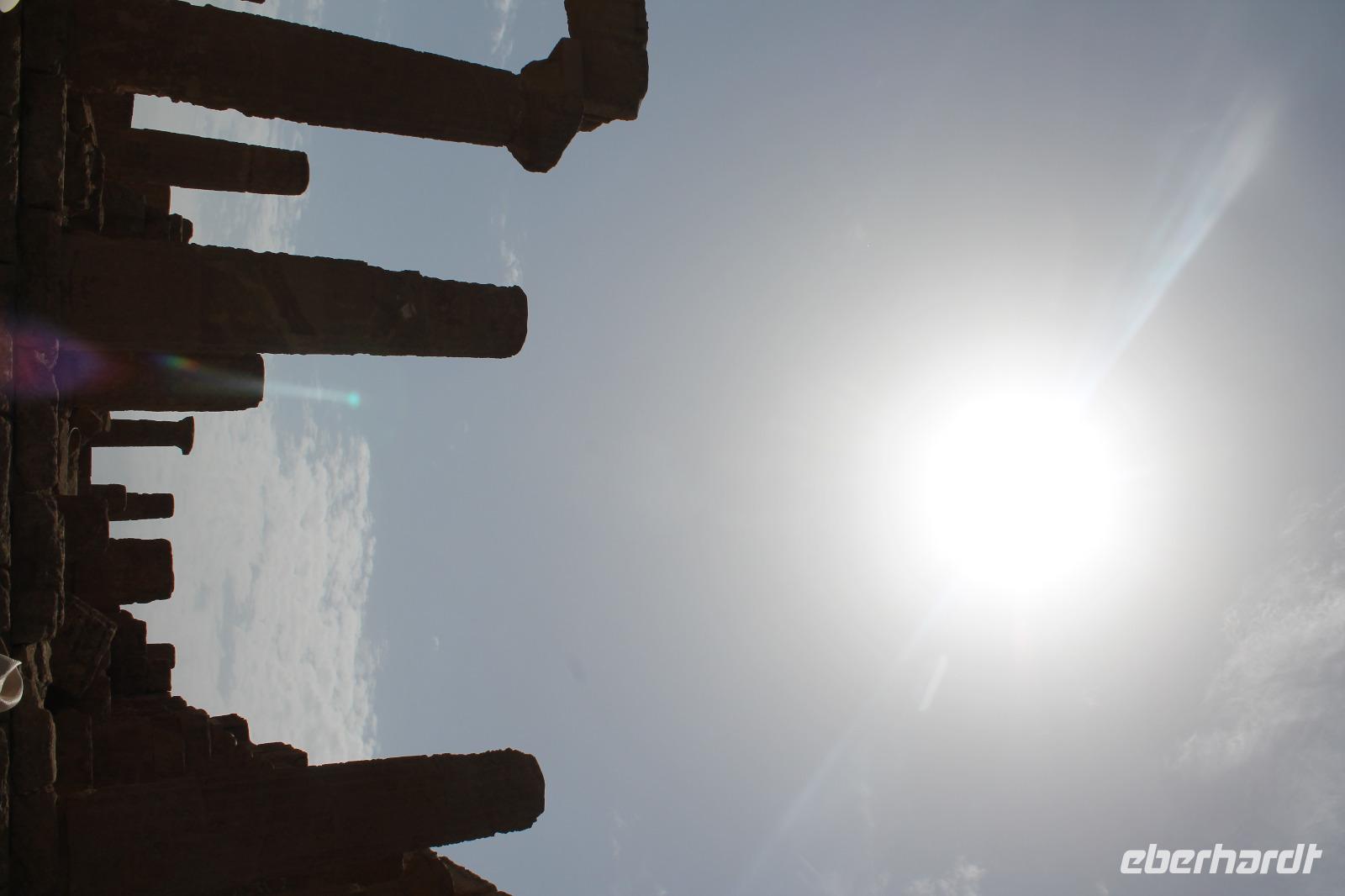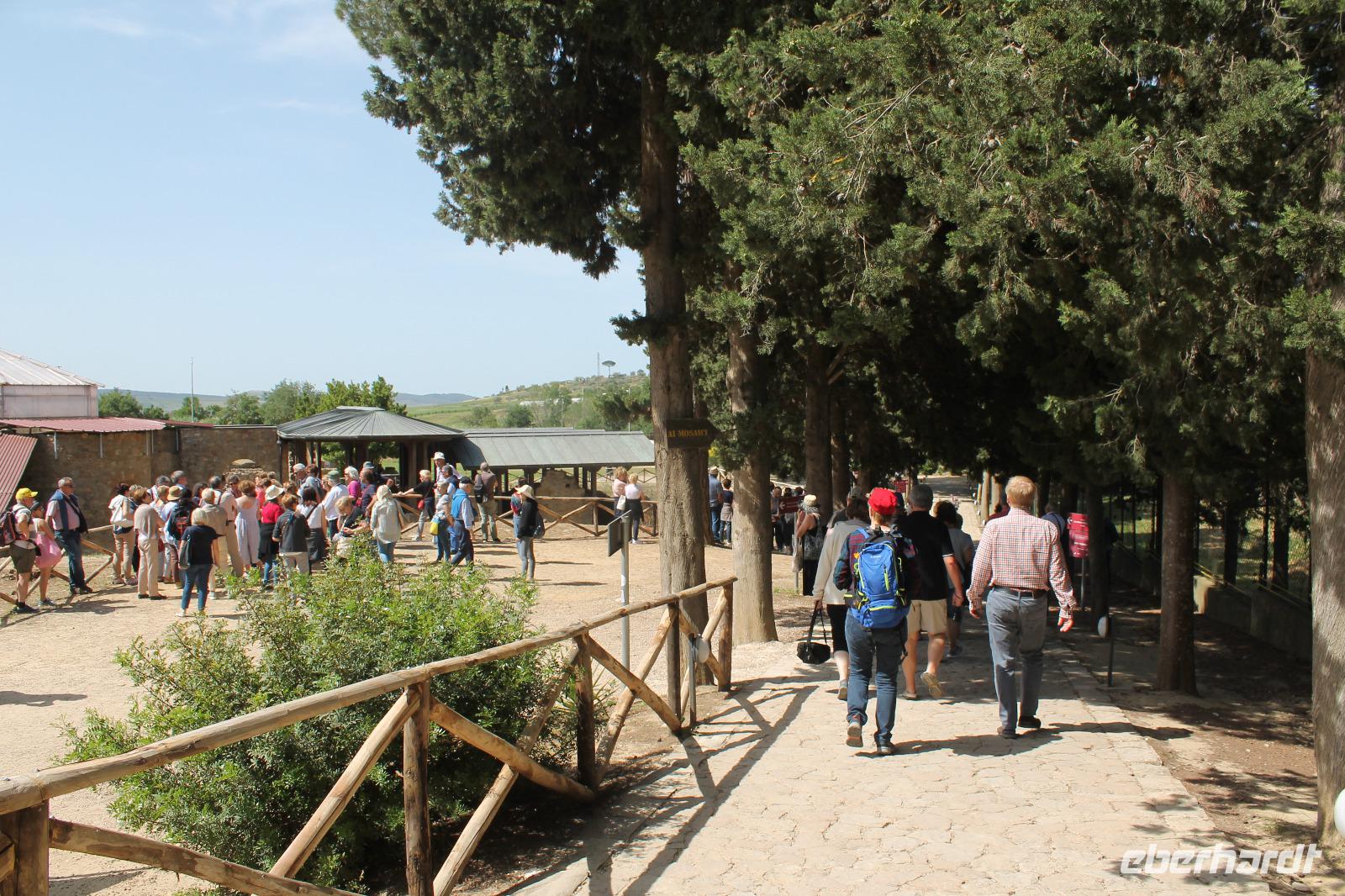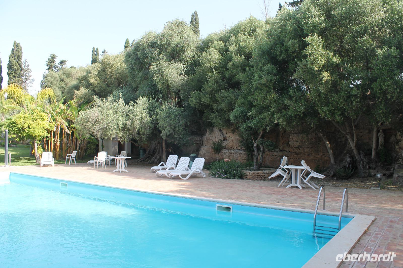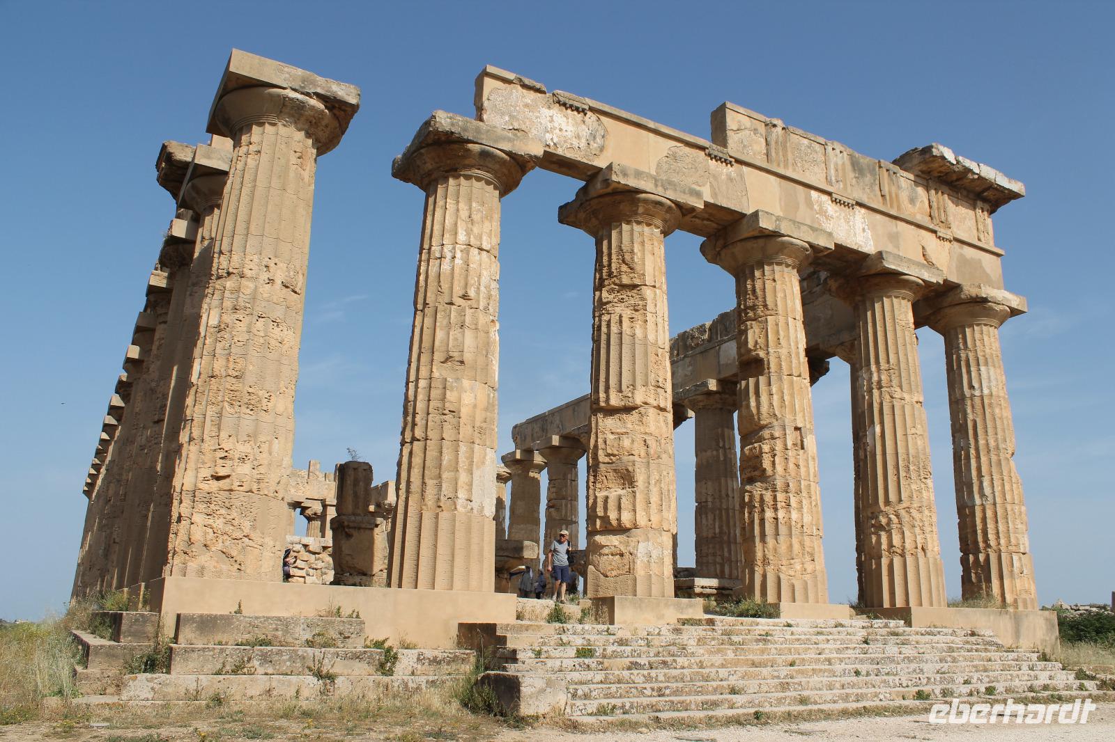 Gleich nach dem Frühstück führte uns der Chef unseres Landhauses durch seinen eigenen „Steinbruch", wo heute ein Pool und eine Wiese zum Sonnen vorhanden sind. Die Steine, die damals aus dem Steinbruch geholt worden sind, dienten dem Bau von Selinunte, welches 70 km entfernt liegt. Er besitzt 42 Hektar Land und 8000 Olivenbäume, deren Öl er auch verkauft. Circa die Hälfte seiner Bäume ist über 300 Jahre alt, sogar bis 1500 Jahre alt. Es ist Tradition, dass bei der Geburt eines Kindes ein Olivenbaum gepflanzt wird. Nach der kleinen Präsentation seines stolzen Besitzes, machten wir uns also auf den Weg nach Selinunte. Selinunte wurde 750 v.Chr. an einer 30 Meter hohen Küste gegründet. Damals lebten hier, in der Akropolis, etwa 25.000 Menschen - somit war Selinunte eine echte Großstadt. Ganz nah ist auch der Fluss Hypsas, der damals viel tiefer und breiter und somit auch befahrbar war. Dort, wo heute Sandstrand und ein kleines Rinnsal ist, war vor tausenden von Jahren ein wichtiger Hafen. Die ehemalige Stadt erhielt ihren Namen nicht etwa von einem großen Herrscher oder ähnlichem, sondern vom Petroselinum - der Petersilie, die hier überall wild wuchs. Wir gingen vorbei an Sarkophagen, in denen Grabbeigaben wie Münzen oder Vasen gefunden wurden. Diese Gaben legte man dem Toten bei, um ihm die Überfahrt in die Unterwelt zu ermöglichen. Die Cartager zerstörten nach ihrer Niederlage gegen die Griechen Selinunte.