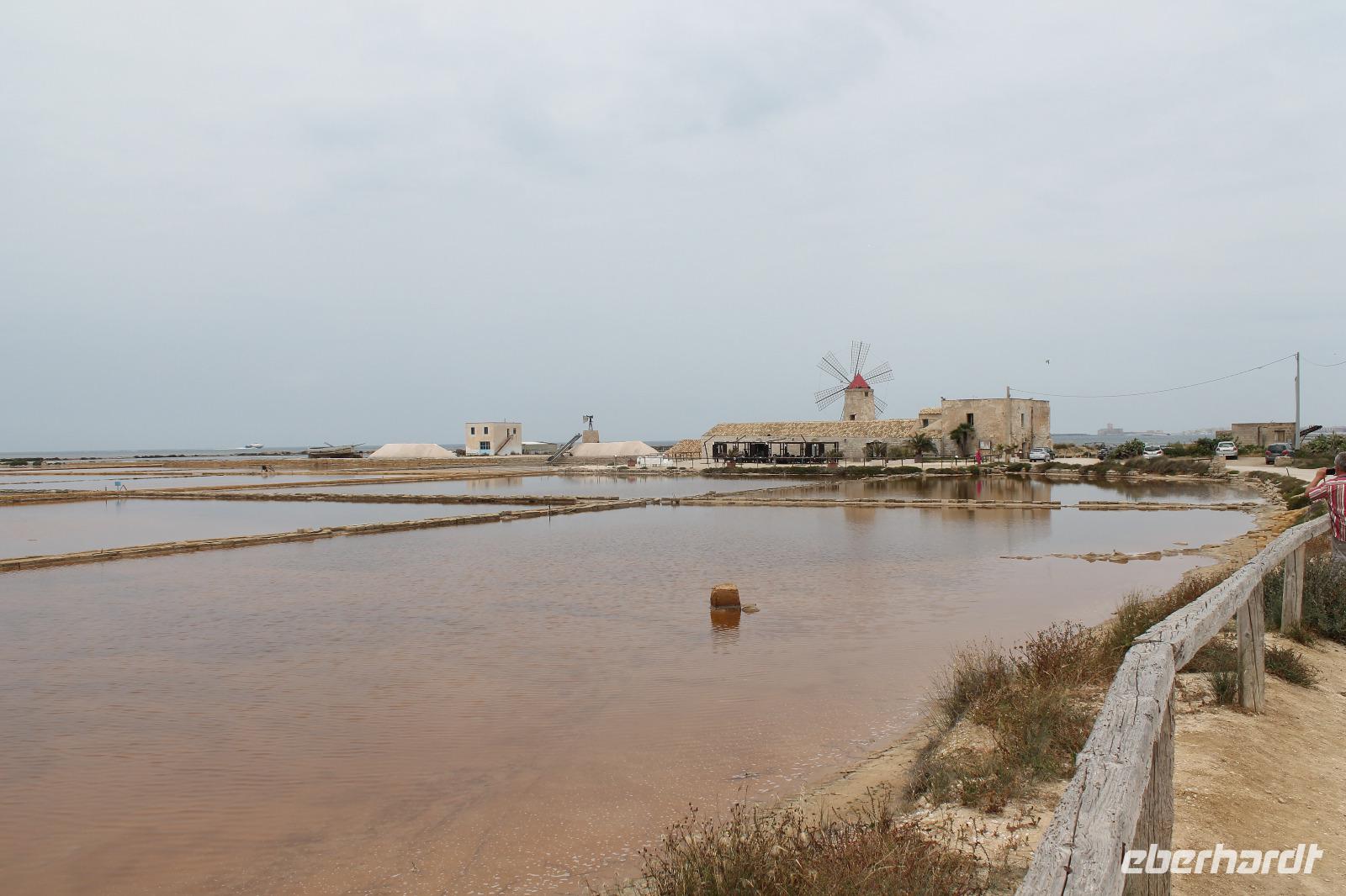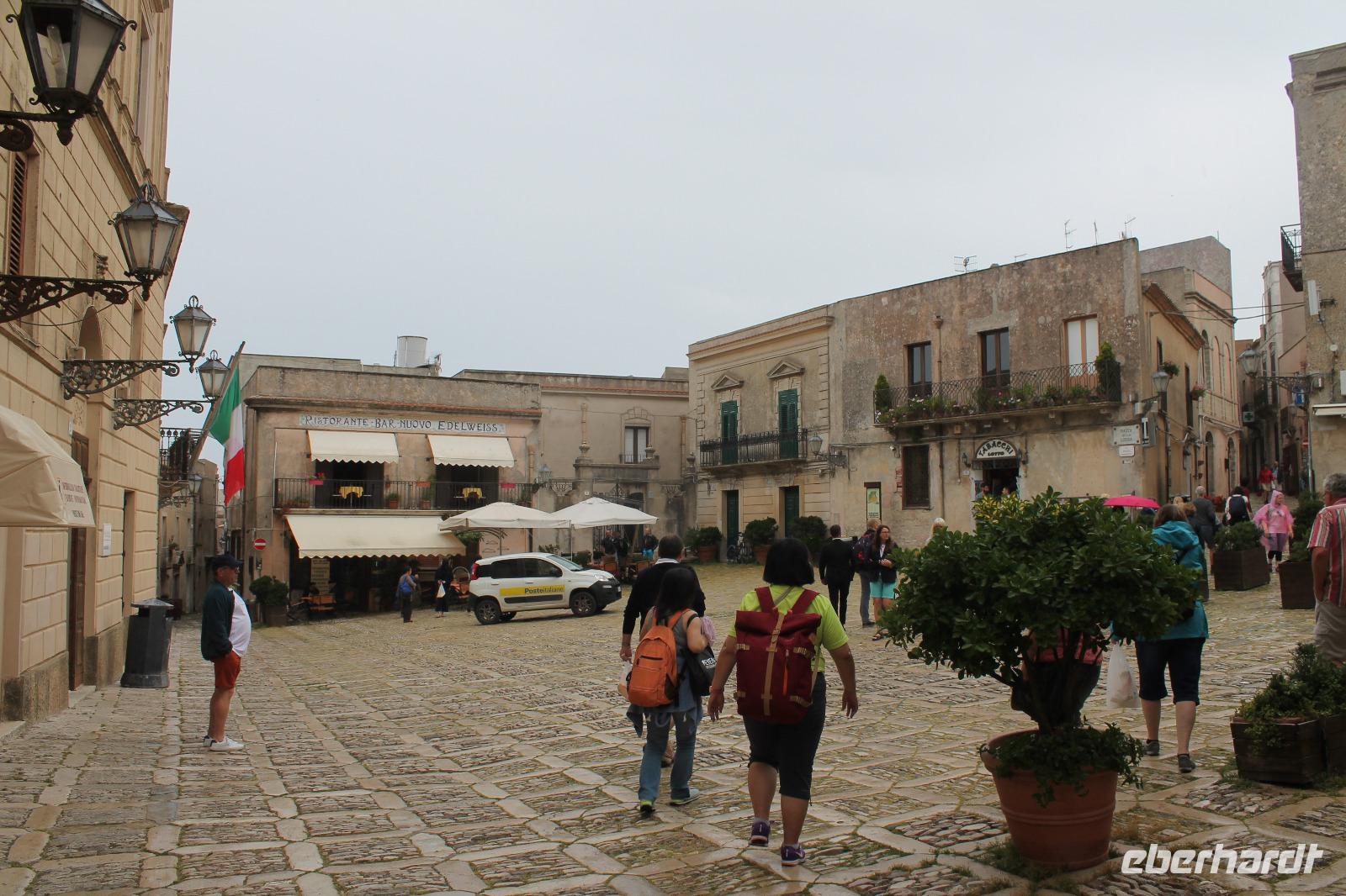 Gegen Mittag fuhren wir weiter nach Marsala, wo wir zum Mittagessen in einem Salzmuseum erwartet wurden. Bald kam der Monte Erice in unser Blickfeld, denn wir fuhren durch flaches Land und konnten bei herrlichem Wetter den 750m hohen Berg super sehen. Wir fuhren immer an der Küste entlang, vorbei an kleinen Fischerboten und ersten. Im Museo del Sale gab es Pasta la Norma, Pesche, Bruschetta und frisches Obst zum Essen. Es schmeckte hervorragend! Anschließend ging die Fahrt weiter nach Erice. Die kleinen Türmchen an der Küste sind Tonora, Tunfischfangstationen, doch heute gibt es kaum noch welche. Unser Weg führte uns durch Valderice, wo heute die meisten Bewohner von Erice hingezogen sind, weil der Weg in das verwinkelte, alte Städtchen zu beschwerlich ist und sich dort oben wenige Möglichkeiten bieten. Doch uns gefiel es ausgezeichnet. Wir genossen den Blick auf Bonagia und die alten Gassen der Weberstadt. Bis zum Piazza Umberto Primo gingen wir gemeinsam, anschließend erkundeten die meisten von uns die Umgebung eigenständig. Wir fuhren wieder in unser Landhaus, um dort die Nacht zu verbringen.