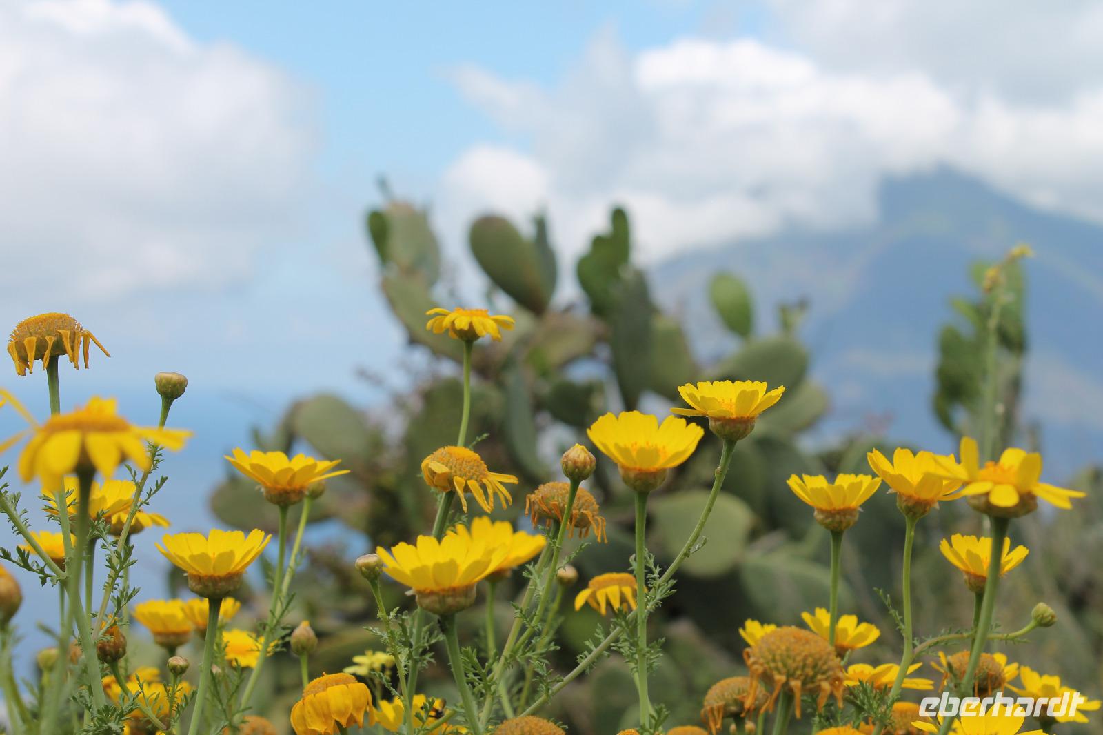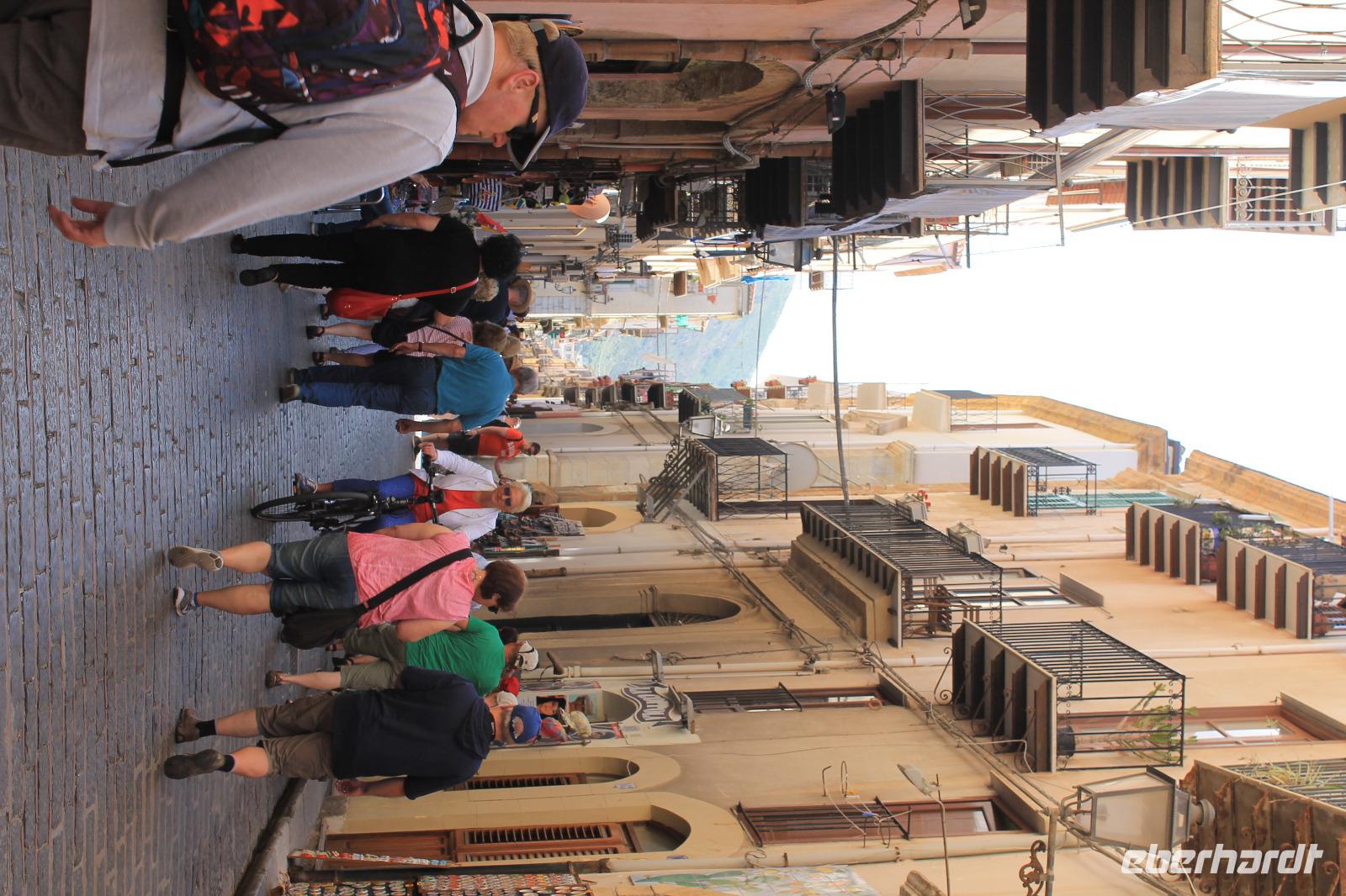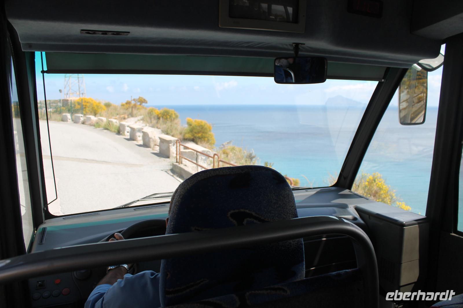 Nach einer kurzen Fahrt durch das beschauliche Hafenstädtchen Milazzo, erreichten wir den Hafen und stiegen in das Linienschiff ein, das uns zuerst nach Lipari brachte. Wir landeten in Marina Porta, wo die Linienschiffe immer halten. Von hier aus spazierten wir zu einem kleinen Bus, der uns um die Insel gefahren hat. Auf Lipari leben ca. 10.000 Einwohner auf einer Fläche von 36km² - damit ist sie die größte der äolischen Inseln. Wir fuhren entlang des alten Bimssteinbruches der stillgelegt ist, seitdem die äolischen Inseln zum UNESCO Weltkulturerbe gehören. Wir sahen unter anderem auch Kapernsträucher. Diese Kapern werden bis zu 100 Jahre alt und sind sehr genügsame Pflanzen. Marcello verkaufte auch direkt ein paar Beutel Kapern an uns. An einem weiteren atemberaubenden Aussichtspunkt, machten wir eine kurze Pause, um den Blick auf die Nachbarinsel Salina und ihre Hauptstadt Santa Maria zu fotografieren. Weiter ging es vorbei an wilden Geranien und blühendem Ginster. Wieder am Hafen angekommen, hatten wir etwas Freizeit um entweder auf den Burgberg - der schon 2000 v. Chr. Das erste Mal besiedelt wurde - zu gehen, oder anders zurück zum Abfahrtsort des Schiffes zu gelangen. Nach einerkurzen Überfahrt erreichten wir die Insel Vulcano und wurden, wie angekündigt, von beißendem Schwefelgeruch begrüßt. Manche von uns bliebenalso in der Hafengegend, während wieder andere auf den Cratare Grande wanderten. So ging auch dieser Tag vorbei und war doch schon sehr anstrengend - denn auch wenig tun kostet Kraft.
