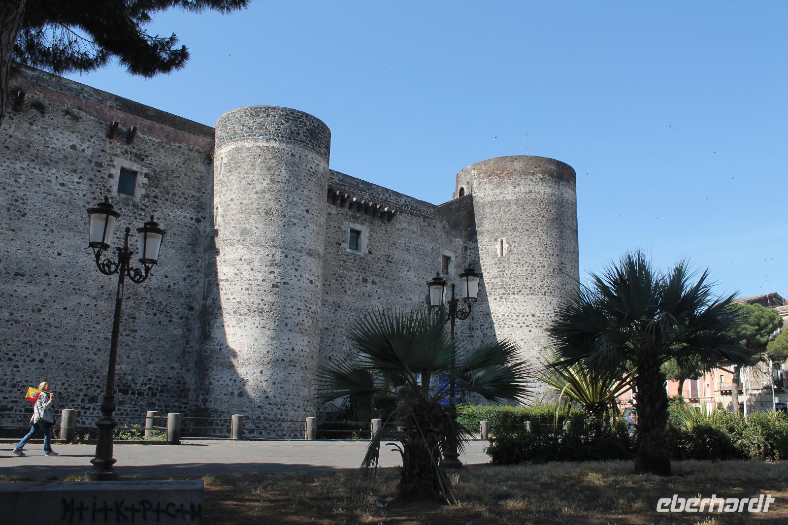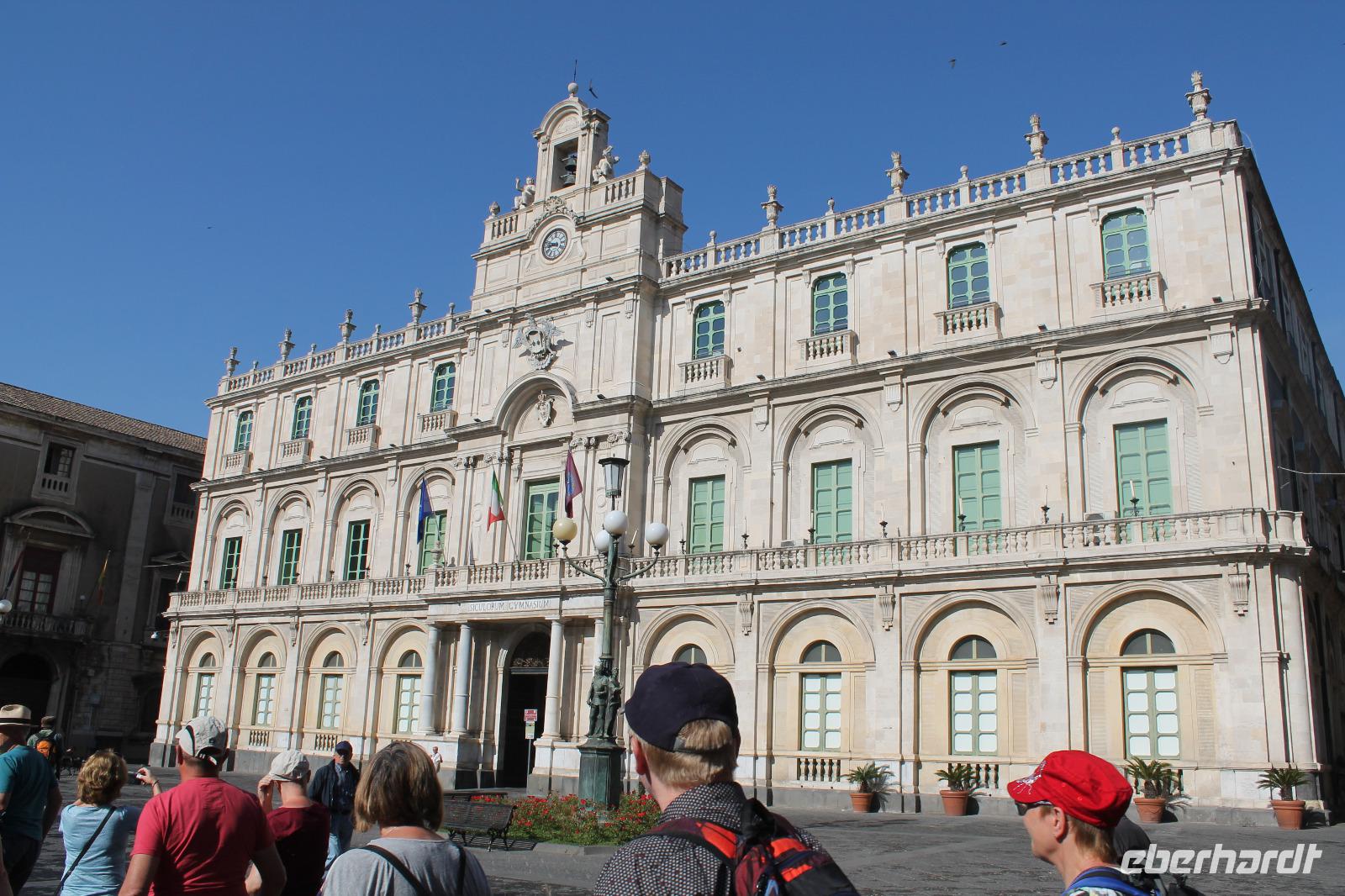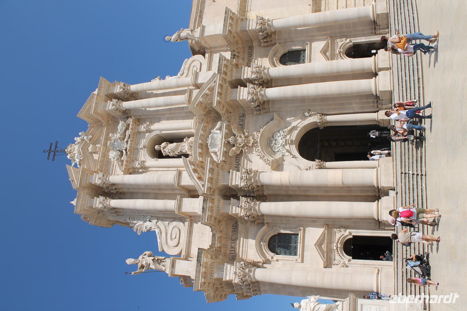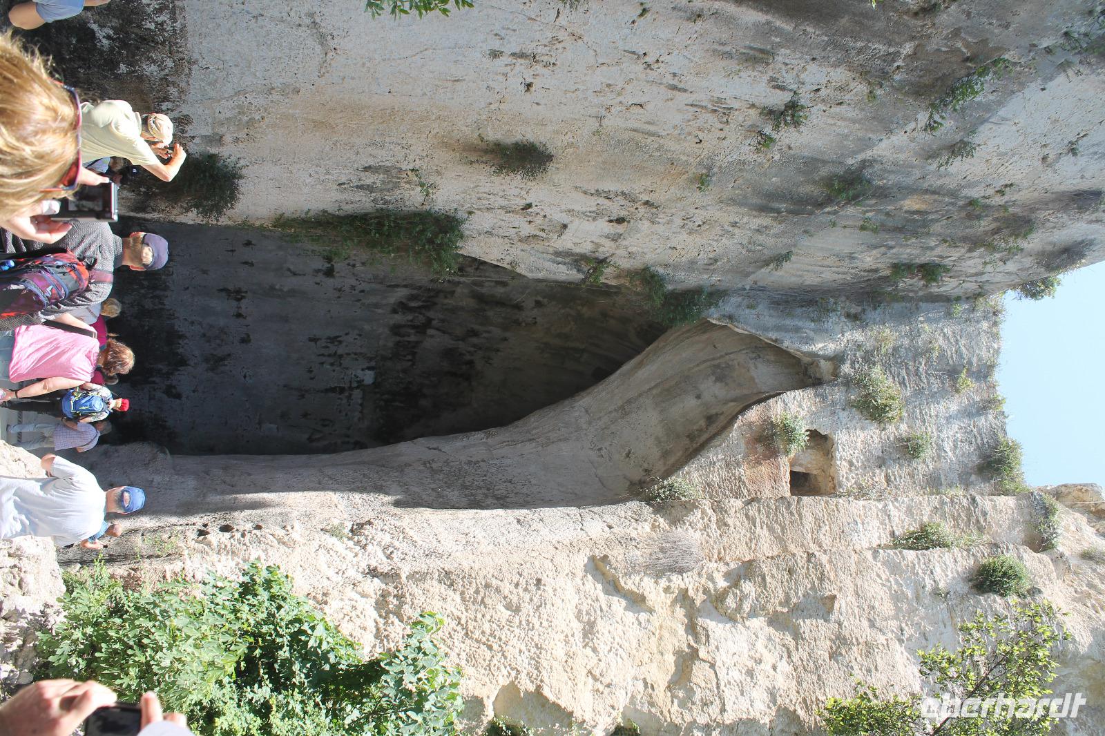 Nachdem sich die ganze Gruppe dazu entschlossen hatte diesen Ausflug mitzumachen, freuten wir uns gemeinsam auf den Tag. Wir lernten Juliane kennen, die uns auf den letzten beiden Ausflügen begleiten sollte. In Catania angekommen, spazierten wir zum Piazza Duomo, dem Domplatz und sahen sofort das Wahrzeichen der Stadt - den Elefantenbrunnen. Wir besichtigten den Dom von innen. Anschließend gingen wir weiter über den berühmten Fischmarkt bis zur Burg. Wir erfuhren allerhand über die Geschichte Siziliens oder auch den Schmelztiegel der Völker und Kulturen. Unteranderem auch, dass die Stadt Syrakus damals selbst dem Einmarsch der Römer standhielt. Normannen, Araber, auch Franzosen regierten die Insel, bis sie nach dem zweiten Weltkrieg eine unabhängige Region wurde und auch ein eigenes Parlament bekam. Syrakus, eher Ortigia, ist berühmt für die Süßwasserquelle, in der Papyrus wächst. Doch auch ein sehr berühmter Mann stammt aus dieser Stadt - Archimedes. Von ihm sahen wir bei einem Spaziergang durch die Stadt eine Statue und erfuhren mehr über sein Ableben. In Ortigia befindet sich auch der am besten erhaltene Altar Siziliens. Unsere Reise führte uns weiter zu den archäologischen Gärten, wo wir das Theater des Dionysos sowie „das Ohr" des selbigen betrachteten. Das Theater wurde in einen Hang aus Felsen hineingeschlagen und wurde, nachdem es keinem musikalischen Zweck mehr dienen sollte, von den Spaniern zu einer Mühle umfunktioniert. Im Latomine del Inferno, gingen wir in das Ohr des Dionysos. Caravagio benannte die Höhle so, da Sie wie ein Ohr geformt ist und eine hervorragende Akustik hat. In der Grotta di Cordari, arbeiteten früher die Seilmacher. Sie machten sich die feuchte Luft der Grotte zunutze, da die Feuchtigkeit die Arbeit erleichterte. Mit vielen fantastischen Eindrücken neigte sich dieser Tag dem Ende zu.