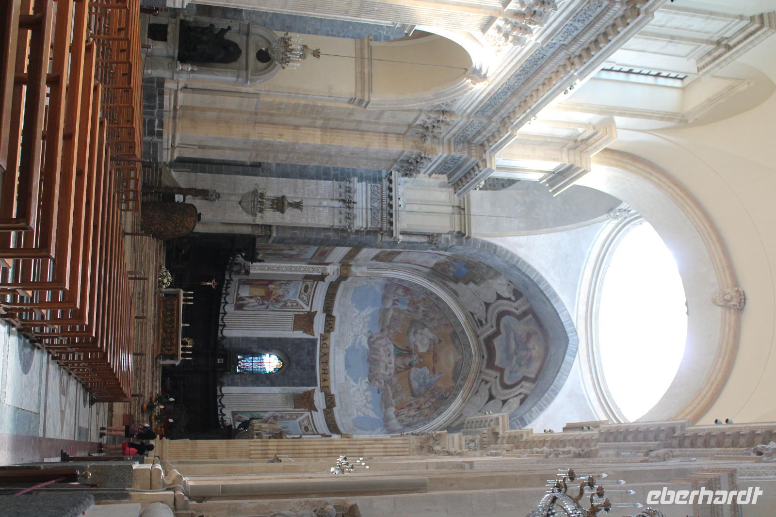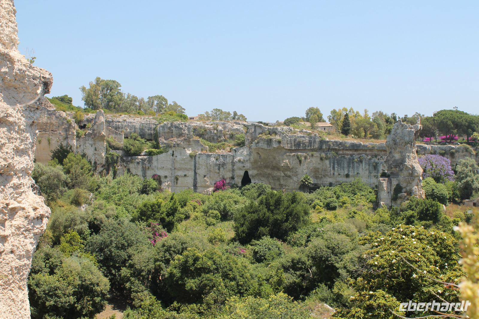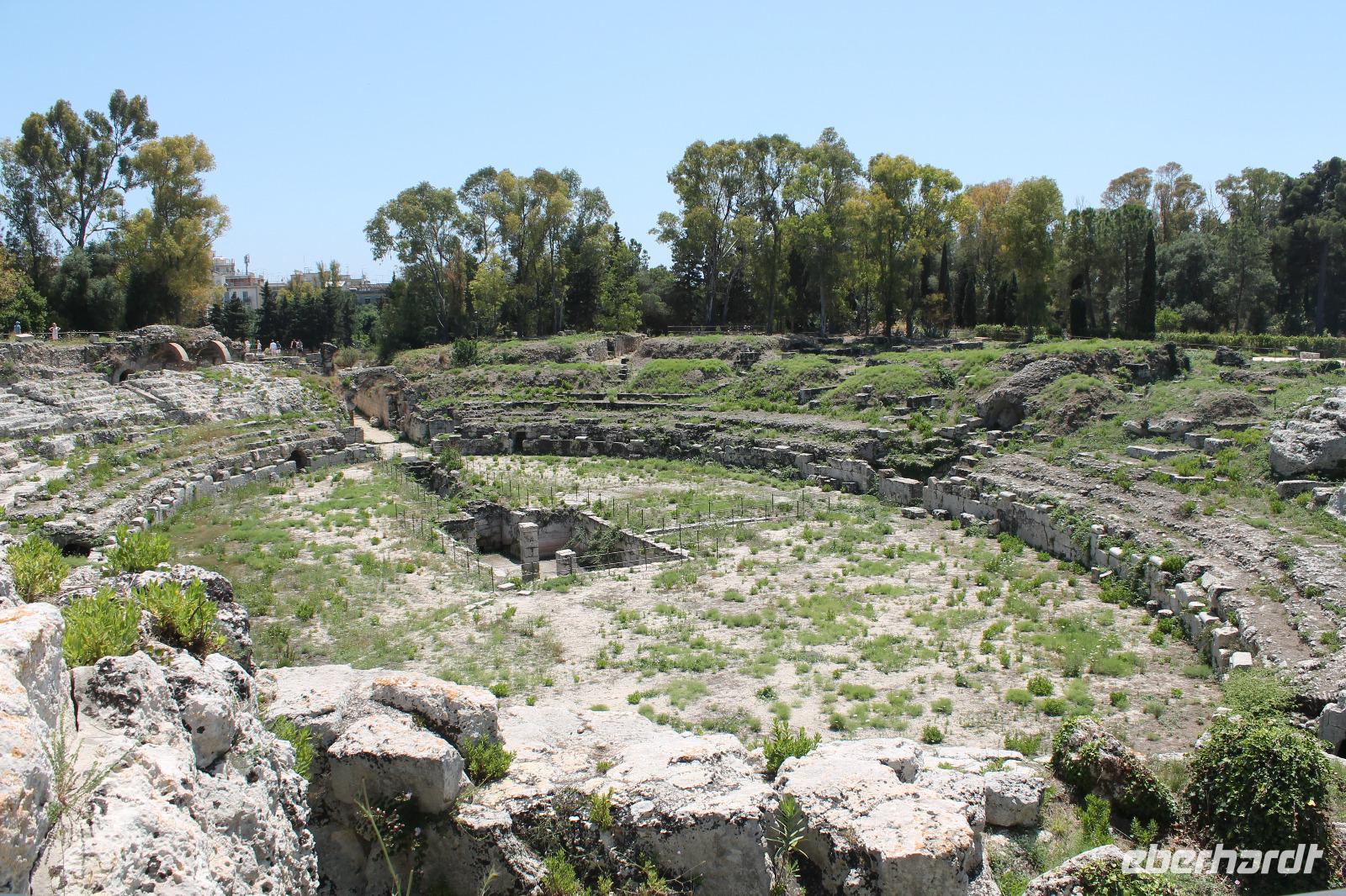 Nachdem sich die ganze Gruppe dazu entschlossen hatte diesen Ausflug mitzumachen, freuten wir uns gemeinsam auf den Tag. Wir lernten Juliane kennen, die uns auf den letzten beiden Ausflügen begleiten sollte. In Catania angekommen, spazierten wir zum Piazza Duomo, dem Domplatz und sahen sofort das Wahrzeichen der Stadt - den Elefantenbrunnen. Wir besichtigten den Dom von innen. Anschließend gingen wir weiter über den berühmten Fischmarkt bis zur Burg. Wir erfuhren allerhand über die Geschichte Siziliens oder auch den Schmelztiegel der Völker und Kulturen. Unteranderem auch, dass die Stadt Syrakus damals selbst dem Einmarsch der Römer standhielt. Normannen, Araber, auch Franzosen regierten die Insel, bis sie nach dem zweiten Weltkrieg eine unabhängige Region wurde und auch ein eigenes Parlament bekam. Syrakus, eher Ortigia, ist berühmt für die Süßwasserquelle, in der Papyrus wächst. Doch auch ein sehr berühmter Mann stammt aus dieser Stadt - Archimedes. Von ihm sahen wir bei einem Spaziergang durch die Stadt eine Statue und erfuhren mehr über sein Ableben. In Ortigia befindet sich auch der am besten erhaltene Altar Siziliens. Unsere Reise führte uns weiter zu den archäologischen Gärten, wo wir das Theater des Dionysos sowie „das Ohr" des selbigen betrachteten. Das Theater wurde in einen Hang aus Felsen hineingeschlagen und wurde, nachdem es keinem musikalischen Zweck mehr dienen sollte, von den Spaniern zu einer Mühle umfunktioniert. Im Latomine del Inferno, gingen wir in das Ohr des Dionysos. Caravagio benannte die Höhle so, da Sie wie ein Ohr geformt ist und eine hervorragende Akustik hat. In der Grotta di Cordari, arbeiteten früher die Seilmacher. Sie machten sich die feuchte Luft der Grotte zunutze, da die Feuchtigkeit die Arbeit erleichterte. Mit vielen fantastischen Eindrücken neigte sich dieser Tag dem Ende zu.