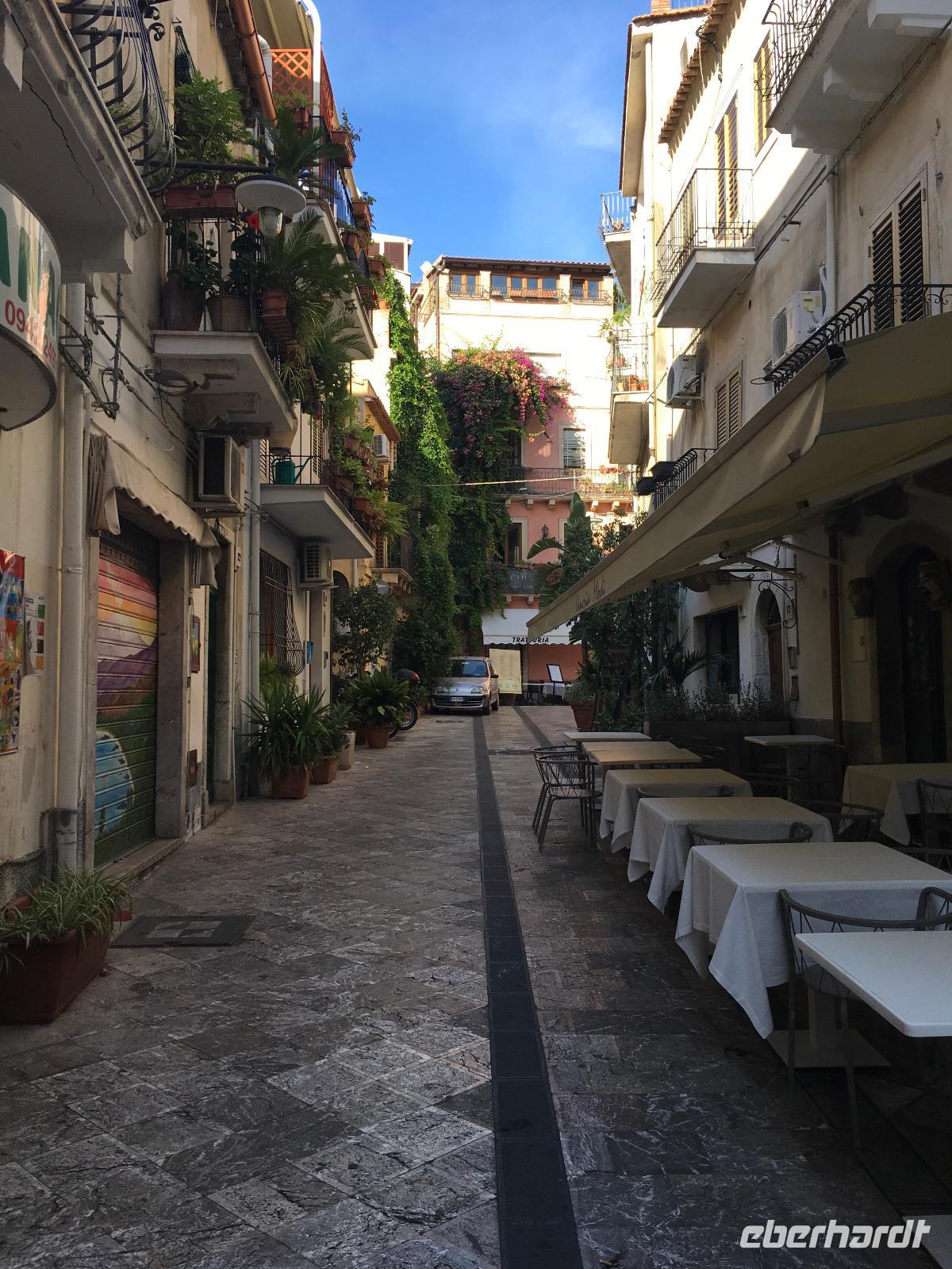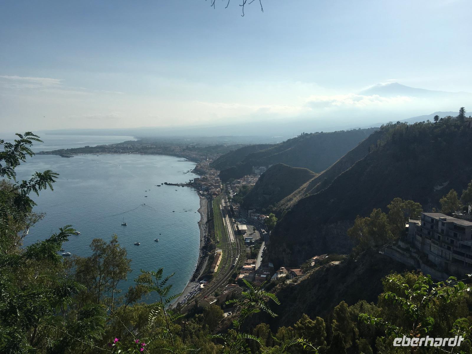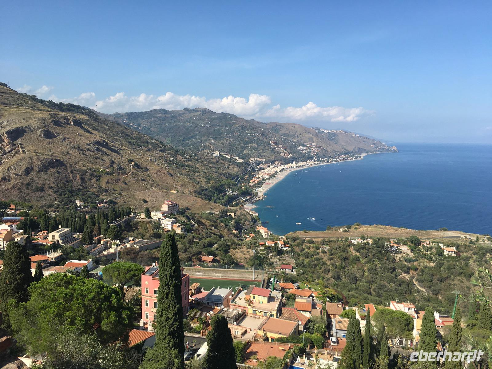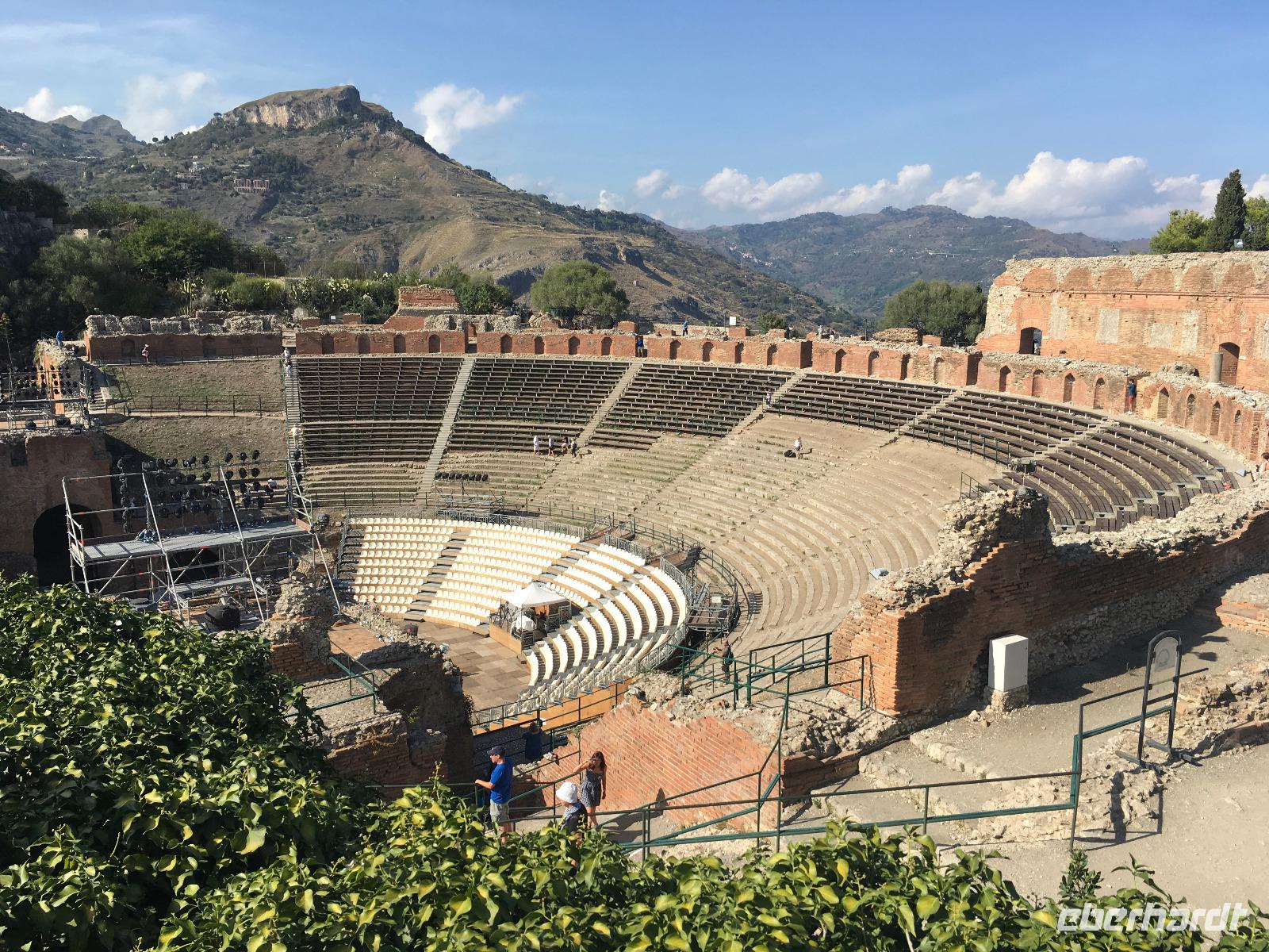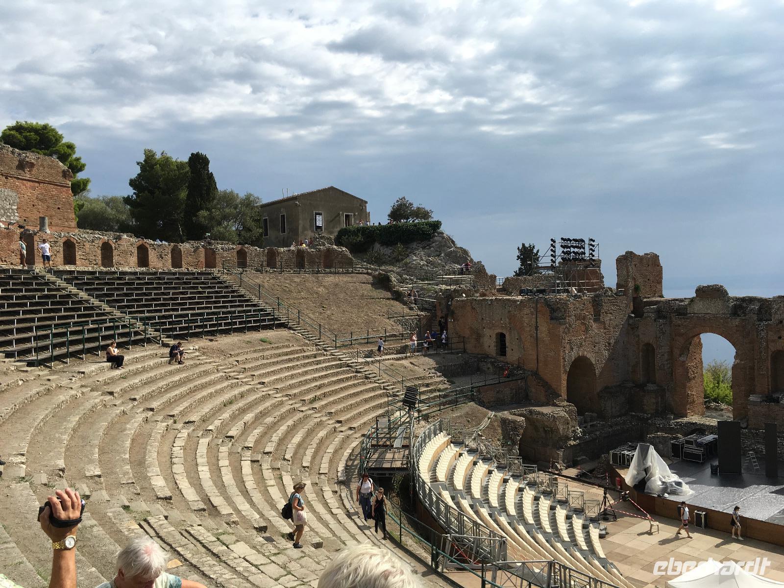 Nach einer Mittagspause treffen wir uns alle wieder am Bus und weiter geht es nach Taormina, die wohl schönste Stadt die Insel, wie es im Reiseführer immer wieder heißt. Mit den öffentlichen Bussen fahren wir in die Oberstadt und spazieren durch die sehr überfüllten Straßen. Das griechisch-römische Theater lassen wir uns natürlich nicht entgehen und sind fasziniert von der wundervollen Aussicht auf das Meer, die umliegenden Dörfer und den Ätna im Hintergrund, welcher leider fast in den Wolken verschwunden ist. Bei einem Kaffee, eine Eis oder einfach einem Bummel durch die Straßen lassen wir das Leben von Taormina auf uns einwirken, bevor wir am Abend zurück ins Hotel fahren und unsere Koffer für die Weiterfahrt am nächsten Tag schon packen müssen.