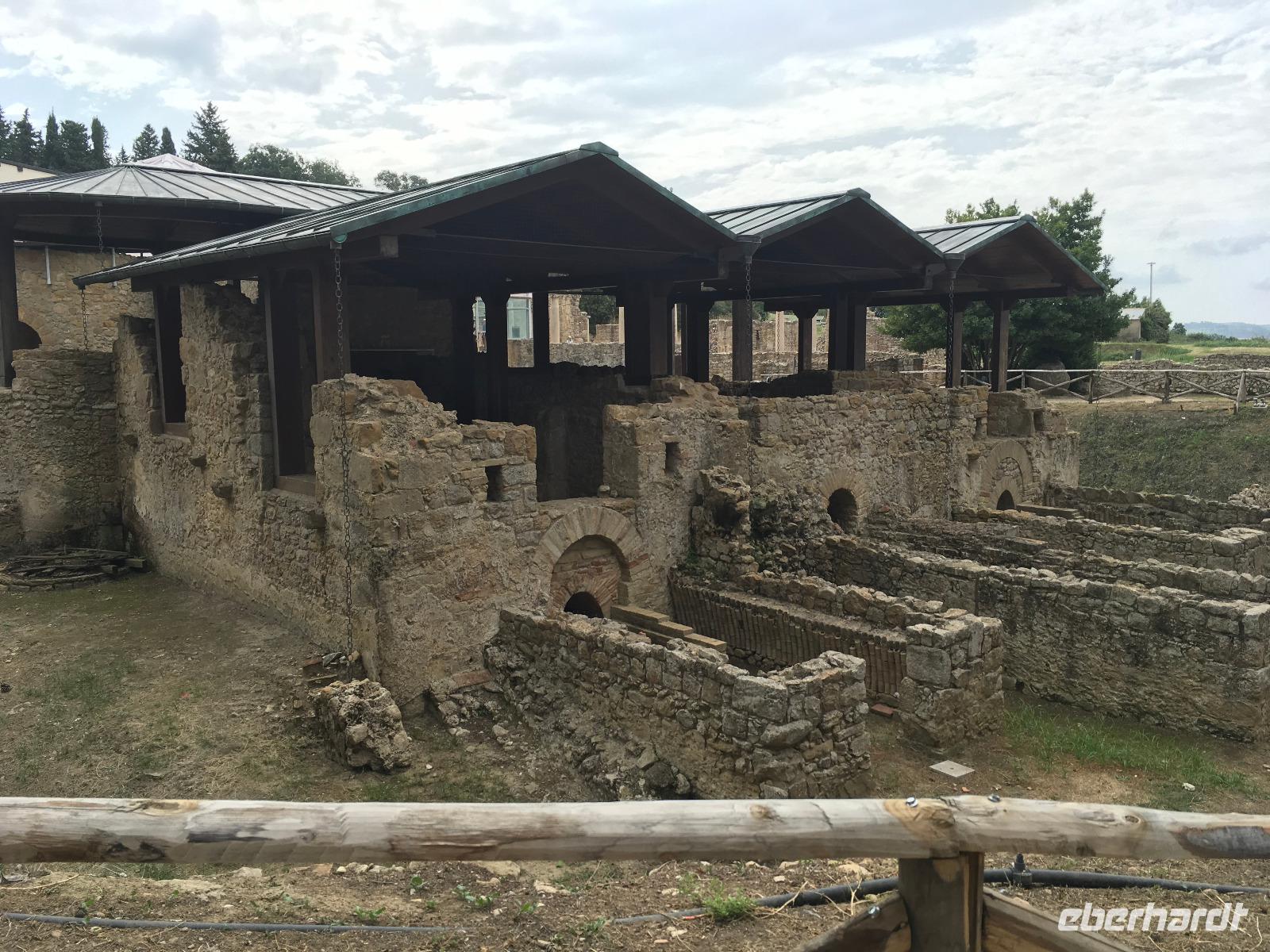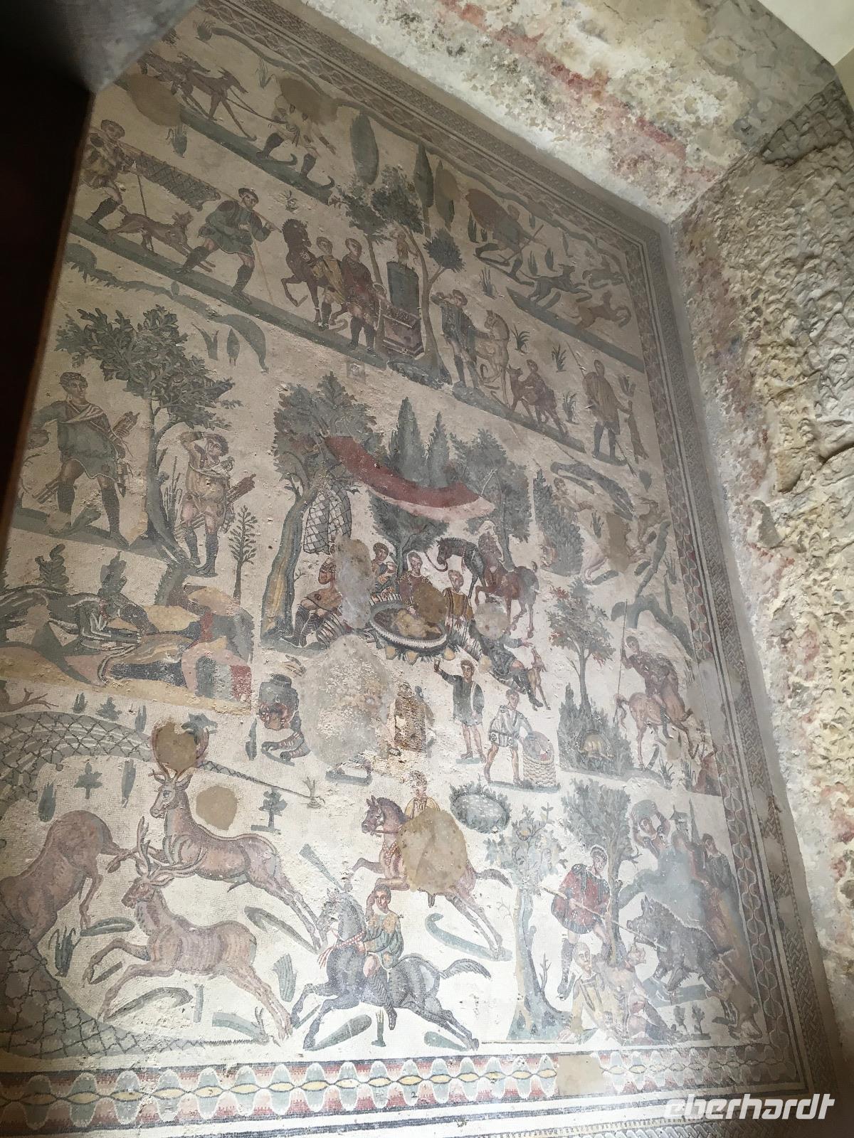 Mit gepackten Koffern verlassen wir heute vorerst unser Hotel im Osten der Insel von Sizilien und fahren in Richtung Süden. Nach circa 2,5 Stunde erreichen wir unseren ersten Tagesstopp, die Villa Romana in Piazza Armerina. Vom Parkplatz aus laufen wir den Berg zu dem Eingang hoch und Christina zeigt uns die Bäder und Wellness Anlage der römischen Herren. Auch wenn es heute nicht genau bewiesen ist, welcher Kaiser in dieser Villa gelebt hat, sind wir fasziniert von den wunderschönen Mosaikfußböden auf einer Fläche von fast 3.500 qm². Die verschiedensten Tierköpfe, die Szenen der Jagt, einfache Muster, die Bikini Mädchen beim Sport und das Kinderzimmer sind nur einige schöne Bilder.
