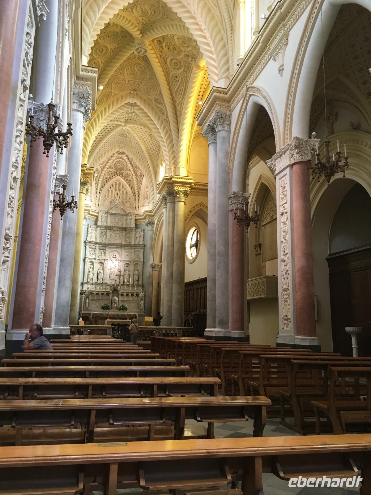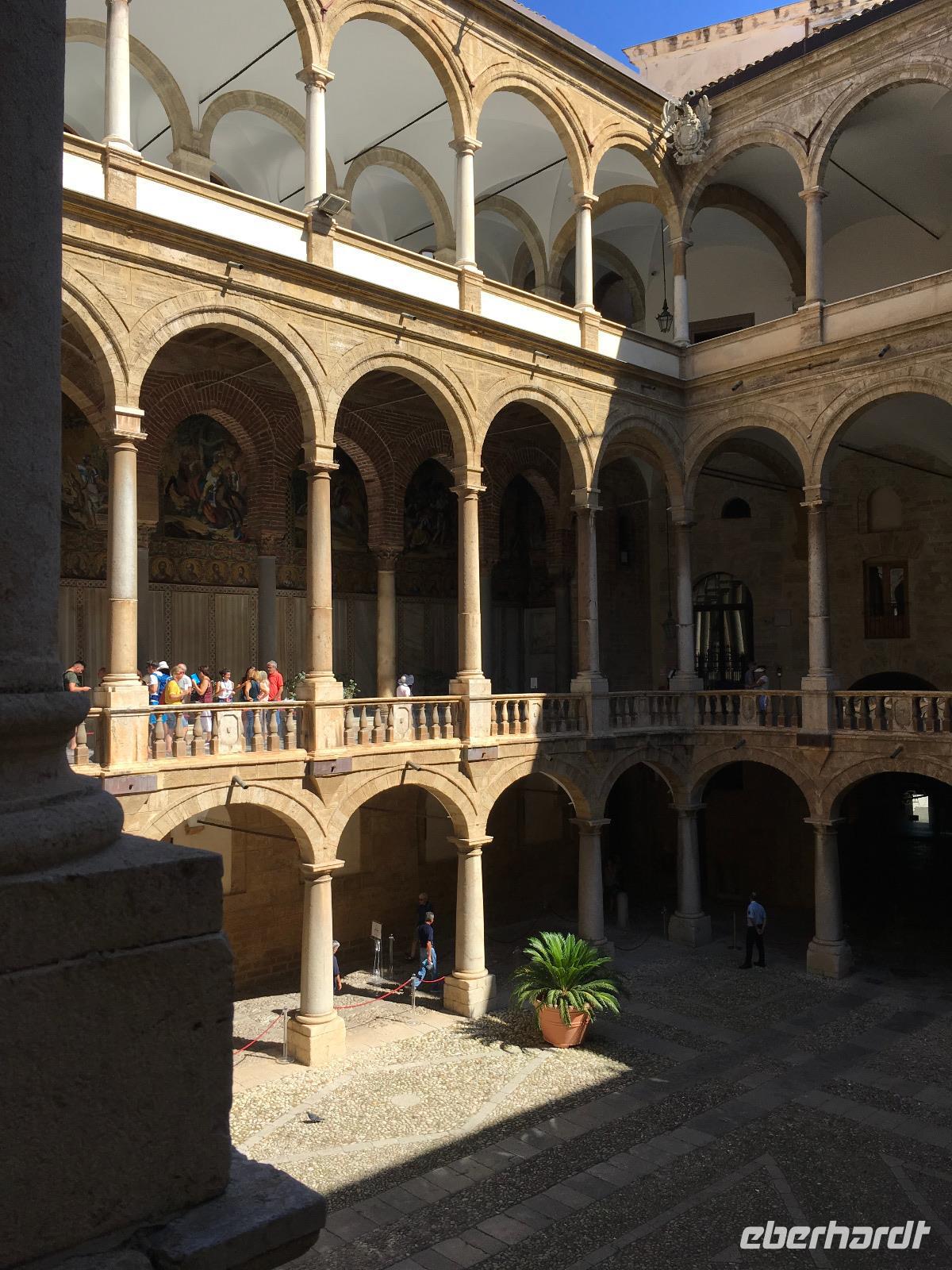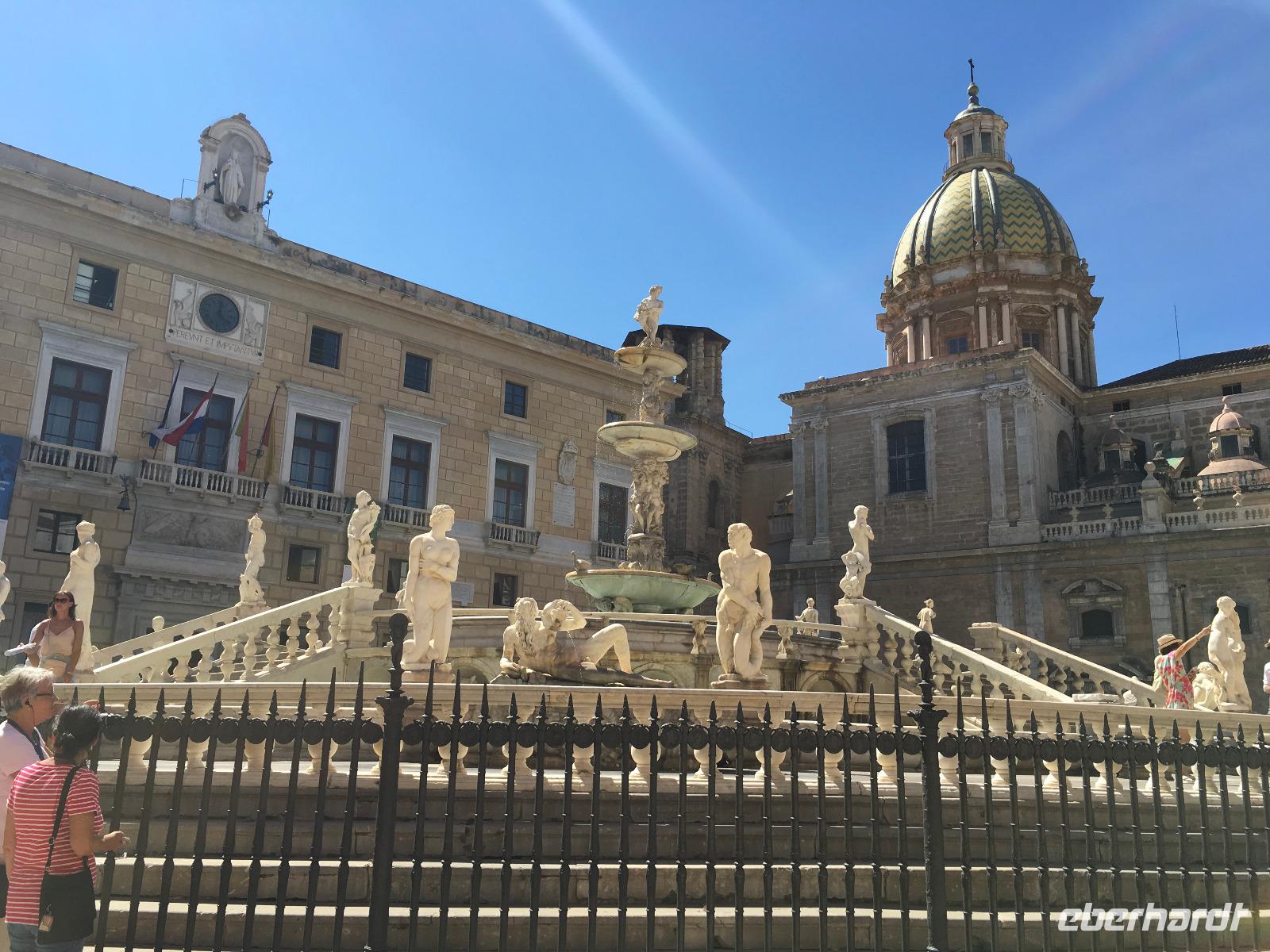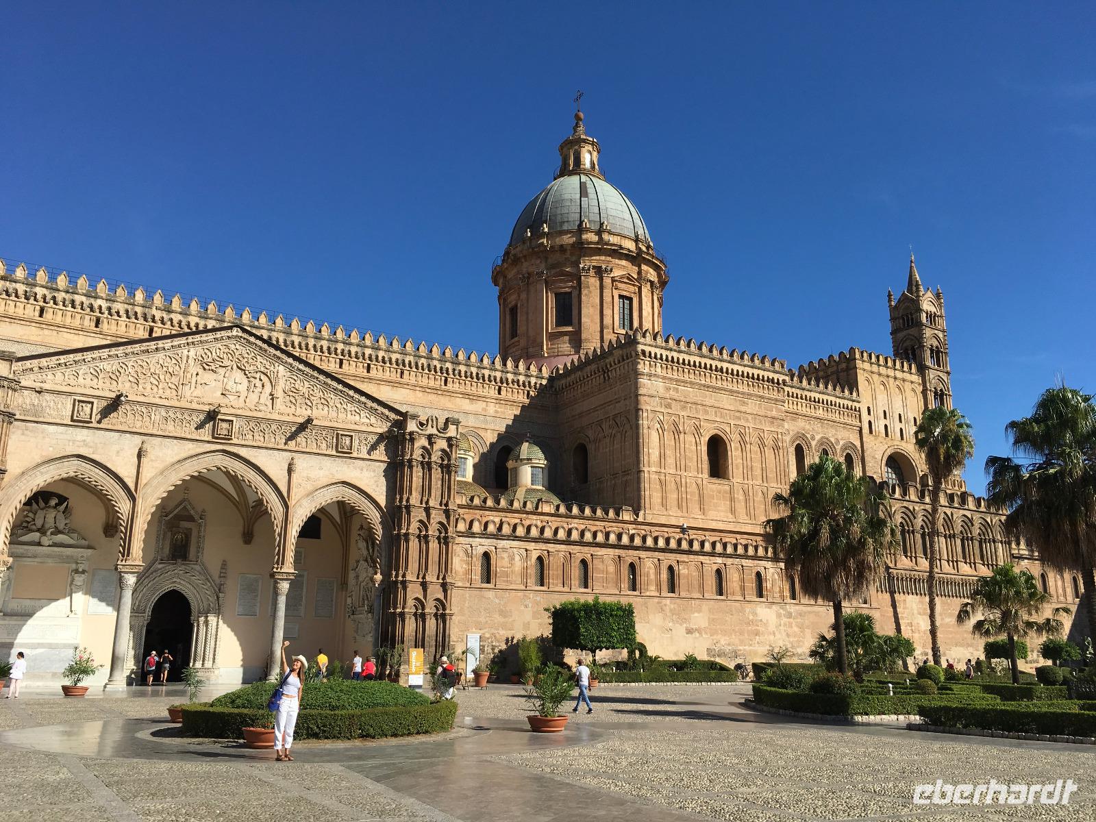 Mit gepackten Koffern verlassen wir heute früh den Agriturismo im Süd-Westen der Insel und begeben uns auf die Reise in den Nord-Osten, nach Milazzo. Am Vormittag erreichen wir die Hauptstadt der Insel, die Stadt der Maffia - Palermo. Bei einer kleinen Rundfahrt durch die Außenbezirke und die Neustadt erhalten wir einen ersten Eindruck. In der Nähe der Kathedrale verlassen wir den Bus und starten mit unserer Besichtigung. Aus dem 12. Jahrhundert präsentiert sich die normannisch-arabische Kathedrale prachtvoll und beeindruckend mit der aufgesetzten Kuppel, damit sie die höchste Kirche im Bezirk ist. Im Normannenpalast besichtigen wir die Cappella Palatina, wieder eine Kirche im arabischen Stil mit den goldenen Abbildungen im Dach und an den Seiten, welche die Geschichten der Bibel darstellt. Weiter geht unser Rundgang nun durch die Altstadt über die Via Vittorio Emanuele, zum Schambrunnen an der Piazza Pretoria und zu den Quattro Canti, mit den Brunnen der 4 Jahreszeiten, der 4 Schutzheiligen, der 4 Herrschern und der 4 Geboten. Wir enden an dem Teatro Massimo und können noch eine tolle Freizeit in der Stadt Palermo verbringen, bevor es weiter nach Cefalu geht.