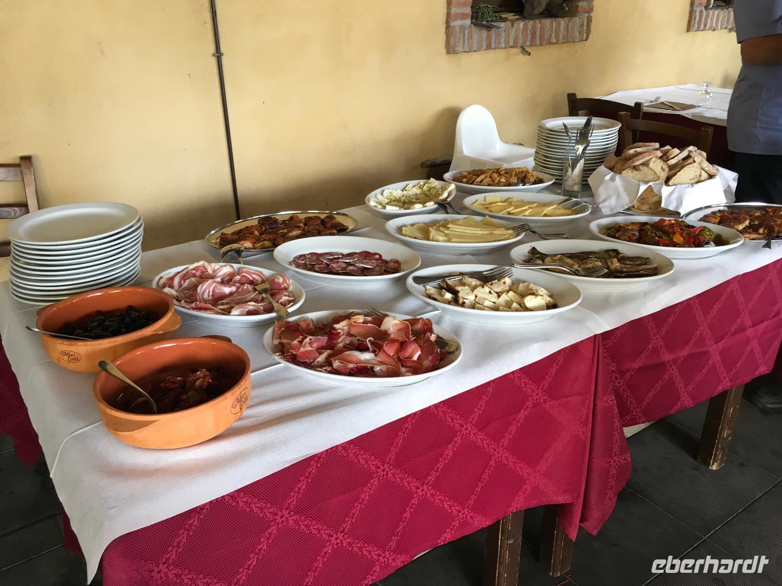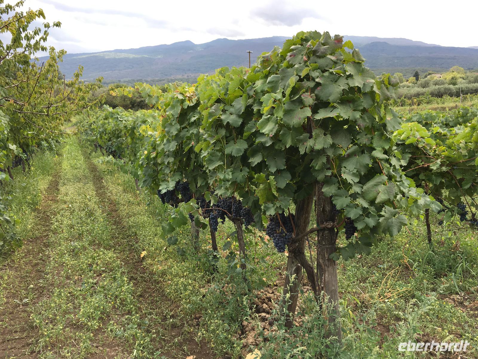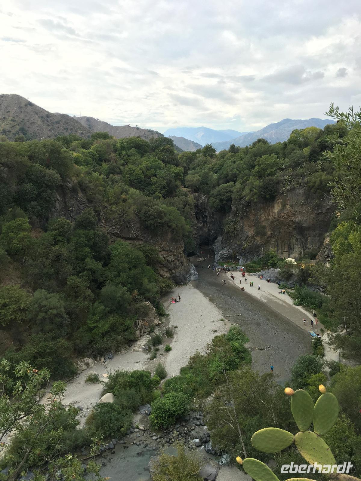 Als nächstes werden wir im Agriturismo zu einem Mittagsimbiss erwartet. Schinken, Salami, verschiedene Sorten von Käse, Gemüse, Brot und vielen weiteren Antipasta werden uns gereicht. Der Gutsherr zeigt uns im Anschluss noch seine Felder vom Weinanbau, wo wir die frischen Trauben direkt probieren dürfen, seine Weinpresse, die Pferde des Hofes und natürlich die Käseherstellung. Gut gesättigt geht unsere Fahrt weiter durch das Gebirge auf der Ostseite von Sizilien. Bei einem Halt können wir noch einen Blick in die Alcantara Schlucht werfen, bevor wir das Hotel erreichen und uns von Christiane und Rosario verabschieden müssen.