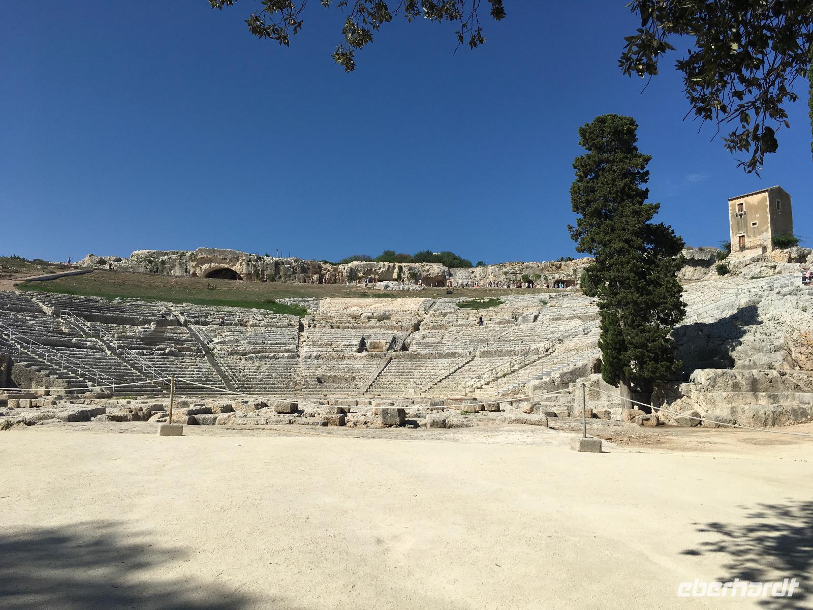Weiter geht die Fahrt nach Syrakus, der Stadt der alten Griechen. Unser Bus lässt uns am Parkplatz raus und zu Fuß geht es über die Brücke auf die Insel Ortigia. Der Apollo Tempel, der Dom von Syrakus, welcher aus einem ursprünglichen Tempel der alten Griechen entstanden ist, die Fonte Aretusa - die Süßwasserquelle- und der Hafen mit den prachtvollen Yachten sind einige Sehenswürdigkeiten der einst so wichtigen Stadt. Nach einer Mittagpause fahren wir noch weiter und besuchen die Archäologische Zone. Ein schattenspendender Park im alten Steinbruch und das Ohr des Dionysos gehörten hier dazu. In der Höhle hat man eine wunderbare Akustik, die wir bei einem Liedchen gleich mal testen. Im Anschluss besuchen wir noch das griechische Theater und können sehen, wie es in einem Steinblock gehauen wurde. Nun geht die Fahrt leider schon wieder zurück nach Giardini Naxos und auch dieser Tag neigt sich langsam dem Ende zu.