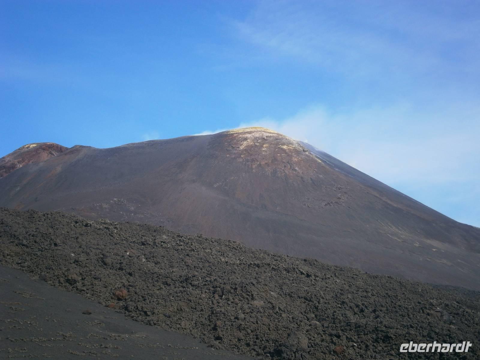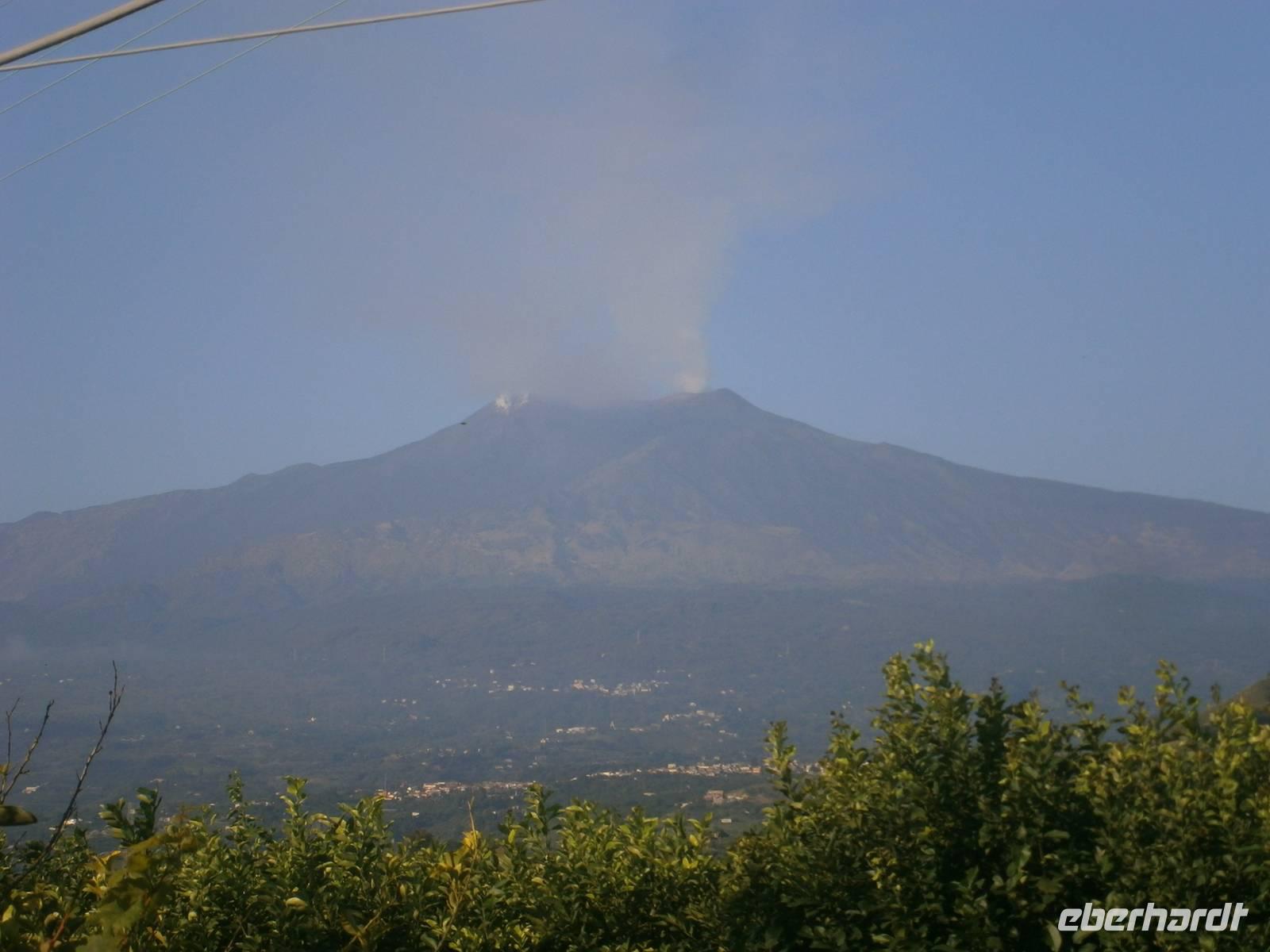 Der erste Tag unseres Aufenthaltes auf Sizilien führt uns am Morgen zum Ätna. Stolz und mächtig überragt der Ätna die Ostküste Siziliens, der größte Vulkan Europas und doch kann man nicht darüber hinweg sehen das in seinem Inneren eine glühende Hitze herrscht, von über 1000 Grad Celsius. Wir durchfahren die verschiedenen Vegetationsgürtel und erreichen die Talstation der Seilbahn. Gemeinsam fahren wir mit der Kabinenbahn bis zur Mittelstation um dann in die geländegängigen Jeeps umzusteigen. Sie bringen uns weiter auf eine Höhe von ca. 2900 m. Gemeinsam mit einem Bergführer „wandern" dann die Besucher auf dem Gebiet am Ätna. Während unseres Aufenthaltes haben wir auch Glück mit dem Wetter - man könnte schon sagen wir haben „Kaiserwetter". Für den Rückweg haben wir eine andere Route gewählt, sie führt uns durch das Gebiet das beim letzten massiven Ausbruch zerstört worden ist. Damals wälzte sich der Lavastrom bis kurz vor die kleine Stadt Nikolosi. Noch heute kann man eindrucksvoll nachvollziehen wie sich die Naturgewalten ihren Weg gesucht haben.
