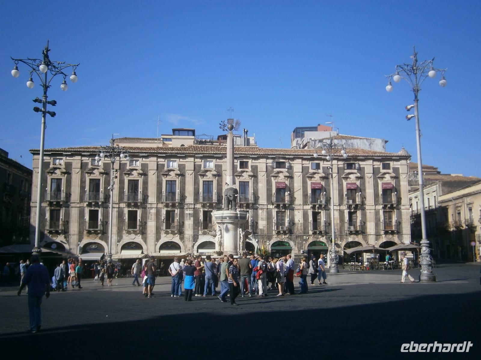 Nach dem Frühstück fahren wir in Richtung Catania. Auf der Höhe Von Giadini Naxos bietet sich für uns eine gute Gelegenheit für den Fotostop. Der Ätna präsentiert sich in voller Schönheit. An der Mautstelle treffen wir wieder Pia und fahren mit ihr gemeinsam in die Barockstadt Catania. Hier angekommen unternehmen wir einen Rundgang durch die Stadt, die seit 2002 auf der UNESCO Weltkulturerbeliste steht. Die Stadt ist die zweitgrößte der Insel. Sie wurde immer wieder von Erdbeben und Ausbrüchen des Ätna gezeichnet und zerstört und wurde immer wieder neu aufgebaut.