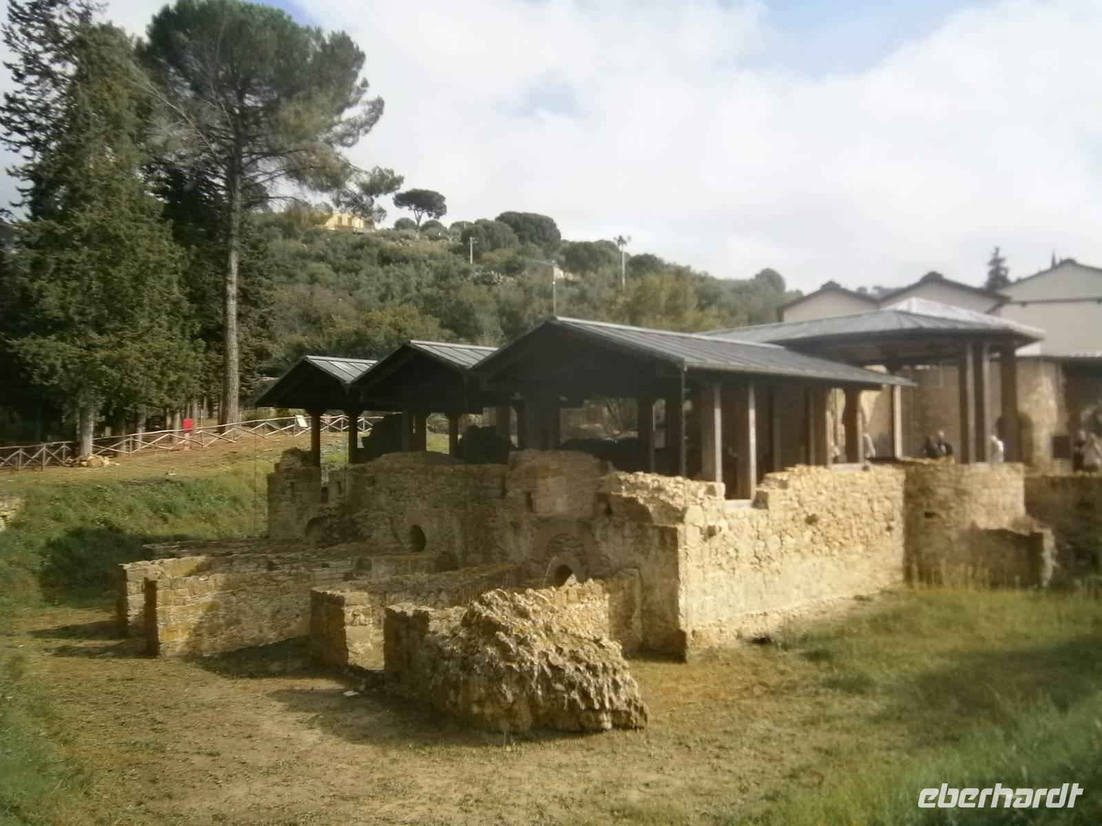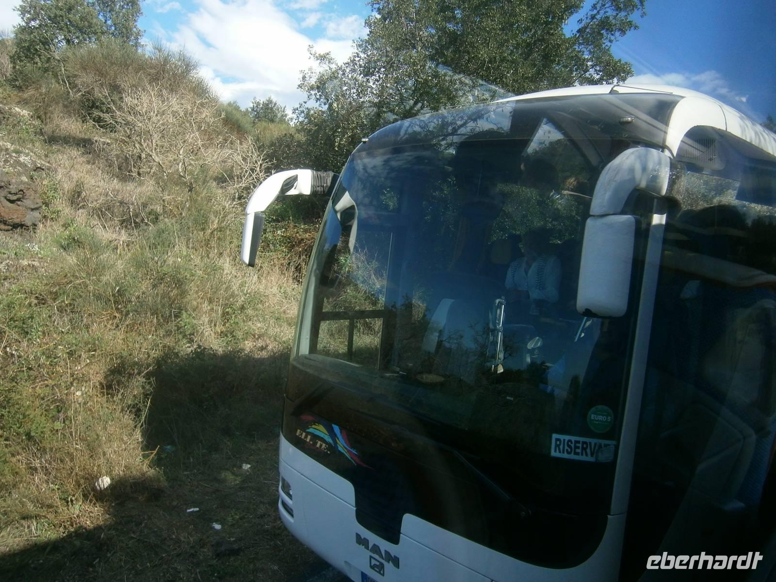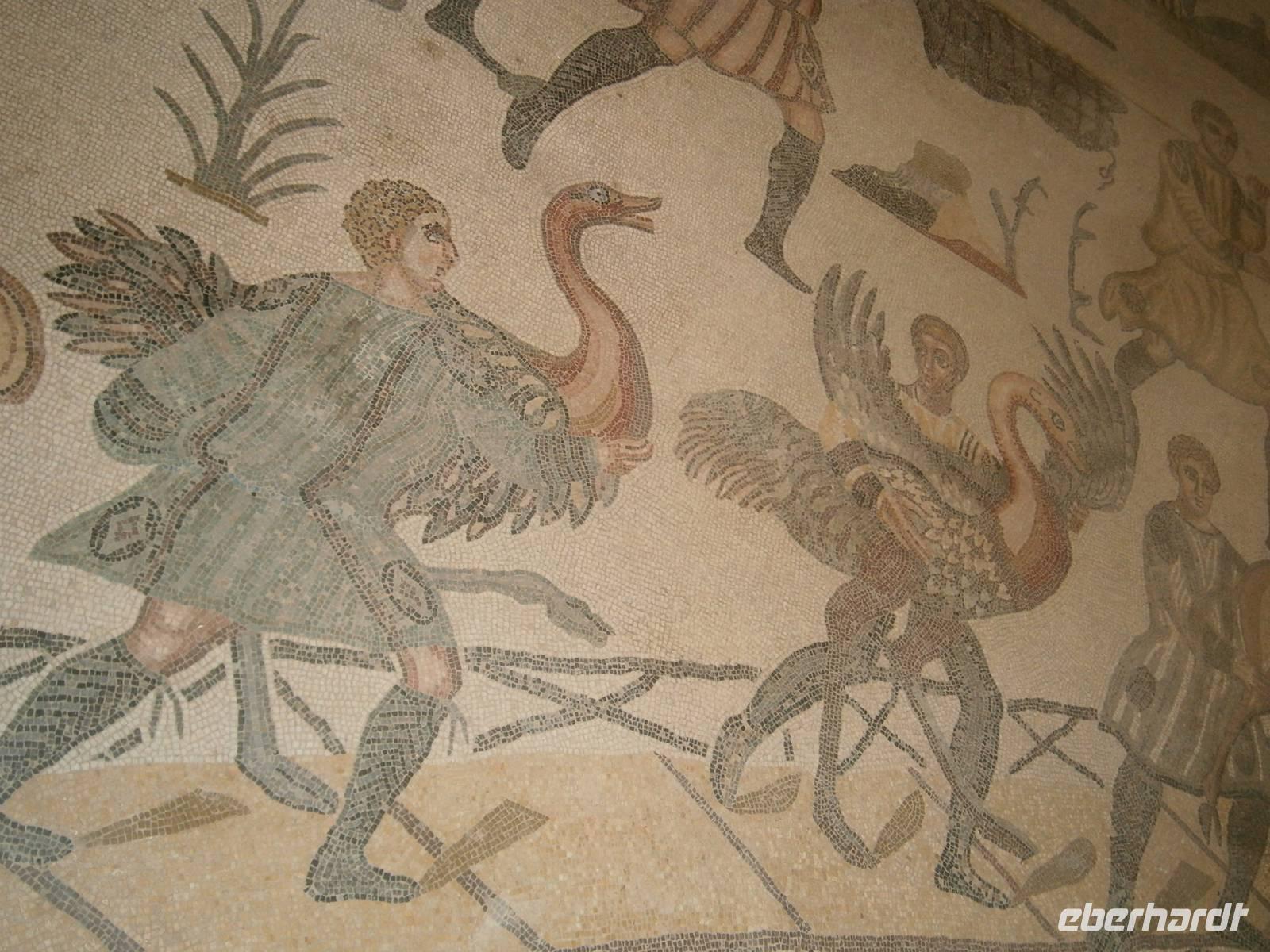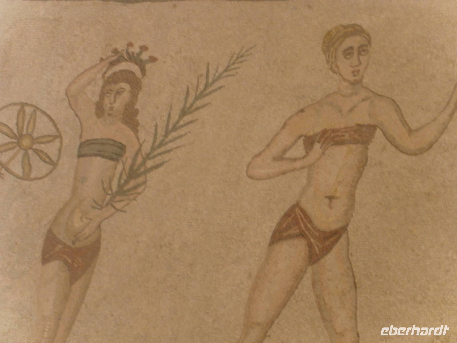 Der Kofferservice vom Hotel funktioniert hervorragend. Pünktlich um 08.00 Uhr wird das Gepäck an unseren Bus gebracht und unserer Reise steht fast nichts mehr im Wege. Fast - ein italienischer Busfahrer hatte am Vorabend eine kleine Kollision mit unserem Spiegel - vom Fahrer ist weit und breit nichts zu sehen. Von der Küste nehmen wir heute Abschied und fahren in das Landesinnere. Gut zwei Stunden Fahrzeit liegen vor uns. Das erste Etappenziel ist Villa Casale in der Nähe von Piazza Armerina. Die Villa steht auf der UNESCO Weltkulturerbeliste. Durch einen Erdrutsch und Ablagerungen verschüttet wurde sie 1761 wieder entdeckt und Mitte des 20. Jahrhunderts freigelegt. Der Gebäudekomplex bedeckt ca. 1,5 Hektar und erhalten sind noch etwa 45 Räume. Die Fußbodenmosaiken gehören zu den größten und schönsten die aus der Antike überliefert sind. Die Künstlerischen Motive und Techniken verraten den Einfluss nordafrikanischer Künstler. Um 1 qm Mosaik herzustellen benötigten die Künstler etwa 6 - 8 Tage. Maria, unsere Gästeführein, erwartet uns am Eingang und führt uns durch die Ausgrabungsstätte. Wir bewundern die „Jagdszenen" und die „Bikinimädchen". In den vergangen Jahren wurden umfangreiche Erhaltungsmaßnahmen durchgeführt. Jetzt präsentiert sich dem Besucher alles neu und doch ist noch nicht alles erschlossen - also ein guter Grund wieder zu kommen.