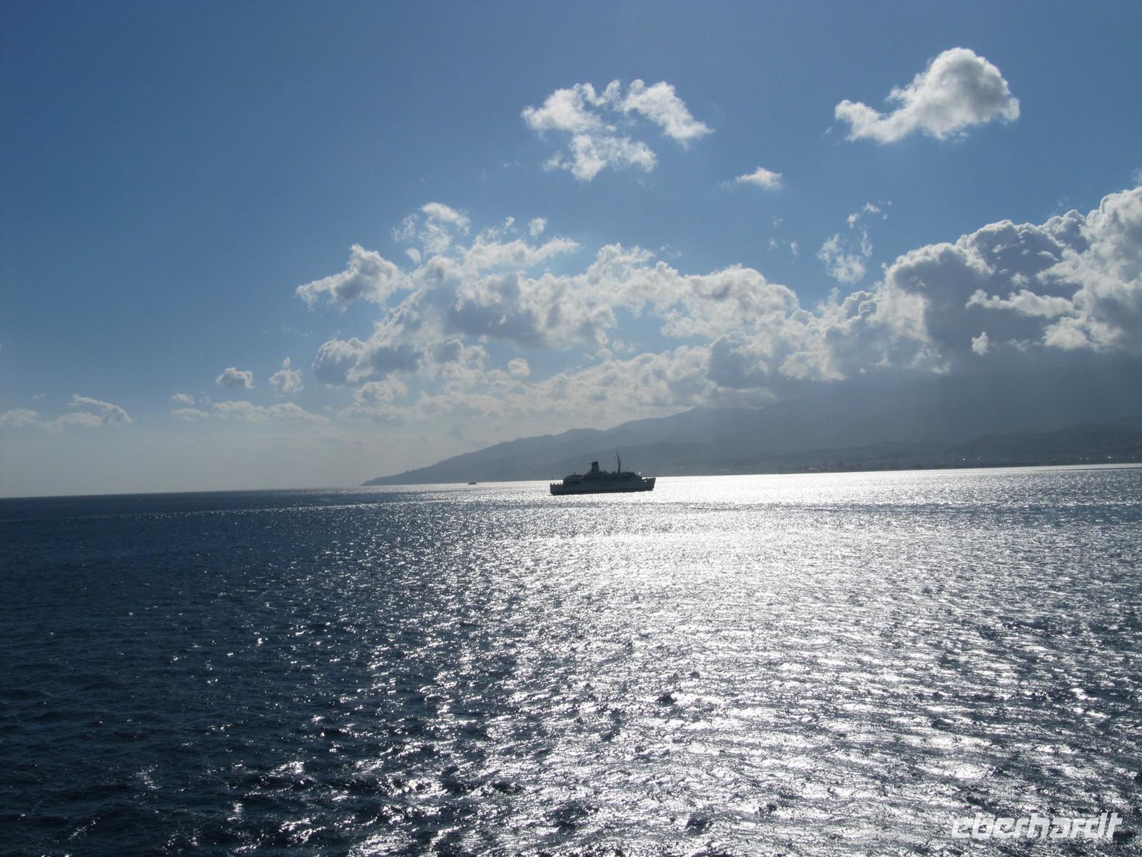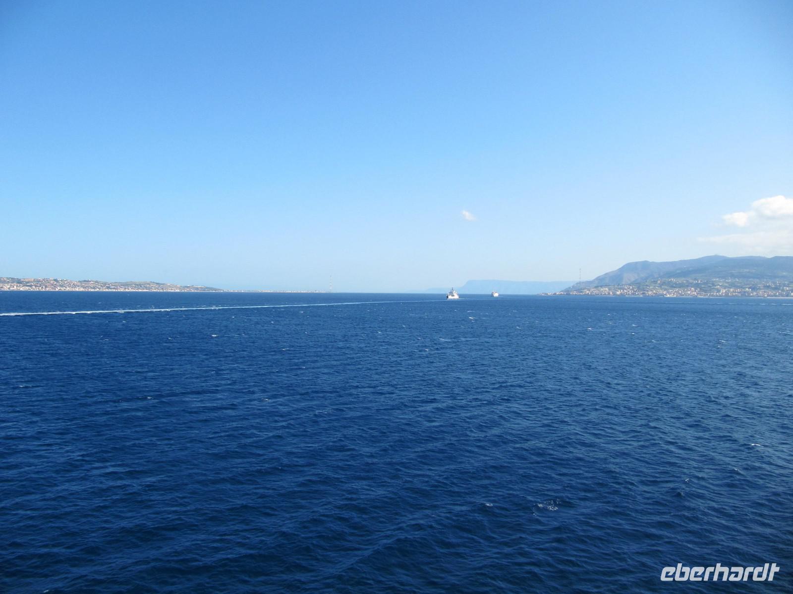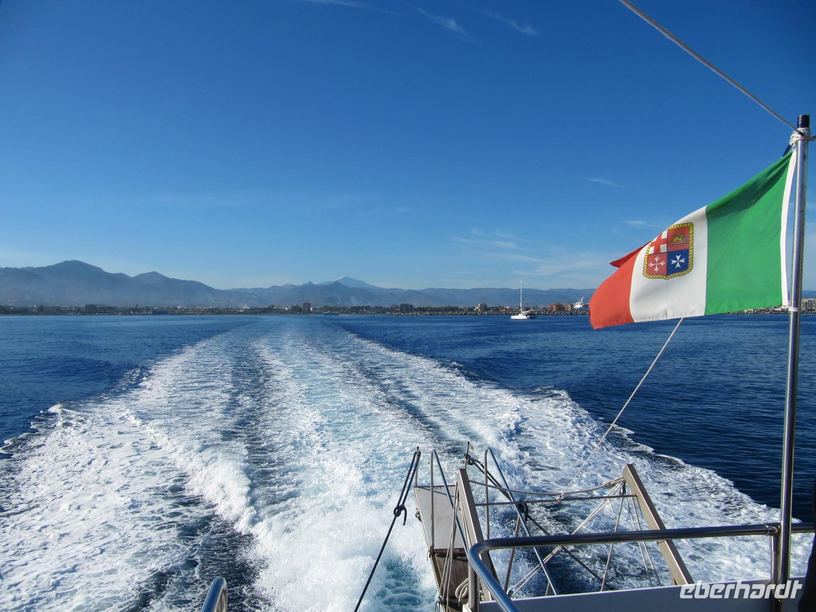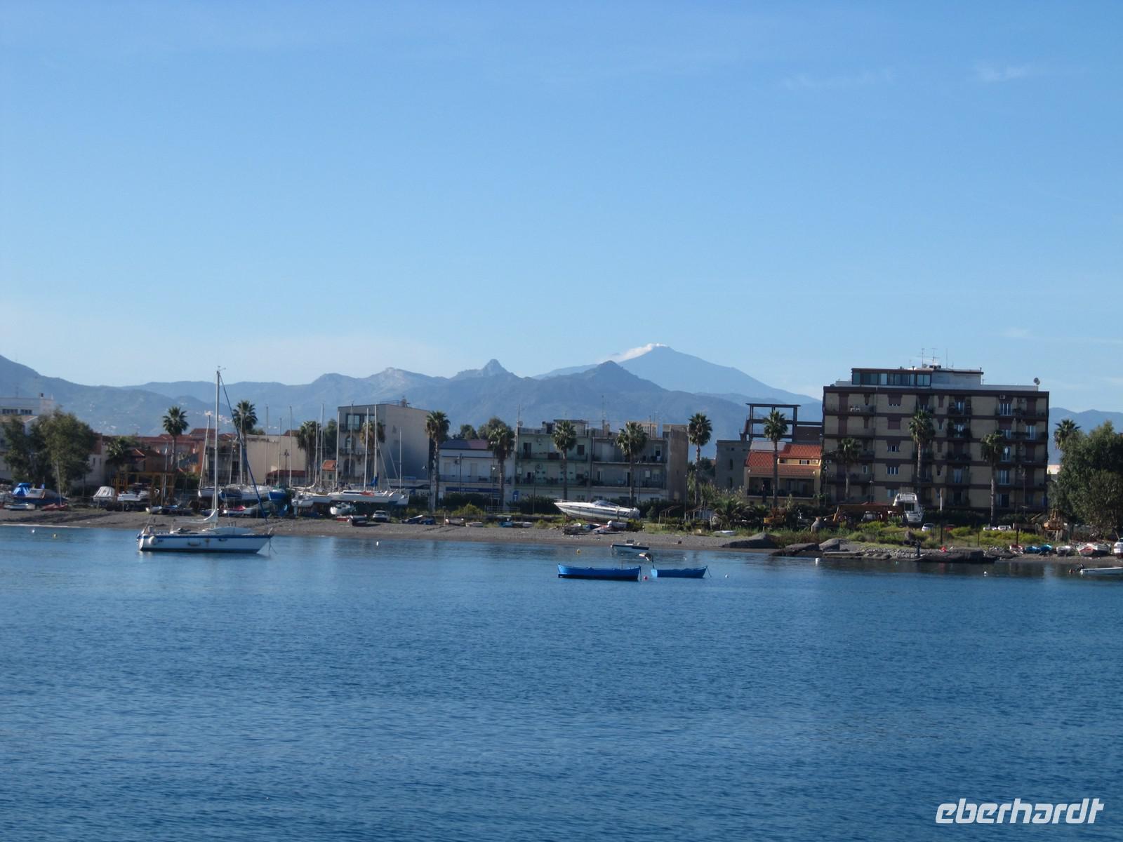 Sizilien, wir kommen! Allerdings müssen wir noch die Basilikata und Kalabrien durchqueren, doch gegen 15 Uhr haben wir den Fährhafen in Villa San Giovanni erreicht. Petra besorgt Tickets und in ca 20 Minuten sind wir auf Sizilien. Wir genießen die Überfahrt auf dem Deck. Schnell steigen wir dann wieder in unseren Bus und sind in einer Stunde in unserem Hotel Hilton in Giardini Naxos, das wir für die nächsten 5 Nächte bewohnen.