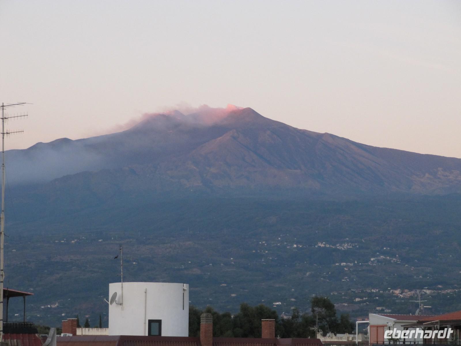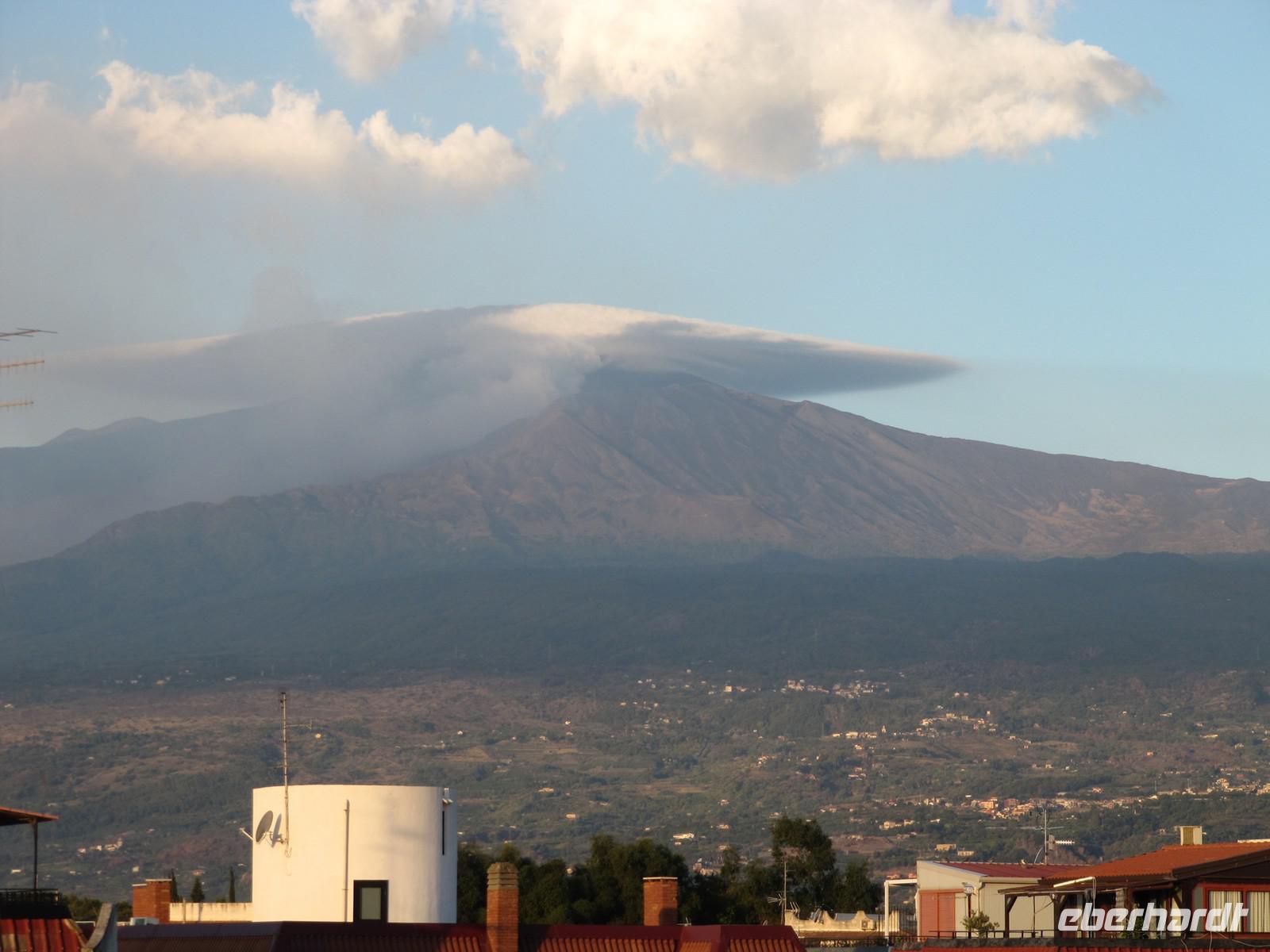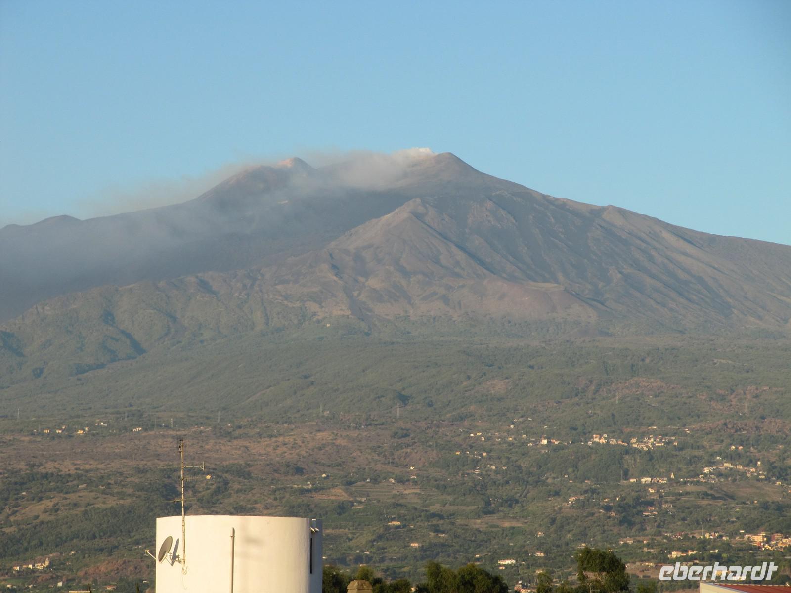 Heute fährt uns unser Bus auf den Ätna bis auf eine Höhe von 1910 m.Leider hat sich der Gipfel unter Wolken versteckt! Die Seilbahn bringt uns zur Bergstation auf 2500 m und weiter geht es mit einem Geländefahrzeug bis auf 2920 m. Aber wir können die Gipfel nicht erkennen, die Wolken reißen nicht auf, wie erhofft. Doch es ist auch so sehr interessant, an einem erloschenen Krater mit einem Bergführer zu spazieren und die Dämpfe aus nächster Nähe zu sehen und zu riechen! Nur der Wind ist eisig kalt. Weiter unten wird es wieder klar und man kann einen großen Teil der Insel überschauen. Wir fahren dann zum Weingut Sciarelle in Viagrande, verkosten Wein und bekommen ein fantastisches Mittagessen. Nur die Anfahrt ist etwas schwierig mit unserem großen Bus. Einmal geleitet uns sogar die Polizei aus den engen Straßen! Wieder im Hotel bleibt Zeit zum Spazieren oder Baden!