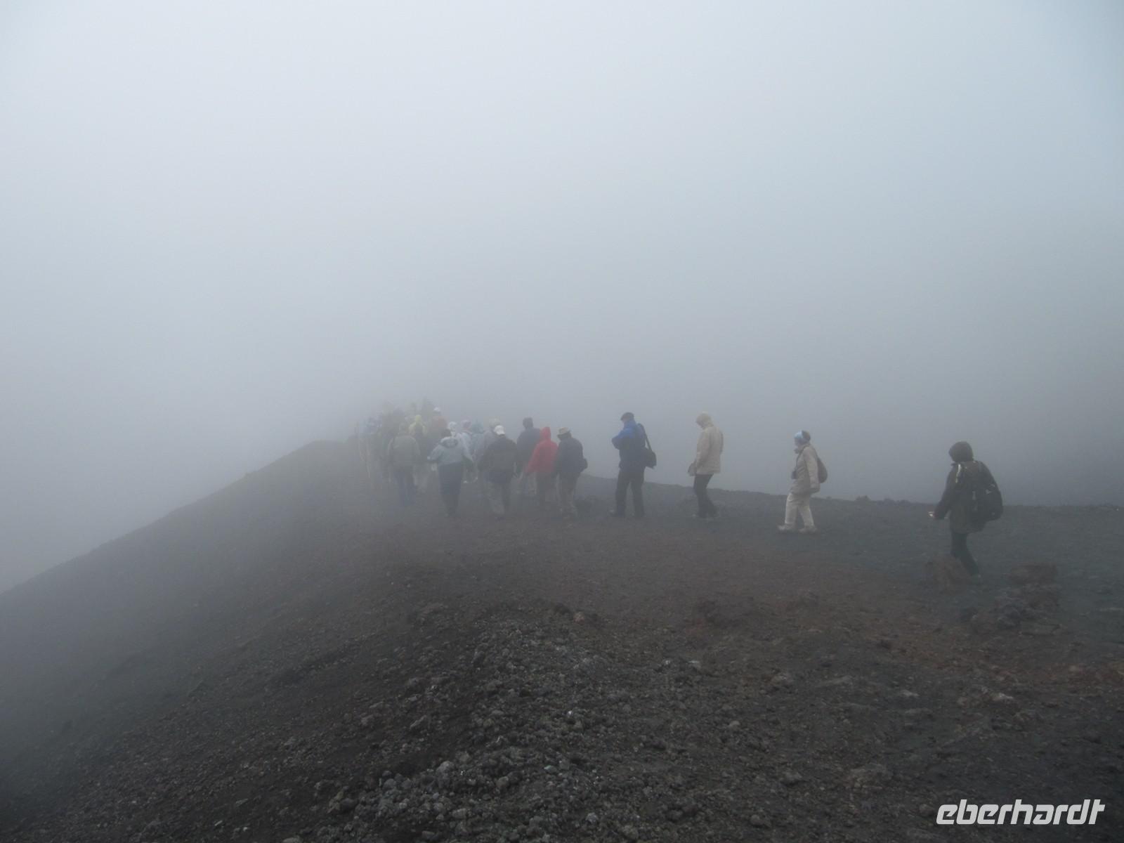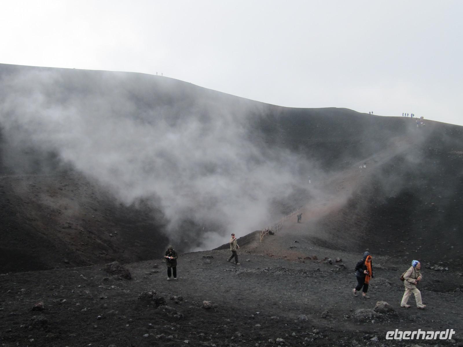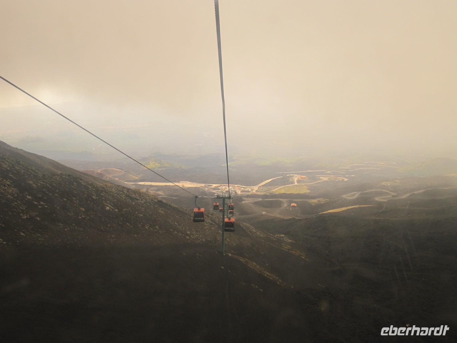 Heute fährt uns unser Bus auf den Ätna bis auf eine Höhe von 1910 m.Leider hat sich der Gipfel unter Wolken versteckt! Die Seilbahn bringt uns zur Bergstation auf 2500 m und weiter geht es mit einem Geländefahrzeug bis auf 2920 m. Aber wir können die Gipfel nicht erkennen, die Wolken reißen nicht auf, wie erhofft. Doch es ist auch so sehr interessant, an einem erloschenen Krater mit einem Bergführer zu spazieren und die Dämpfe aus nächster Nähe zu sehen und zu riechen! Nur der Wind ist eisig kalt. Weiter unten wird es wieder klar und man kann einen großen Teil der Insel überschauen. Wir fahren dann zum Weingut Sciarelle in Viagrande, verkosten Wein und bekommen ein fantastisches Mittagessen. Nur die Anfahrt ist etwas schwierig mit unserem großen Bus. Einmal geleitet uns sogar die Polizei aus den engen Straßen! Wieder im Hotel bleibt Zeit zum Spazieren oder Baden!