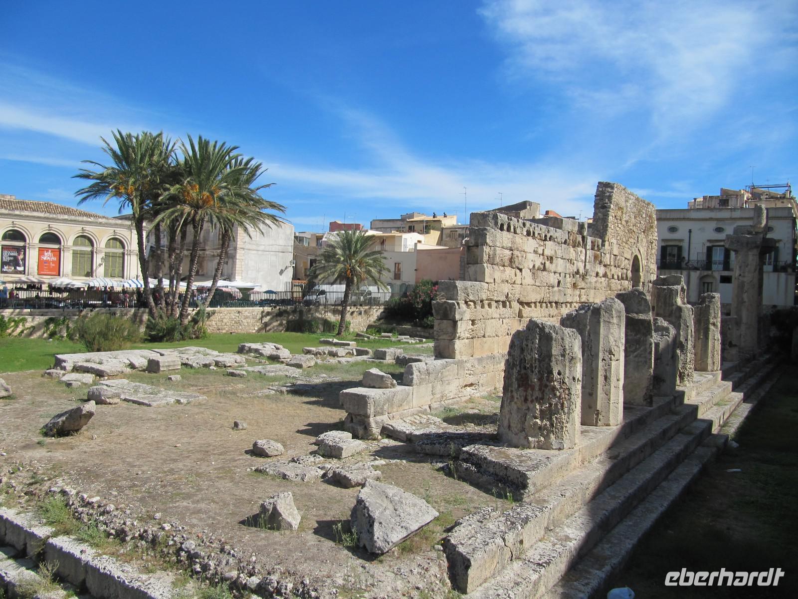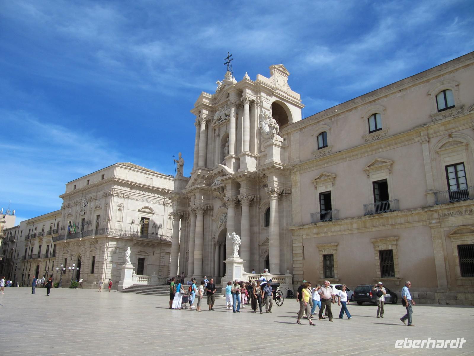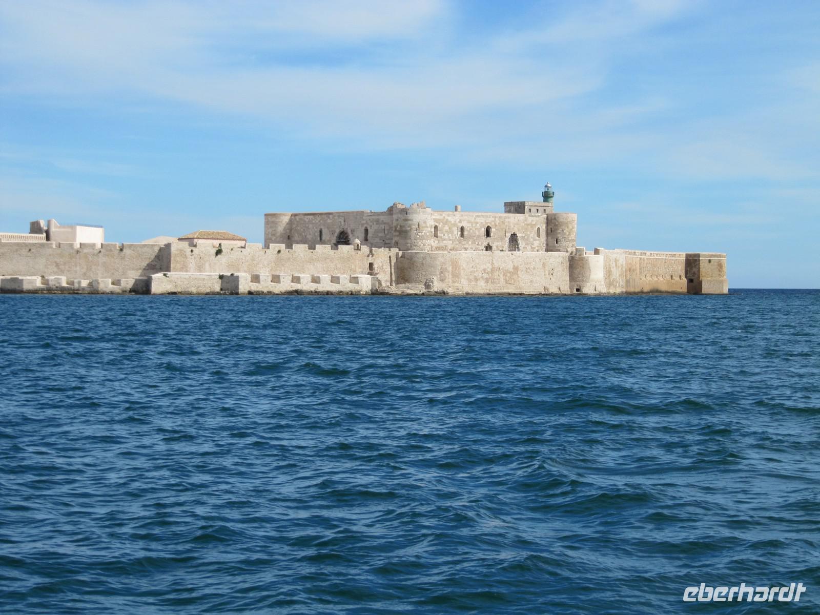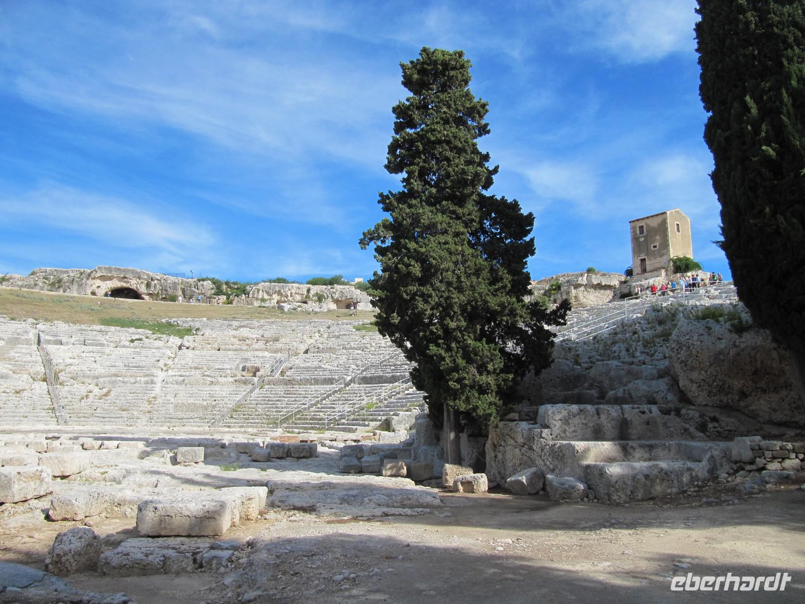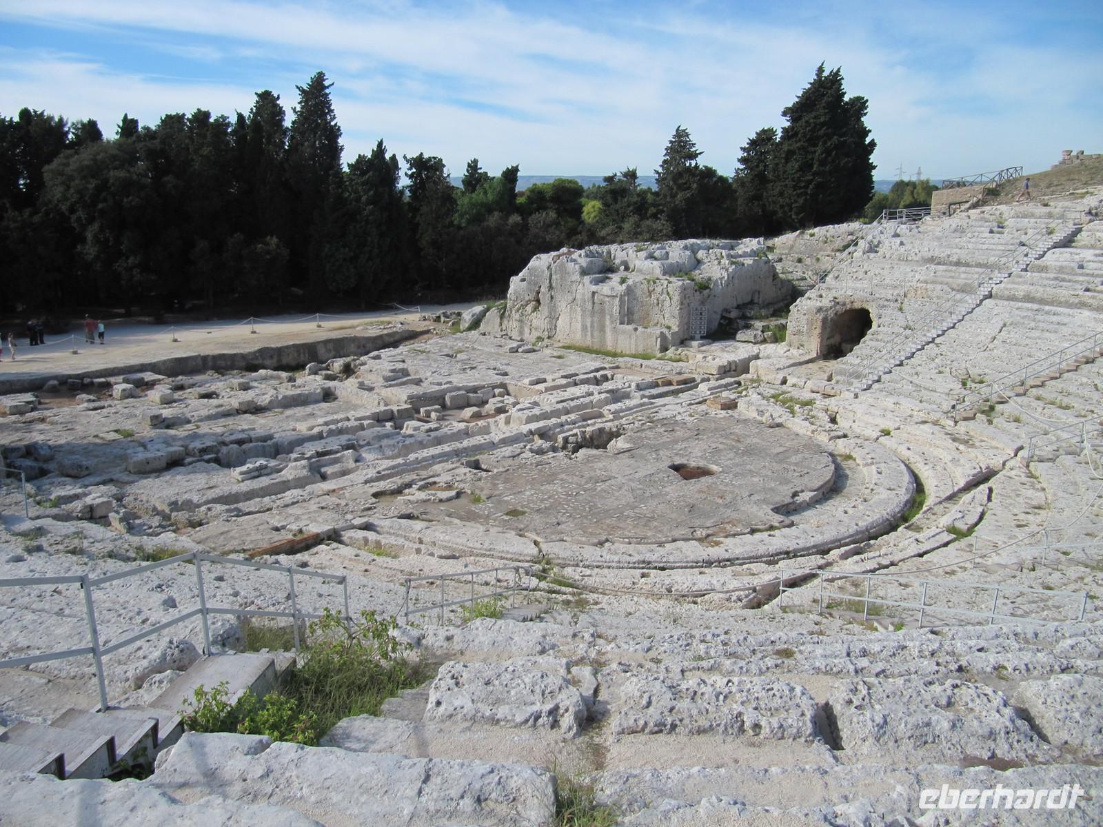 Unser erster Ausflug bringt uns heute nach Syrakus! Giuseppe führt uns durch das größte Theater der griechischen Welt und erklärt uns alles ausführlich. Wir besichtigen den Steinbruch und das Ohr des Dionysios! Auf der Wachtelinsel Ortygia erstreckt sich die Altstadt von Syrakus, mit teils etwas verkommenen aber romantischen Gassen, schönen Blicken auf das Meer und mit dem Apollotempel. Wir besichtigen den interessanten Dom. Der Platz ist von barocken Palazzi umgeben, einer der schönsten Plätze von Sizilien. Die Süßwasserquelle Aretusa ist von einer Legende umrankt. Hier wächst der seltene Papyrus. Anschließend unternehmen wir eine Bootsfahrt auf dem Golf von Syrakus. Herrlicher Sonnenschein begleitet uns. Uns wird ein leckerer Imbiss gereicht, mit Antipasti, Pizza, Obst, Wein. Nach etwas Freizeit geht es dann zurück zum Hotel und wir können noch im Meer baden. Es ist Mitte Oktober noch richtig schön warm, nur der Strand vorm Hiltonhotel ist weniger schön, sehr steinig!
