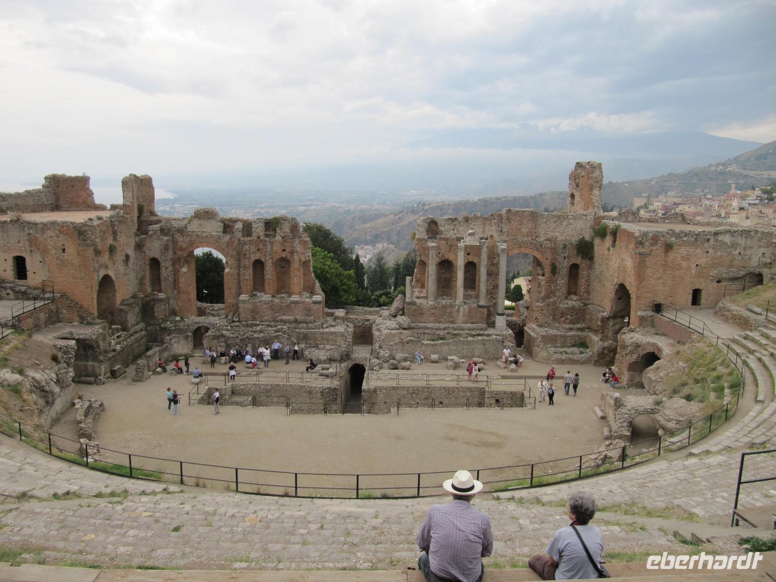 Unser Stadtführer Hermann erwartet uns im Hotel und gemeinsam fahren wir nach Catania. Dort besichtigen wir den Dom mit dem Grabmal des berühmten Opernkomponisten Vincenzo Bellini und spazieren durch die Altstadt. Wir bestaunen auf dem Fischmarkt das regeTreiben und die fremdartigen Fische, Gemüse und Obst. Auf der Küstenstraße geht es an der Zyklopenküste entlang über Aci Castello mit einem Fotostopp nach Taormina. Wir haben Zeit zum Stärken und bewundern das bedeutendste Bauwerk, das Teatro Greco! Allerdings ist von dem ursprünglichen griechischen Theater nur noch die Aussicht vorhanden, die Römer haben es nach ihren eigenen Vorstellungen im 2.Jh.v.Chr. umgebaut. Ein phantastischer Ausblick, aber leider versteckt sich der Vulkan heute total. Nach etwas Freizeit bringt uns unser Bus wieder in unser Hotel. Als wir im Bus sitzen, beginnt es sogar zu regnen.