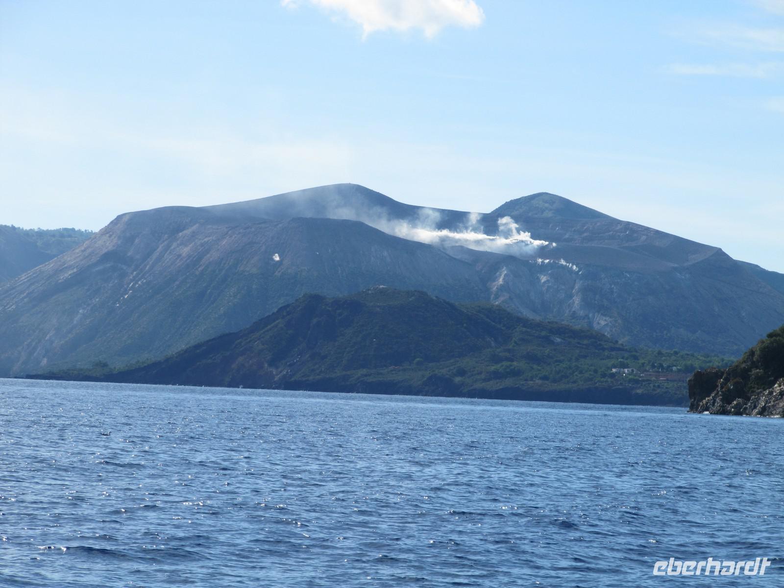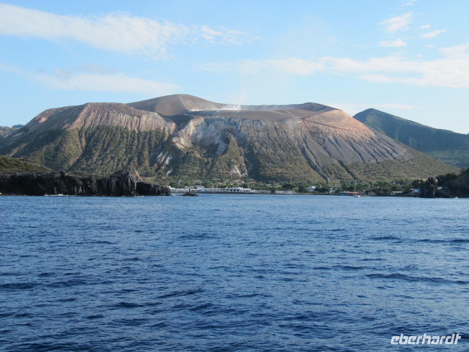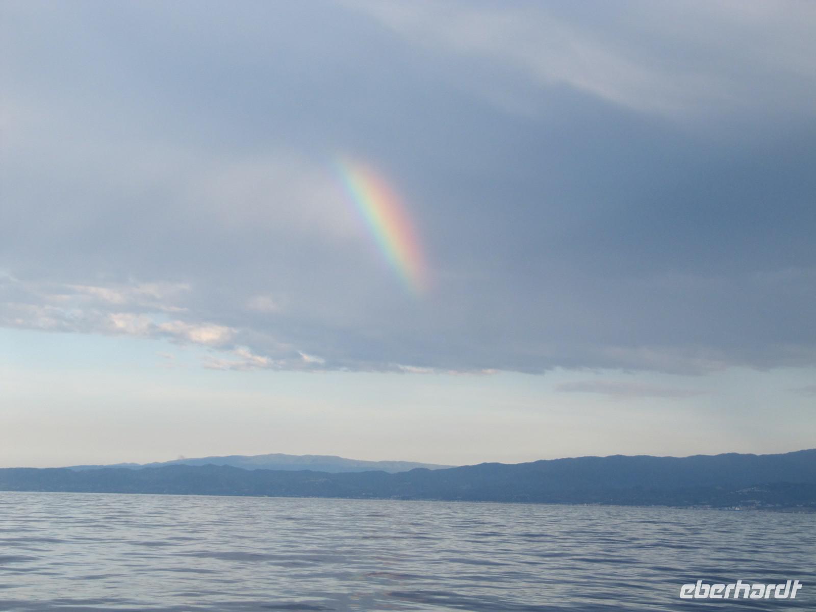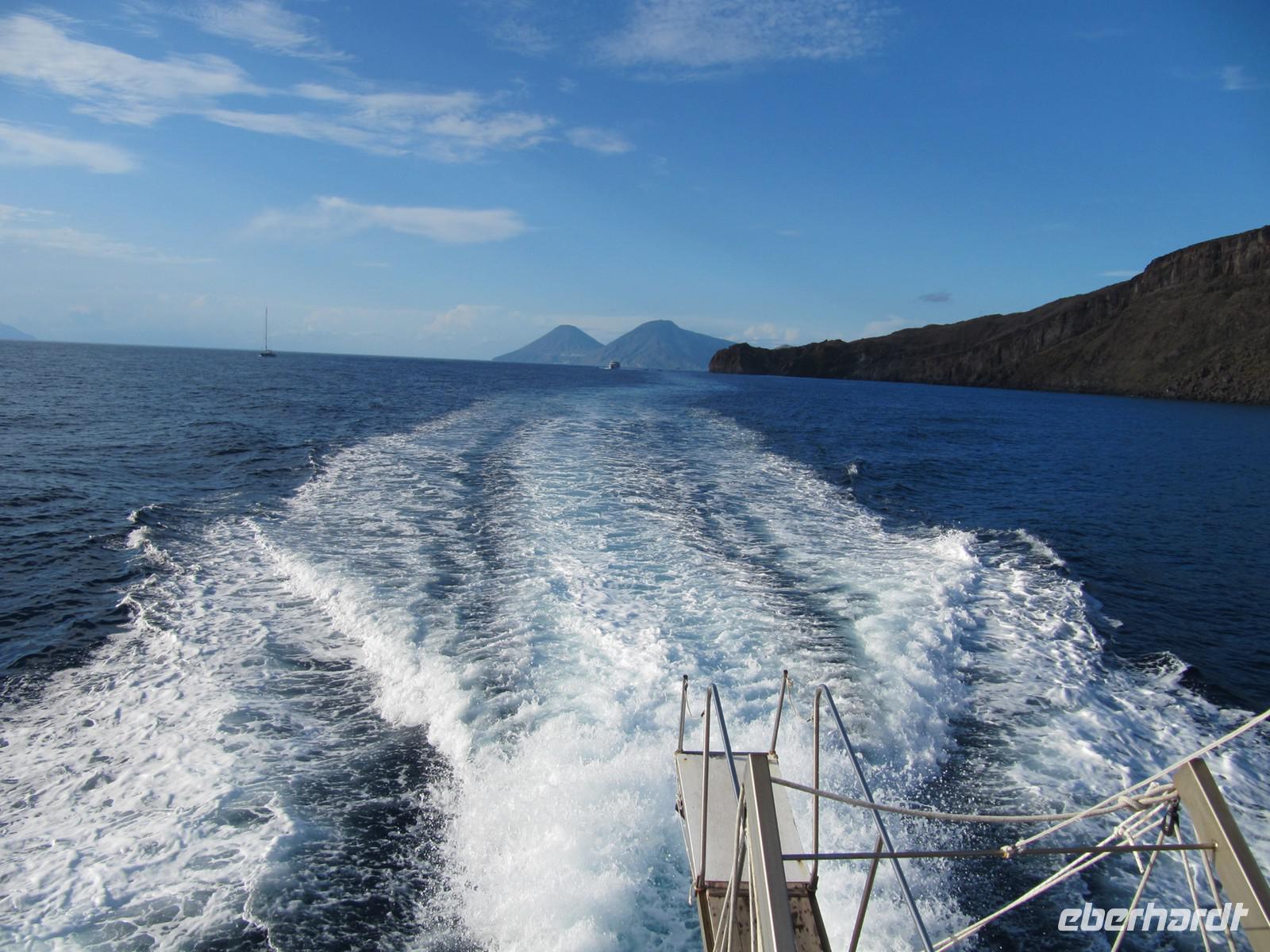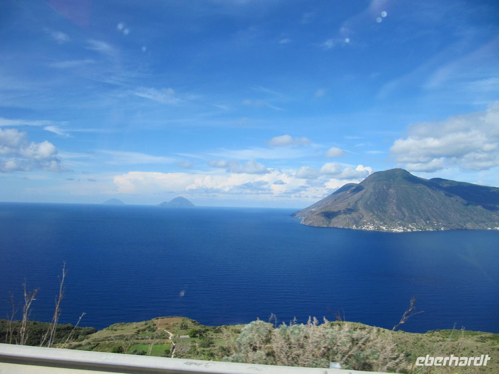 Heute könnten wir im Hotel relaxen, aber alle Gäste beteiligen sich am fakultativen Ausflug nach den Äolischen Inseln, in Deutschland besser als Liparische Inseln bekannt. Mit einem italienischen Bus und Hermann fahren wir nach Milazzo, genießen aber erst mal bei einem Fotostopp die Aussicht auf die Straße von Messina. Dann gehts mit einem kleinen Privatboot zur Insel Lipari. Hier treffen wir auf eine Wandergruppe von Eberhardt, die einige Tage auf den Inseln verbringt. Die Überfahrt ist traumhaft! Wir haben eine selten klare Sicht, erkennen alle Inseln und sehen sogar noch vom Meer den Ätna rauchen! Lipari lernen wir bei einer Inselrundfahrt kennen, natürlich dürfen einige Stopps nicht fehlen. Danach erkunden wir die Insel Vulcano und einige Gäste wandern sogar hinauf auf den Vulkan. Andere baden am schwarzen Strand im warmen klaren Meer oder wandern. Nur in das gesunde Schlammbad will keiner! Bei der Rückfahrt umrunden wir noch Vulcano und haben schöne Ausblicke und Wolkenbildungen. Sogar ein Regenbogen begleitet uns. Wie wir später hören, ging an dem Abend auf Lipari ein heftiges Gewitter nieder. Im Hotel müssen wir noch Koffer packen!