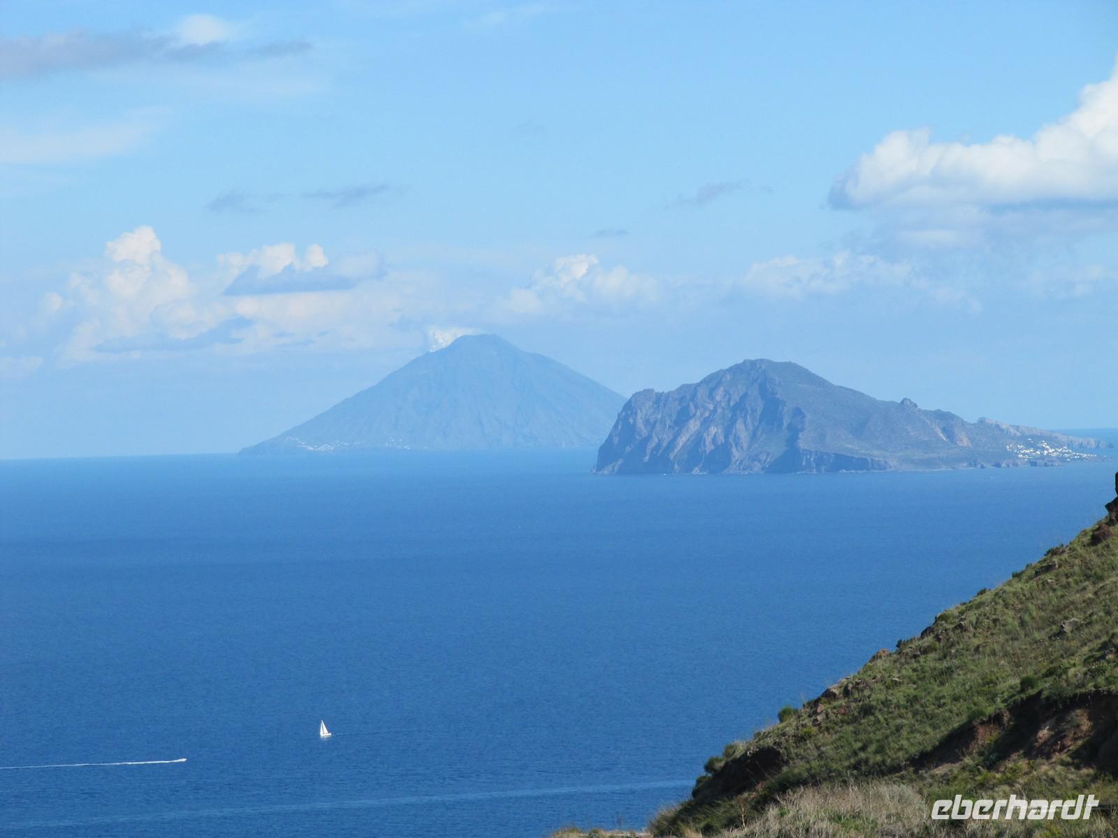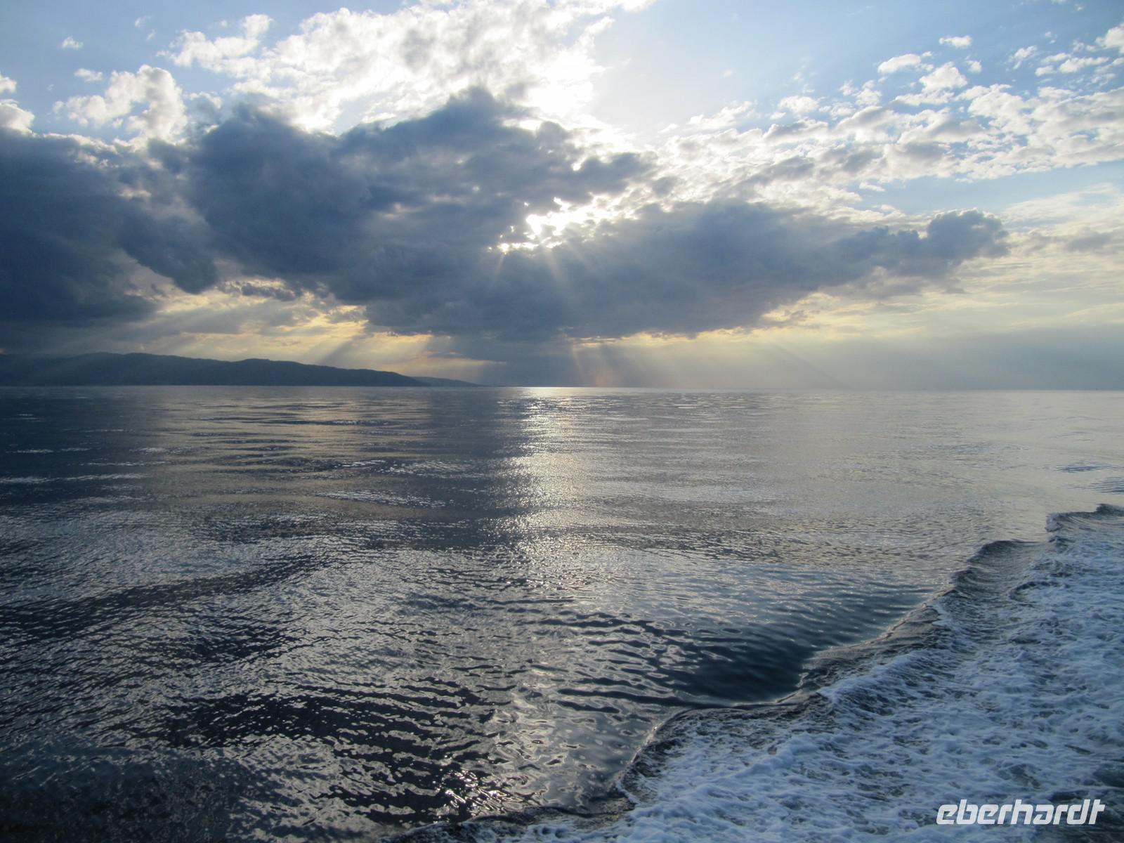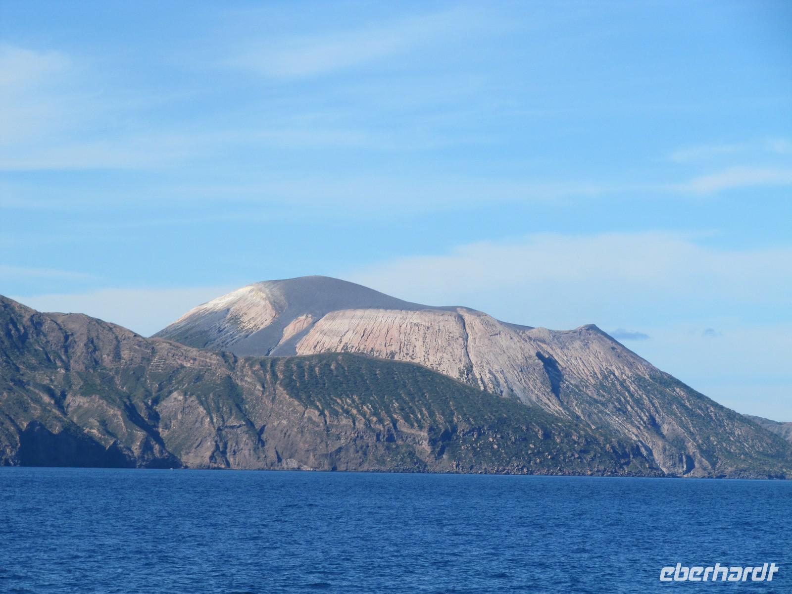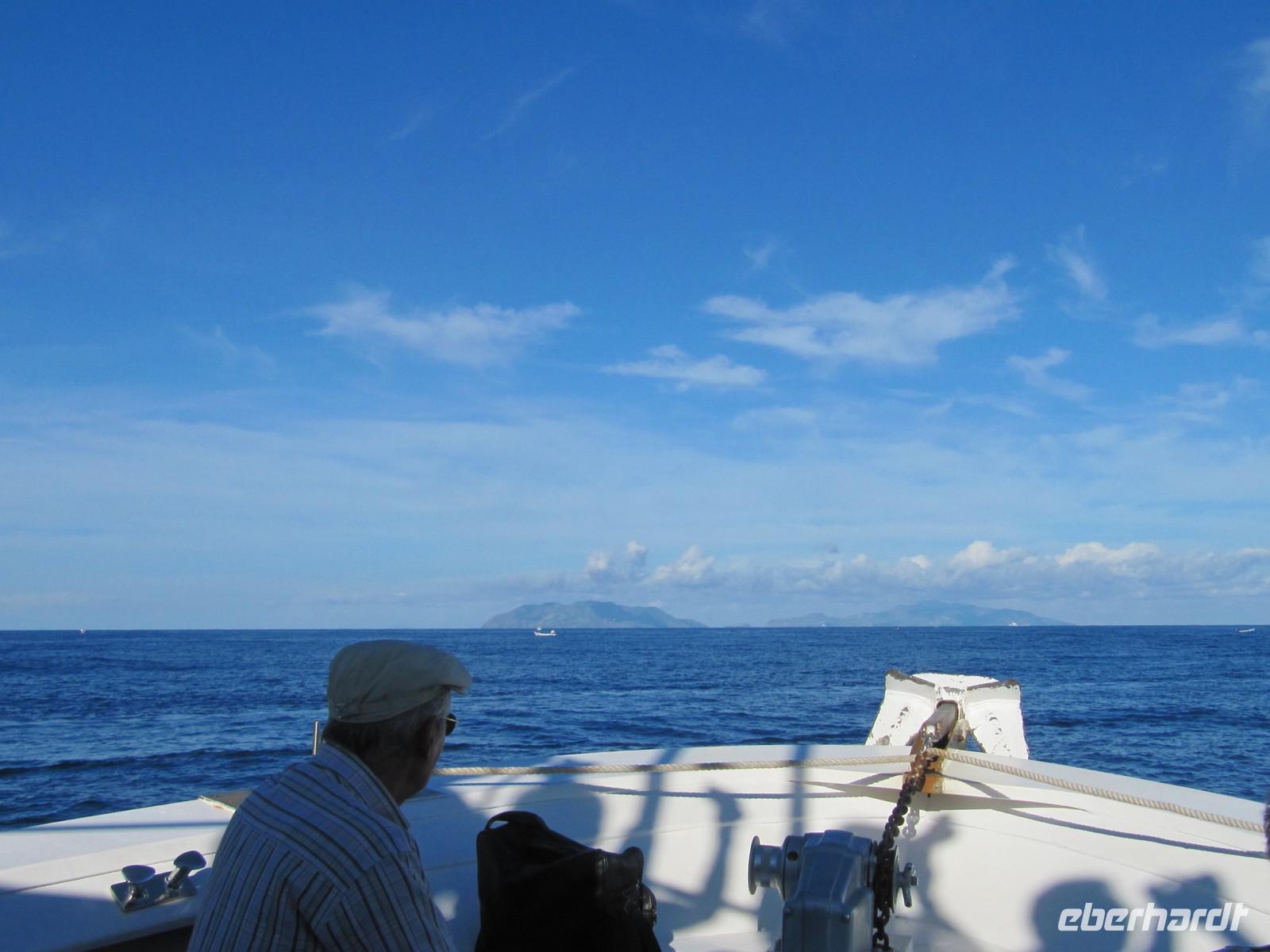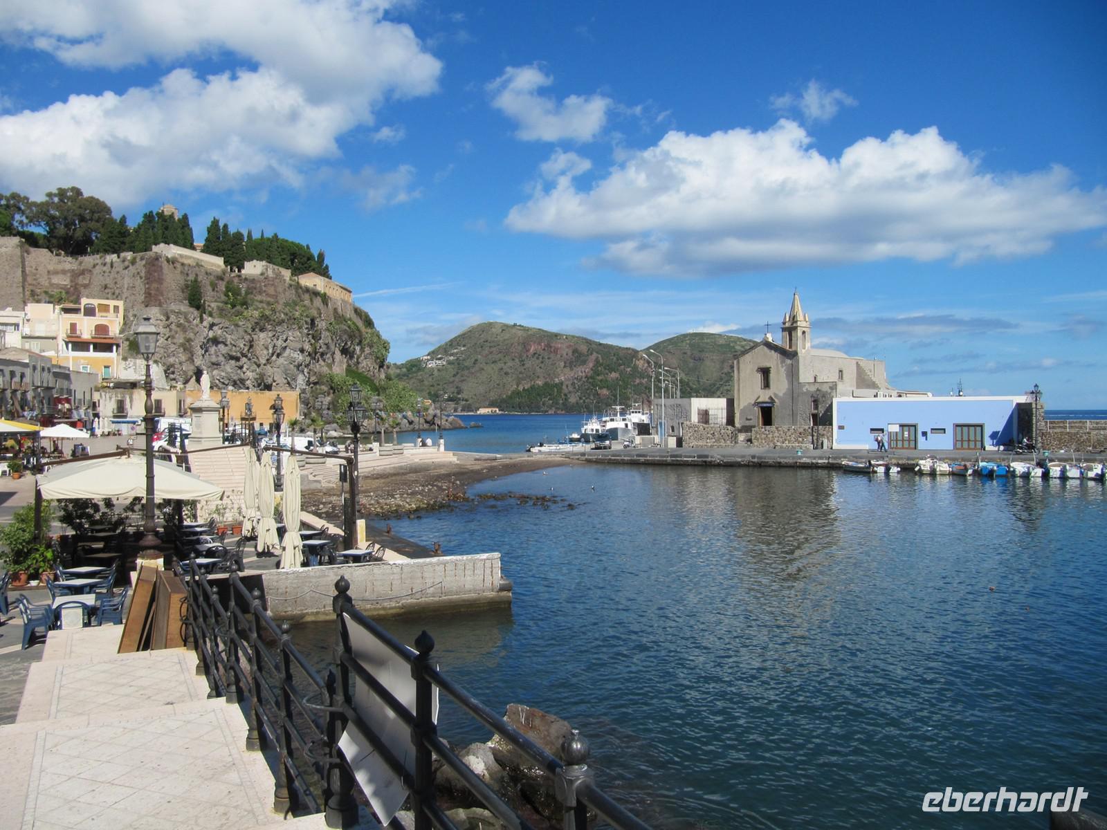 Heute könnten wir im Hotel relaxen, aber alle Gäste beteiligen sich am fakultativen Ausflug nach den Äolischen Inseln, in Deutschland besser als Liparische Inseln bekannt. Mit einem italienischen Bus und Hermann fahren wir nach Milazzo, genießen aber erst mal bei einem Fotostopp die Aussicht auf die Straße von Messina. Dann gehts mit einem kleinen Privatboot zur Insel Lipari. Hier treffen wir auf eine Wandergruppe von Eberhardt, die einige Tage auf den Inseln verbringt. Die Überfahrt ist traumhaft! Wir haben eine selten klare Sicht, erkennen alle Inseln und sehen sogar noch vom Meer den Ätna rauchen! Lipari lernen wir bei einer Inselrundfahrt kennen, natürlich dürfen einige Stopps nicht fehlen. Danach erkunden wir die Insel Vulcano und einige Gäste wandern sogar hinauf auf den Vulkan. Andere baden am schwarzen Strand im warmen klaren Meer oder wandern. Nur in das gesunde Schlammbad will keiner! Bei der Rückfahrt umrunden wir noch Vulcano und haben schöne Ausblicke und Wolkenbildungen. Sogar ein Regenbogen begleitet uns. Wie wir später hören, ging an dem Abend auf Lipari ein heftiges Gewitter nieder. Im Hotel müssen wir noch Koffer packen!