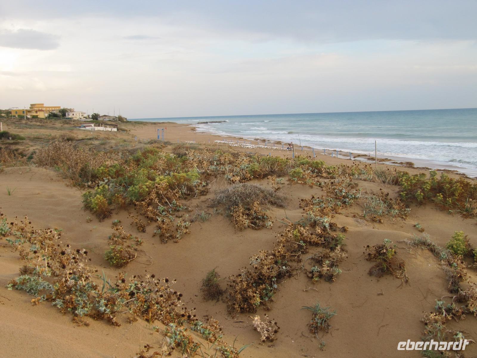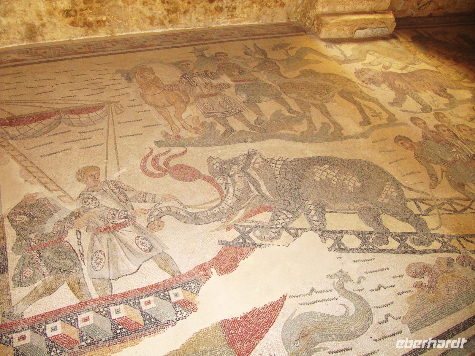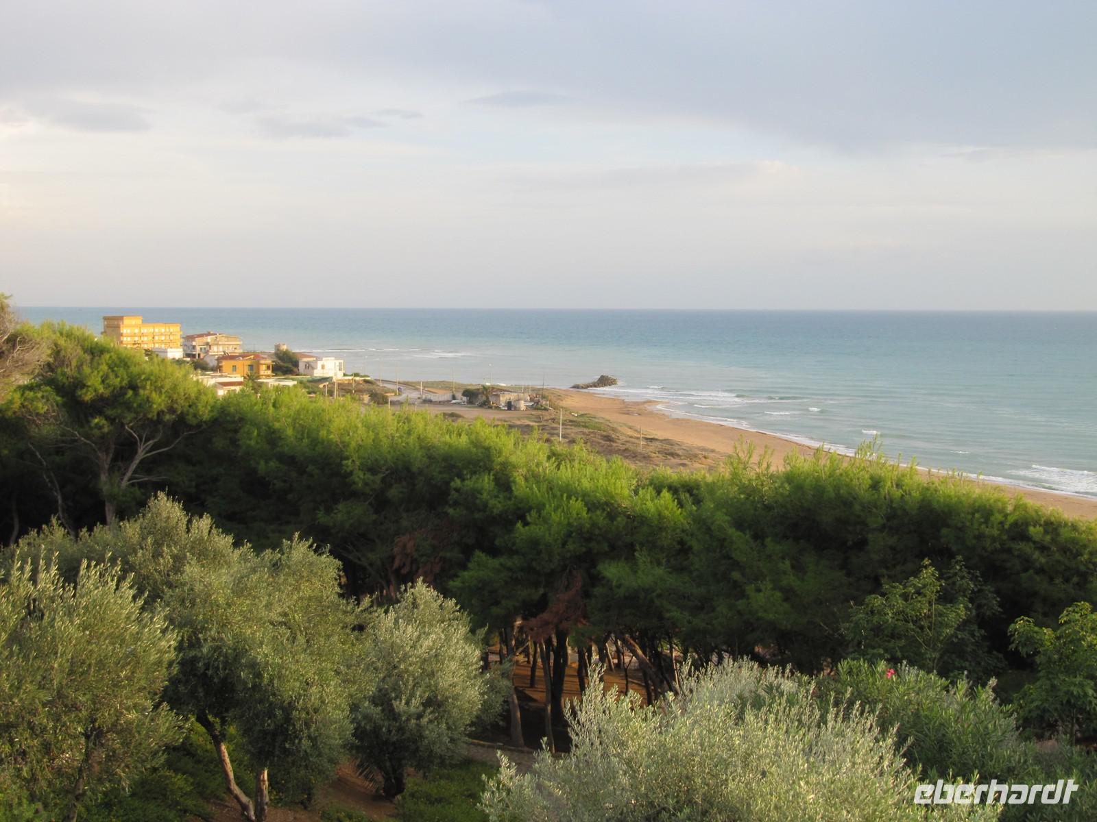 Weiterfahrt in den Süden der Insel! Von Catania fahren wir ein Stück Richtung Palermo auf der Autobahn und dann geht es über Piazza Armerina in die Villa Romana del Casale. Führerin Giusy erwartet uns schon und erklärt uns viel über diese berühmten phantastischen Mosaike. Danach sind wir beim Tenuta Barone Nicolo La Lumia zur Weinverkostung angemeldet. Auch ein kleiner Imbiss gehört dazu! Die Weine und das Essen sind ausgezeichnet! Wir sind ganz entzückt von vier kleinen Hundewelpen - ach wie süß! Unser heutiges Hotel Baia di Ulisse befindet sich in San Leone, einem Vorort von Agrigent, über einer kleinen Steilküste direkt am Meer. Viele Gäste nehmen noch ein Bad in den Wellen. Ein heftiges Gewitter entlädt sich am Abend, es stürmt und regnet stark!